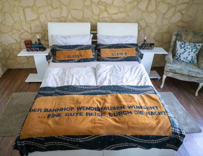 Dear guests, Welcome to Wendehausen train station. In the middle of the green heart of Germany is the 54 square meter apartment in a former train station building. Enjoy the flair of an extraordinary building on a disused railway line surrounded by forests, cycling and hiking trails. An ideal starting point for excursions and activities awaits you, on the green belt of Germany, in Thuringia on the border with Hesse. The space Make yourself at home, where the trains once left, you can now leave everyday life behind. The apartment is located on the 1st floor of the former train station Wendehausen. Sleep in the 1.60 m x 2.00 m box spring bed and enjoy the journey through the night. Relax, from your excursions, with a relaxing bath in the bathtub. Or linger, in the living and dining room with satellite TV. For a break, there is also a small lovingly furnished reading room available, with a magnificent view over the village of Wendehausen. Here there is also the possibility of another sleeping place (sofa bed 84x182). When hungry, the fully equipped kitchen awaits, for its cooking skills. Also treat yourself to a break at our cozy seating area on the edge of the forest (by arrangement/ shared use). We wish you a relaxing stay in Wendehausen train station. Marianne and Roland Montag Guest access Flexible check-in with key box possible Other things to note Due to the current situation regarding the pathogen coronavirus SARS-CoV-2, disinfectants, disposable face masks and gloves are located in the apartment as a protective measure for our guests. The apartment may be opened from June 2. For more information, visit the Unstrut Hainich district website under current notification. We are happy to reopen and look forward to seeing you soon.