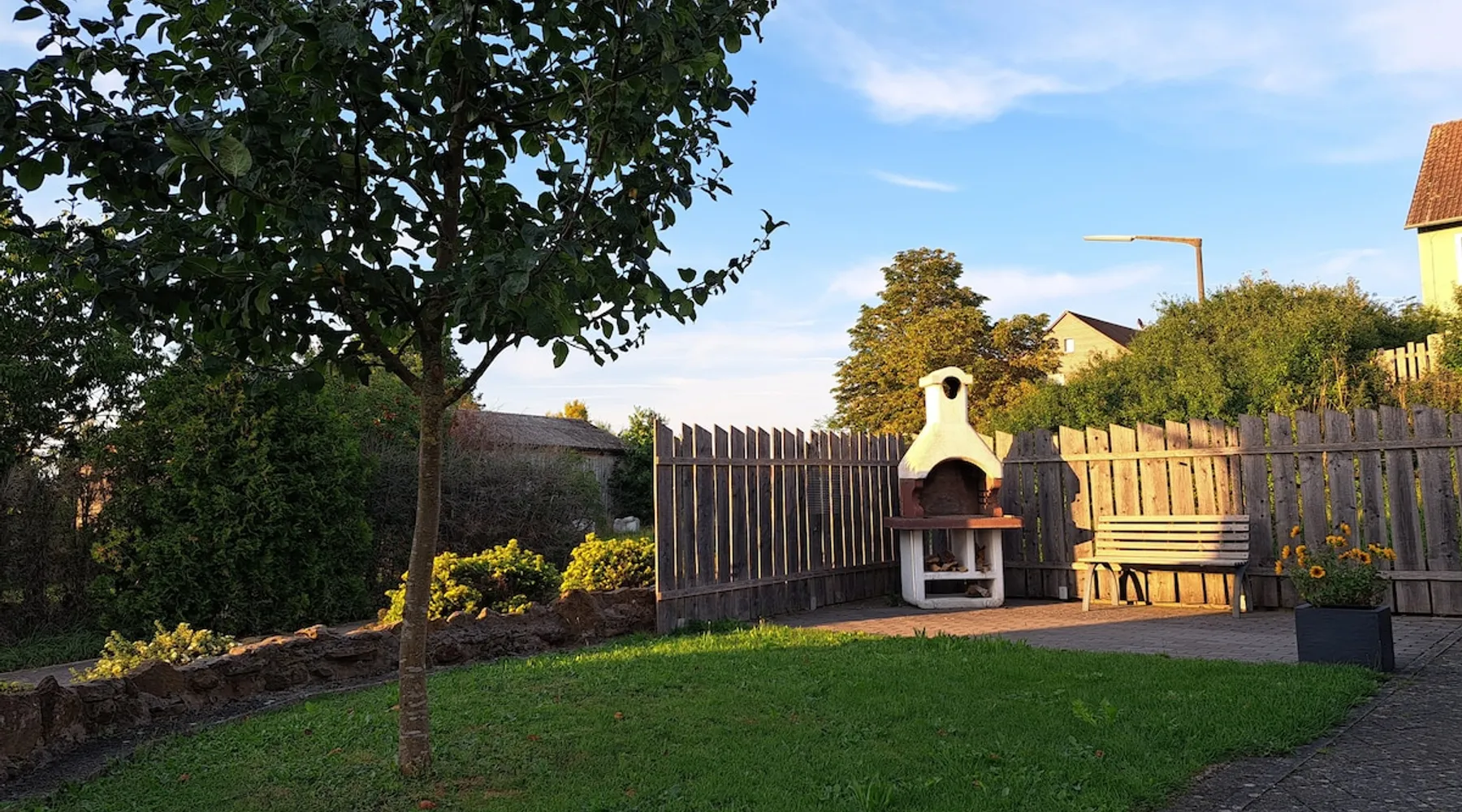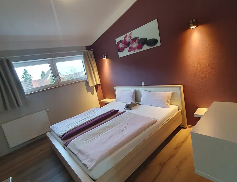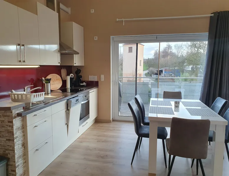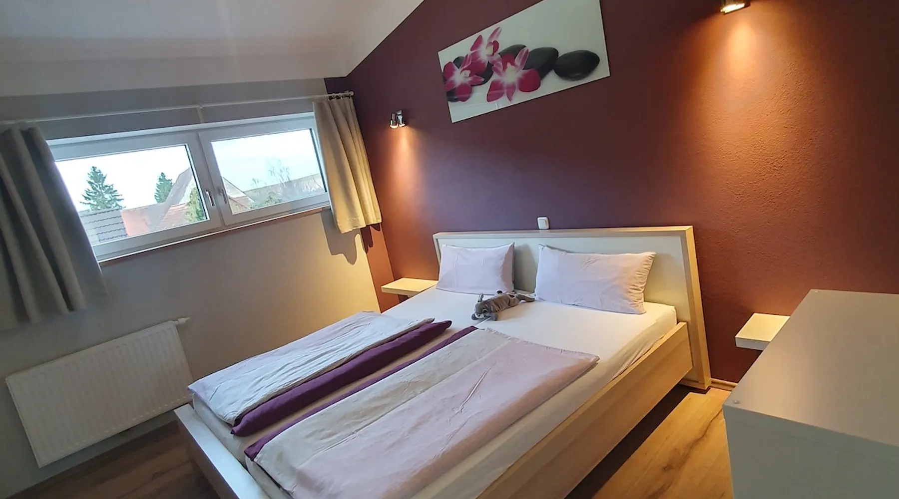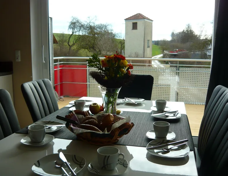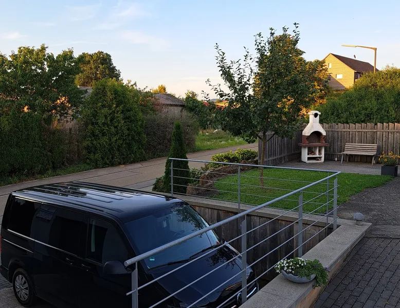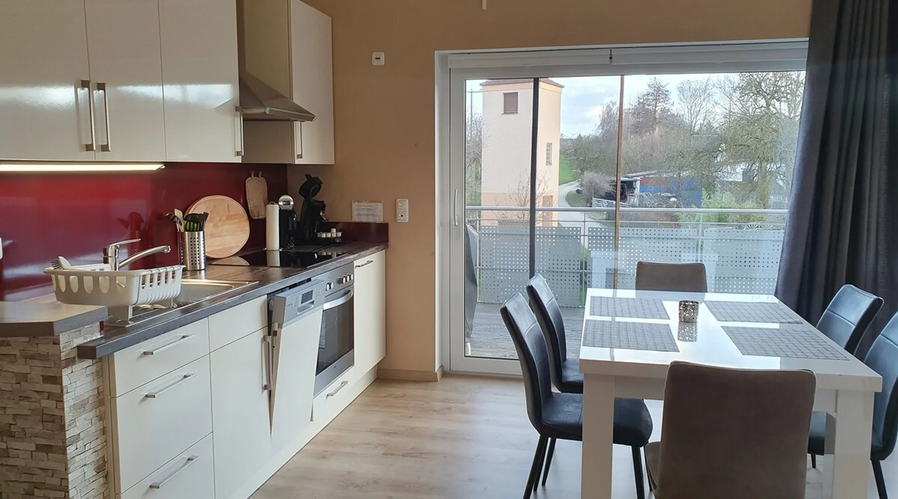 Our apartment is in the countryside on the outskirts of town. (Completion in January 2016). Apartment is on the 1st upper floor An electric charging station with 11 kW is available to you at the current electricity price. From the living-dining area you have access to the large balcony, which is on the south side. The living area is bright and filled with light. The bathroom is a small wellness oasis with sauna and rain shower. The sauna is used by our guests in summer and winter at no extra cost. The space The balcony is equipped with a table group, 2 sun loungers and an electric awning. At breakfast in the dining area or in summer on the balcony, you can already enjoy the beautiful view and tranquility. Thanks to the large windows, the light-flooded living-dining area is very bright and pleasant. Pleated blinds and curtains are available for sufficient shading or darkening. You can spend your vacation with up to 6 people in our modern furnished apartment. There are two double bedrooms, each with a closet. Another person (or 2 children) can also fit on the pull-out sofa 195 cm x 120 cm. A fully equipped kitchen with Senseo coffee pod machine (pods are in the kitchen cabinet), toaster, kettle, oven, microwave and fridge-freezer combination awaits you. In the living room is a flat-screen TV, a stereo system and the pull-out sofa, but there is an additional mattress to increase the comfort. The living area is particularly cozy in the evening thanks to LED lighting and backlighting. The bathroom has a bathtub and a walk-in shower with rain shower. Also in the bathroom is the sauna, just for you. For further relaxation and for your well-being, there is a practice for craniosacral therapy and APM according to Penzel in the same house. If you are interested, please inquire a few weeks in advance. Linens, towels, dishtowels, cleaning supplies, toilet paper, kitchen towels and dishwashing liquid are provided. Countryside vacation with great surroundings for hiking and cycling. A small garden, fireplace grill and an open fireplace are there for you, as well as a table tennis table (please bring rackets and balls). The bed linens and towels are professionally washed in an industrial machine with a disinfection program to minimize the risk of infection. We hope this is also in your interest. We wish you a quiet, relaxing and eventful vacation with us. Guest access The washing machine and dryer are located in the building. The fee is 3.00 euros each time, including detergent. Other things to note Ideas for your vacation with us: The Franconian Lake District invites you to swim, boat, surf and cycle. At Lake Brombach there is a climbing and adventure forest. Take a boat trip with the trimaran and get off at the various jetties to enjoy the beautiful scenery. The romantic old town of Dinkelsbühl (awarded as the most beautiful old town in Germany), Rothenburg, Nördlingen, Oettingen, the Roman park Ruffenhofen and the Hesselberg with its great views is just a small selection of what there is to see and experience here. In clear weather you can see the Alps from Hesselberg. All destinations can be reached in 5 to 30 minutes by car. Many guests with children drive to the Geiselwind amusement park, Legoland Günzburg or the Bad Mergentheim wildlife park. In our village, there is a very idyllic swimming pond (800 meters) and a small children's playground (50 meters) away.