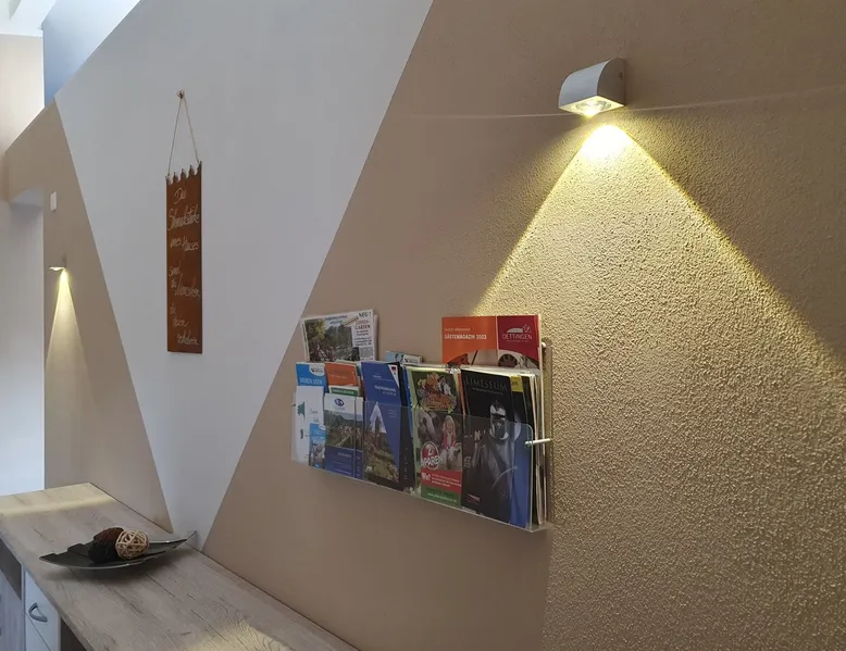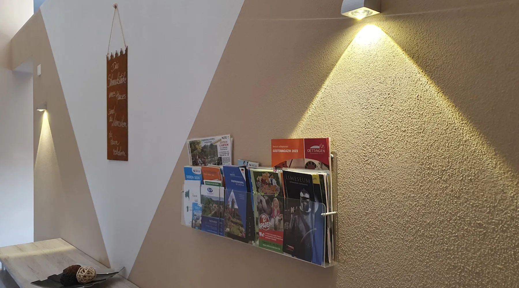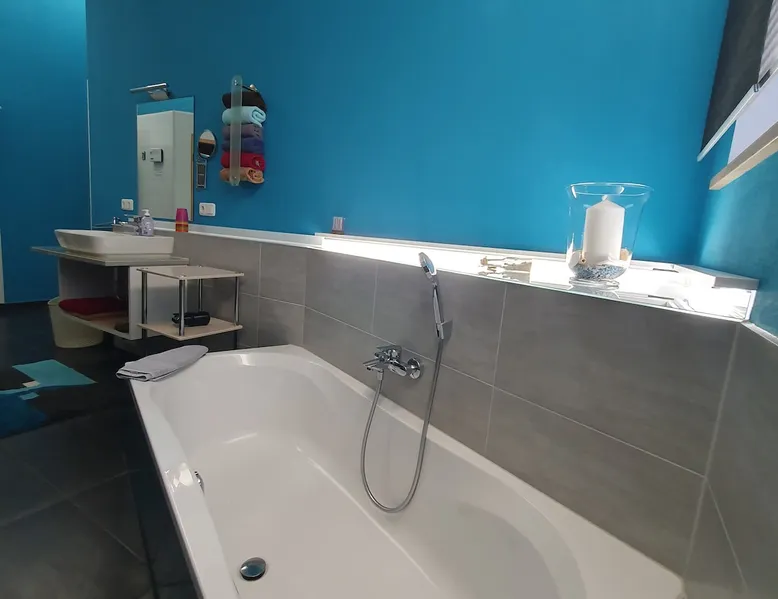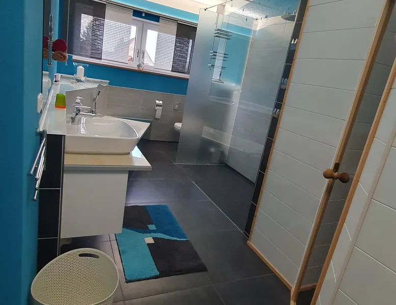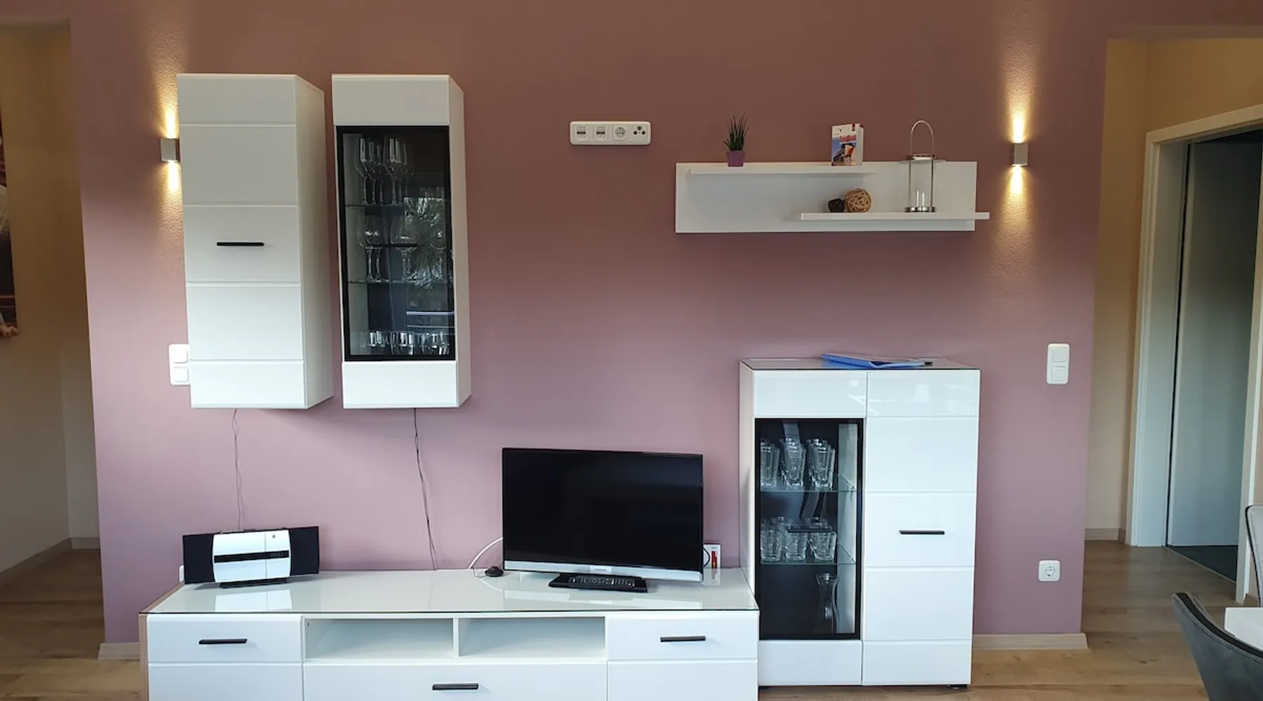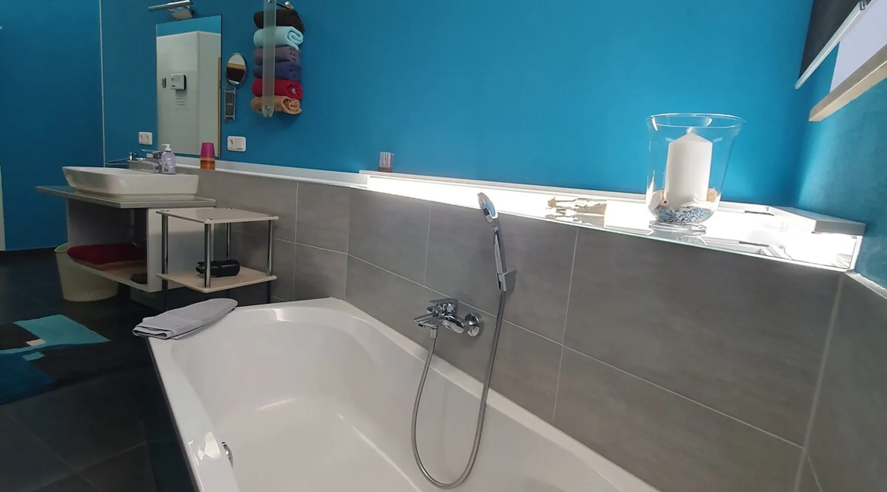 Our apartment is in the countryside on the outskirts of town. (Completion in January 2016). Apartment is on the 1st upper floor An electric charging station with 11 kW is available to you at the current electricity price. From the living-dining area you have access to the large balcony, which is on the south side. The living area is bright and filled with light. The bathroom is a small wellness oasis with sauna and rain shower. The sauna is used by our guests in summer and winter at no extra cost. The space The balcony is equipped with a table group, 2 sun loungers and an electric awning. At breakfast in the dining area or in summer on the balcony, you can already enjoy the beautiful view and tranquility. Thanks to the large windows, the light-flooded living-dining area is very bright and pleasant. Pleated blinds and curtains are available for sufficient shading or darkening. You can spend your vacation with up to 6 people in our modern furnished apartment. There are two double bedrooms, each with a closet. Another person (or 2 children) can also fit on the pull-out sofa 195 cm x 120 cm. A fully equipped kitchen with Senseo coffee pod machine (pods are in the kitchen cabinet), toaster, kettle, oven, microwave and fridge-freezer combination awaits you. In the living room is a flat-screen TV, a stereo system and the pull-out sofa, but there is an additional mattress to increase the comfort. The living area is particularly cozy in the evening thanks to LED lighting and backlighting. The bathroom has a bathtub and a walk-in shower with rain shower. Also in the bathroom is the sauna, just for you. For further relaxation and for your well-being, there is a practice for craniosacral therapy and APM according to Penzel in the same house. If you are interested, please inquire a few weeks in advance. Linens, towels, dishtowels, cleaning supplies, toilet paper, kitchen towels and dishwashing liquid are provided. Countryside vacation with great surroundings for hiking and cycling. A small garden, fireplace grill and an open fireplace are there for you, as well as a table tennis table (please bring rackets and balls). The bed linens and towels are professionally washed in an industrial machine with a disinfection program to minimize the risk of infection. We hope this is also in your interest. We wish you a quiet, relaxing and eventful vacation with us. Guest access The washing machine and dryer are located in the building. The fee is 3.00 euros each time, including detergent. Other things to note Ideas for your vacation with us: The Franconian Lake District invites you to swim, boat, surf and cycle. At Lake Brombach there is a climbing and adventure forest. Take a boat trip with the trimaran and get off at the various jetties to enjoy the beautiful scenery. The romantic old town of Dinkelsbühl (awarded as the most beautiful old town in Germany), Rothenburg, Nördlingen, Oettingen, the Roman park Ruffenhofen and the Hesselberg with its great views is just a small selection of what there is to see and experience here. In clear weather you can see the Alps from Hesselberg. All destinations can be reached in 5 to 30 minutes by car. Many guests with children drive to the Geiselwind amusement park, Legoland Günzburg or the Bad Mergentheim wildlife park. In our village, there is a very idyllic swimming pond (800 meters) and a small children's playground (50 meters) away.