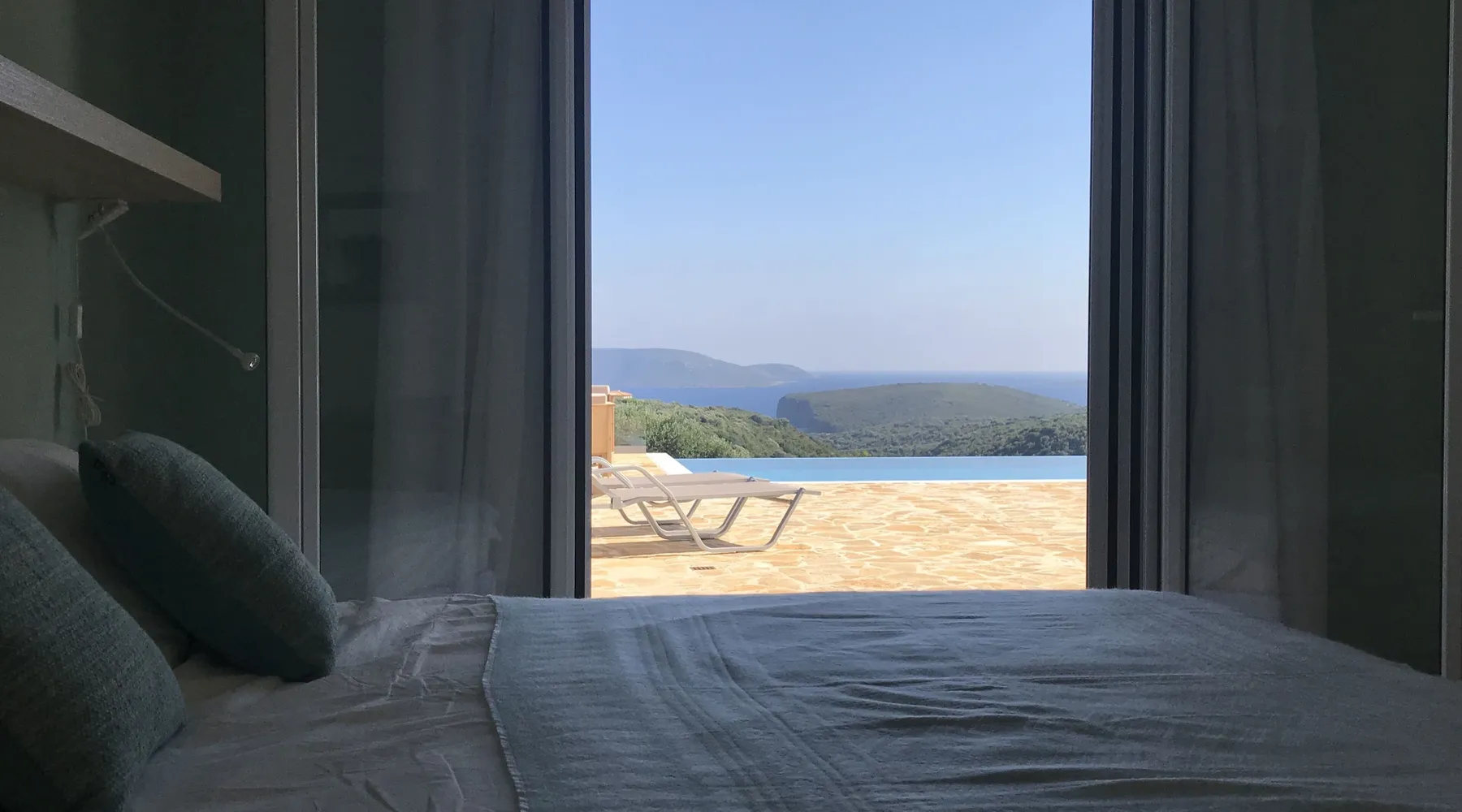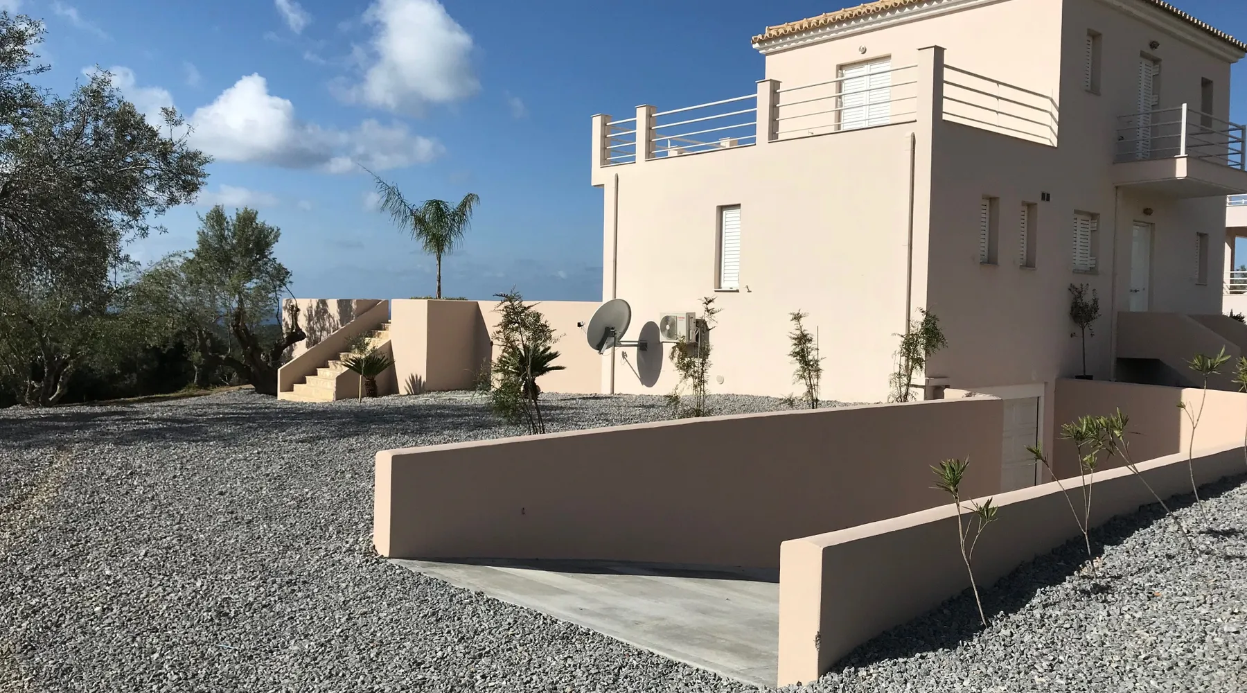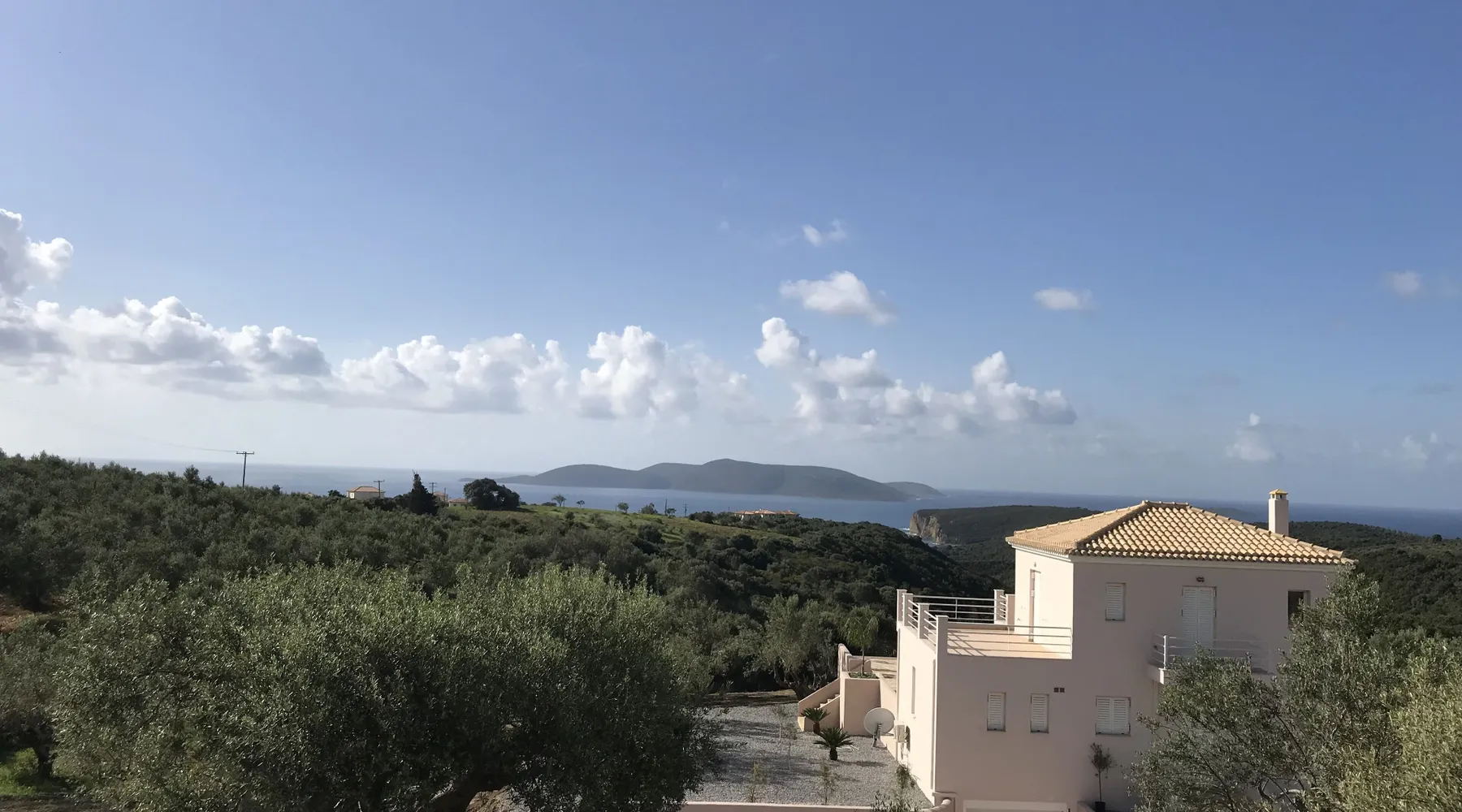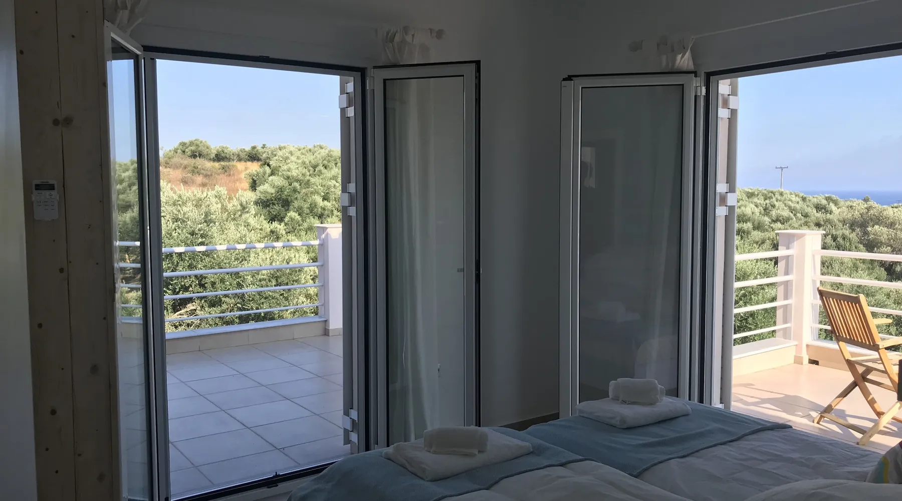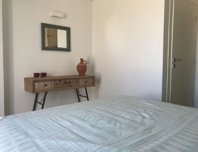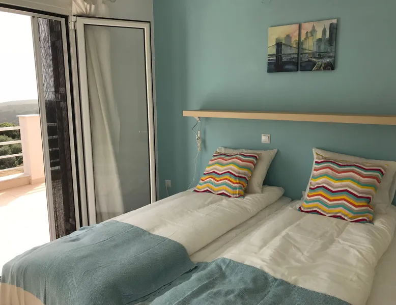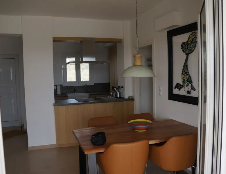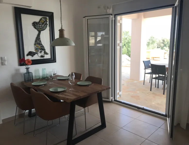 Villa Elia (2017) is a luxury holiday home with a private infinity swimming pool and outdoor shower. There are three terraces. The villa is located in a beautiful olive grove. The terrace upstairs has a beautiful view over the valley and the village of Finiki. The luxurious kitchen diner is fully equipped including clean drinking water. On the same floor you will find the cozy living room, a toilet, a luxurious bathroom and the master bedroom with doors opening onto the terraces with a sea view. On the terrace is a lounge set with a parasol, wonderful sun beds to relax by the pool. All windows and doors are fitted with mosquito nets. 2 bedrooms with large terrace with luxury bathroom are on the first floor. From all rooms you have a beautiful view of the sea and the valley. Both bedrooms have two separate box springs, which can be connected, and have a closet. All bedrooms are air-conditioned. A washing machine is available in the garage. Villa Elia stands in the middle of the Natura 2000 nature reserve, in a valley with unobstructed views and a serene tranquility. You can walk to the Greek tavern Apolafsy. At 2 kilometers you will find the village of Evangelismos, where you will find an authentic Greek village tavern, and a mini supermarket. Ideal for families who want to have their own villa together, but still. You therefore also book Villa Kamaria l. These houses are in the same area.