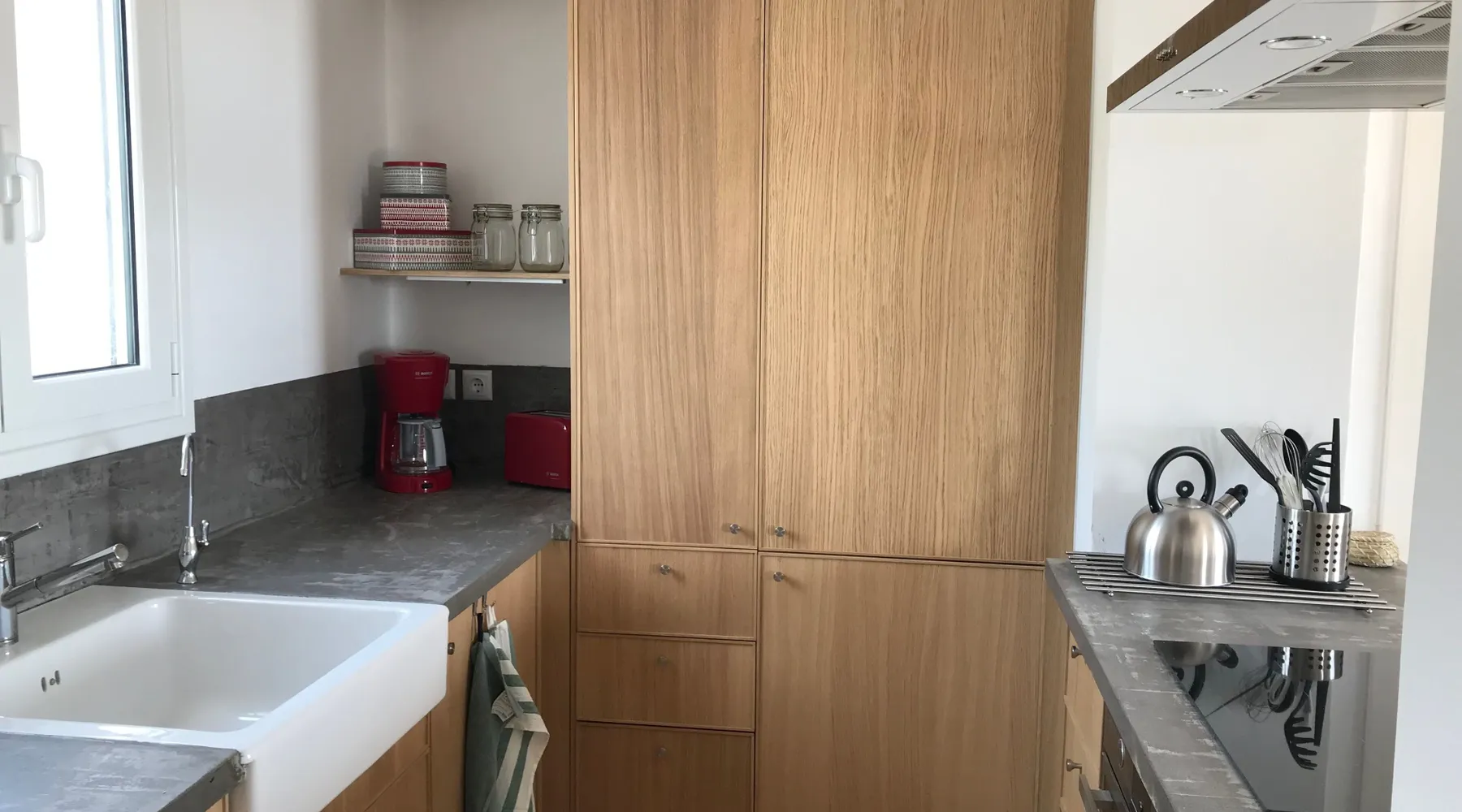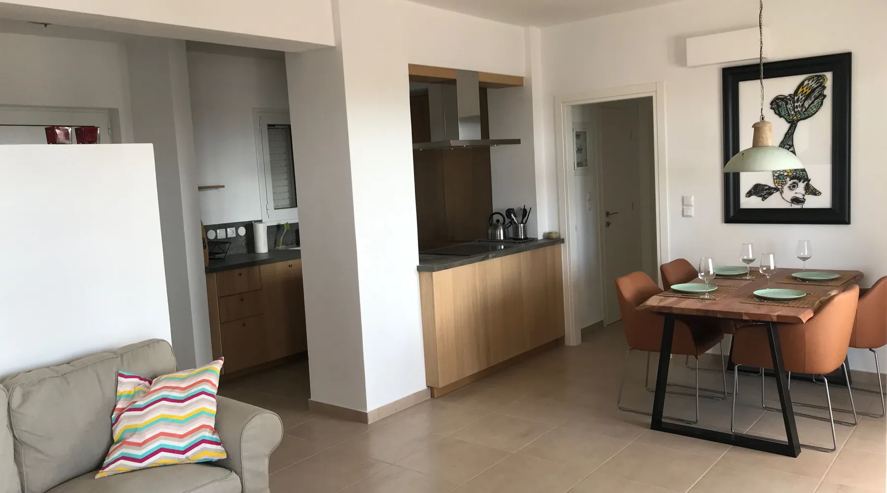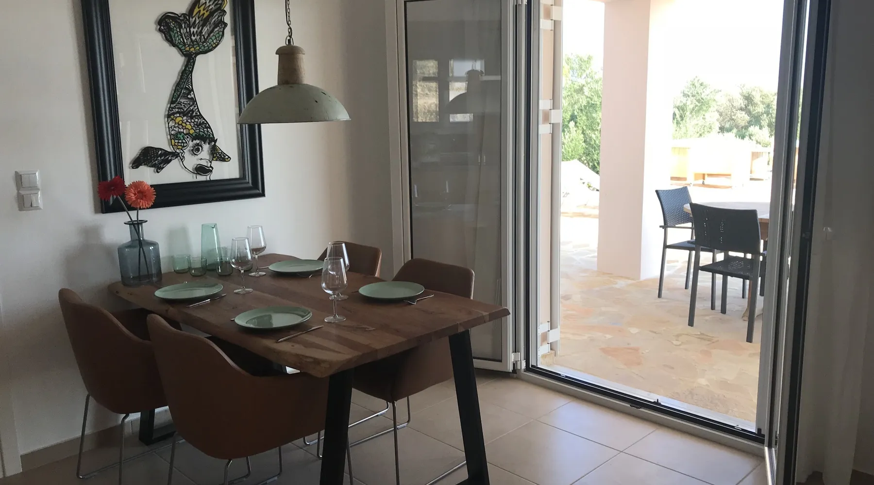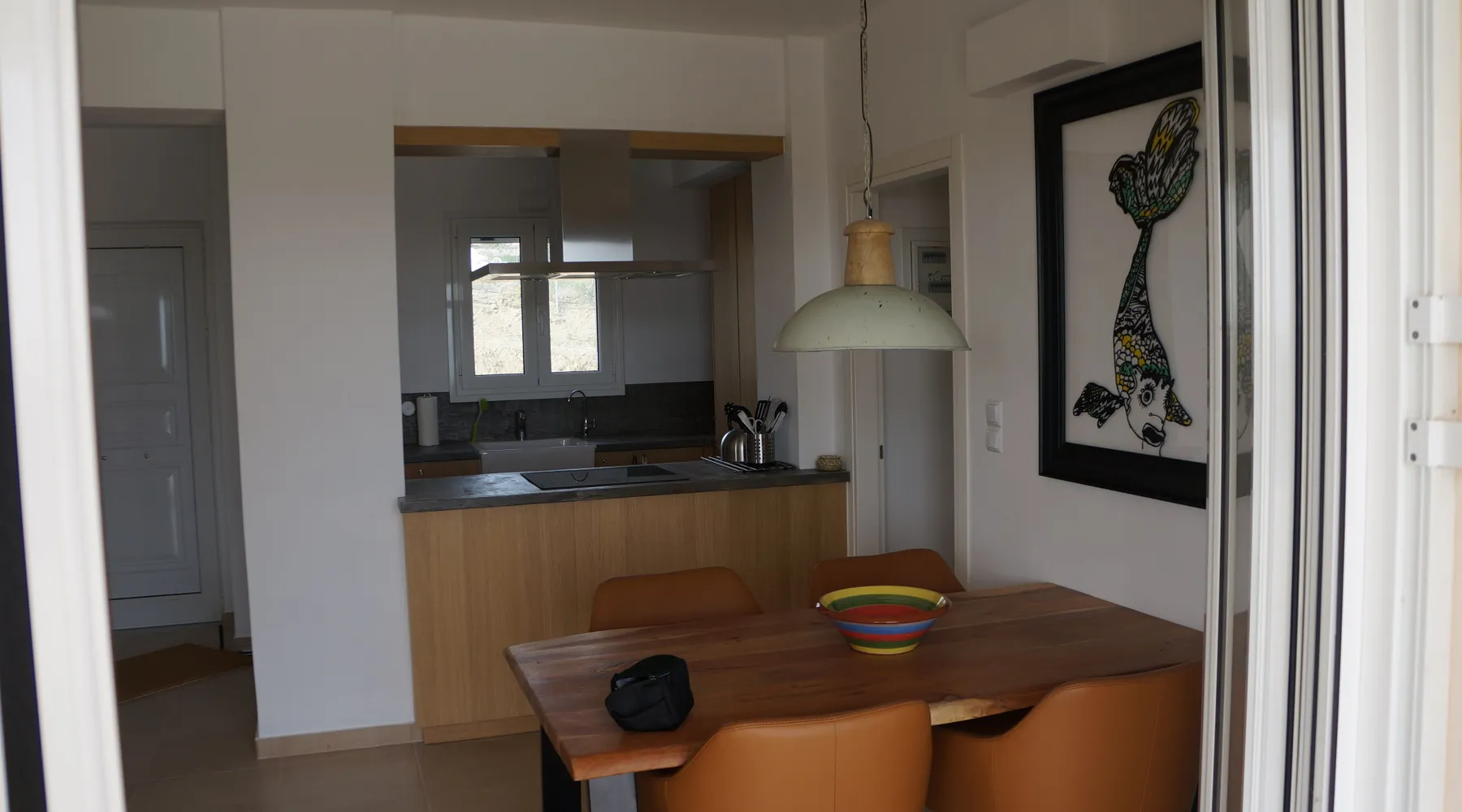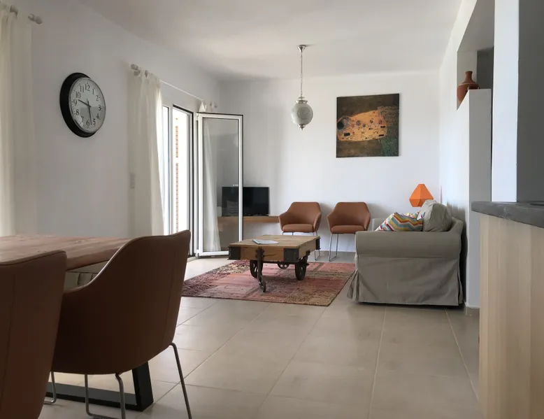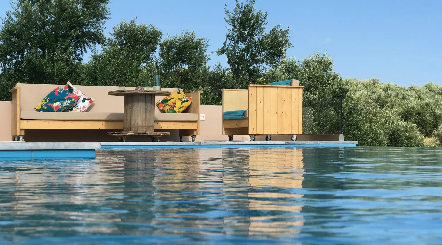 Villa Elia (2017) is a luxury holiday home with a private infinity swimming pool and outdoor shower. There are three terraces. The villa is located in a beautiful olive grove. The terrace upstairs has a beautiful view over the valley and the village of Finiki. The luxurious kitchen diner is fully equipped including clean drinking water. On the same floor you will find the cozy living room, a toilet, a luxurious bathroom and the master bedroom with doors opening onto the terraces with a sea view. On the terrace is a lounge set with a parasol, wonderful sun beds to relax by the pool. All windows and doors are fitted with mosquito nets. 2 bedrooms with large terrace with luxury bathroom are on the first floor. From all rooms you have a beautiful view of the sea and the valley. Both bedrooms have two separate box springs, which can be connected, and have a closet. All bedrooms are air-conditioned. A washing machine is available in the garage. Villa Elia stands in the middle of the Natura 2000 nature reserve, in a valley with unobstructed views and a serene tranquility. You can walk to the Greek tavern Apolafsy. At 2 kilometers you will find the village of Evangelismos, where you will find an authentic Greek village tavern, and a mini supermarket. Ideal for families who want to have their own villa together, but still. You therefore also book Villa Kamaria l. These houses are in the same area.
