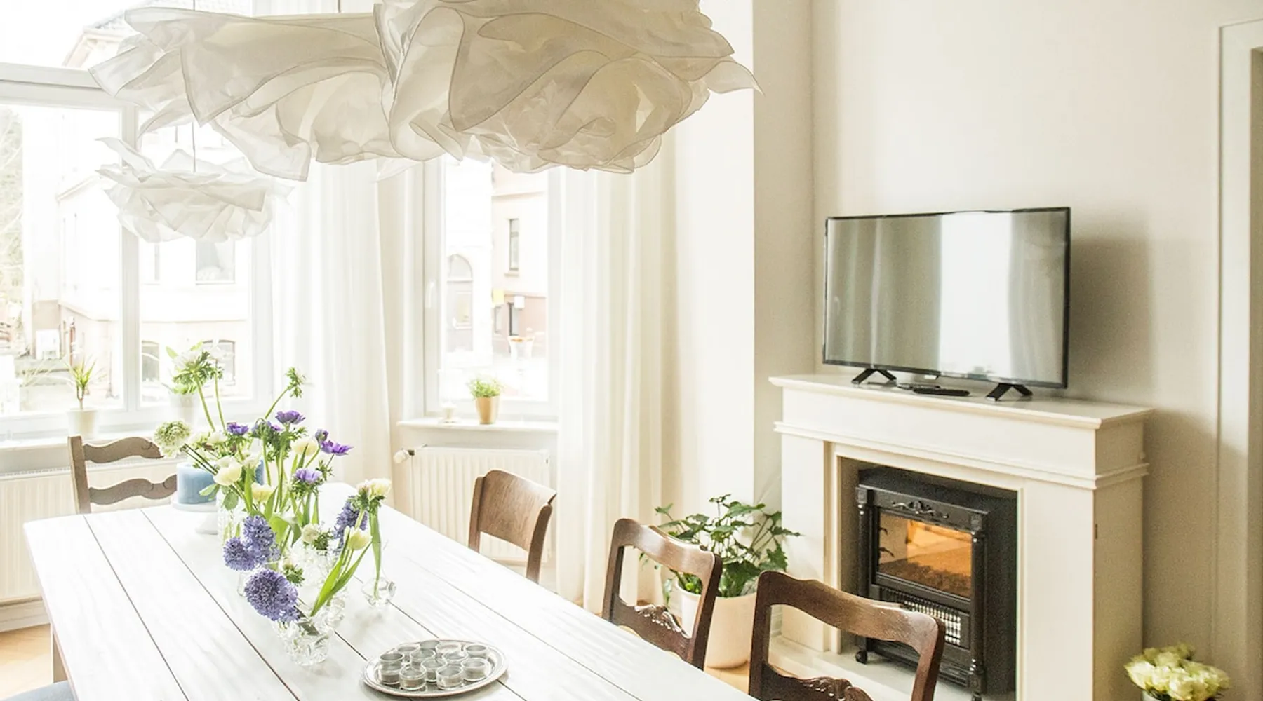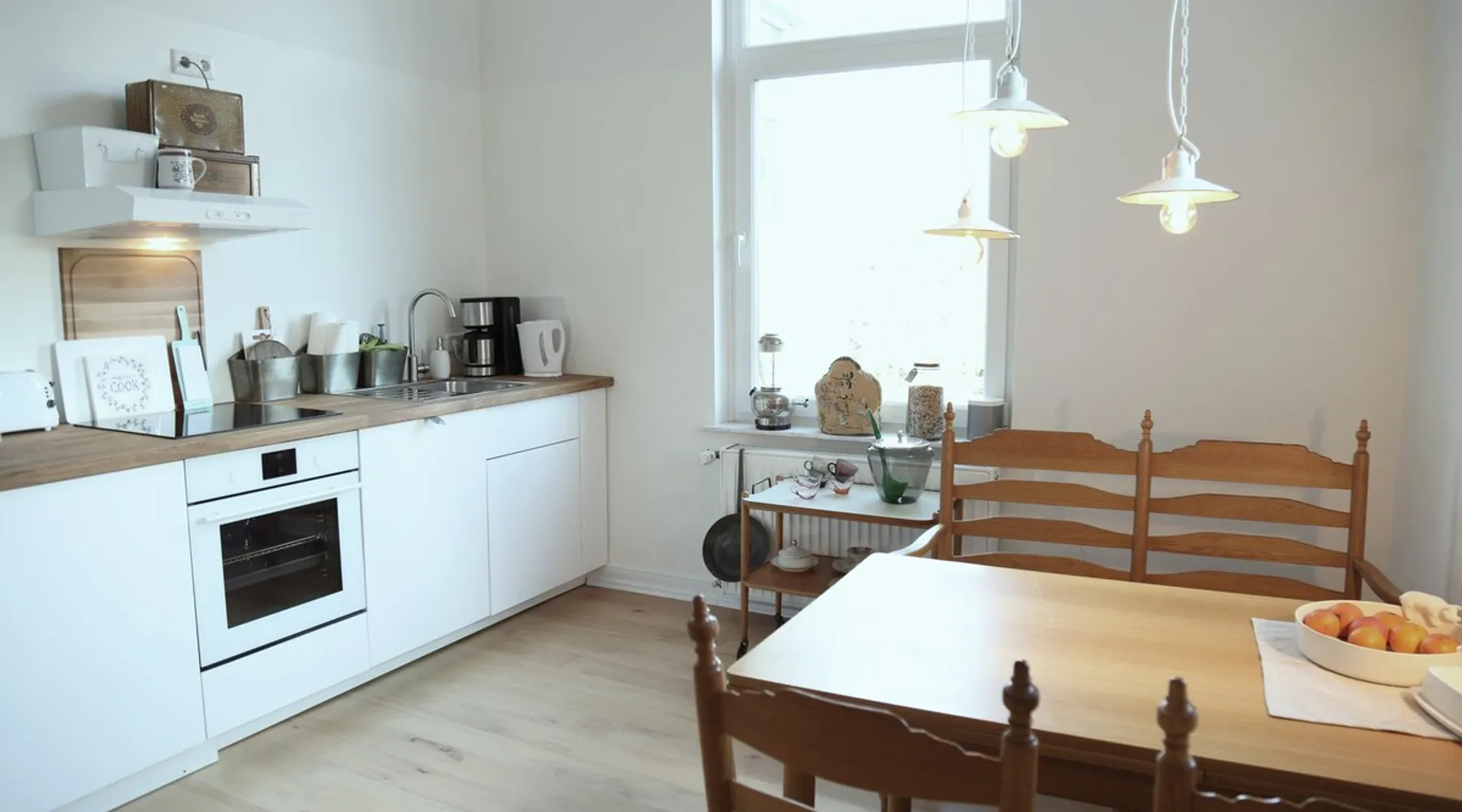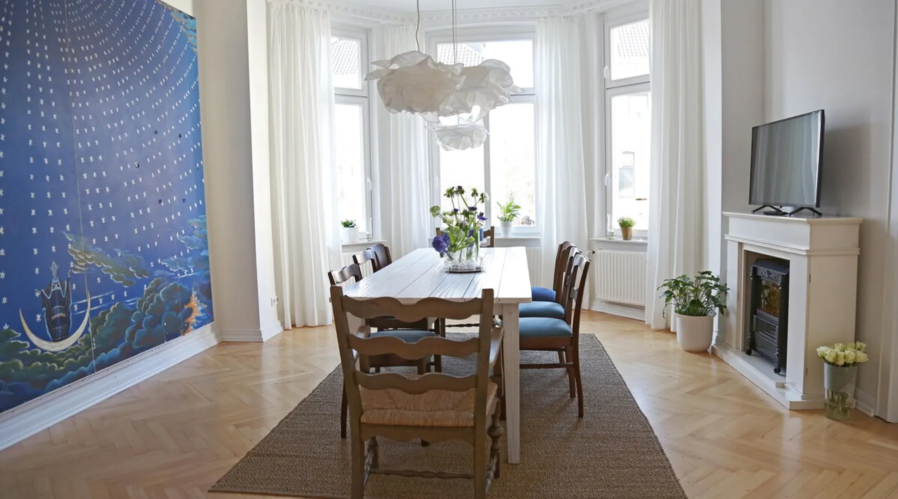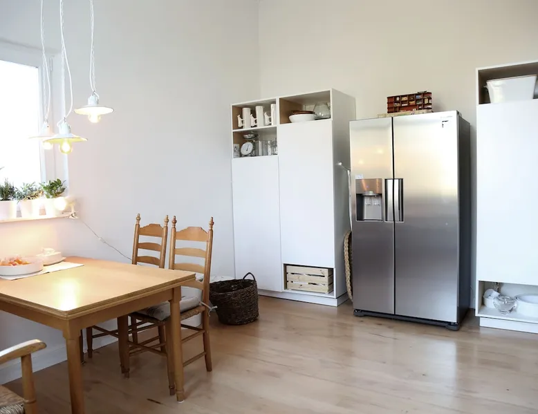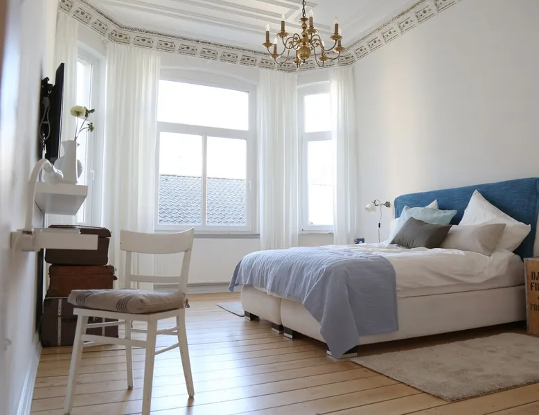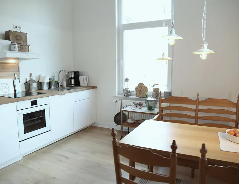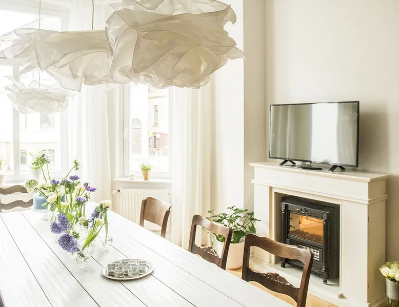 Your home away from home This lovingly furnished 130 m² old building apartment in the heart of Oldenburg fulfills every wish. It is decorated in vintage style. Equally casual and comfortable, with a strong pinch of Oldenburg local color. You will fall in love as soon as you enter the apartment. It is ideal for long stays. It is also conceivable to use it as an event room, for meetings, as a film set, etc. You name it - it has it! The space Great spacious old building apartment furnished with love - you will be impressed Parking and garage by the house. 4 rooms: Hallway: Wooden floorboards, wardrobe Dining room: Large white designer table for 8, oak parquet flooring, old cabinets, electric fireplace, TV Living room: wooden floor, bay window, cozy reading corner, balcony, oak parquet, comfortable sofa bed, 55" 4K TV, modern music system Bedroom 1: Stucco ceiling, old wooden floorboards, large box spring bed, workstation, TV Bedroom 2: old wooden floorboards, large box spring bed, workplace, TV Guest toilet Bathroom: tub, shower, toilet, music, 3 windows Kitchen: parquet flooring, dining table, Frisian bench and 2 Frisian chairs, fully equipped with American fridge for ice cubes and cold water, dishwasher, toaster, stove, oven, mixer, coffee maker, kettle, washing machine Fast wifi Guest access Private kitchen, bathroom with toilet, guest toilet, fast Wi-Fi, balcony, parking Other things to note Furnished with love - great old building atmosphere and many hidden details, great amenities such as American refrigerator, TV 55" 4K, modern stereo system for living room, kitchen, bathroom, Fast WiFi,