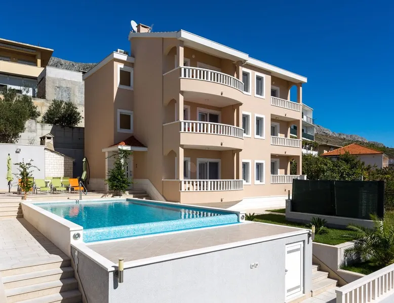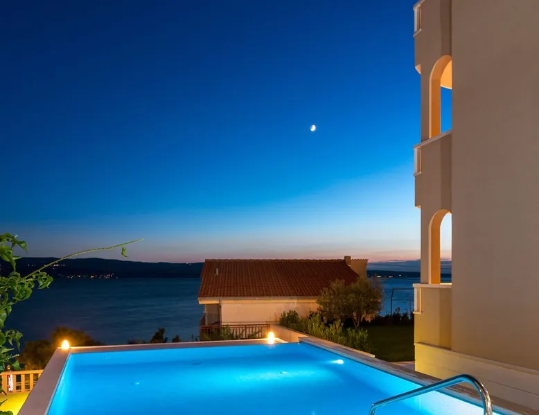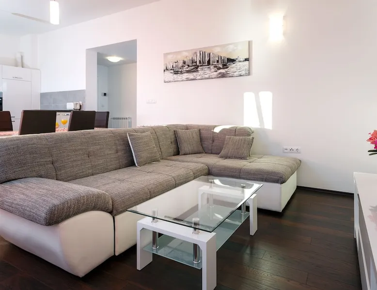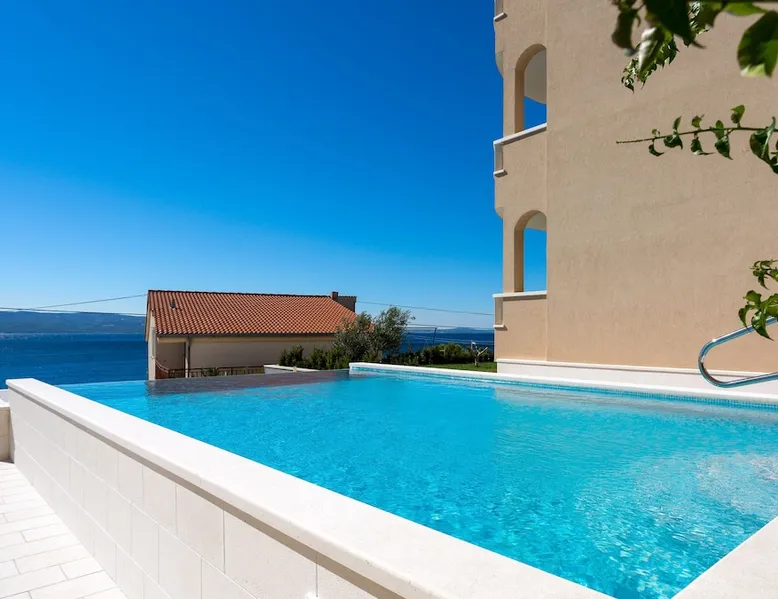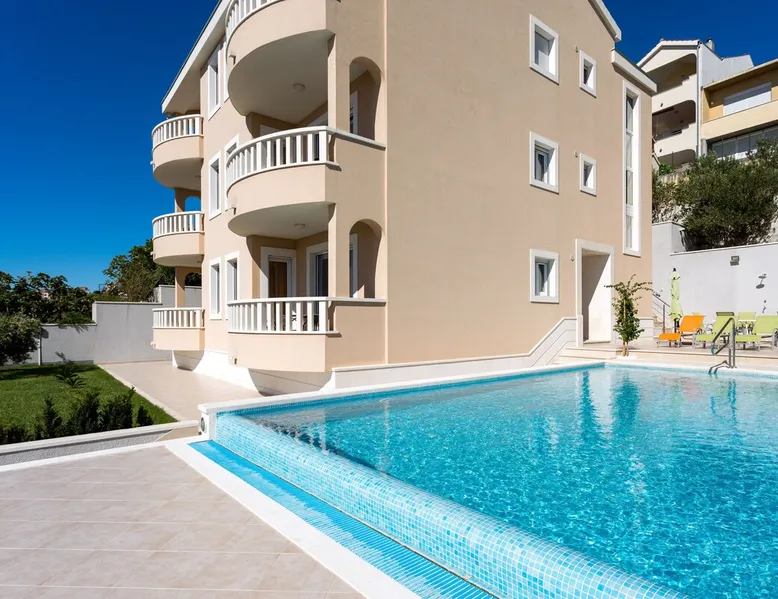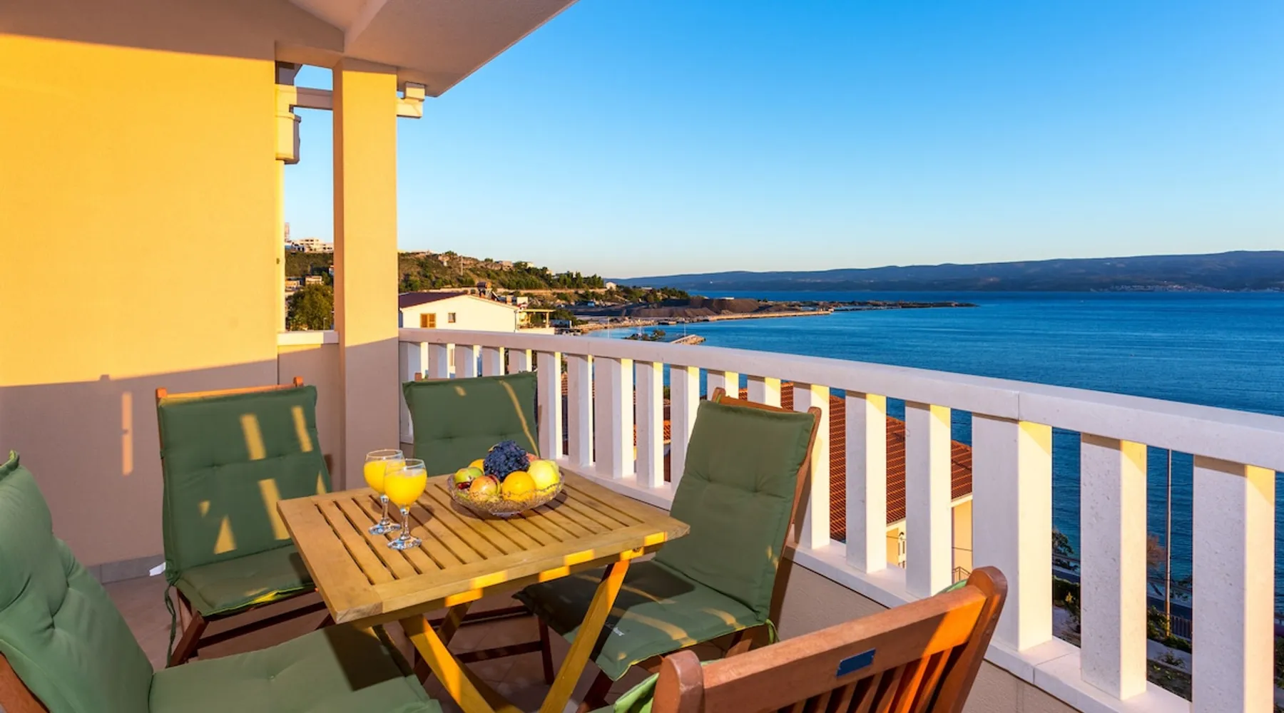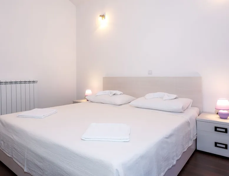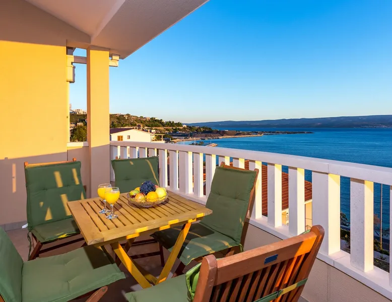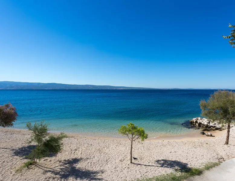 Our holiday apartment (A6) is one of six apartments with a sea view, for a maximum of 5 people, a five-minute walk from the town centre in Dugi Rat. The apartment is located on the second floor of the eastern house. It is 50 metres from the private guest parking space right in front of the house to the beach – a very well-maintained and clean pebble beach with two small cafés, inviting you to relax, sunbathe and swim. It is 6 km to Omiš and 20km to Split, the ‘capital of Dalmatia’. The space The 86m² of living space (not including the balconies) provides ample space to relax. You can recharge your batteries in the two bedrooms with a comfortable double beds, a balcony and a sea view. The living room, the dining room and the kitchen receive plenty of daylight owing to the balcony. The comfortable sofa beds invite you to relax. You can prepare delicious meals in the open, fully-equipped kitchen and dine in the light dining room during the day or on the adjoining balcony in the evening with candlelight – whatever you prefer. The two beautiful bathrooms with modern fittings provide a shower or a bath respectively. Other things to note Please, note that pets are not allowed on our property. Please, note that smoking is not permitted in our property and the entire residential complex, both indoors and outdoors (including the balconies). Parties, loud music, or similar noise disturbances are prohibited. The prescribed quiet hours between 10:00 PM and 6:00 AM must be strictly observed. Visitors are not allowed.