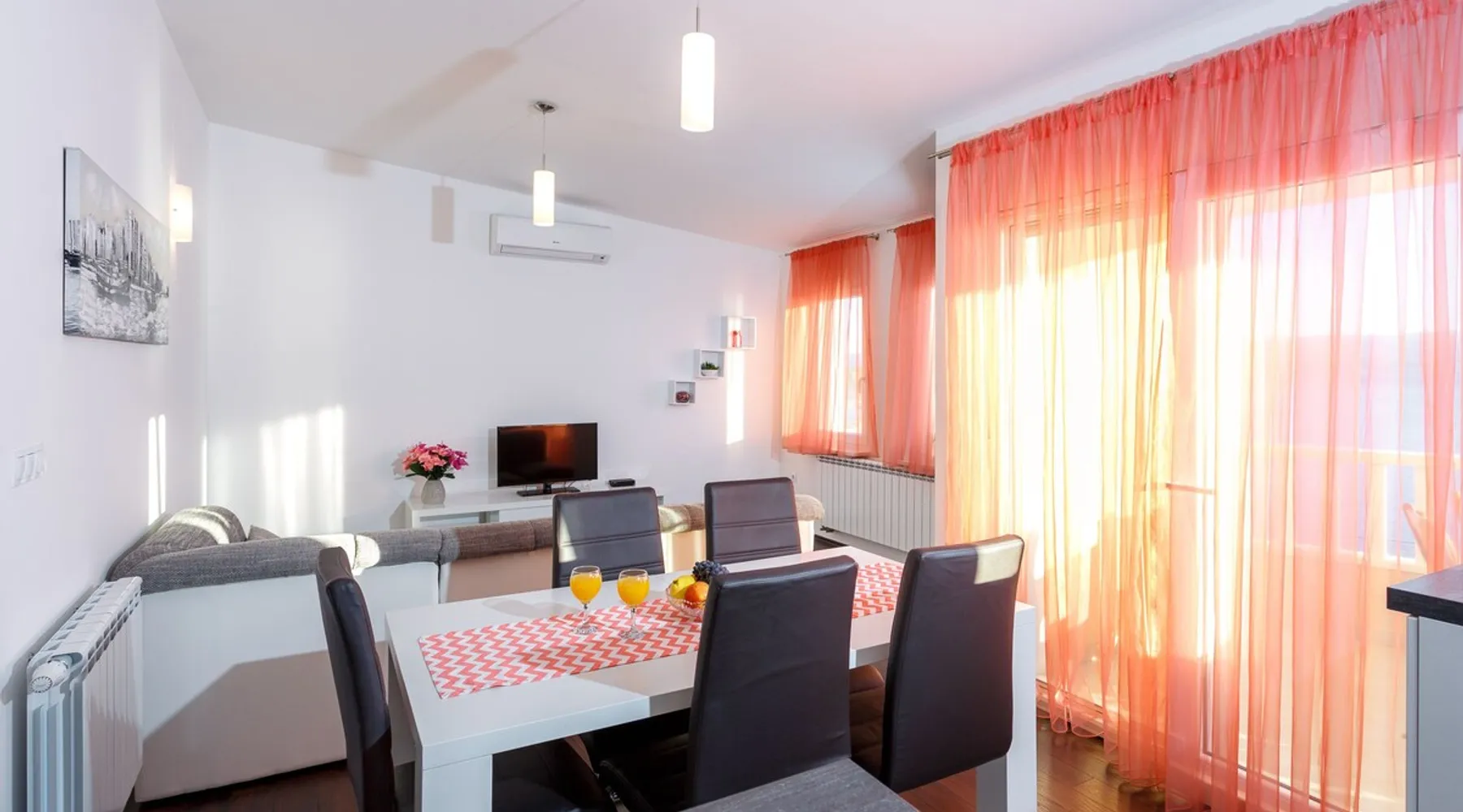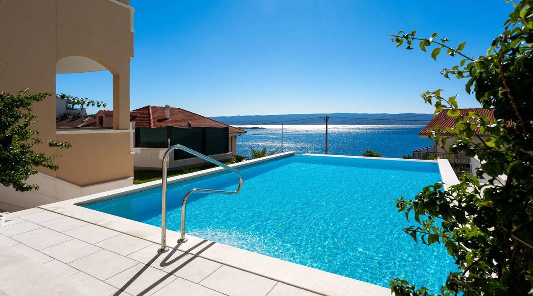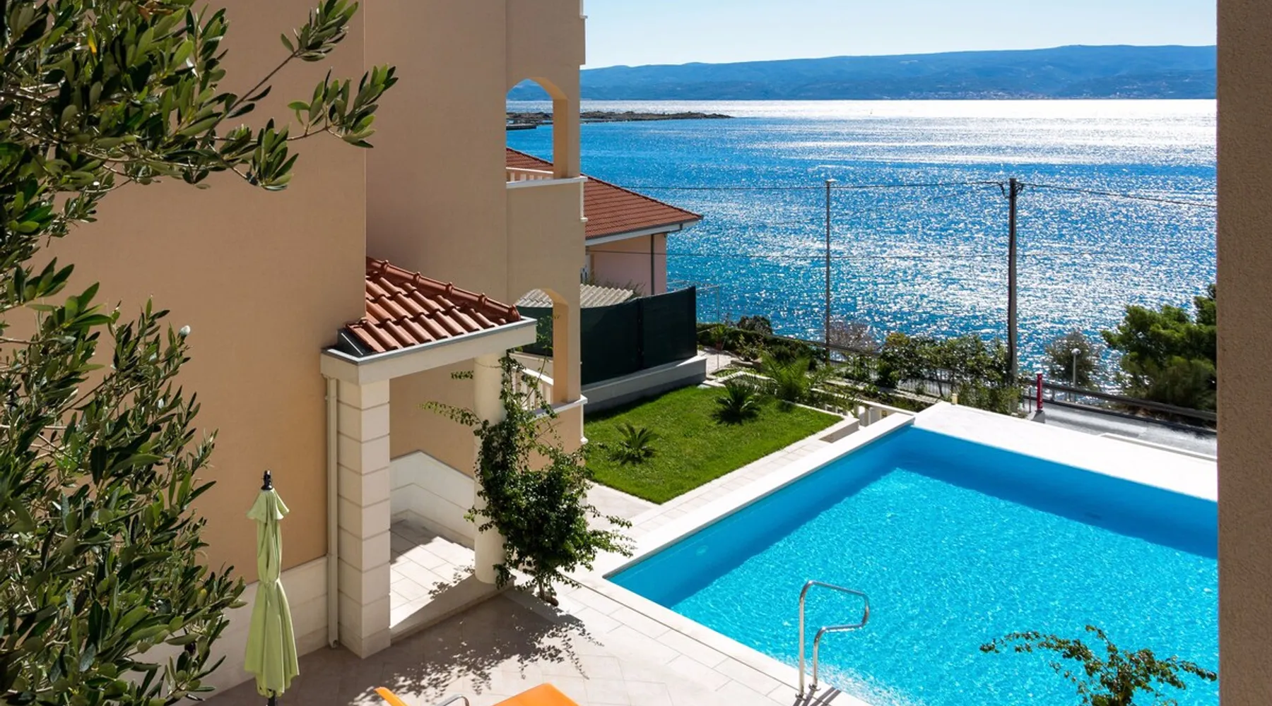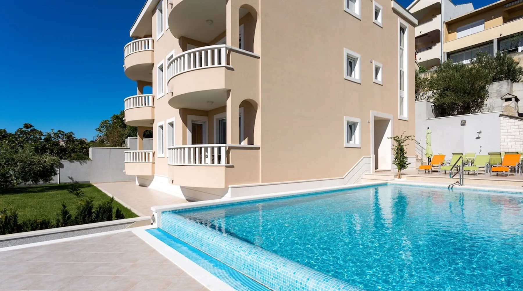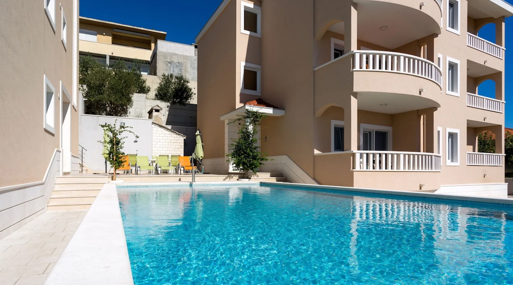 Our holiday apartment (A6) is one of six apartments with a sea view, for a maximum of 5 people, a five-minute walk from the town centre in Dugi Rat. The apartment is located on the second floor of the eastern house. It is 50 metres from the private guest parking space right in front of the house to the beach – a very well-maintained and clean pebble beach with two small cafés, inviting you to relax, sunbathe and swim. It is 6 km to Omiš and 20km to Split, the ‘capital of Dalmatia’. The space The 86m² of living space (not including the balconies) provides ample space to relax. You can recharge your batteries in the two bedrooms with a comfortable double beds, a balcony and a sea view. The living room, the dining room and the kitchen receive plenty of daylight owing to the balcony. The comfortable sofa beds invite you to relax. You can prepare delicious meals in the open, fully-equipped kitchen and dine in the light dining room during the day or on the adjoining balcony in the evening with candlelight – whatever you prefer. The two beautiful bathrooms with modern fittings provide a shower or a bath respectively. Other things to note Please, note that pets are not allowed on our property. Please, note that smoking is not permitted in our property and the entire residential complex, both indoors and outdoors (including the balconies). Parties, loud music, or similar noise disturbances are prohibited. The prescribed quiet hours between 10:00 PM and 6:00 AM must be strictly observed. Visitors are not allowed.