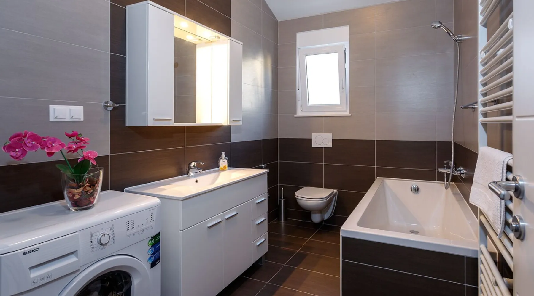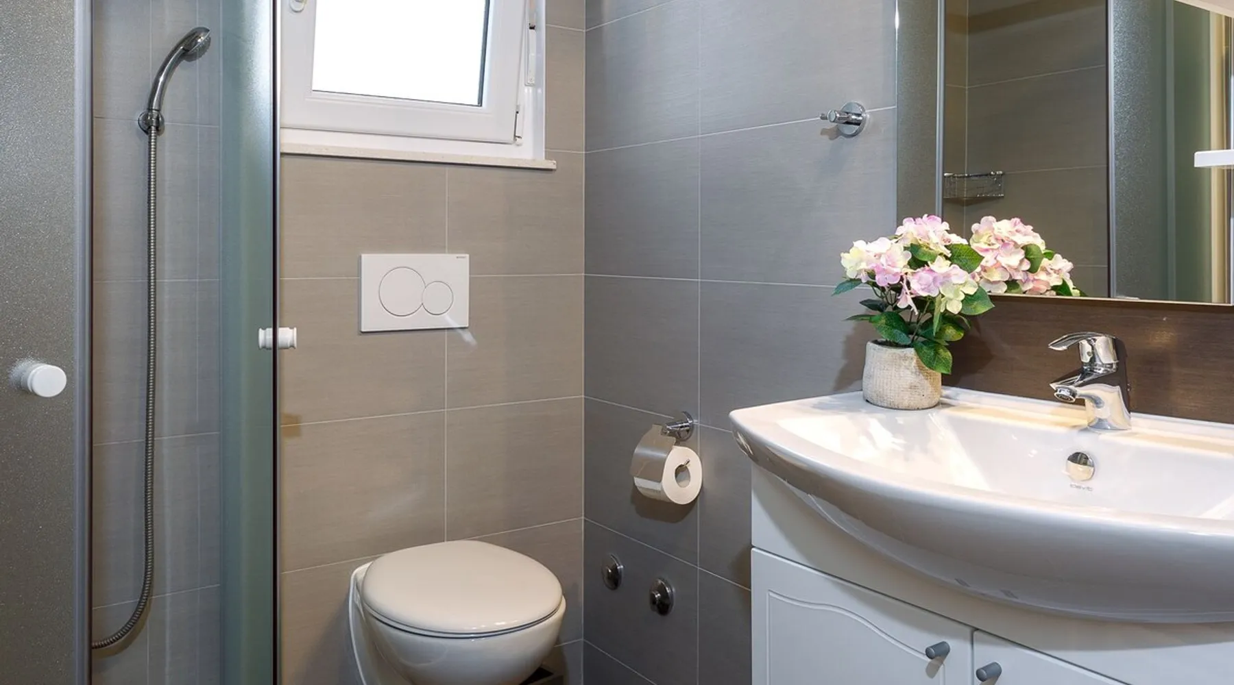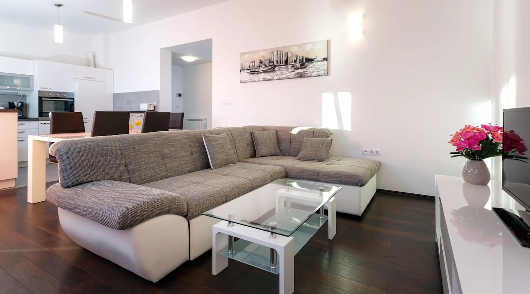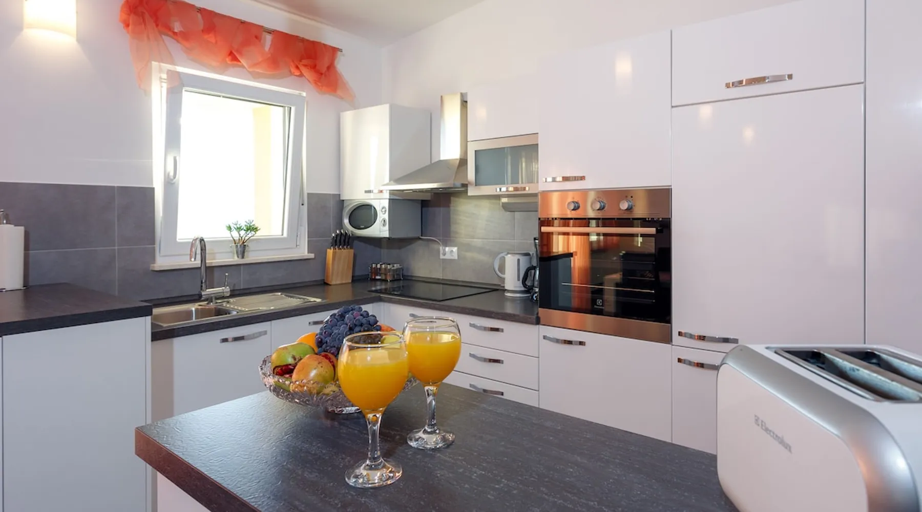 Our holiday apartment (A6) is one of six apartments with a sea view, for a maximum of 5 people, a five-minute walk from the town centre in Dugi Rat. The apartment is located on the second floor of the eastern house. It is 50 metres from the private guest parking space right in front of the house to the beach – a very well-maintained and clean pebble beach with two small cafés, inviting you to relax, sunbathe and swim. It is 6 km to Omiš and 20km to Split, the ‘capital of Dalmatia’. The space The 86m² of living space (not including the balconies) provides ample space to relax. You can recharge your batteries in the two bedrooms with a comfortable double beds, a balcony and a sea view. The living room, the dining room and the kitchen receive plenty of daylight owing to the balcony. The comfortable sofa beds invite you to relax. You can prepare delicious meals in the open, fully-equipped kitchen and dine in the light dining room during the day or on the adjoining balcony in the evening with candlelight – whatever you prefer. The two beautiful bathrooms with modern fittings provide a shower or a bath respectively. Other things to note Please, note that pets are not allowed on our property. Please, note that smoking is not permitted in our property and the entire residential complex, both indoors and outdoors (including the balconies). Parties, loud music, or similar noise disturbances are prohibited. The prescribed quiet hours between 10:00 PM and 6:00 AM must be strictly observed. Visitors are not allowed.