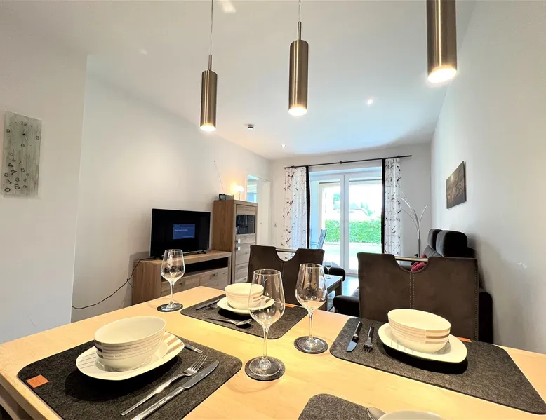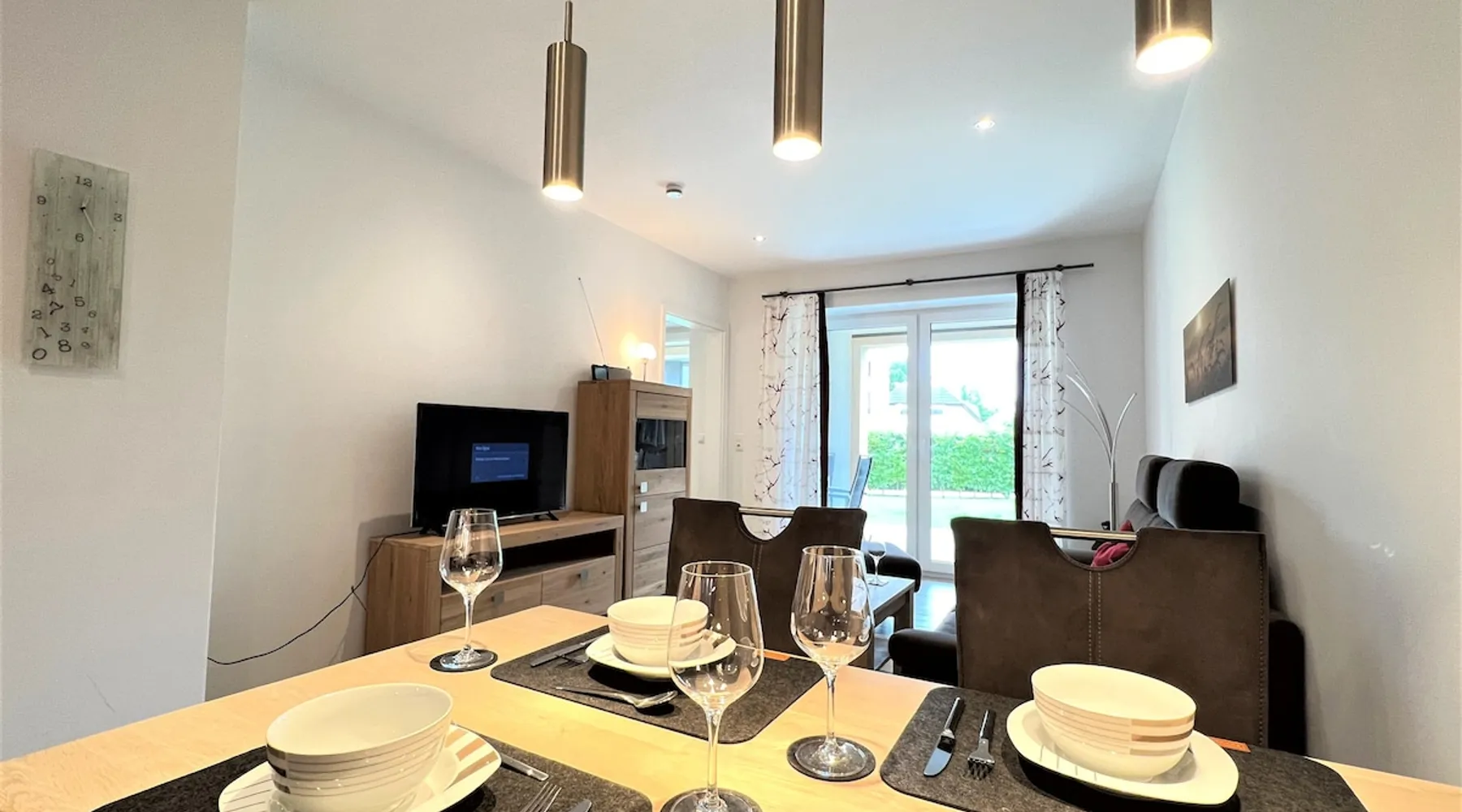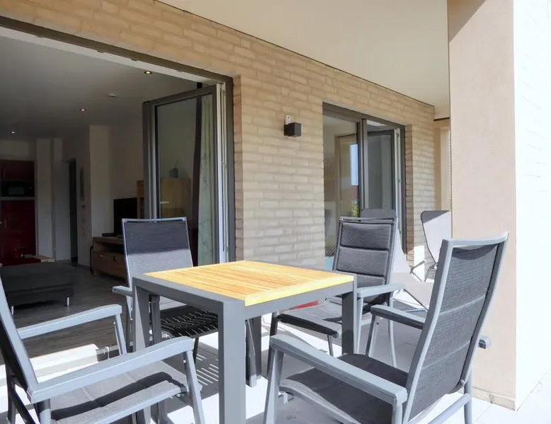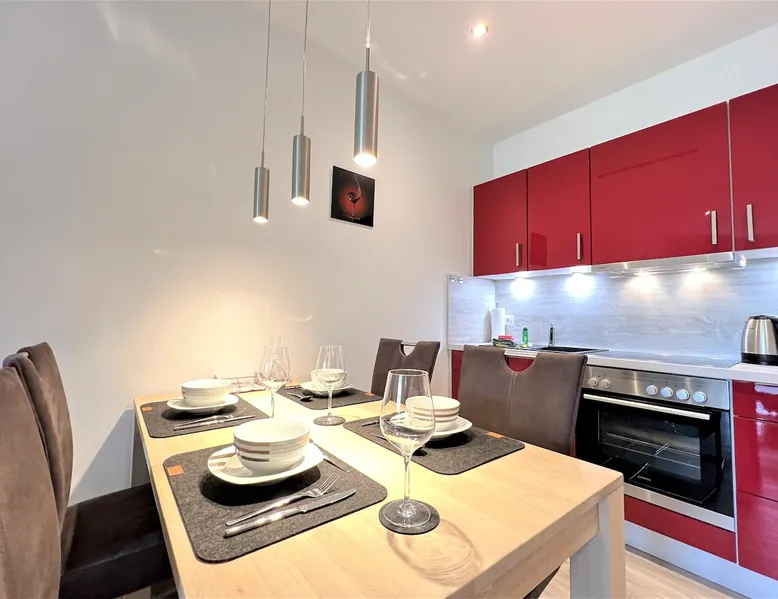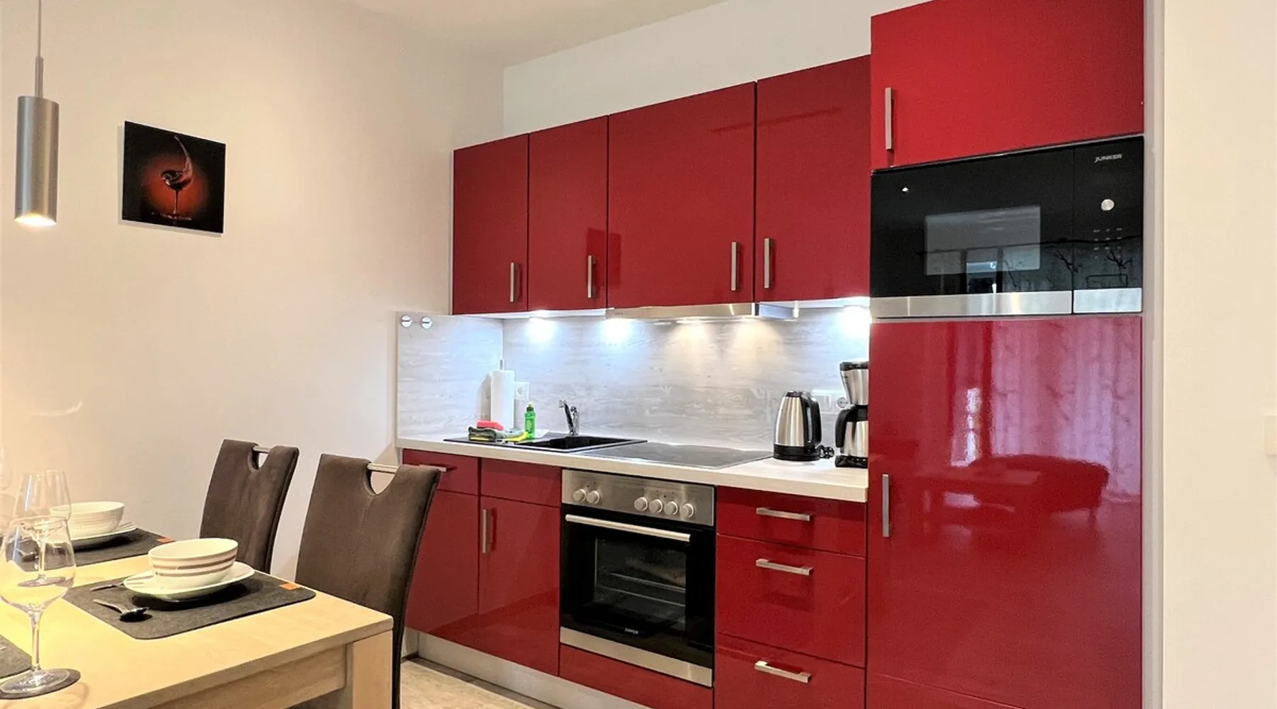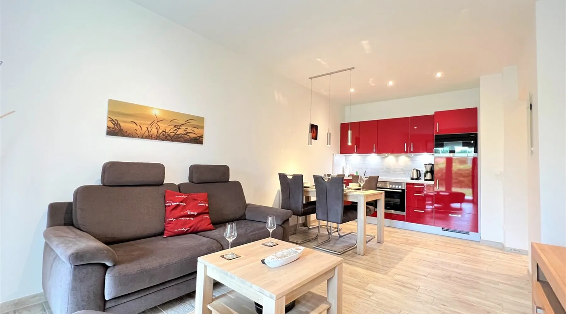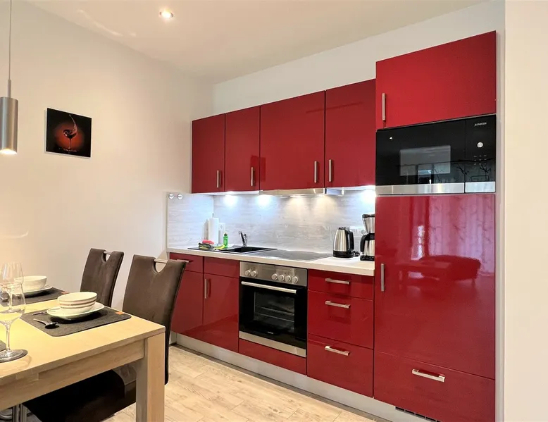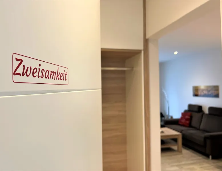Wir heißen Sie Willkommen und möchten Ihnen ´Zweisamkeit´ vorstellen. Other things to note Sie gelangen über den Eingangsbereich direkt in das Herz der Wohnung: dem offenen Wohn-Essbereich. Hier erwarten Sie eine voll ausgestattete rote Küche in Hochglanz , die Essecke und das Wohnzimmer. Rote Akzente ziehen sich durch den Wohnbereich und wurden von den Eigentümern gekonnt in Szene gesetzt. Ein großer Flat-TV sorgt für beste Unterhaltung. Vom Wohnzimmer aus gelangen Sie auf die große, überdachte Ost-Terrasse mit modernen Gartenmöbeln inklusive Liegen. Das Schlafzimmer und der Wohn-Essbereich liegen nebeneinander mit Blick auf die Terrasse. Im Schlafzimmer befinden sich ein komfortables Doppelbett, ein Flat-TV und ein geräumiger Kleiderschrank. Vom Schlafzimmer geht es weiter zu Ihrem Duschbad mit Tageslicht, beleuchtetem Spiegel und Sommerregendusche. Im Bad sorgt ein integriertes Radio schon morgens für gute Stimmung. Das Apartment ist durchgehend mit blickdichten Plissees, bzw. Vorhängen, Fußbodenheizung, WLAN und Spotlights ausgestattet. Für Ihre Fahrräder oder E-Bikes steht Ihnen ein Fahrradraum im Keller des Nachbarhauses zur Verfügung. Für gemütliche Stunden sind verschiedene Spiele und Bücher zur Nutzung in der Wohnung. SPECIAL FÜR ALLEINREISENDE: Sie erhalten einen Single-Rabatt von 15% auf den reinen Mietpreis pro Nacht, ausgewiesen wird der Rabatt mit der Buchungsbestätigung. Zusätzliche Leistungen gegen Aufpreis möglich: Handtücher (1 Duschtuch + 2 Handtücher) und Bettwäsche auf Anfrage, Zwischenreinigung, Handtuch-/Bettwäschewechsel Reisen Sie mit Ihrem Hund an, entstehen Extrakosten in Höhe von € 8,00 pro Tag. Daten und Fakten: Allgemein: Apartment ca. 49 m², Erdgeschoss, barrierefrei, Fahrstuhl, max. 2 Personen, Fußbodenheizung, WLAN, Fahrradabstellraum im Keller des Nachbarhauses, Nichtraucherwohnung Wohnzimmer: dunkelbraune Couch, Holztisch, TV-Lowboard, Vitrinenschrank, Stehlampe, Flachbildfernseher, Empfang deutschsprachiger TV-Programme (SAT-Anlage), Radio. Schlafzimmer: Doppelbett (Maße: 180 x 200 cm), Nachttische, Leselampen, Herrendiener, Kleiderschrank, Flat-TV Küche und Haushalt: Einbauküche, Kühlschrank mit Gefrierfach, 4-Zonen Cerankochfeld, Backofen, Mikrowelle, Geschirrspüler, Filterkaffeemaschine, Wasserkocher, Elektro Kontaktgrill, hochwertiges Geschirr und Besteck, Esstisch mit 4 Stühlen Bad und Sanitär: bodentiefe, barrierefreie Dusche, Waschtischanlage mit beleuchtetem Spiegel, WC, Handtuchheizung, Föhn, beleuchteter Schminkspiegel, Bad-Radio, Wandregal Haushalt: Staubsauger, diverse Reinigungsutensilien, Wäscheständer Ausstattung Außen: Süd-Ostterrasse, Sitzgarnitur für vier Personen mit Tisch, 2 Sonnenliegen, Sonnenschirm, PKW-Stellplatz - befindet sich in unmittelbarer Hausnähe Besonderheiten: behindertenfreundlich, Rauchen auf der Terrasse erlaubt Aufteilung-Zimmer: 1 Wohn-Essbereich, 1 Schlafzimmer,1 Badezimmer, 1 Terrasse