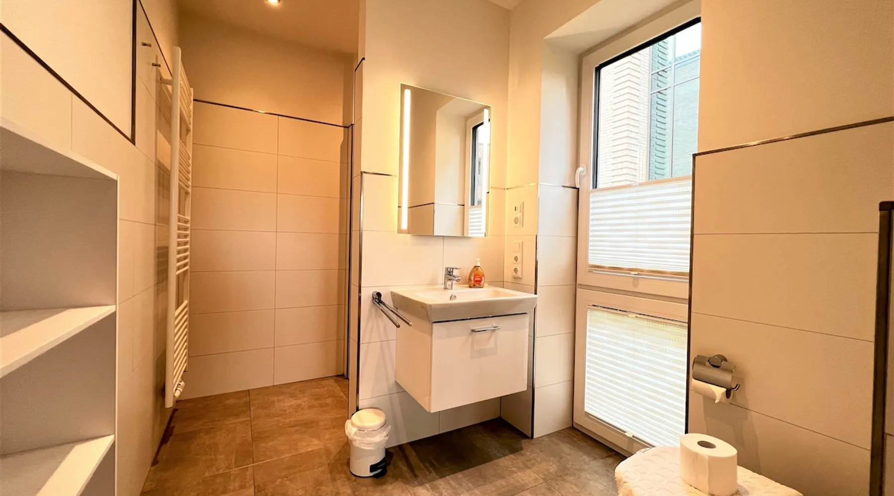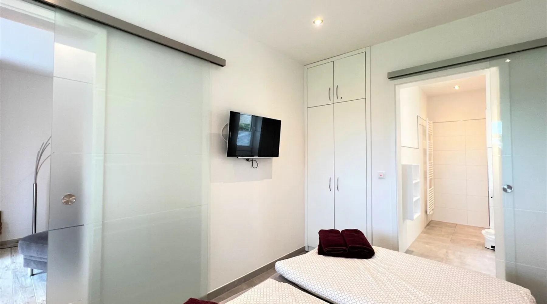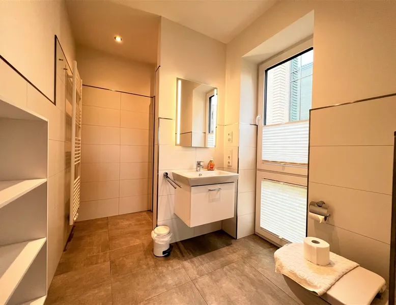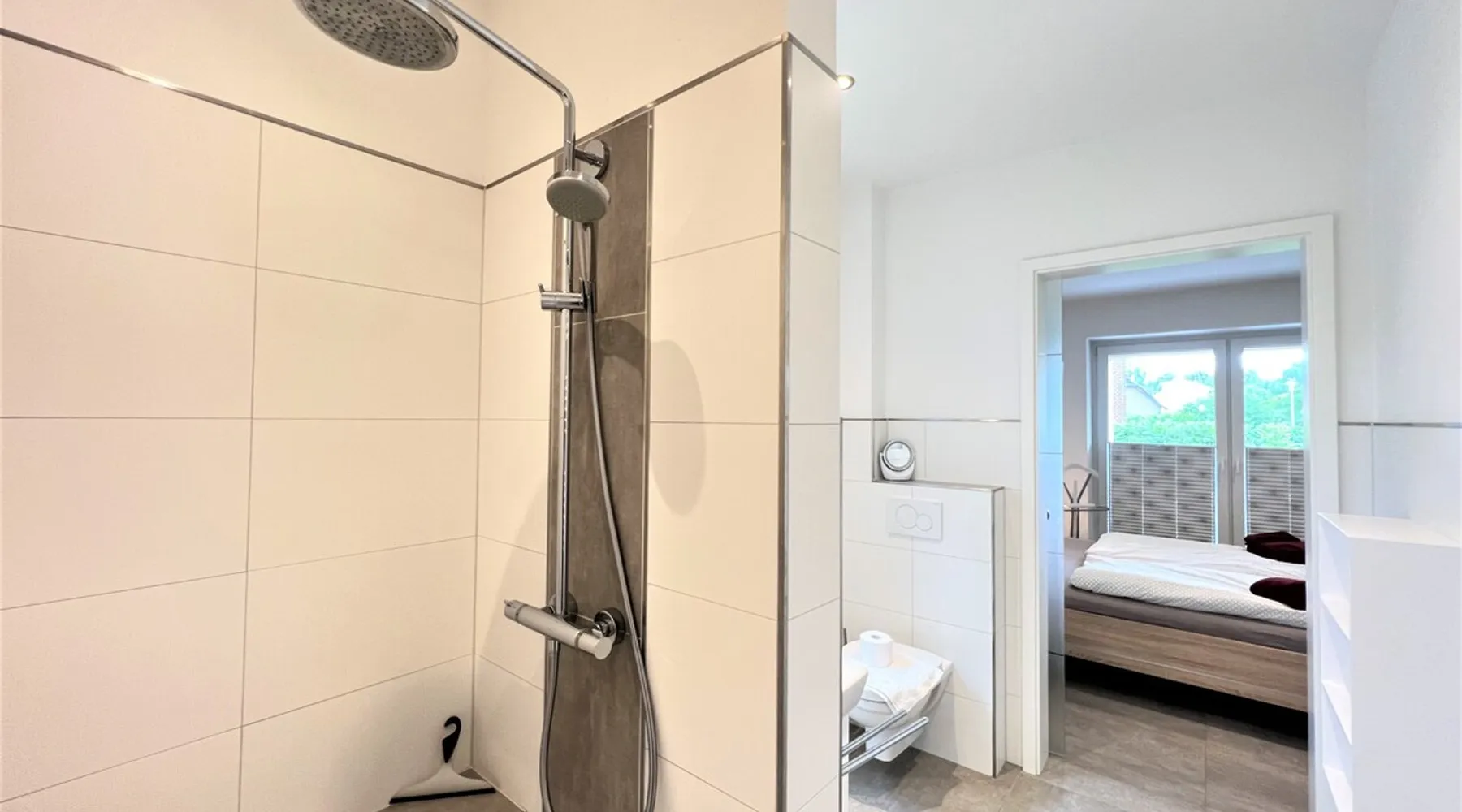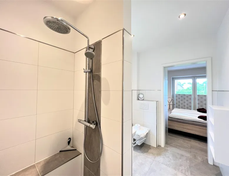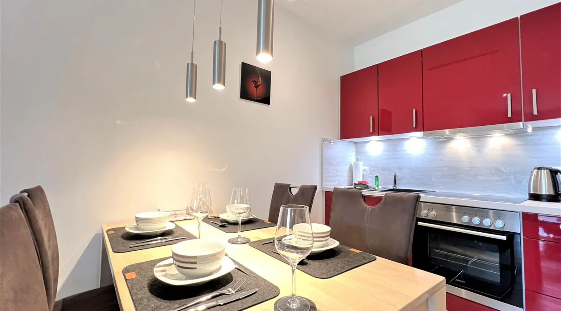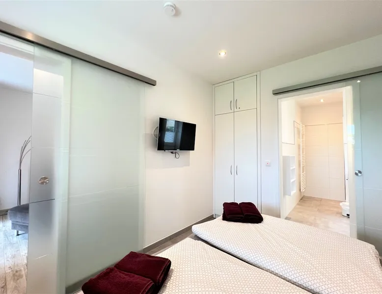Wir heißen Sie Willkommen und möchten Ihnen ´Zweisamkeit´ vorstellen. Other things to note Sie gelangen über den Eingangsbereich direkt in das Herz der Wohnung: dem offenen Wohn-Essbereich. Hier erwarten Sie eine voll ausgestattete rote Küche in Hochglanz , die Essecke und das Wohnzimmer. Rote Akzente ziehen sich durch den Wohnbereich und wurden von den Eigentümern gekonnt in Szene gesetzt. Ein großer Flat-TV sorgt für beste Unterhaltung. Vom Wohnzimmer aus gelangen Sie auf die große, überdachte Ost-Terrasse mit modernen Gartenmöbeln inklusive Liegen. Das Schlafzimmer und der Wohn-Essbereich liegen nebeneinander mit Blick auf die Terrasse. Im Schlafzimmer befinden sich ein komfortables Doppelbett, ein Flat-TV und ein geräumiger Kleiderschrank. Vom Schlafzimmer geht es weiter zu Ihrem Duschbad mit Tageslicht, beleuchtetem Spiegel und Sommerregendusche. Im Bad sorgt ein integriertes Radio schon morgens für gute Stimmung. Das Apartment ist durchgehend mit blickdichten Plissees, bzw. Vorhängen, Fußbodenheizung, WLAN und Spotlights ausgestattet. Für Ihre Fahrräder oder E-Bikes steht Ihnen ein Fahrradraum im Keller des Nachbarhauses zur Verfügung. Für gemütliche Stunden sind verschiedene Spiele und Bücher zur Nutzung in der Wohnung. SPECIAL FÜR ALLEINREISENDE: Sie erhalten einen Single-Rabatt von 15% auf den reinen Mietpreis pro Nacht, ausgewiesen wird der Rabatt mit der Buchungsbestätigung. Zusätzliche Leistungen gegen Aufpreis möglich: Handtücher (1 Duschtuch + 2 Handtücher) und Bettwäsche auf Anfrage, Zwischenreinigung, Handtuch-/Bettwäschewechsel Reisen Sie mit Ihrem Hund an, entstehen Extrakosten in Höhe von € 8,00 pro Tag. Daten und Fakten: Allgemein: Apartment ca. 49 m², Erdgeschoss, barrierefrei, Fahrstuhl, max. 2 Personen, Fußbodenheizung, WLAN, Fahrradabstellraum im Keller des Nachbarhauses, Nichtraucherwohnung Wohnzimmer: dunkelbraune Couch, Holztisch, TV-Lowboard, Vitrinenschrank, Stehlampe, Flachbildfernseher, Empfang deutschsprachiger TV-Programme (SAT-Anlage), Radio. Schlafzimmer: Doppelbett (Maße: 180 x 200 cm), Nachttische, Leselampen, Herrendiener, Kleiderschrank, Flat-TV Küche und Haushalt: Einbauküche, Kühlschrank mit Gefrierfach, 4-Zonen Cerankochfeld, Backofen, Mikrowelle, Geschirrspüler, Filterkaffeemaschine, Wasserkocher, Elektro Kontaktgrill, hochwertiges Geschirr und Besteck, Esstisch mit 4 Stühlen Bad und Sanitär: bodentiefe, barrierefreie Dusche, Waschtischanlage mit beleuchtetem Spiegel, WC, Handtuchheizung, Föhn, beleuchteter Schminkspiegel, Bad-Radio, Wandregal Haushalt: Staubsauger, diverse Reinigungsutensilien, Wäscheständer Ausstattung Außen: Süd-Ostterrasse, Sitzgarnitur für vier Personen mit Tisch, 2 Sonnenliegen, Sonnenschirm, PKW-Stellplatz - befindet sich in unmittelbarer Hausnähe Besonderheiten: behindertenfreundlich, Rauchen auf der Terrasse erlaubt Aufteilung-Zimmer: 1 Wohn-Essbereich, 1 Schlafzimmer,1 Badezimmer, 1 Terrasse