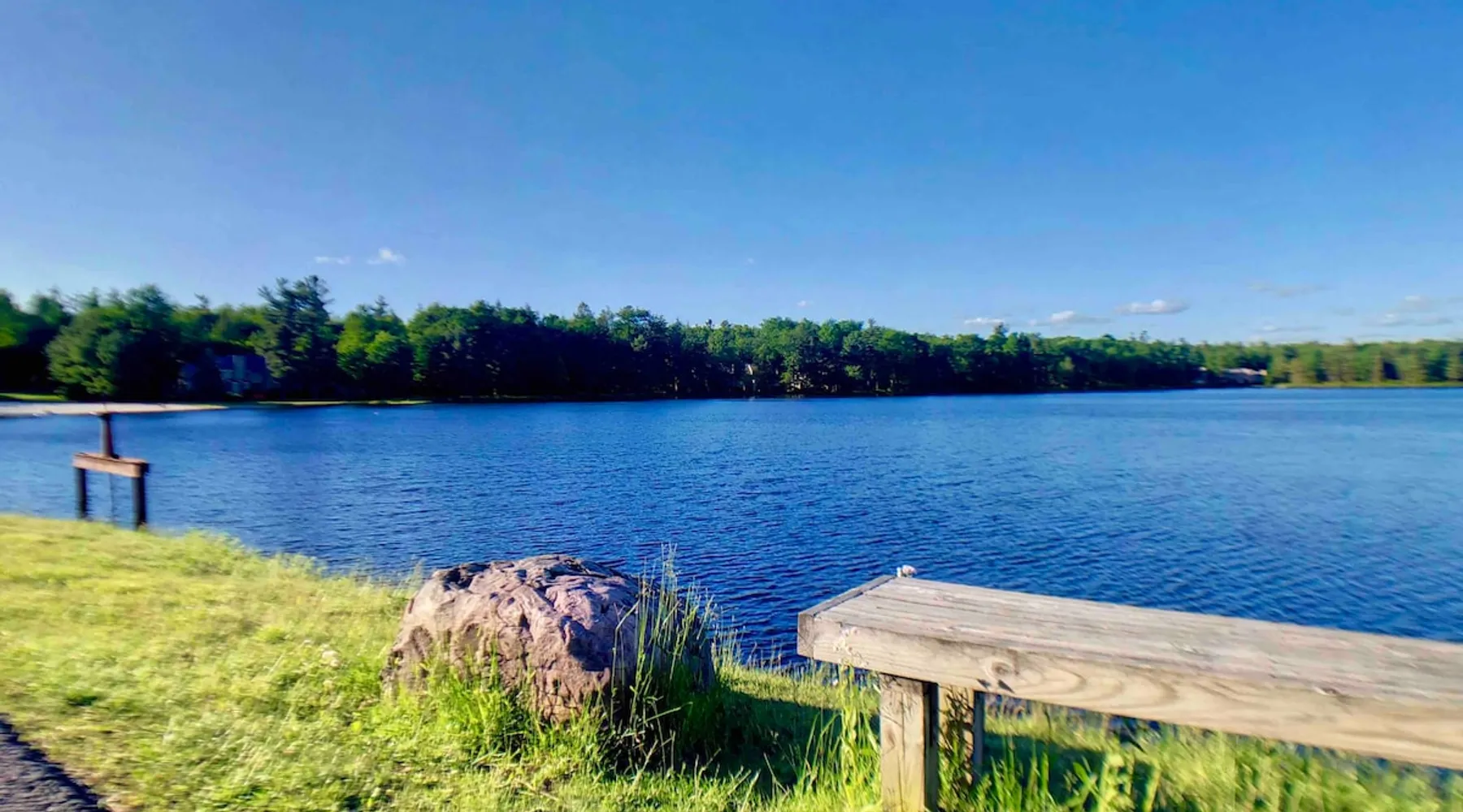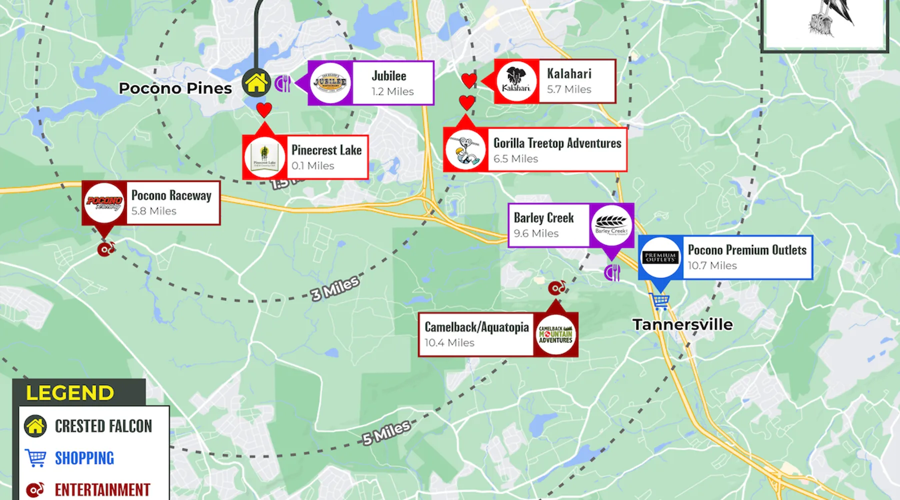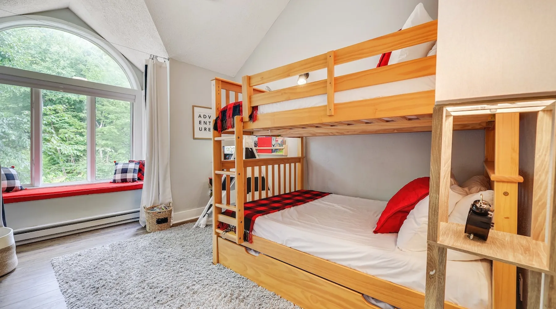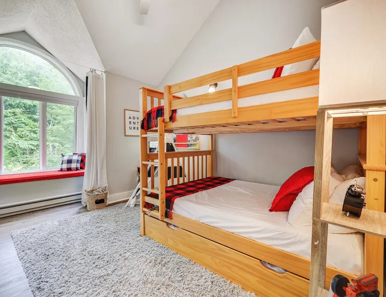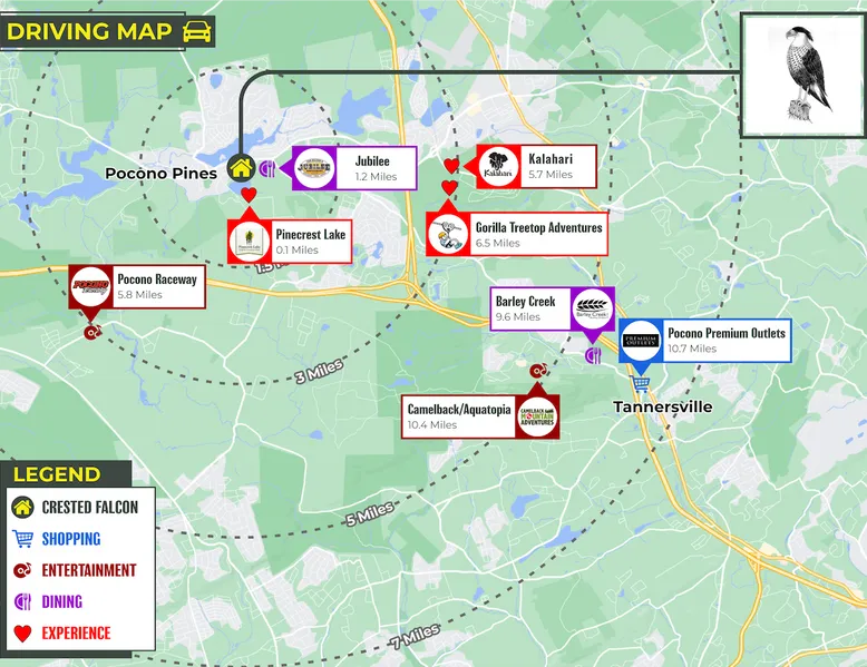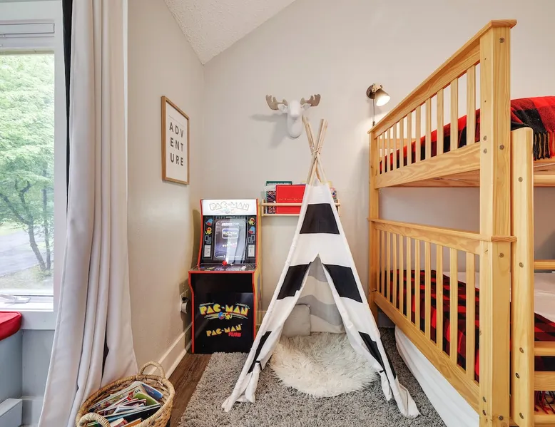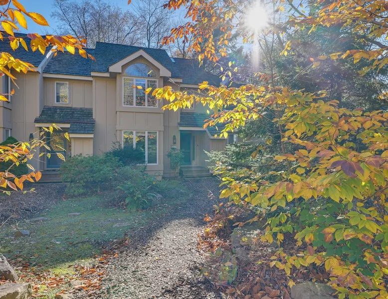⟶ Gaze peacefully at the lake from the deck lounge with fire table ⟶ Perfect for getting a break from the fast pace of everyday life ⟶ Charge up with a Level 2 EV Charger ⟶ Family friendly configuration Guests love CONVENIENT LOCATION & PROXIMITY TO ATTRACTIONS + AMENITIES Casual sophistication at your 1500 square foot 3 bed, 2.5 bath retreat on the lake in Pinecrest Golf & Country Club. Comfortably sleeping 8 in our crisply designed two-level townhome that has a friendly nod to cabin living. The space A redefined lakeview townhome designed for discerning families and groups who value comfort, design, and direct access to resort-quality amenities. Enjoy top-tier seasonal offerings via included private club membership — all just a short walk away: ✦ Oversized outdoor pool with slide, Baja ledge, and lap lanes (open late June–Labor Day) ✦ Sandy beach with lake swim dock ✦ 8 pickleball courts and 6 Har-Tru tennis courts ✦ Access to a par-72, 18-hole golf course (green fees apply) ✦ Private clubhouse dining The Home You’ll park steps away in two dedicated spots — including one with a complimentary Level 2 EV charger — and enter a spacious two-story home fully equipped for relaxing, entertaining, and working remotely. ►►►Main Level Features◄◄◄ ➜ Fully renovated kitchen with olive cabinetry, granite counters, and stainless steel appliances ➜ Live-edge dining table seats 8 comfortably ➜ Living room with buttery leather seating ➜ Electric fireplace with auxiliary heat ➜ 65" 4K Roku Smart TV with Sonos soundbar ➜ Wet bar and coffee station ➜ Powder room off the entry hall ➜ Multispeed Ceiling fan ➜ Individually wall-controlled Minisplit HVAC with A/C & heat ★★★★★ Lakeside deck ★★★★★ • Bistro table for two • Conversation chairs + side table • 3-burner Weber propane grill • Propane fire pit • Outdoor games and spare propane tank stored in closet ►►►Upper Level Sleeping Quarters◄◄◄ All three bedrooms feature cathedral ceilings, zoned ductless mini-split heating and cooling, ceiling fans, remote-controlled tower fans, personal Sonos speakers, and fast-charging USB ports. ★★★★★ Primary Suite (Sleeps 2)★★★★★ ➜ King canopy bed with luxury bamboo blend linens and cool-gel memory foam mattress ➜ 65” 4K Roku Smart TV with Sonos soundbar ➜ Auxiliary heat & cozy ambiance electric fireplace ➜ Private office desk setup with task lighting and USB ports ➜ Private coffee station with Keurig & essentials ➜ Ensuite bath with oversized rain shower + bidet ➜ Full closet with mini fridge, safe, steamer, and hamper ➜ Multispeed Ceiling fan ➜ Individually wall-controlled Minisplit HVAC with A/C & heat ★★★★★ Queen Bedroom (Sleeps 2)★★★★★ ➜ Queen bed with cool-gel memory foam mattress & bold green accent wall ➜ White bamboo blend linens ➜ Bedside charging stations and Sonos One ➜ Multispeed Ceiling fan ➜ Individually wall-controlled Minisplit HVAC with A/C & heat ★★★★★ Bunk Room (Sleeps 5)★★★★★ ➜ Double full bunk beds with twin trundle ➜ Bedside USB charging station ➜ Window seat ➜ Kid tent ➜ 55" 4K Roku Smart TV with Sonos soundbar ➜ Retro Pac-Man arcade game ➜ Multispeed Ceiling fan ➜ Individually wall-controlled Minisplit HVAC with A/C & heat A shared hallway bathroom with tub/shower combo serves the Queen and Bunk rooms, and a full-size LG washer/dryer with detergent is conveniently located at the end of the hall. ►►►Kitchen & Culinary Comforts◄◄◄ Whether you're prepping family meals or enjoying a quick breakfast, the kitchen is stocked for ease and comfort: ◻ Drip coffee maker (filters included), Keurig, pour-over pot, coffee bean grinder + complimentary ground coffee blend ◻ Full cookware set, Instant Pot, toaster, griddle, waffle maker, blender, air fryer, tea kettle, knives, cutting boards & kitchen gadgets ◻ Table service for 12 ◻ Pantry basics like spices, oils, baking essentials, and storage wrap ►►►Tech, Games & Comforts◄◄◄ ◻ Mesh Wi-Fi with blazing 400MB download speeds / 20MB upload ◻ 3 Smart TVs with Roku (Living Room, Primary Suite, Bunk Room) ◻ 4 Sonos zones (Living Room + all 3 bedrooms) ◻ Amazon Echo Show with Alexa voice assistance ◻ Charging stations and USB-integrated outlets at every bedside ◻ Board games, books, toys, high chairs, Pack & Play/travel crib with sheet ◻ 6 Tommy Bahama backpack beach chairs + beach umbrella & cooler ◻ 4 full-size umbrellas for rainy days ►►►Community & Location◄◄◄ Located in the Pinecrest Golf and Country Club community, you’ll have easy seasonal access to: Golf, tennis, pickleball, basketball, lake swimming, and pool Auxiliary parking 1,500 feet from the unit if needed The Crested Falcon is extremely close to activities for adults or the entire family. Our digital welcome guide will provide you information about the home and the community. Nearby area highlights include: - Kalahari Waterpark (13 mins away) - Jack Frost Ski Resort (18 mins away) - Mt Airy Casino (17 mins away) - Camel Beach & Aquatopia (18 mins away) - Pocono Raceway (12 mins away) - Mountain Creek Riding Stables (20 mins away) - Whitewater Challengers Rafting (38 mins away) - Tannersville Premium Outlet Shopping (21 mins away) - Stock Car Racing Experience (17 mins away) - Pocono Whitewater Rafting (29 mins away) - Skytop Ziplining (33 mins away) Provided Essentials Cleaning & Hygiene: ─ Bamboo blend linens, Quality cotton towels, dedicated lake/pool towels ─ Toilet paper, paper towels ─ Meyer's brand soaps and detergents ─ Hair dryer, iron, steamer ironing board, dish sponge, trash bags Kids & Extras: ─ Pack & Play / Travel Crib with sheet ─ High chair conversion kits ─ Toys, games, and books Outdoors: ─ Grill tools ─ Beach and lake day gear (chairs, cooler, umbrella) ─ Covered lakeview deck with fire pit and comfy se