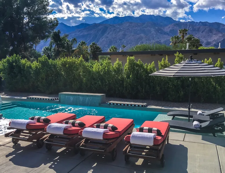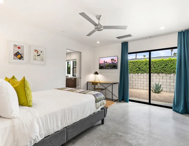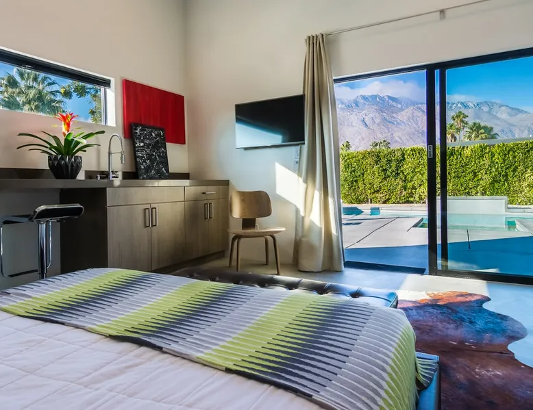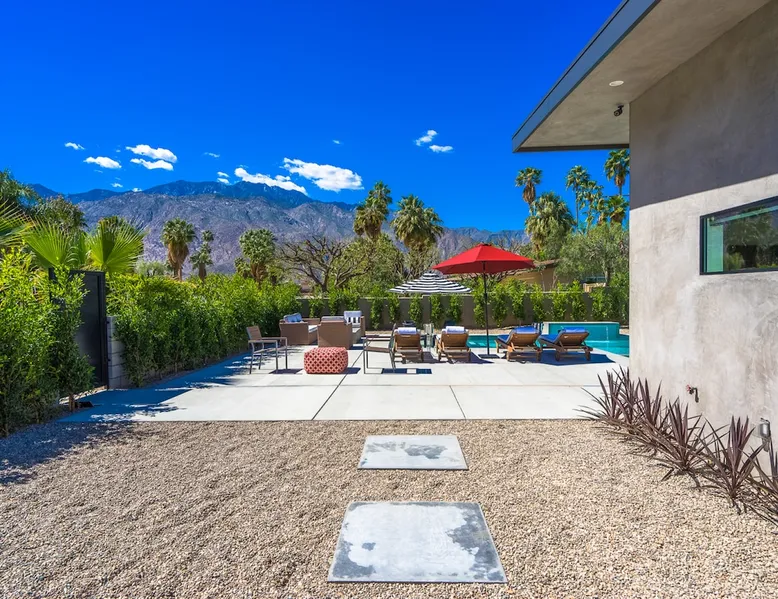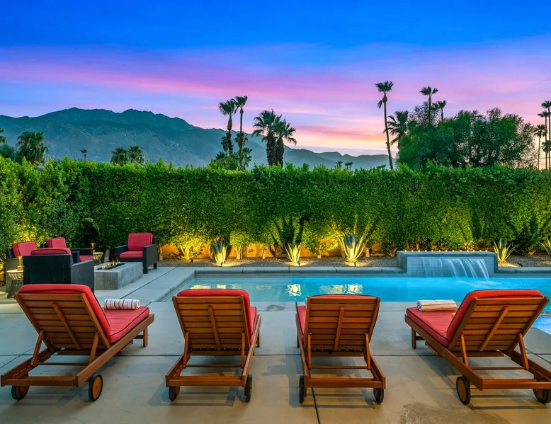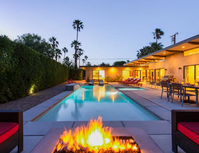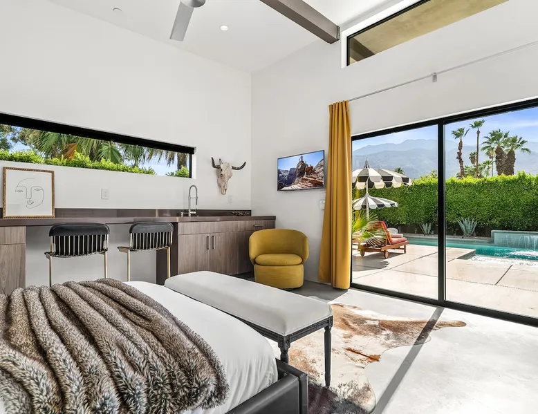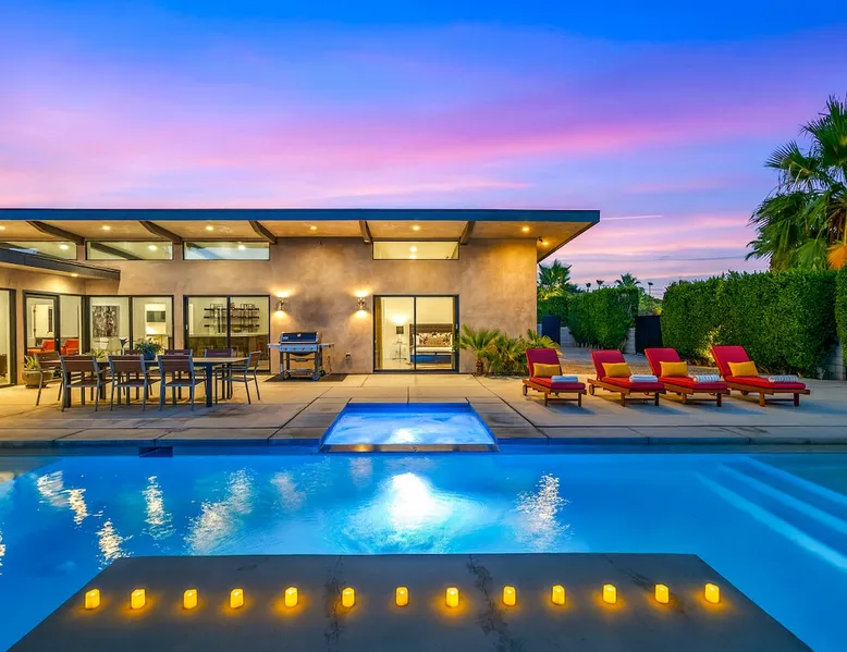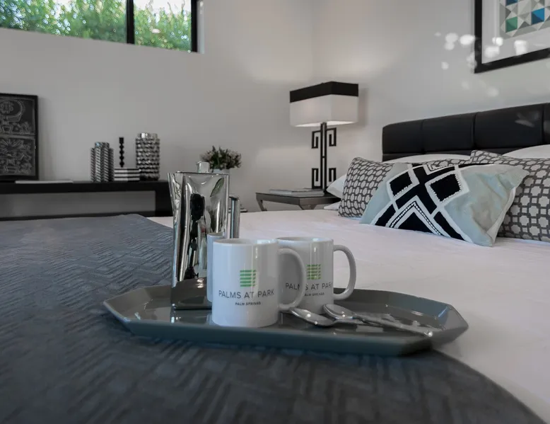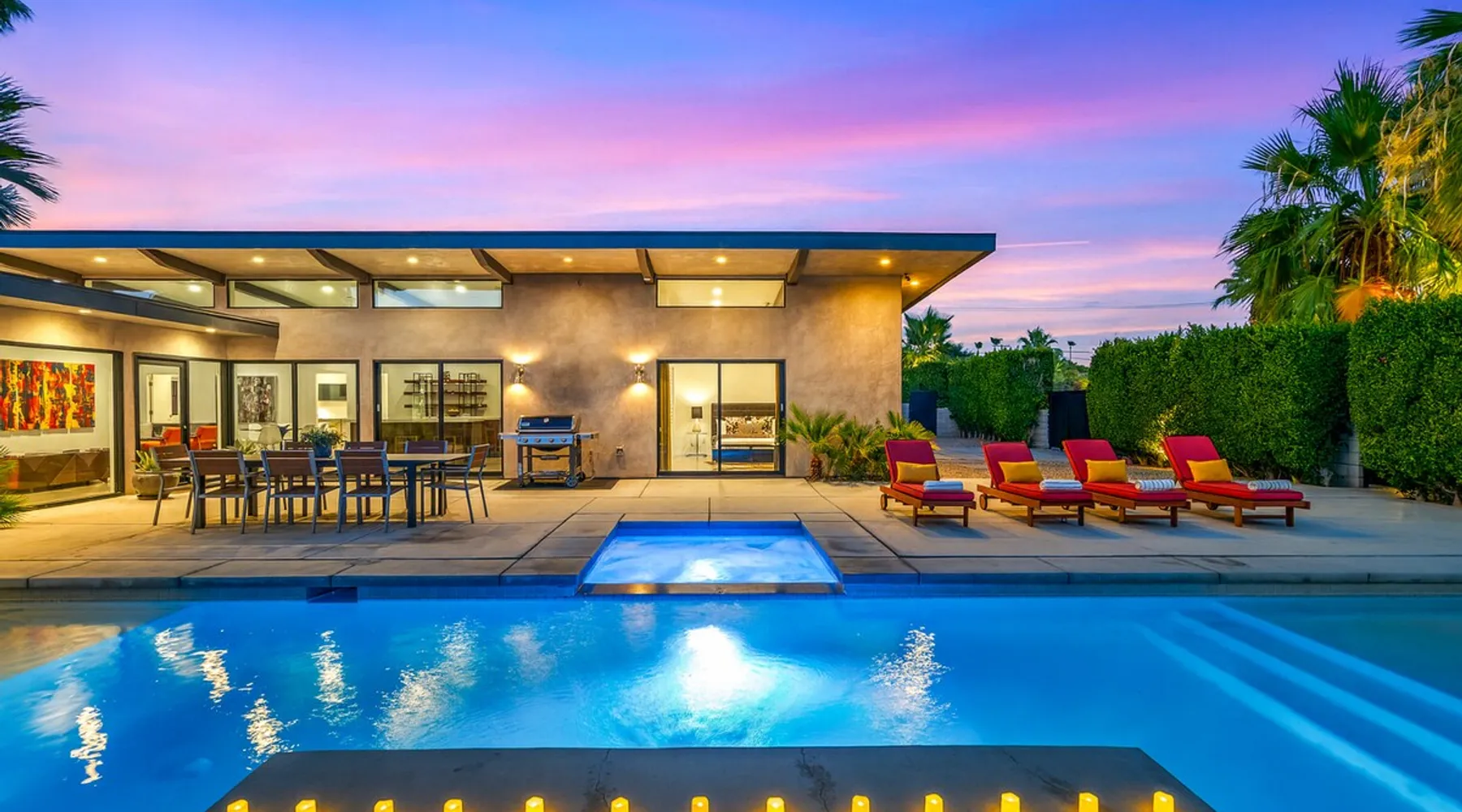 Palms at Park, Villa 14 is a Dwell-featured designer getaway offering a 42 ft heated saltwater pool with wet decks, oversized spa, fire pit, and sweeping mountain views. Inside, five private bedroom suites (1 Cal King, 4 Queens) each include an en suite bath and direct outdoor access. A chef’s kitchen with dual islands, dining for 10, and seamless indoor–outdoor living spaces make this villa perfect for entertaining or relaxing, just 3 minutes from downtown Palm Springs. The space Villa 14 by Palms at Park was built to deliver the quintessential Palm Springs experience, with modern design, private resort amenities, and a location just minutes from downtown. Highlights • 5 bedroom suites (1 California King, 4 Queens), each with en suite bath and outdoor access • 42 ft heated saltwater pool with spa, fire pit, sun ledge, and mountain views • Chef’s kitchen with dual waterfall islands and professional appliances • Dining table for 10, perfect for celebratory dinners • Great room with fireplace and glass walls opening to the pool • Fully walled and gated property for complete privacy • Additional Palms at Park villas next door available for larger groups Guest Praise Guests often call Villa 14 exceptional for both comfort and design. Reviews highlight the balance of spacious gathering areas and completely private bedrooms, hotel-quality linens, spa-style bathrooms, and seamless indoor outdoor flow. Families appreciate how easily it hosts multiple generations, while couples value the retreat-like feel of each suite. Designed for both entertaining and relaxation, Villa 14 combines the polish of a luxury resort with the warmth of a private residence. It is an ideal setting for milestone birthdays, reunions, or restorative escapes. Guest access The entire villa and grounds are reserved for your stay. Villa 14 offers secure gated entry, private parking for up to 5 vehicles, and a complimentary Tesla charger. Other things to note Villa 14 is designed for serene enjoyment in a peaceful Palm Springs neighborhood. Palm Springs has unique city rules, and we make them simple. Villa 14 accommodates up to 10 adults plus 2 children under 12. Outdoor areas must remain quiet after 10pm, with no music audible outside at any time. We look forward to welcoming you to Palms at Park, Villa 14. Registration Details City ID # 2895