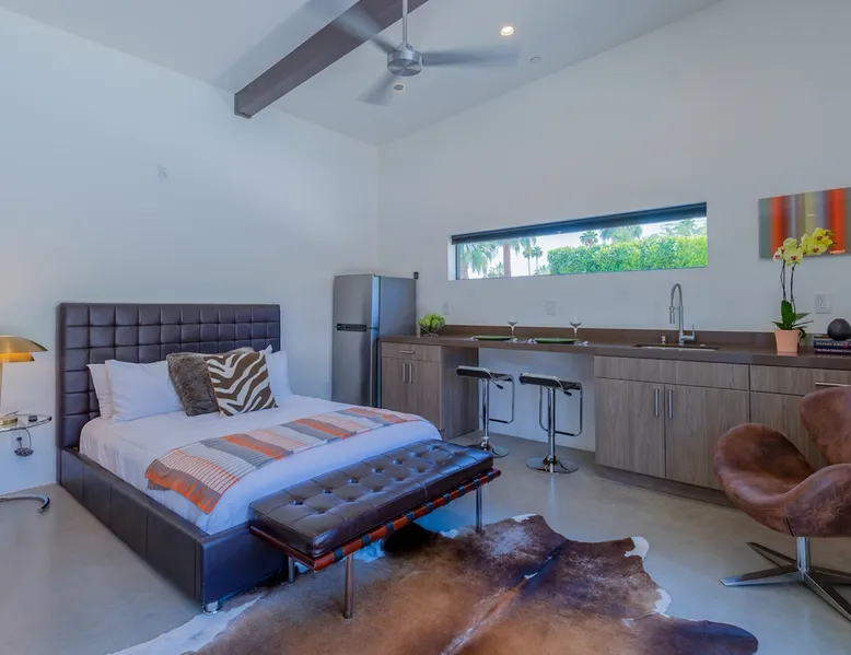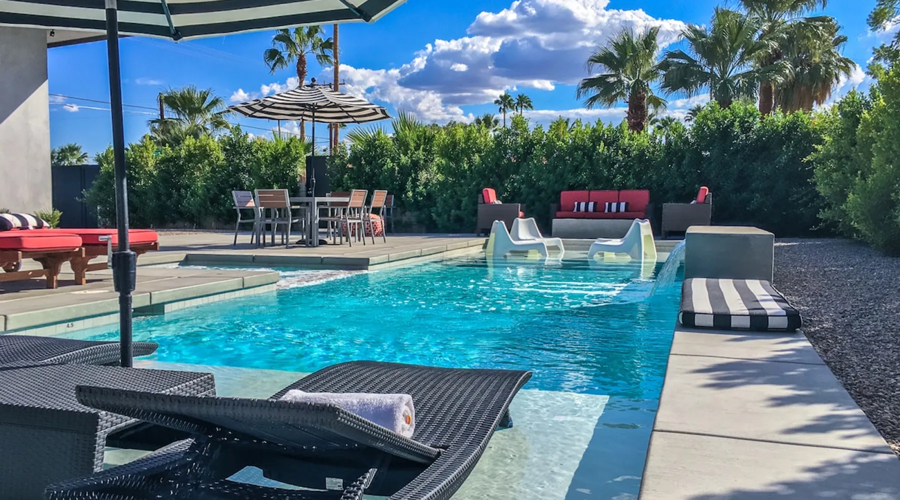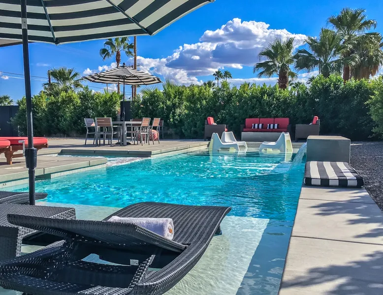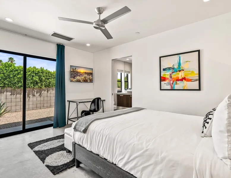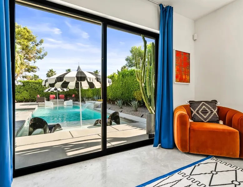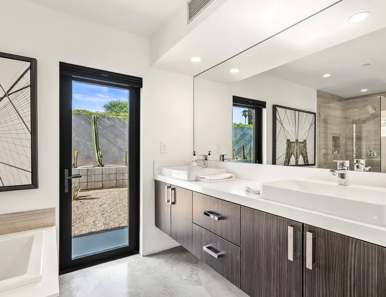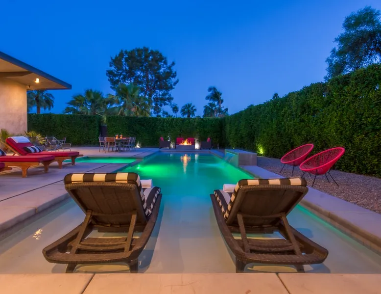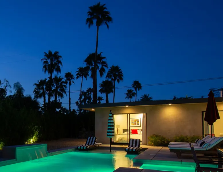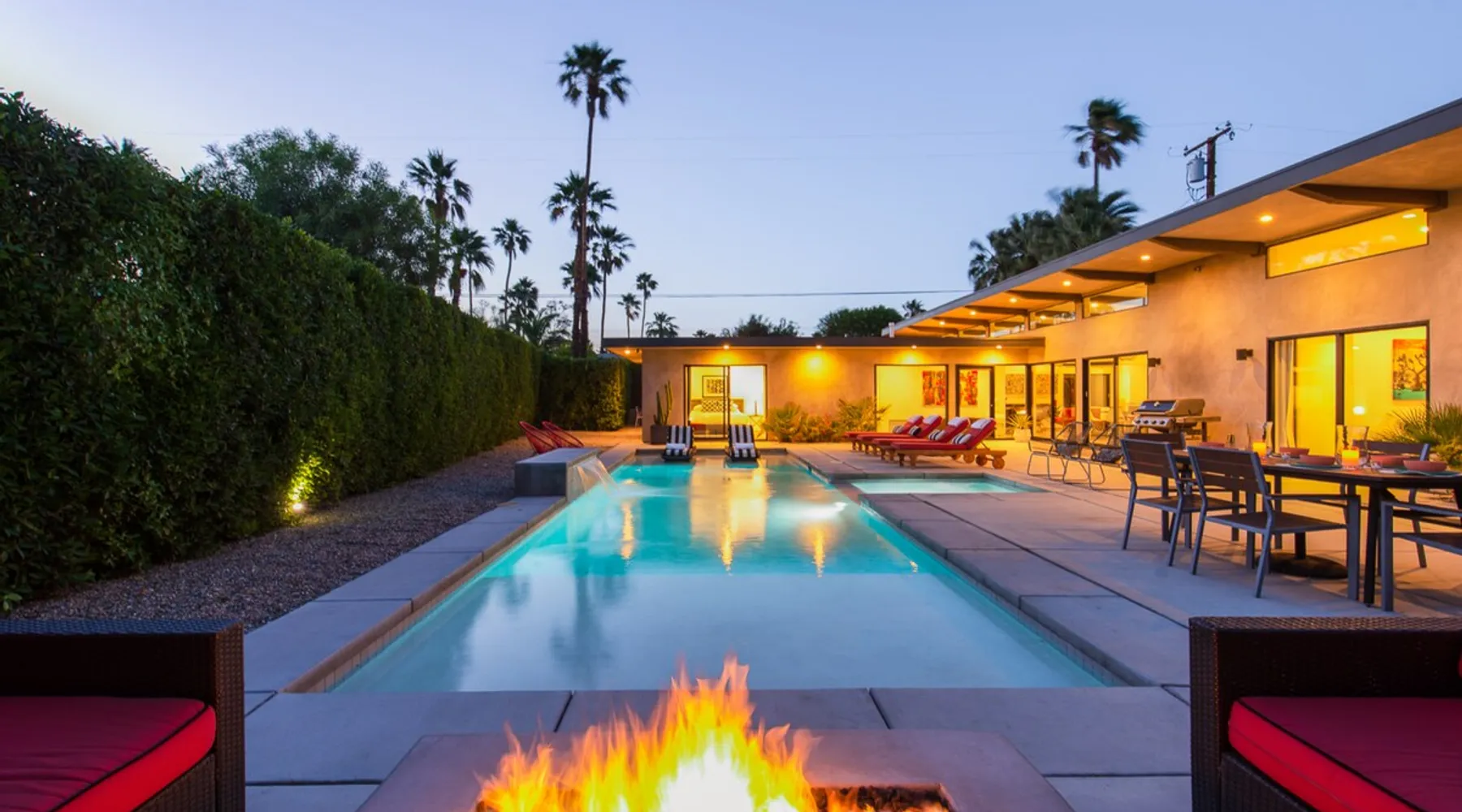 Palms at Park, Villa 14 is a Dwell-featured designer getaway offering a 42 ft heated saltwater pool with wet decks, oversized spa, fire pit, and sweeping mountain views. Inside, five private bedroom suites (1 Cal King, 4 Queens) each include an en suite bath and direct outdoor access. A chef’s kitchen with dual islands, dining for 10, and seamless indoor–outdoor living spaces make this villa perfect for entertaining or relaxing, just 3 minutes from downtown Palm Springs. The space Villa 14 by Palms at Park was built to deliver the quintessential Palm Springs experience, with modern design, private resort amenities, and a location just minutes from downtown. Highlights • 5 bedroom suites (1 California King, 4 Queens), each with en suite bath and outdoor access • 42 ft heated saltwater pool with spa, fire pit, sun ledge, and mountain views • Chef’s kitchen with dual waterfall islands and professional appliances • Dining table for 10, perfect for celebratory dinners • Great room with fireplace and glass walls opening to the pool • Fully walled and gated property for complete privacy • Additional Palms at Park villas next door available for larger groups Guest Praise Guests often call Villa 14 exceptional for both comfort and design. Reviews highlight the balance of spacious gathering areas and completely private bedrooms, hotel-quality linens, spa-style bathrooms, and seamless indoor outdoor flow. Families appreciate how easily it hosts multiple generations, while couples value the retreat-like feel of each suite. Designed for both entertaining and relaxation, Villa 14 combines the polish of a luxury resort with the warmth of a private residence. It is an ideal setting for milestone birthdays, reunions, or restorative escapes. Guest access The entire villa and grounds are reserved for your stay. Villa 14 offers secure gated entry, private parking for up to 5 vehicles, and a complimentary Tesla charger. Other things to note Villa 14 is designed for serene enjoyment in a peaceful Palm Springs neighborhood. Palm Springs has unique city rules, and we make them simple. Villa 14 accommodates up to 10 adults plus 2 children under 12. Outdoor areas must remain quiet after 10pm, with no music audible outside at any time. We look forward to welcoming you to Palms at Park, Villa 14. Registration Details City ID # 2895