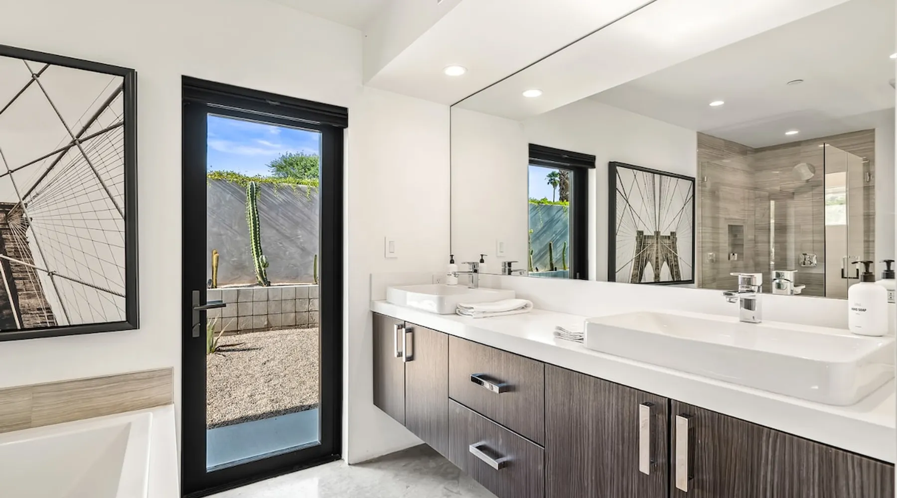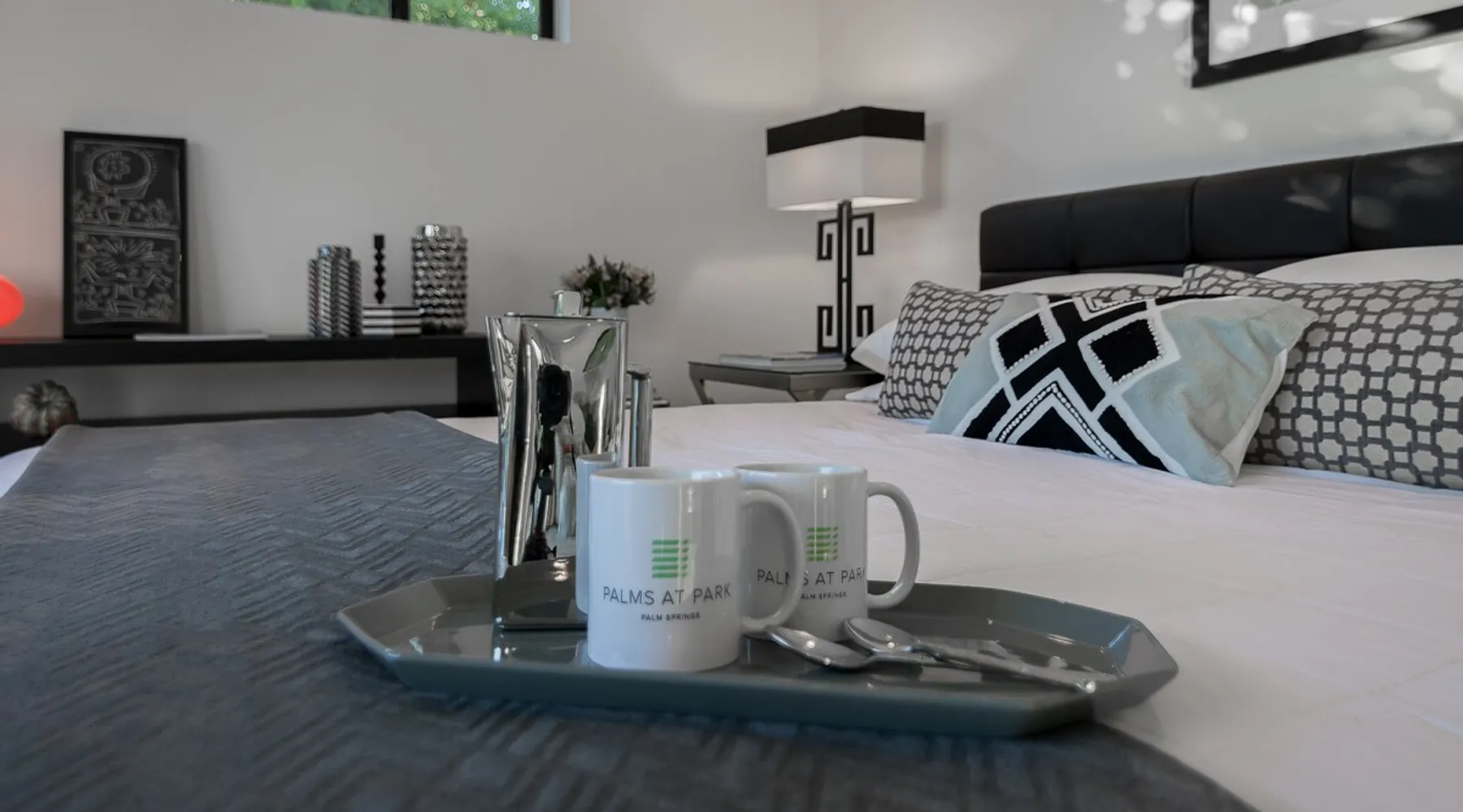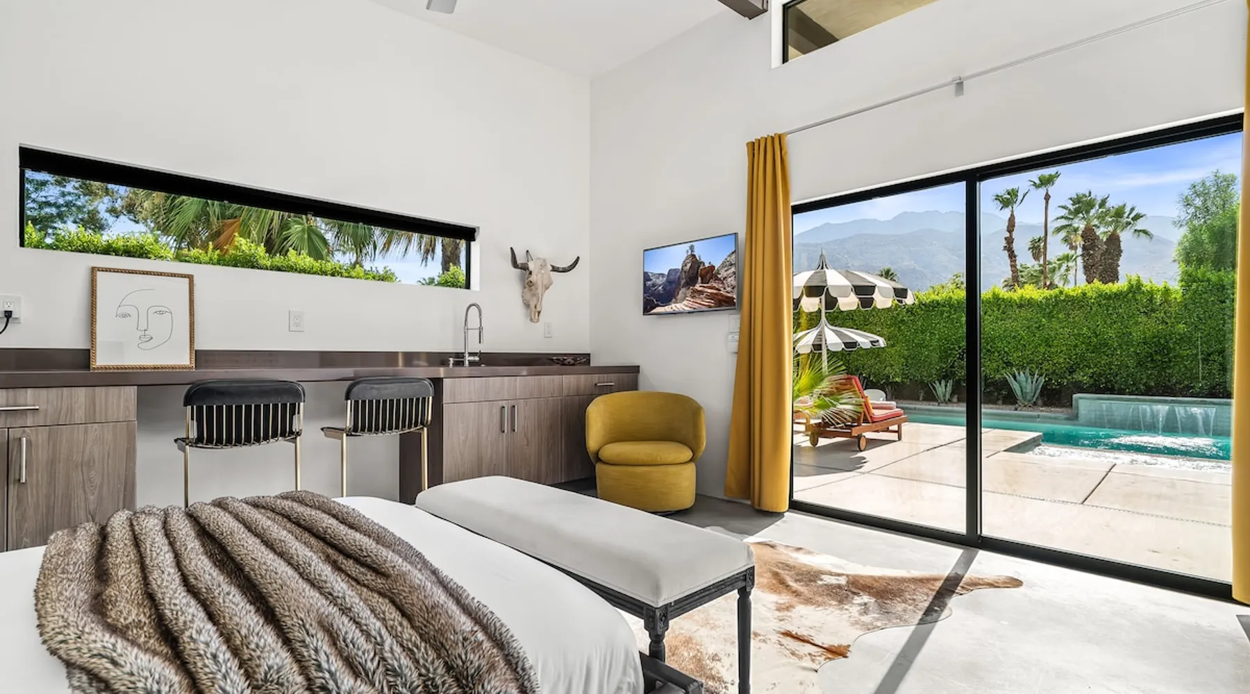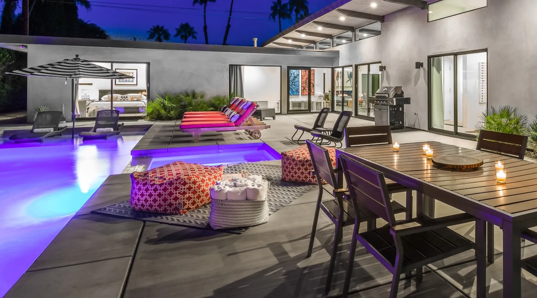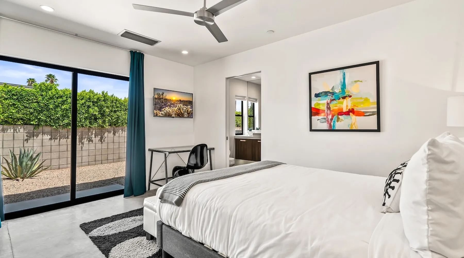 Palms at Park, Villa 14 is a Dwell-featured designer getaway offering a 42 ft heated saltwater pool with wet decks, oversized spa, fire pit, and sweeping mountain views. Inside, five private bedroom suites (1 Cal King, 4 Queens) each include an en suite bath and direct outdoor access. A chef’s kitchen with dual islands, dining for 10, and seamless indoor–outdoor living spaces make this villa perfect for entertaining or relaxing, just 3 minutes from downtown Palm Springs. The space Villa 14 by Palms at Park was built to deliver the quintessential Palm Springs experience, with modern design, private resort amenities, and a location just minutes from downtown. Highlights • 5 bedroom suites (1 California King, 4 Queens), each with en suite bath and outdoor access • 42 ft heated saltwater pool with spa, fire pit, sun ledge, and mountain views • Chef’s kitchen with dual waterfall islands and professional appliances • Dining table for 10, perfect for celebratory dinners • Great room with fireplace and glass walls opening to the pool • Fully walled and gated property for complete privacy • Additional Palms at Park villas next door available for larger groups Guest Praise Guests often call Villa 14 exceptional for both comfort and design. Reviews highlight the balance of spacious gathering areas and completely private bedrooms, hotel-quality linens, spa-style bathrooms, and seamless indoor outdoor flow. Families appreciate how easily it hosts multiple generations, while couples value the retreat-like feel of each suite. Designed for both entertaining and relaxation, Villa 14 combines the polish of a luxury resort with the warmth of a private residence. It is an ideal setting for milestone birthdays, reunions, or restorative escapes. Guest access The entire villa and grounds are reserved for your stay. Villa 14 offers secure gated entry, private parking for up to 5 vehicles, and a complimentary Tesla charger. Other things to note Villa 14 is designed for serene enjoyment in a peaceful Palm Springs neighborhood. Palm Springs has unique city rules, and we make them simple. Villa 14 accommodates up to 10 adults plus 2 children under 12. Outdoor areas must remain quiet after 10pm, with no music audible outside at any time. We look forward to welcoming you to Palms at Park, Villa 14. Registration Details City ID # 2895