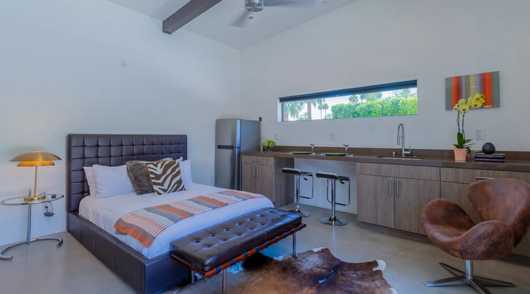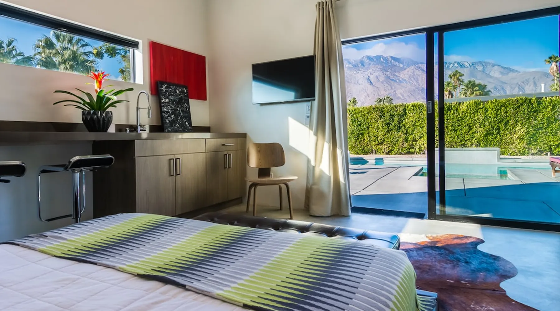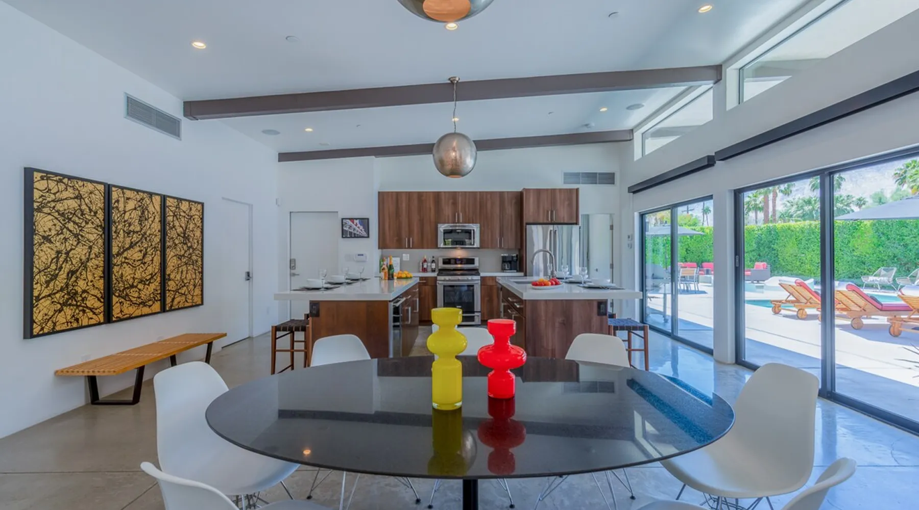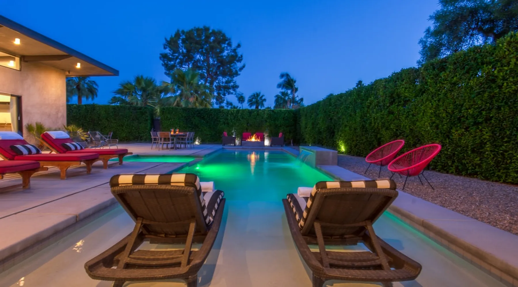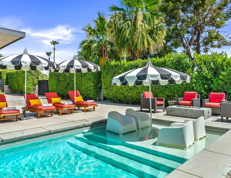 Palms at Park, Villa 14 is a Dwell-featured designer getaway offering a 42 ft heated saltwater pool with wet decks, oversized spa, fire pit, and sweeping mountain views. Inside, five private bedroom suites (1 Cal King, 4 Queens) each include an en suite bath and direct outdoor access. A chef’s kitchen with dual islands, dining for 10, and seamless indoor–outdoor living spaces make this villa perfect for entertaining or relaxing, just 3 minutes from downtown Palm Springs. The space Villa 14 by Palms at Park was built to deliver the quintessential Palm Springs experience, with modern design, private resort amenities, and a location just minutes from downtown. Highlights • 5 bedroom suites (1 California King, 4 Queens), each with en suite bath and outdoor access • 42 ft heated saltwater pool with spa, fire pit, sun ledge, and mountain views • Chef’s kitchen with dual waterfall islands and professional appliances • Dining table for 10, perfect for celebratory dinners • Great room with fireplace and glass walls opening to the pool • Fully walled and gated property for complete privacy • Additional Palms at Park villas next door available for larger groups Guest Praise Guests often call Villa 14 exceptional for both comfort and design. Reviews highlight the balance of spacious gathering areas and completely private bedrooms, hotel-quality linens, spa-style bathrooms, and seamless indoor outdoor flow. Families appreciate how easily it hosts multiple generations, while couples value the retreat-like feel of each suite. Designed for both entertaining and relaxation, Villa 14 combines the polish of a luxury resort with the warmth of a private residence. It is an ideal setting for milestone birthdays, reunions, or restorative escapes. Guest access The entire villa and grounds are reserved for your stay. Villa 14 offers secure gated entry, private parking for up to 5 vehicles, and a complimentary Tesla charger. Other things to note Villa 14 is designed for serene enjoyment in a peaceful Palm Springs neighborhood. Palm Springs has unique city rules, and we make them simple. Villa 14 accommodates up to 10 adults plus 2 children under 12. Outdoor areas must remain quiet after 10pm, with no music audible outside at any time. We look forward to welcoming you to Palms at Park, Villa 14. Registration Details City ID # 2895