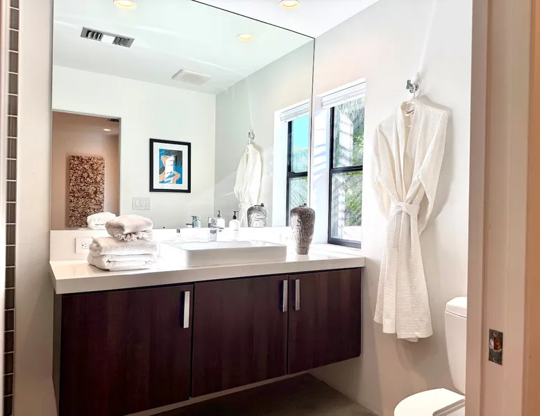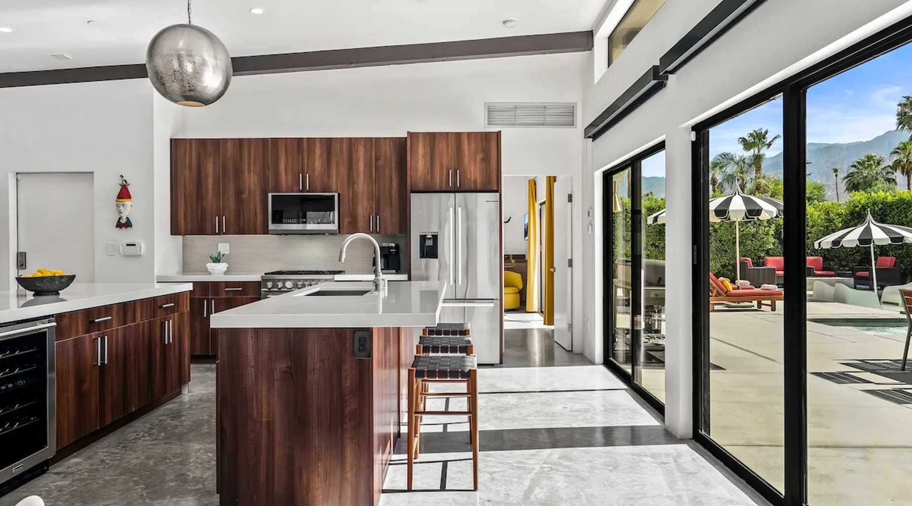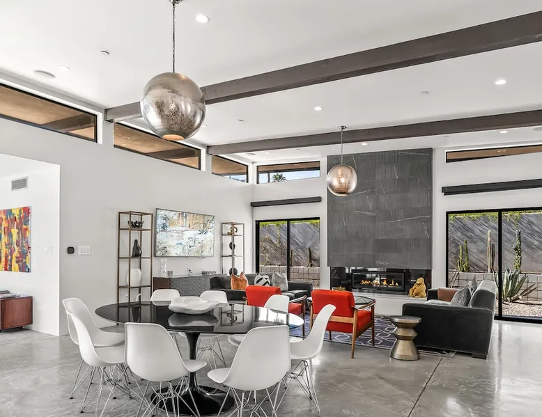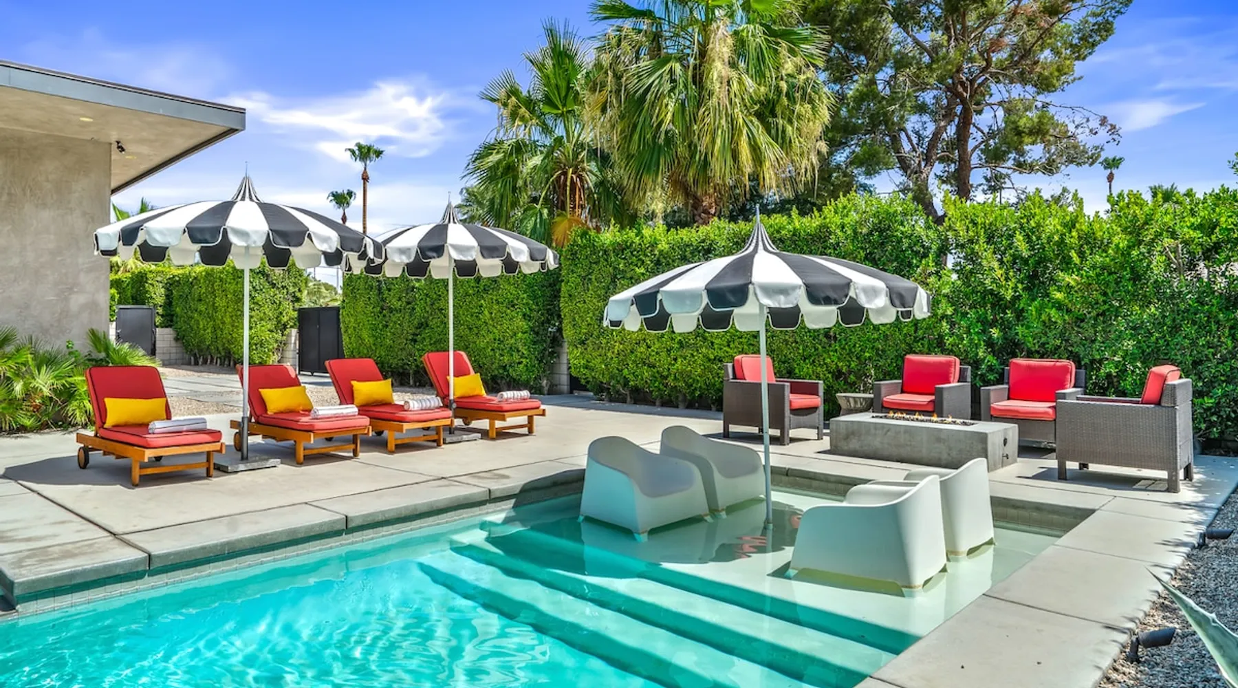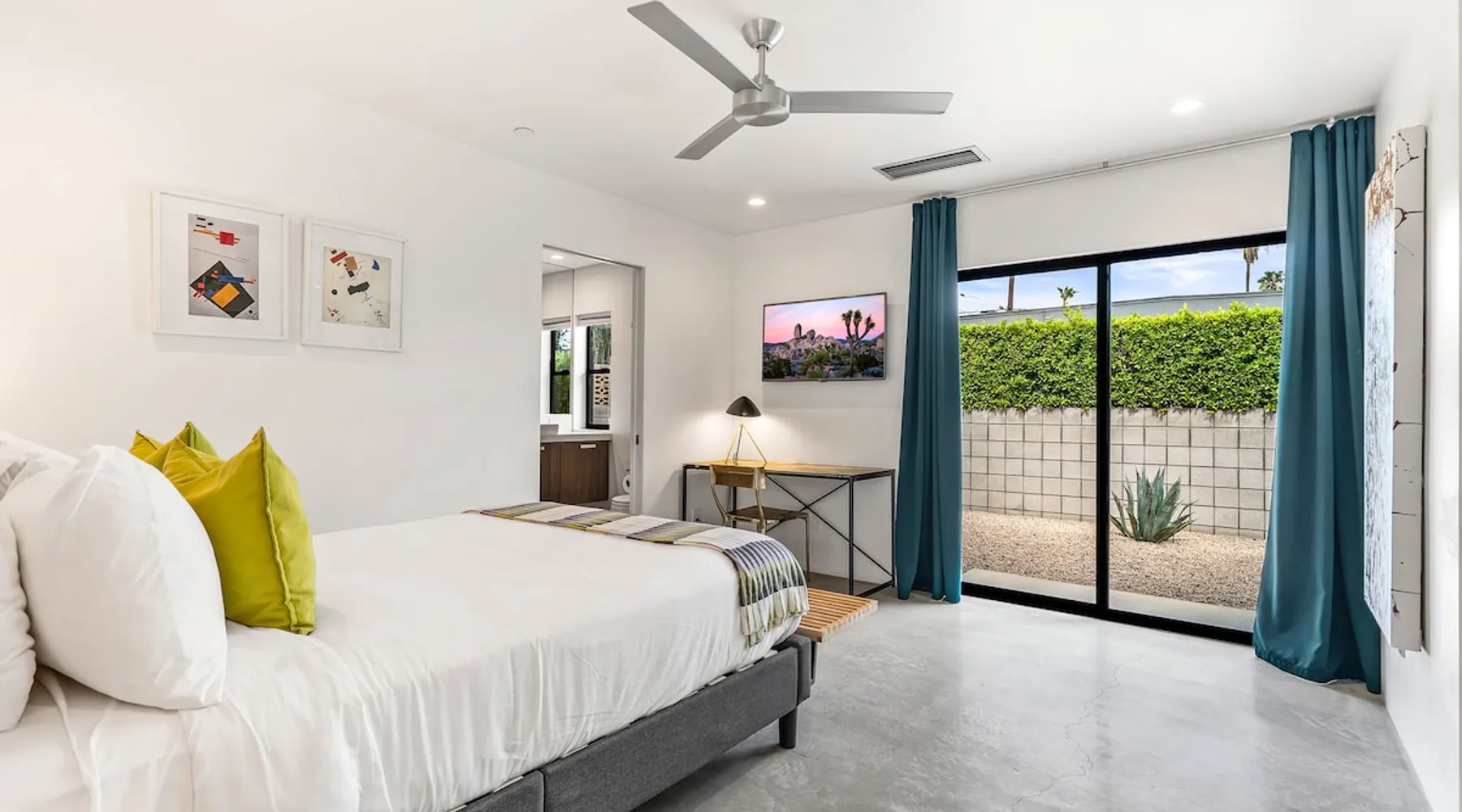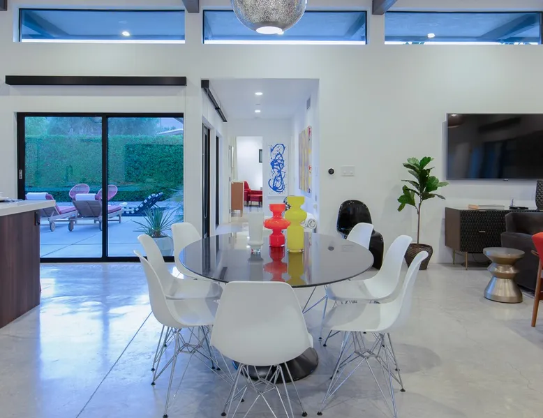 Palms at Park, Villa 14 is a Dwell-featured designer getaway offering a 42 ft heated saltwater pool with wet decks, oversized spa, fire pit, and sweeping mountain views. Inside, five private bedroom suites (1 Cal King, 4 Queens) each include an en suite bath and direct outdoor access. A chef’s kitchen with dual islands, dining for 10, and seamless indoor–outdoor living spaces make this villa perfect for entertaining or relaxing, just 3 minutes from downtown Palm Springs. The space Villa 14 by Palms at Park was built to deliver the quintessential Palm Springs experience, with modern design, private resort amenities, and a location just minutes from downtown. Highlights • 5 bedroom suites (1 California King, 4 Queens), each with en suite bath and outdoor access • 42 ft heated saltwater pool with spa, fire pit, sun ledge, and mountain views • Chef’s kitchen with dual waterfall islands and professional appliances • Dining table for 10, perfect for celebratory dinners • Great room with fireplace and glass walls opening to the pool • Fully walled and gated property for complete privacy • Additional Palms at Park villas next door available for larger groups Guest Praise Guests often call Villa 14 exceptional for both comfort and design. Reviews highlight the balance of spacious gathering areas and completely private bedrooms, hotel-quality linens, spa-style bathrooms, and seamless indoor outdoor flow. Families appreciate how easily it hosts multiple generations, while couples value the retreat-like feel of each suite. Designed for both entertaining and relaxation, Villa 14 combines the polish of a luxury resort with the warmth of a private residence. It is an ideal setting for milestone birthdays, reunions, or restorative escapes. Guest access The entire villa and grounds are reserved for your stay. Villa 14 offers secure gated entry, private parking for up to 5 vehicles, and a complimentary Tesla charger. Other things to note Villa 14 is designed for serene enjoyment in a peaceful Palm Springs neighborhood. Palm Springs has unique city rules, and we make them simple. Villa 14 accommodates up to 10 adults plus 2 children under 12. Outdoor areas must remain quiet after 10pm, with no music audible outside at any time. We look forward to welcoming you to Palms at Park, Villa 14. Registration Details City ID # 2895