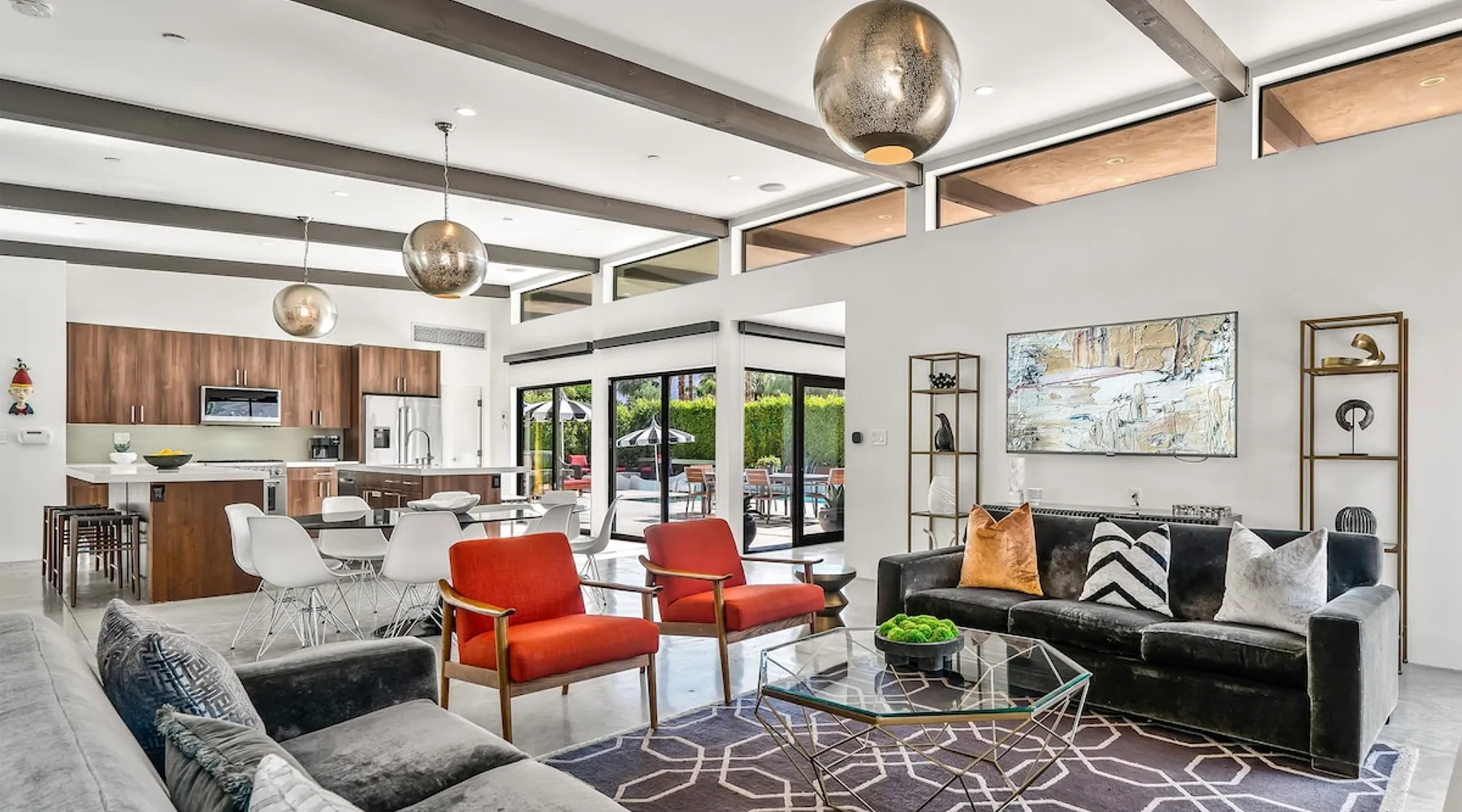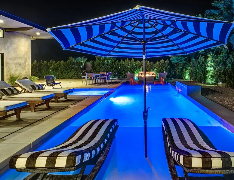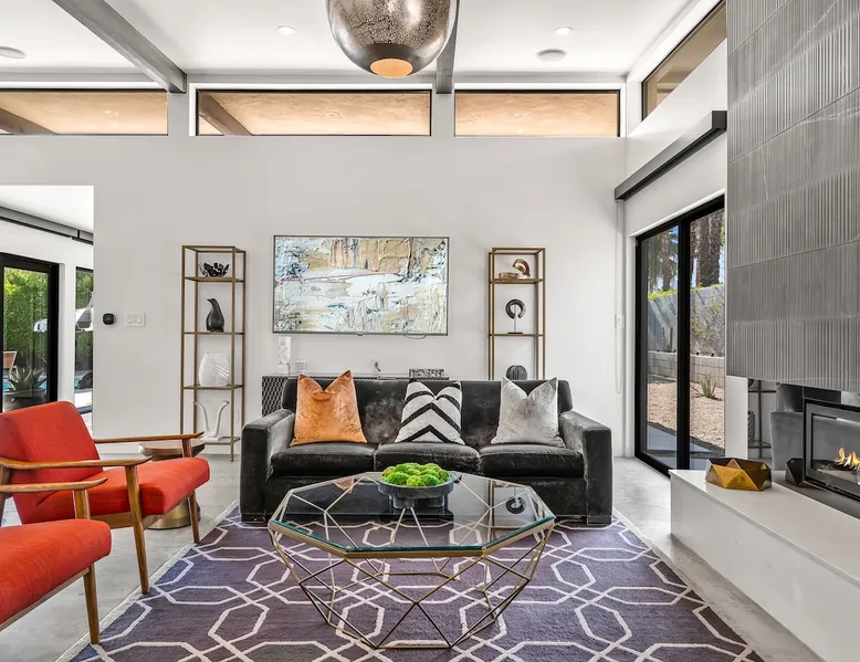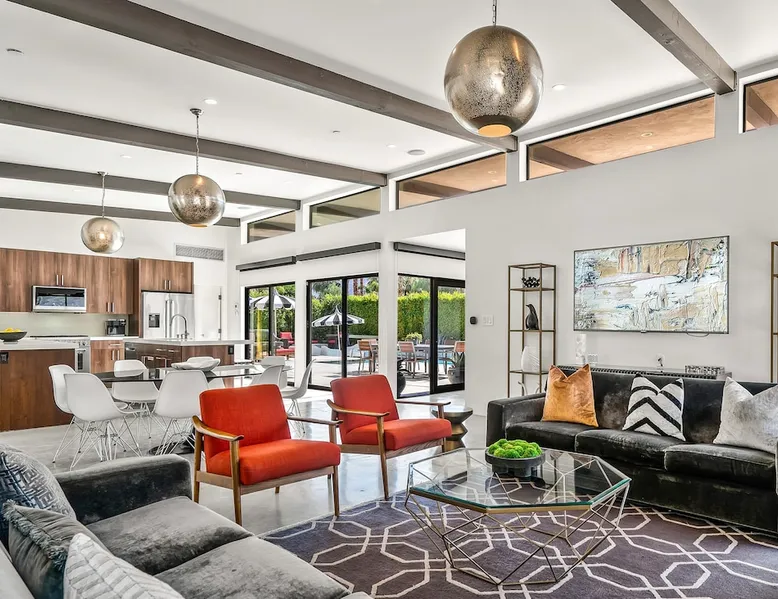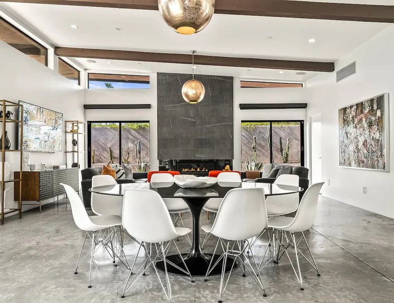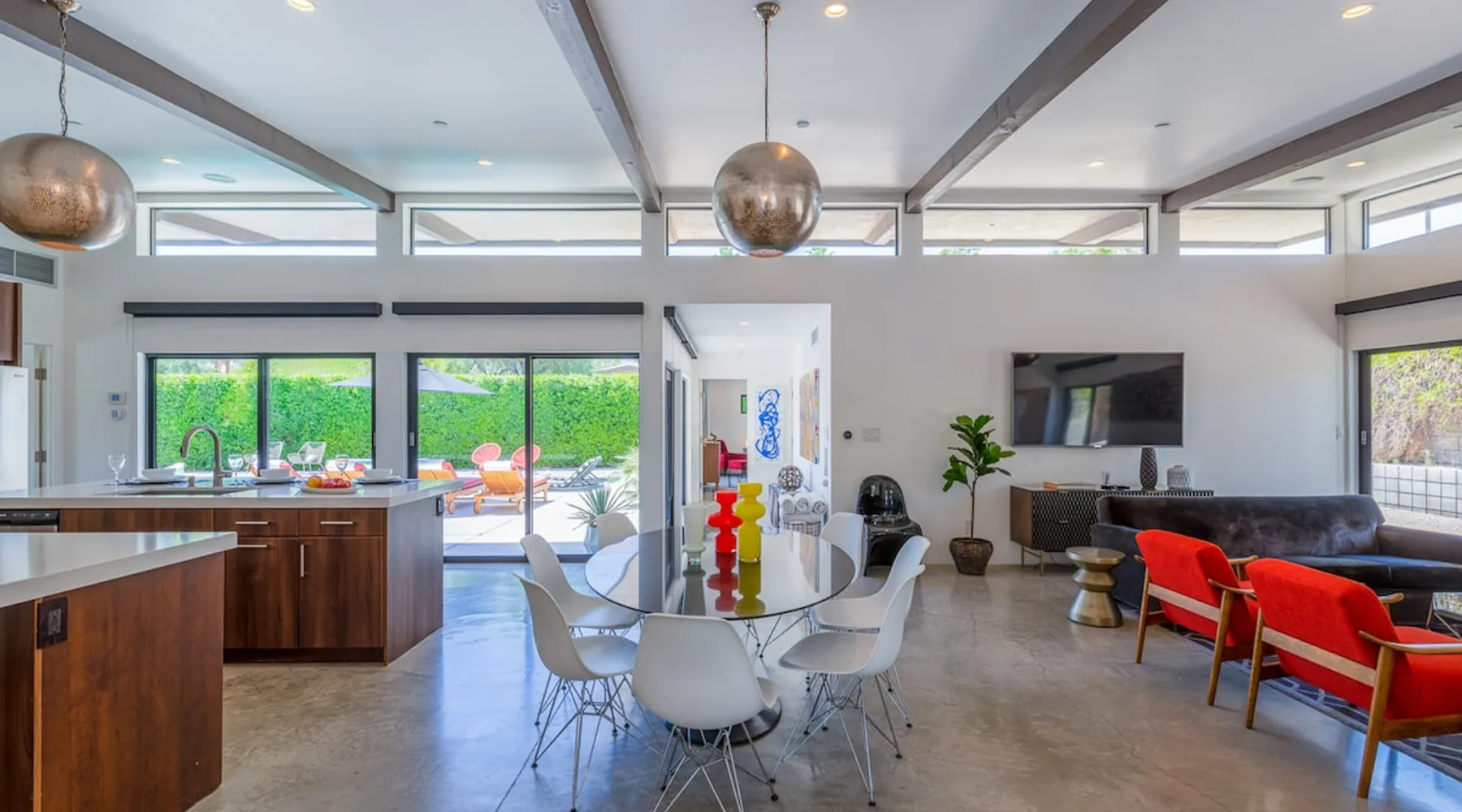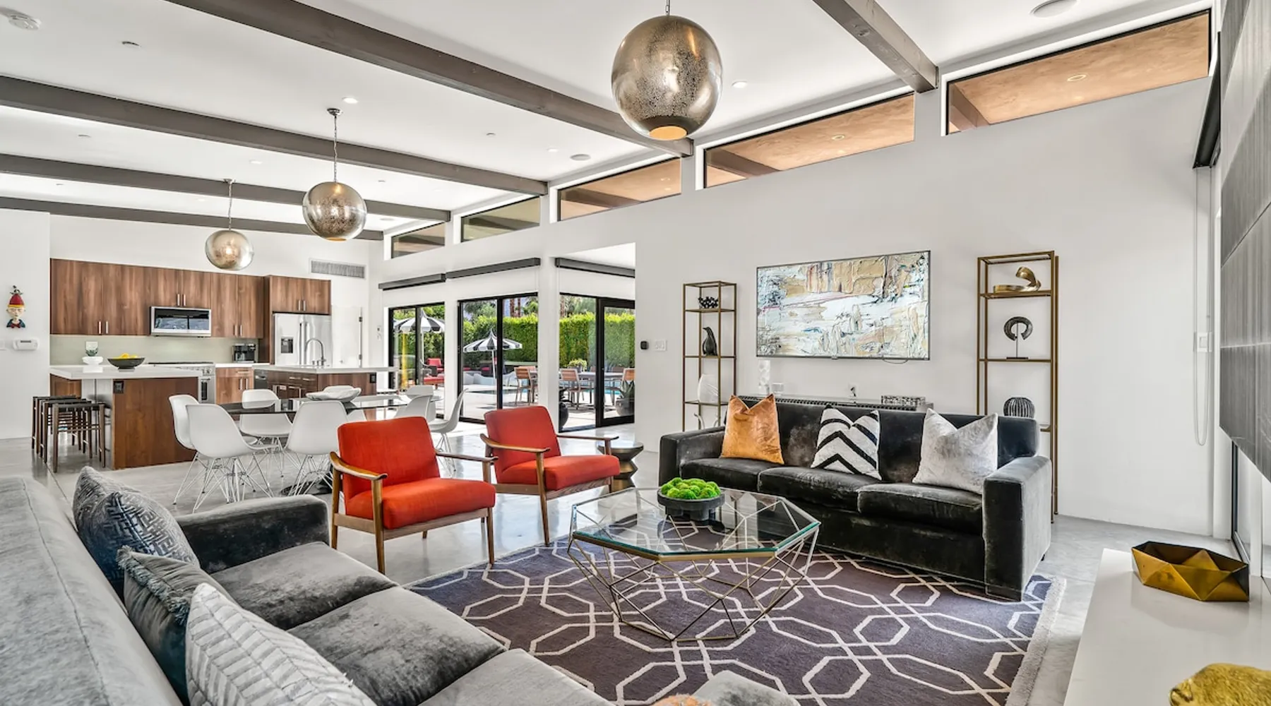 Palms at Park, Villa 14 is a Dwell-featured designer getaway offering a 42 ft heated saltwater pool with wet decks, oversized spa, fire pit, and sweeping mountain views. Inside, five private bedroom suites (1 Cal King, 4 Queens) each include an en suite bath and direct outdoor access. A chef’s kitchen with dual islands, dining for 10, and seamless indoor–outdoor living spaces make this villa perfect for entertaining or relaxing, just 3 minutes from downtown Palm Springs. The space Villa 14 by Palms at Park was built to deliver the quintessential Palm Springs experience, with modern design, private resort amenities, and a location just minutes from downtown. Highlights • 5 bedroom suites (1 California King, 4 Queens), each with en suite bath and outdoor access • 42 ft heated saltwater pool with spa, fire pit, sun ledge, and mountain views • Chef’s kitchen with dual waterfall islands and professional appliances • Dining table for 10, perfect for celebratory dinners • Great room with fireplace and glass walls opening to the pool • Fully walled and gated property for complete privacy • Additional Palms at Park villas next door available for larger groups Guest Praise Guests often call Villa 14 exceptional for both comfort and design. Reviews highlight the balance of spacious gathering areas and completely private bedrooms, hotel-quality linens, spa-style bathrooms, and seamless indoor outdoor flow. Families appreciate how easily it hosts multiple generations, while couples value the retreat-like feel of each suite. Designed for both entertaining and relaxation, Villa 14 combines the polish of a luxury resort with the warmth of a private residence. It is an ideal setting for milestone birthdays, reunions, or restorative escapes. Guest access The entire villa and grounds are reserved for your stay. Villa 14 offers secure gated entry, private parking for up to 5 vehicles, and a complimentary Tesla charger. Other things to note Villa 14 is designed for serene enjoyment in a peaceful Palm Springs neighborhood. Palm Springs has unique city rules, and we make them simple. Villa 14 accommodates up to 10 adults plus 2 children under 12. Outdoor areas must remain quiet after 10pm, with no music audible outside at any time. We look forward to welcoming you to Palms at Park, Villa 14. Registration Details City ID # 2895