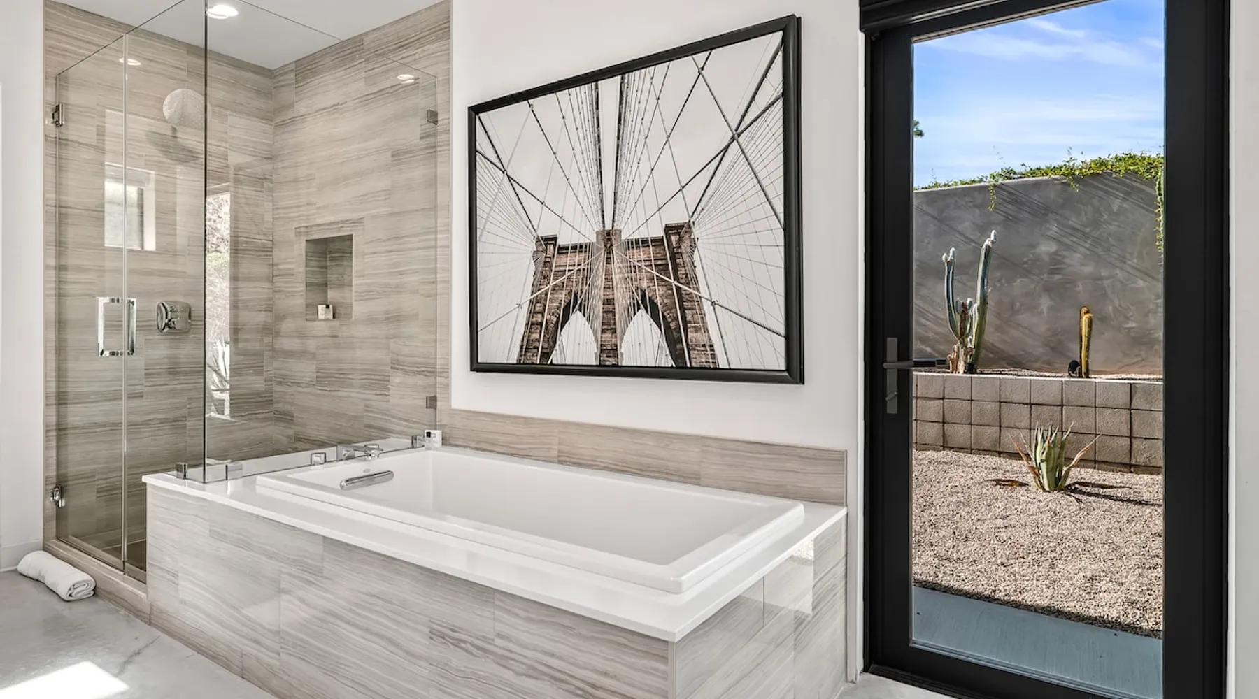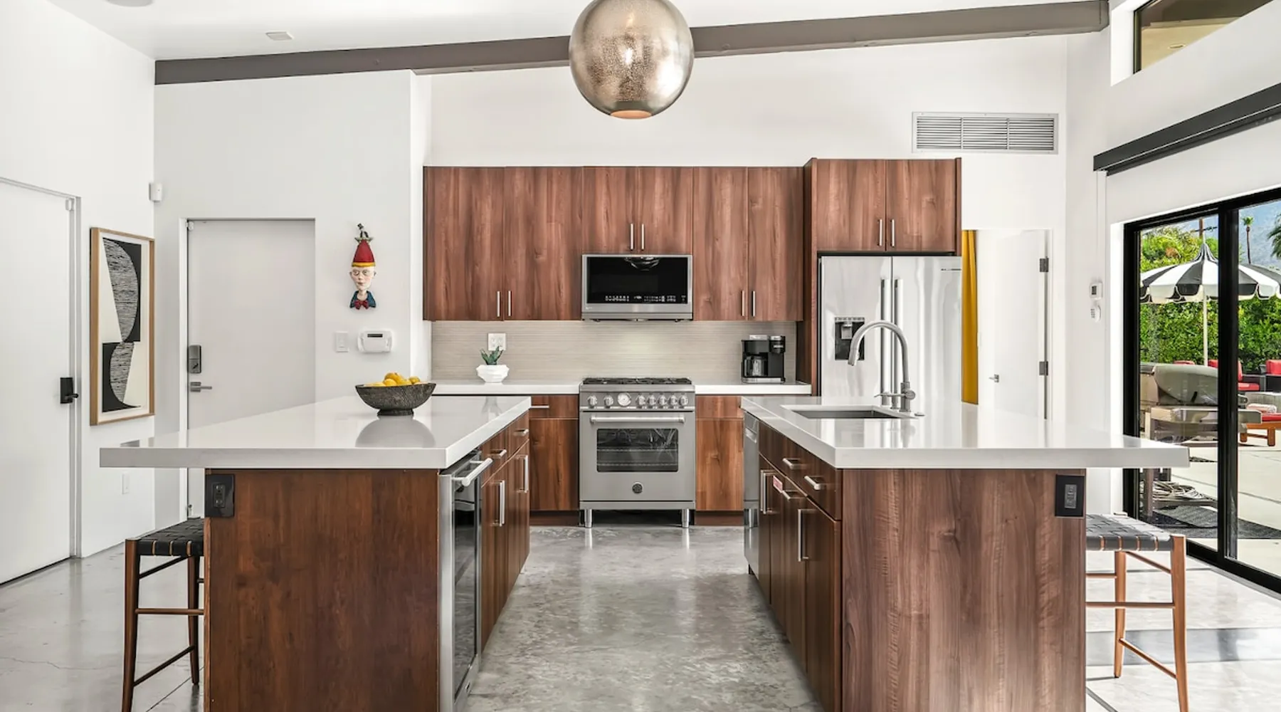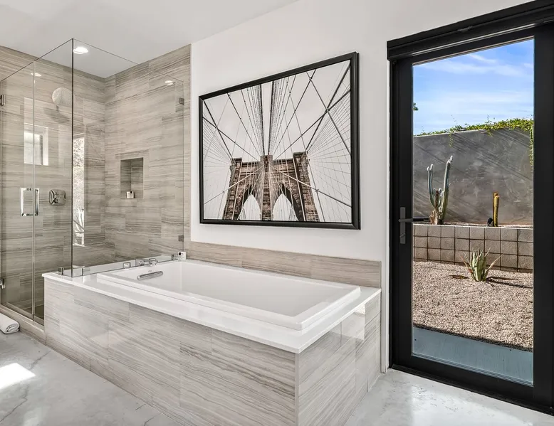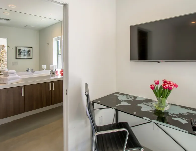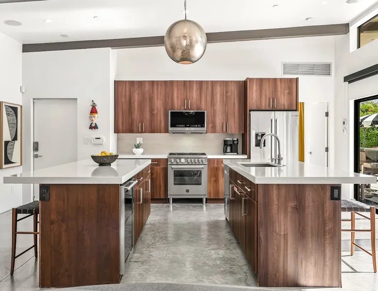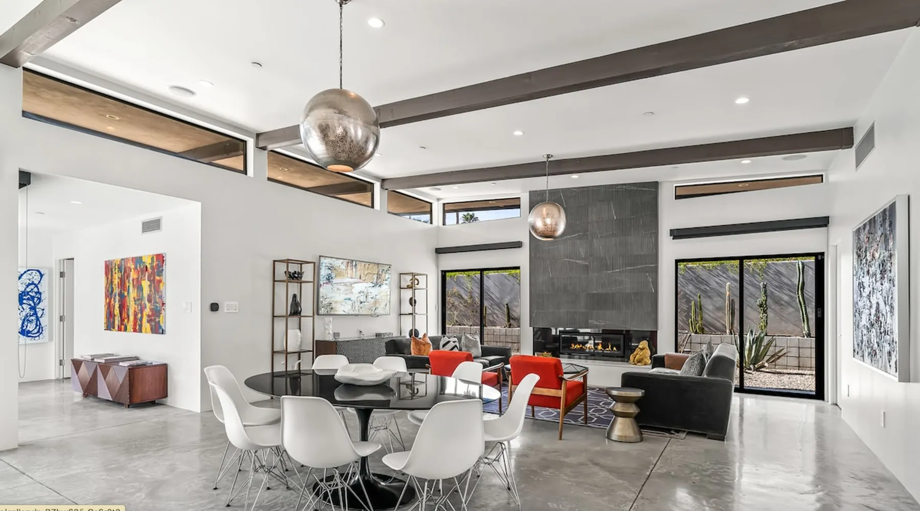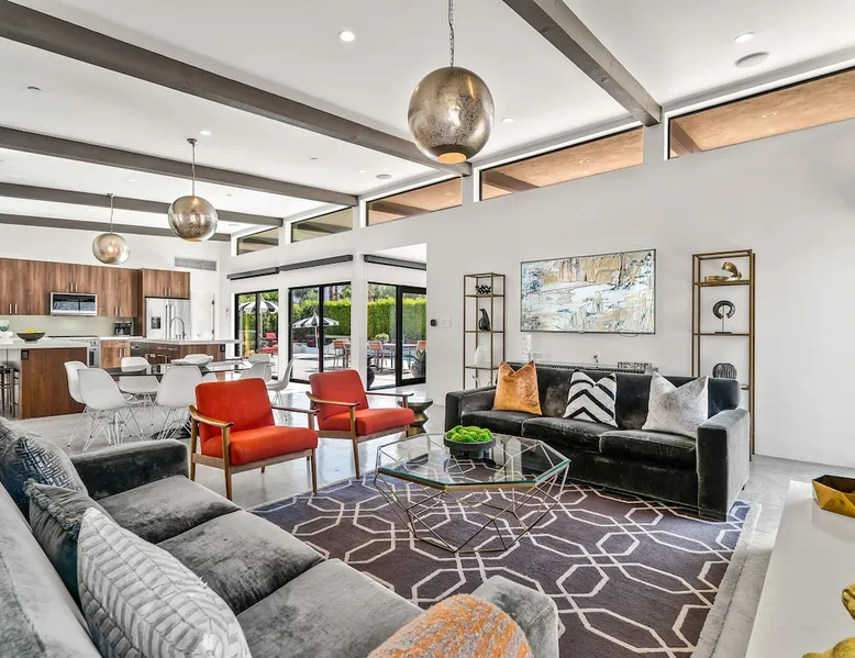 Palms at Park, Villa 14 is a Dwell-featured designer getaway offering a 42 ft heated saltwater pool with wet decks, oversized spa, fire pit, and sweeping mountain views. Inside, five private bedroom suites (1 Cal King, 4 Queens) each include an en suite bath and direct outdoor access. A chef’s kitchen with dual islands, dining for 10, and seamless indoor–outdoor living spaces make this villa perfect for entertaining or relaxing, just 3 minutes from downtown Palm Springs. The space Villa 14 by Palms at Park was built to deliver the quintessential Palm Springs experience, with modern design, private resort amenities, and a location just minutes from downtown. Highlights • 5 bedroom suites (1 California King, 4 Queens), each with en suite bath and outdoor access • 42 ft heated saltwater pool with spa, fire pit, sun ledge, and mountain views • Chef’s kitchen with dual waterfall islands and professional appliances • Dining table for 10, perfect for celebratory dinners • Great room with fireplace and glass walls opening to the pool • Fully walled and gated property for complete privacy • Additional Palms at Park villas next door available for larger groups Guest Praise Guests often call Villa 14 exceptional for both comfort and design. Reviews highlight the balance of spacious gathering areas and completely private bedrooms, hotel-quality linens, spa-style bathrooms, and seamless indoor outdoor flow. Families appreciate how easily it hosts multiple generations, while couples value the retreat-like feel of each suite. Designed for both entertaining and relaxation, Villa 14 combines the polish of a luxury resort with the warmth of a private residence. It is an ideal setting for milestone birthdays, reunions, or restorative escapes. Guest access The entire villa and grounds are reserved for your stay. Villa 14 offers secure gated entry, private parking for up to 5 vehicles, and a complimentary Tesla charger. Other things to note Villa 14 is designed for serene enjoyment in a peaceful Palm Springs neighborhood. Palm Springs has unique city rules, and we make them simple. Villa 14 accommodates up to 10 adults plus 2 children under 12. Outdoor areas must remain quiet after 10pm, with no music audible outside at any time. We look forward to welcoming you to Palms at Park, Villa 14. Registration Details City ID # 2895