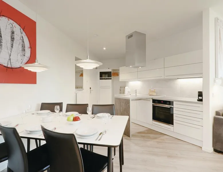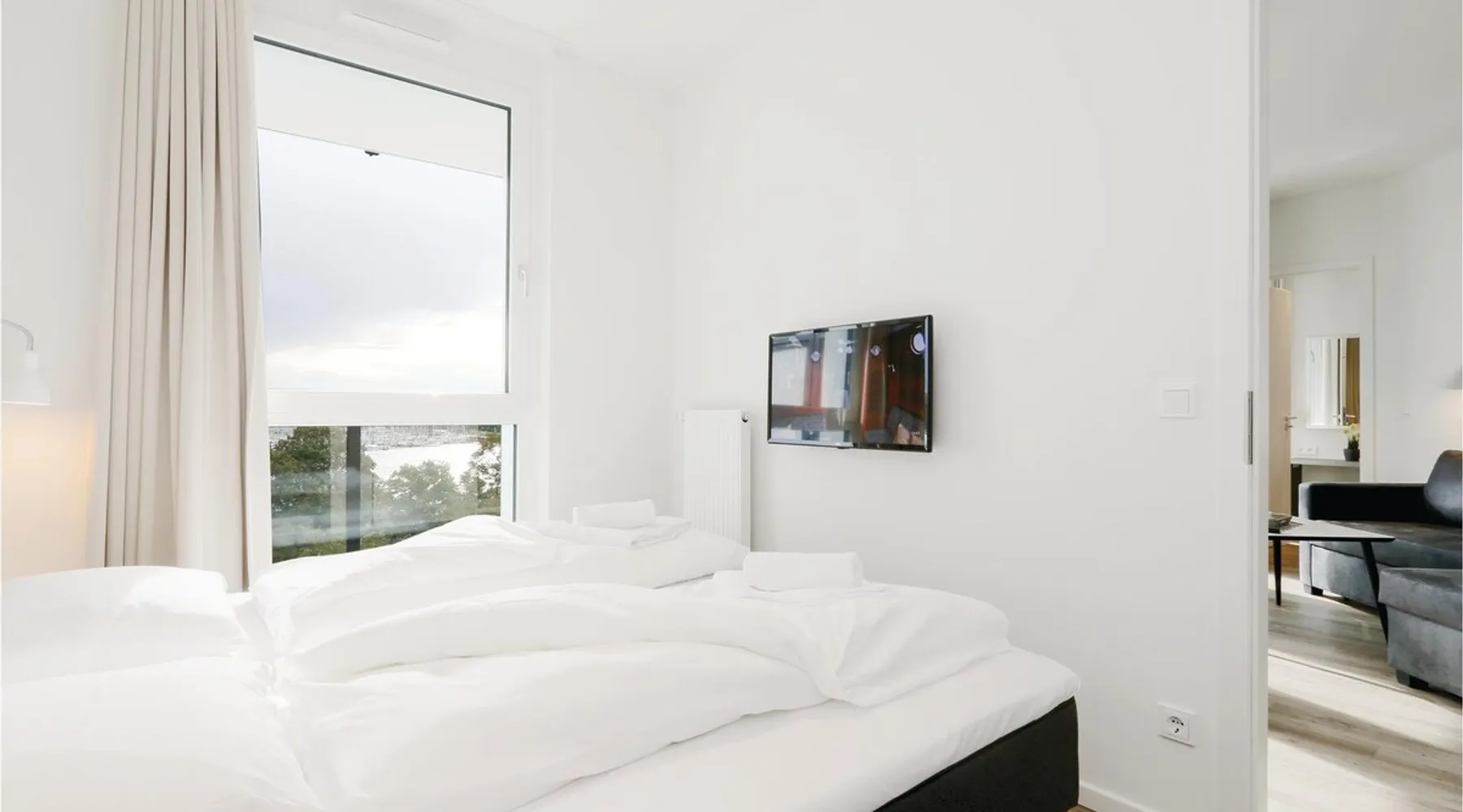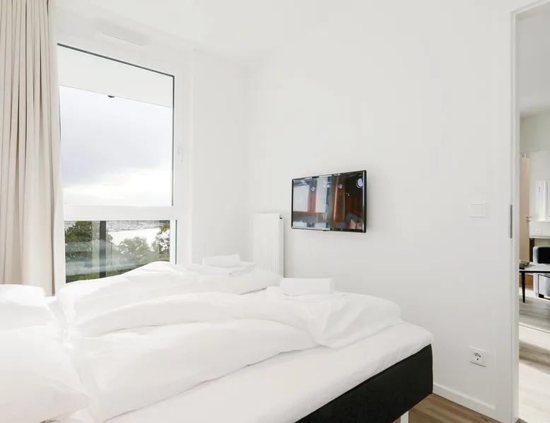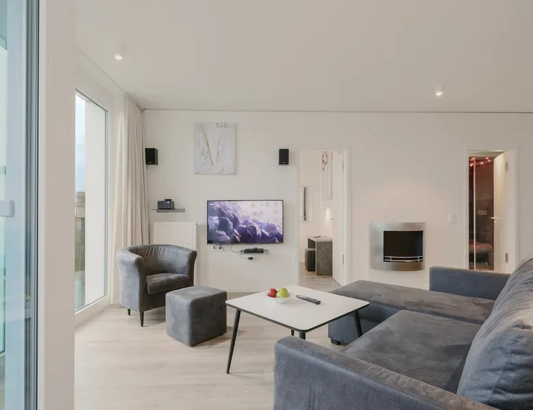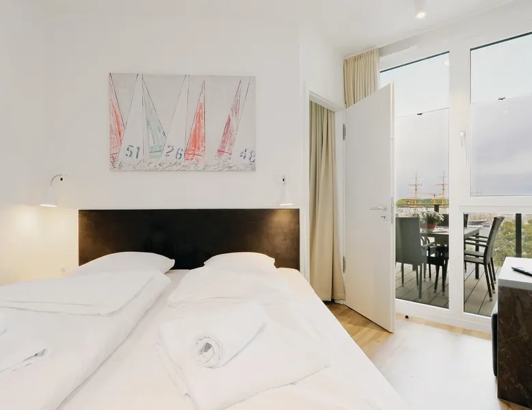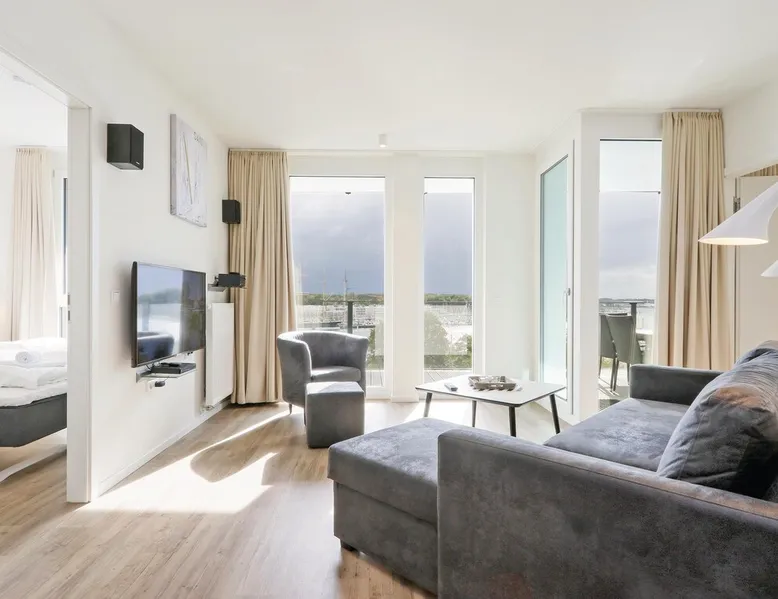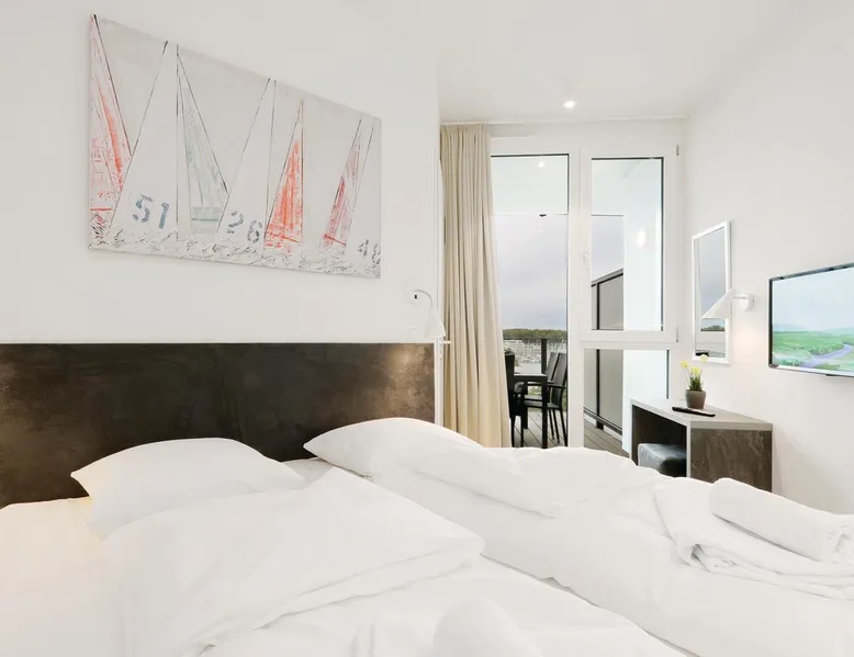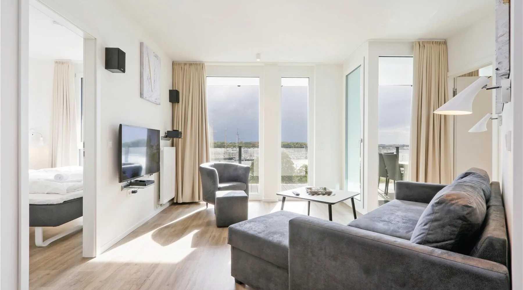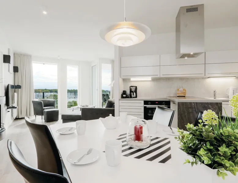 The exclusive vacation apartments in the apartment complex High End combine high-quality equipment, design and a beautiful location directly on the beach of Lübeck-Travemünde. Here you will immediately feel at home. The space The exclusive vacation apartments in the apartment complex High End combine high-quality equipment, design and a beautiful location directly on the beach of Lübeck-Travemünde. Here you will immediately feel at home. Your vacation apartment is located on the 5th floor of the complex, which is why you enjoy a unique view. From here you can look at the Priwall, the sandy beach as well as the harbor exit with the passing ships. The apartment has two separate bedrooms, each with a cozy double bed. In the living area you can make yourself comfortable in front of the cozy light of the bio-ethanol fireplace. The sofa bed is also located in the living area, which offers two more sleeping places. A crib can be placed exclusively in the living room, as there is not enough space in the bedroom. On the balcony, which faces south, you can enjoy the fresh Baltic Sea air and the sound of the waves or have meals together with the family. Here you can enjoy the beautiful view of the Travemündung and the passing ships as well as the Priwall to the fine sandy beach. For a small deposit you can borrow binoculars at the reception, with which you can observe the hustle and bustle of the surrounding area and nature. The bathroom presents itself as your personal wellness area. Here you can warm up in the sauna after a long walk on the Baltic Sea. In addition, the bathroom has a steam bath with rain shower. The modern entertainment system with Blu-Ray player, music system with MP3 connection as well as 3 flat screen TVs provides enough entertainment. All rooms are furnished in Scandinavian style and are bright and flooded with light due to the floor-to-ceiling windows. The modern kitchenette offers enough space for cooking and is equipped with high-quality brand appliances. Here, frahling lovers will find a Nespresso machine (please bring your own capsules), as well as a thermos and hand filter for home brewing, in case you prefer the classic filter coffee after all. The view of this object is in the direction of Priwall beach. The neighboring a-ja resort has a nice spa area with sauna and swimming pool. This can be shared for a fee. All registered NOVASOL guests from the High End receive a 25% discount on the respective entrance fee during your stay. Please note that the offer can only be used during the official rental period, i. e. from 4 pm on the day of arrival to a maximum of 10 am on the day of departure. The location in Lübeck-Travemünde makes the High End an ideal starting point for your vacation. The traditional town offers a beautiful sandy beach, restaurants, cafes, playgrounds and shopping facilities directly on the promenade. For the Travemünde Week, the promenade in front of the High End is transformed once a year (around the end of July) into a large family festival with sailing, gastronomy and a stage program. As a guest at the High End, you are right in the middle of the action and can enjoy the traditional festival right on your doorstep. Ship excursions and sailing tours can be booked directly on site. Other Baltic Sea resorts and the Hanseatic cities of Lübeck and Hamburg are also within easy reach for an excursion. Rental without possibly pictured decorative items such as flowers/candles/fruit. Can comfortably fit up to 4 people Other things to note Please note that: Bed linen and towels are not included in the room rate in 2025; guests can rent them at the property for an additional charge of EUR 25.00 per person, or bring their own. Consumption costs are included in the room rate.