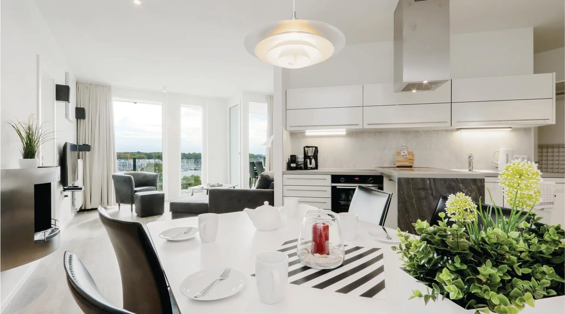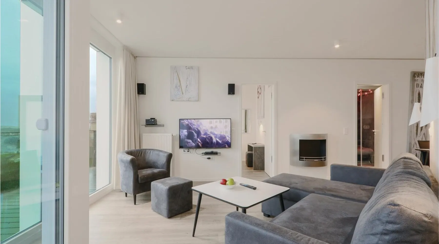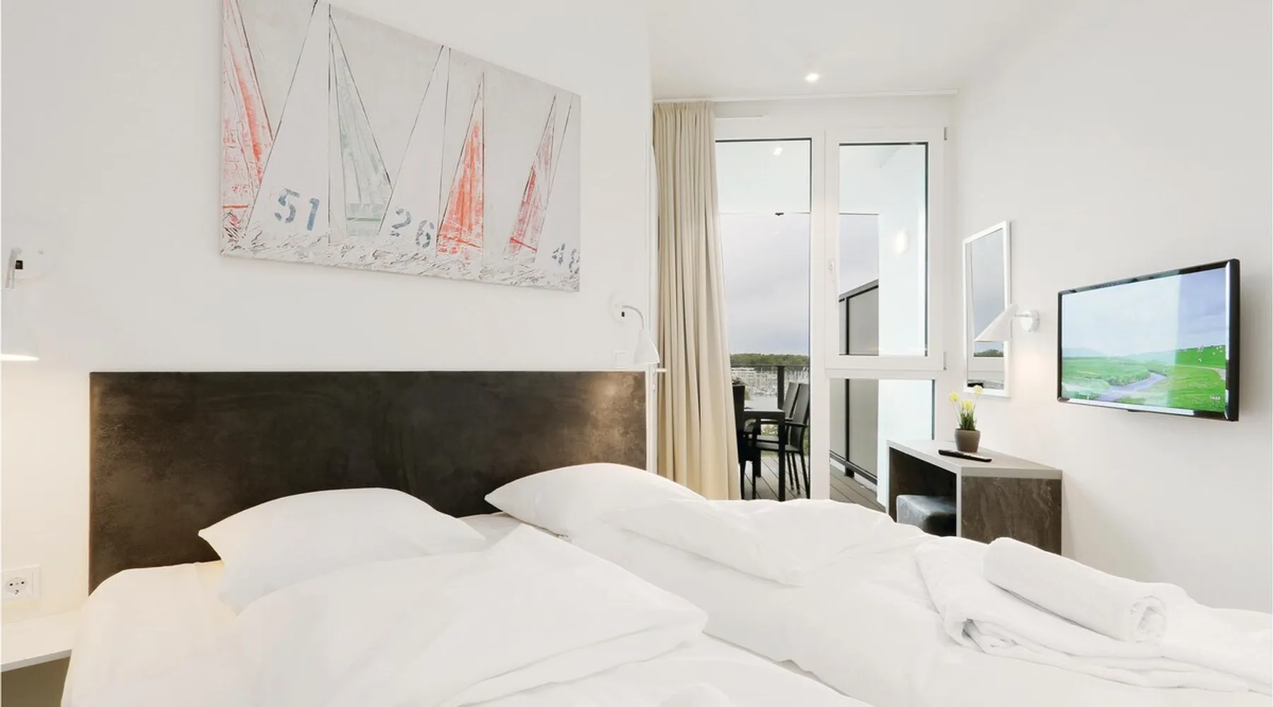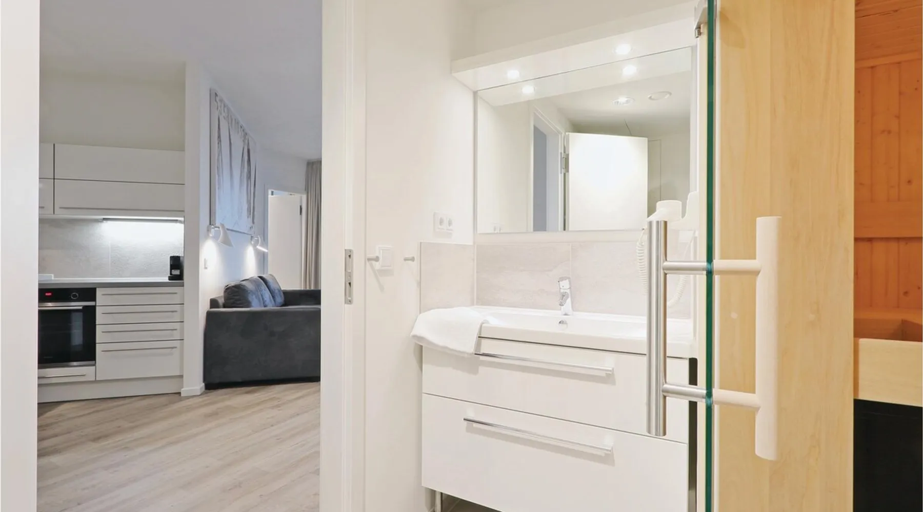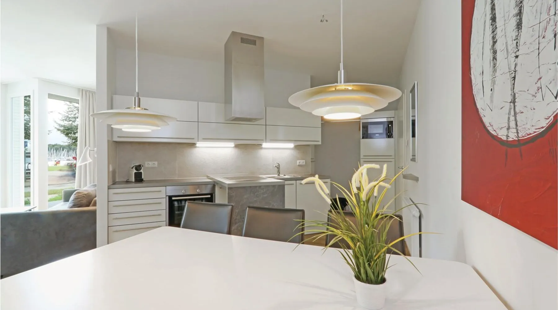 The exclusive vacation apartments in the apartment complex High End combine high-quality equipment, design and a beautiful location directly on the beach of Lübeck-Travemünde. Here you will immediately feel at home. The space The exclusive vacation apartments in the apartment complex High End combine high-quality equipment, design and a beautiful location directly on the beach of Lübeck-Travemünde. Here you will immediately feel at home. Your vacation apartment is located on the 5th floor of the complex, which is why you enjoy a unique view. From here you can look at the Priwall, the sandy beach as well as the harbor exit with the passing ships. The apartment has two separate bedrooms, each with a cozy double bed. In the living area you can make yourself comfortable in front of the cozy light of the bio-ethanol fireplace. The sofa bed is also located in the living area, which offers two more sleeping places. A crib can be placed exclusively in the living room, as there is not enough space in the bedroom. On the balcony, which faces south, you can enjoy the fresh Baltic Sea air and the sound of the waves or have meals together with the family. Here you can enjoy the beautiful view of the Travemündung and the passing ships as well as the Priwall to the fine sandy beach. For a small deposit you can borrow binoculars at the reception, with which you can observe the hustle and bustle of the surrounding area and nature. The bathroom presents itself as your personal wellness area. Here you can warm up in the sauna after a long walk on the Baltic Sea. In addition, the bathroom has a steam bath with rain shower. The modern entertainment system with Blu-Ray player, music system with MP3 connection as well as 3 flat screen TVs provides enough entertainment. All rooms are furnished in Scandinavian style and are bright and flooded with light due to the floor-to-ceiling windows. The modern kitchenette offers enough space for cooking and is equipped with high-quality brand appliances. Here, frahling lovers will find a Nespresso machine (please bring your own capsules), as well as a thermos and hand filter for home brewing, in case you prefer the classic filter coffee after all. The view of this object is in the direction of Priwall beach. The neighboring a-ja resort has a nice spa area with sauna and swimming pool. This can be shared for a fee. All registered NOVASOL guests from the High End receive a 25% discount on the respective entrance fee during your stay. Please note that the offer can only be used during the official rental period, i. e. from 4 pm on the day of arrival to a maximum of 10 am on the day of departure. The location in Lübeck-Travemünde makes the High End an ideal starting point for your vacation. The traditional town offers a beautiful sandy beach, restaurants, cafes, playgrounds and shopping facilities directly on the promenade. For the Travemünde Week, the promenade in front of the High End is transformed once a year (around the end of July) into a large family festival with sailing, gastronomy and a stage program. As a guest at the High End, you are right in the middle of the action and can enjoy the traditional festival right on your doorstep. Ship excursions and sailing tours can be booked directly on site. Other Baltic Sea resorts and the Hanseatic cities of Lübeck and Hamburg are also within easy reach for an excursion. Rental without possibly pictured decorative items such as flowers/candles/fruit. Can comfortably fit up to 4 people Other things to note Please note that: Bed linen and towels are not included in the room rate in 2025; guests can rent them at the property for an additional charge of EUR 25.00 per person, or bring their own. Consumption costs are included in the room rate.