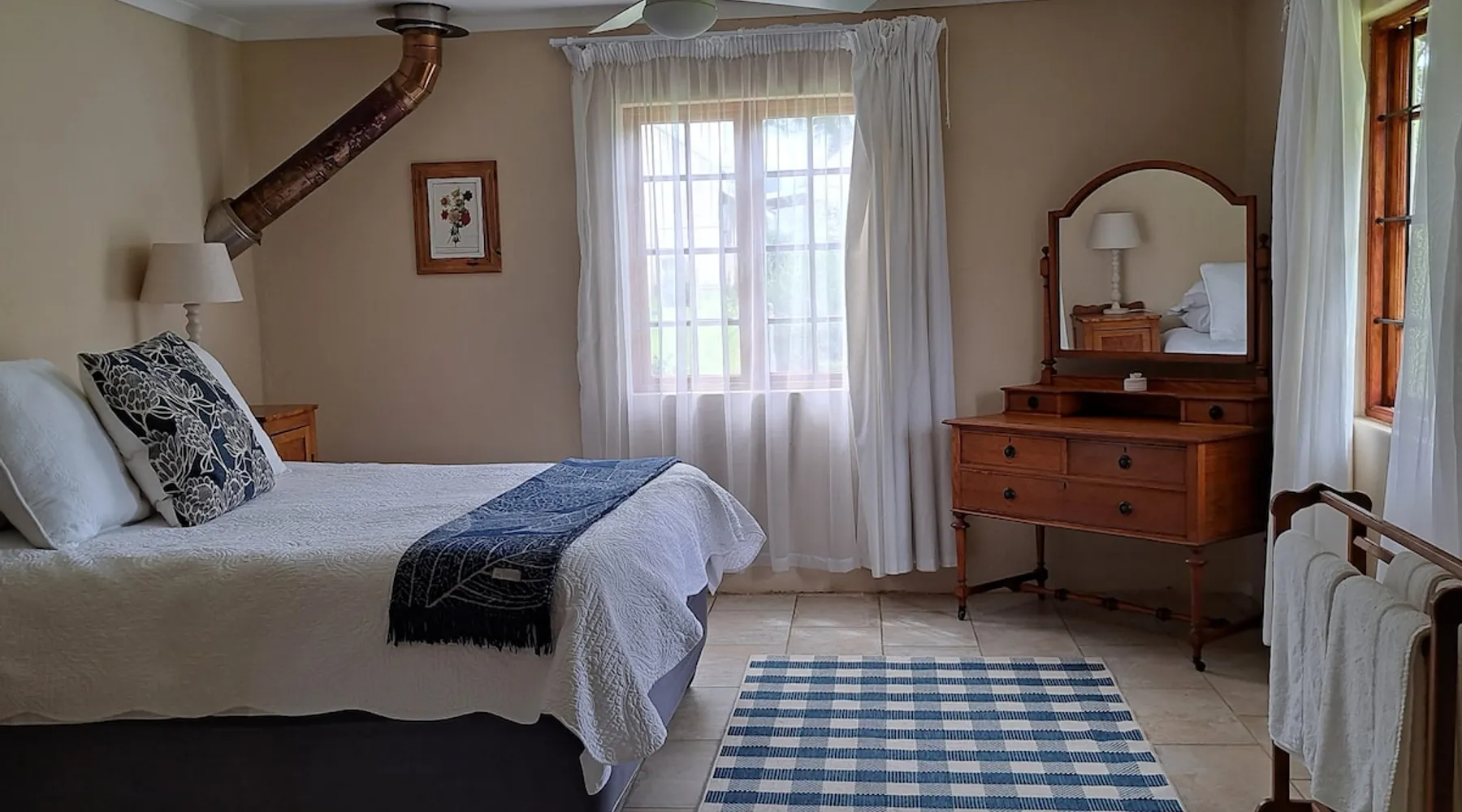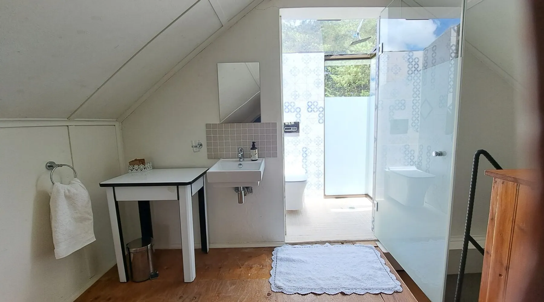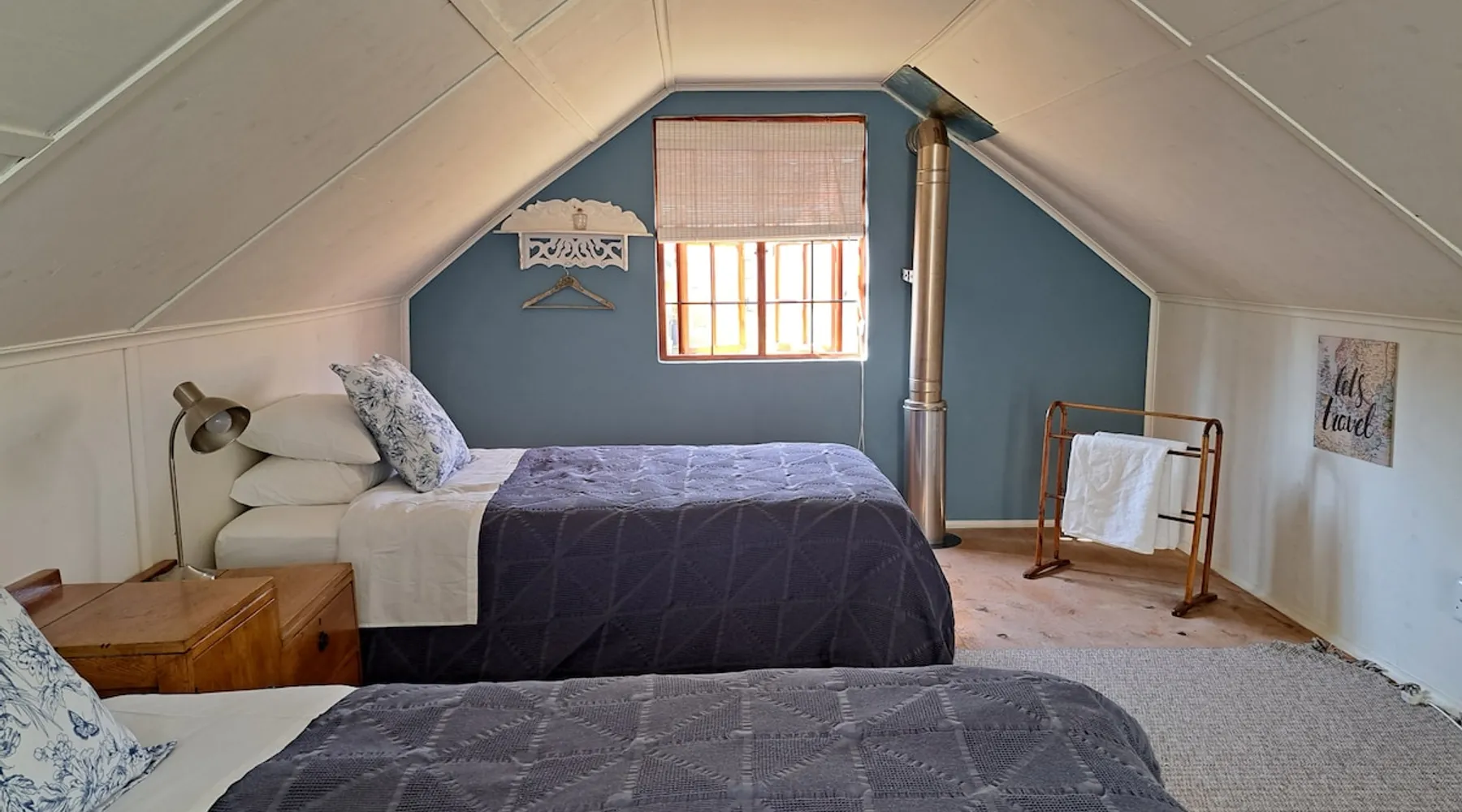 Self-catering cottage. Spacious main en suite shower, open plan kitchen & living room with wood burning firebox & tv, wooden stairs to loft with two 3/4 beds + own shower overlooking farmland. Ideal for young couples or family of 4 for weekend stay in the KZN Midlands. Equipped with large fridge/freezer, gas hob, microwave and other basic kitchen essentials. No oven. There is a weber braai and basic veranda furniture. Bushbuck and hare come out in the evening. Sunny in the morning. The space Eclectically furnished. Easy to clean. Fresh and simple. Enjoy the Midlands - whether it be for a wedding or a lunch at neighbouring wine farm / local restaurants or meandering the R103 routes - and come back for a comfortable night in front of the wood burning fireplace or a braai under the stars. Quiet. Rural. Yet not far from N3. Guest access Let us know when you get to the electronic gate and once you get up the steepish drive, the cottages are situated on a large grassy area with access to hidden rocky area under the gum and pines growing nearby. You are welcome to walk the approximately 5ha sloping property. Other things to note Wild Hare Cottages are self-catering. Water is from a borehole and delicious to drink. Power is from Eskom and subject to load shedding but rechargeable light bulbs and lamps are available. Our gas showers are now working off a gravity tank system and no longer affected by load shedding. Wi-fi is available through a satelite provider but may be affected by load shedding in some areas.