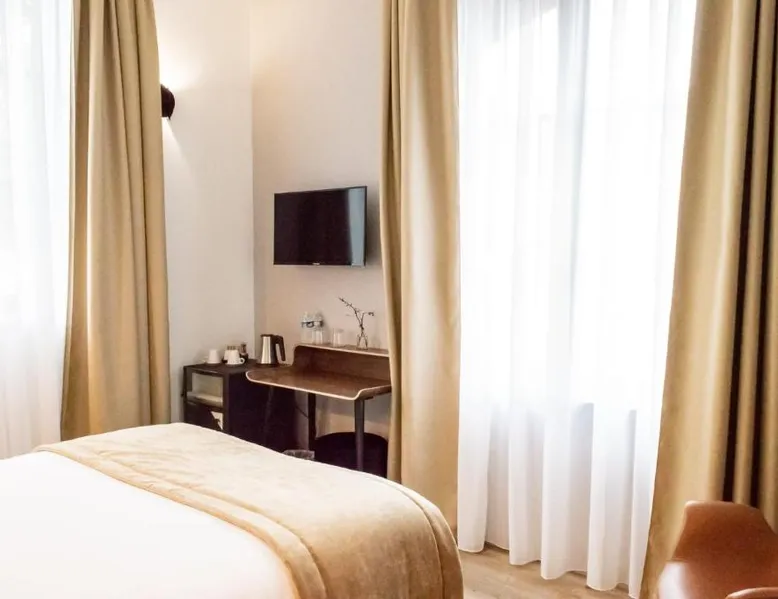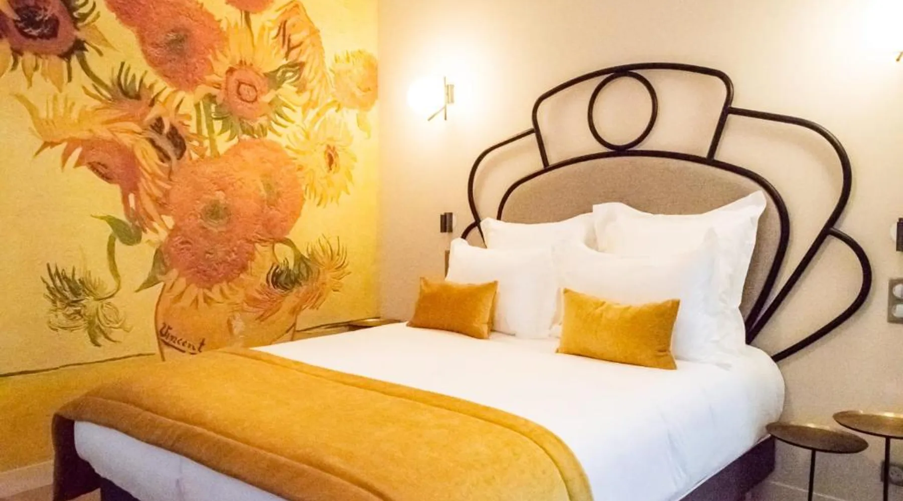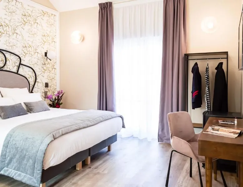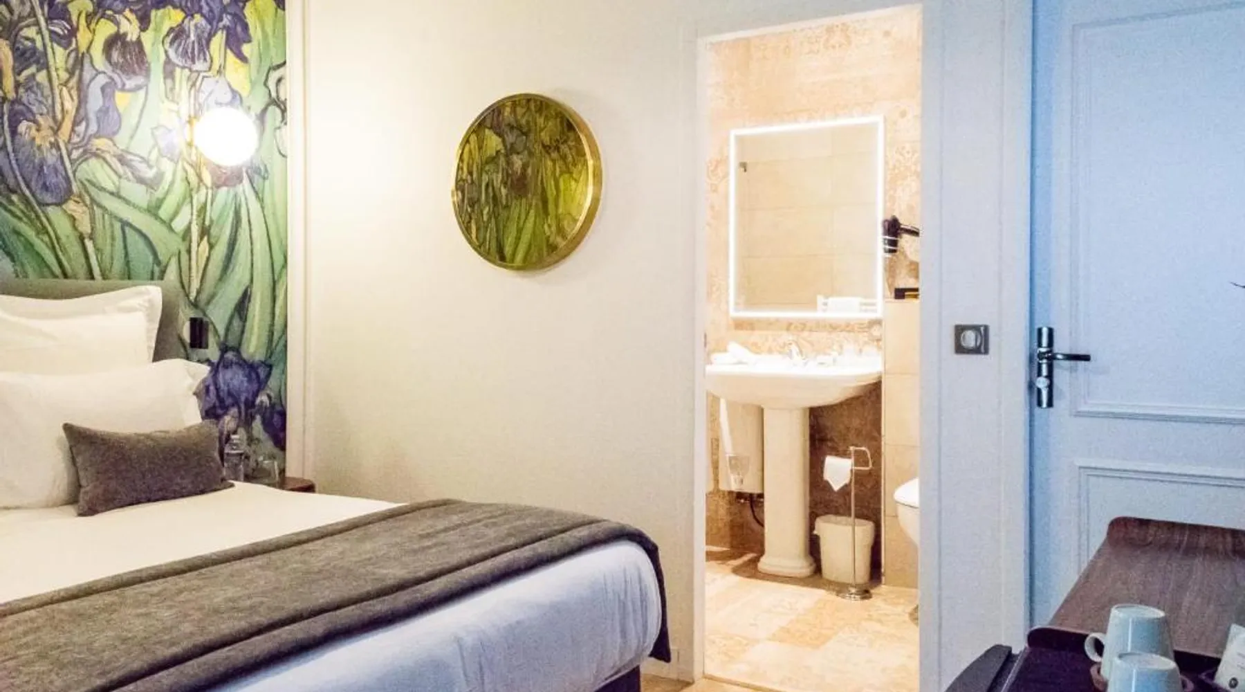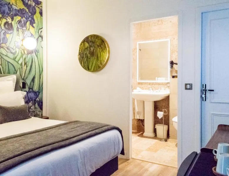 Comfortable Accommodations: Hotel des Iris in Auvers-sur-Oise offers air-conditioned rooms with private bathrooms, soundproofing, and parquet floors. Each room includes a work desk, TV, and free toiletries. Exceptional Facilities: Guests can enjoy a garden and terrace, complemented by free WiFi. Additional amenities include bathrobes, bath, and ground-floor units. Delicious Breakfast: A continental breakfast with gluten-free options is served daily, featuring local specialties, fresh pastries, cheese, fruits, and juice. Convenient Location: Located 21 mi from Paris Charles de Gaulle Airport, the hotel is near attractions such as Saint-Germain Golf Course (16 mi) and Arc de Triomphe (18 mi). Highly rated for its breakfast and attentive staff. Offering free toiletries and bathrobes, this suite includes a private bathroom with a bath or a shower and a hairdryer. The suite offers air conditioning, a private entrance, soundproof walls, a safe deposit box and a flat-screen TV. The unit has 1 bed.
