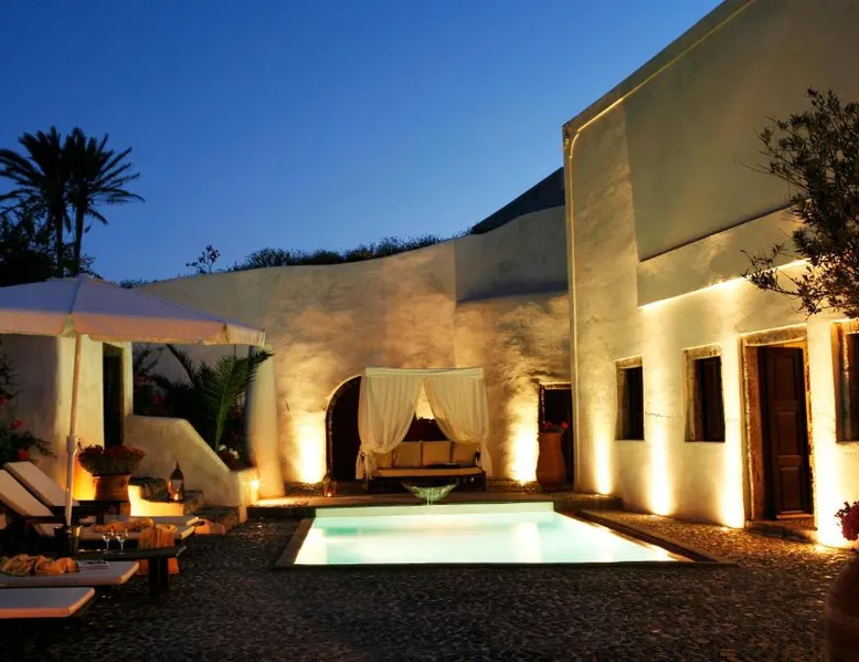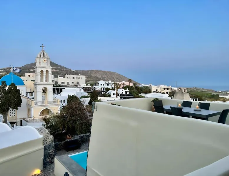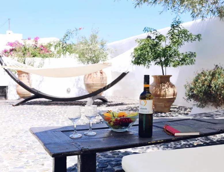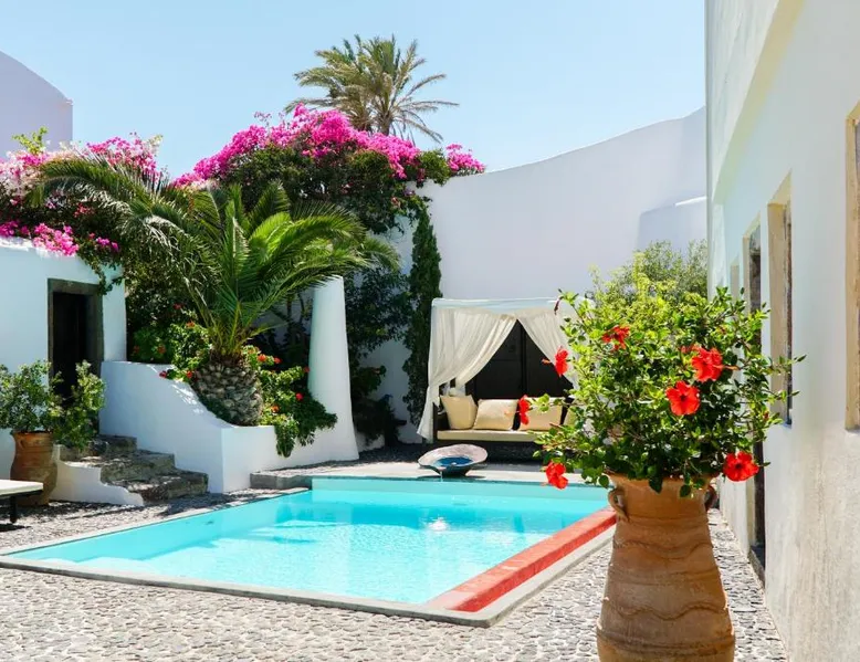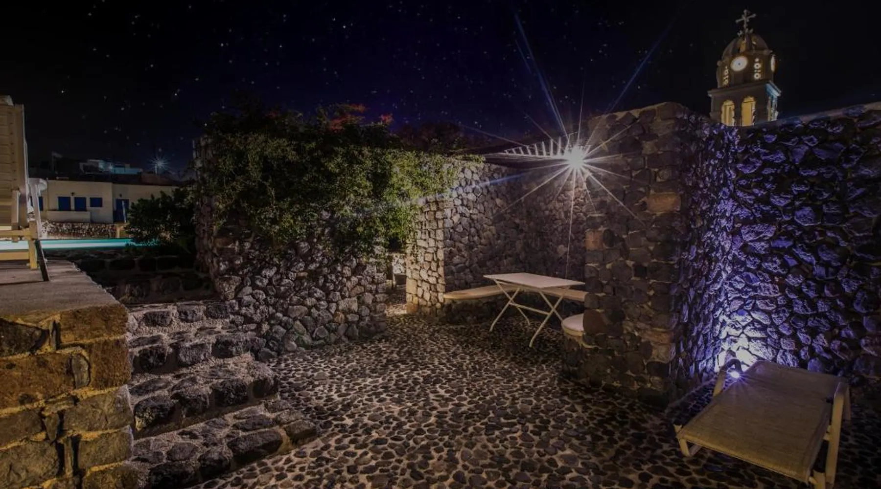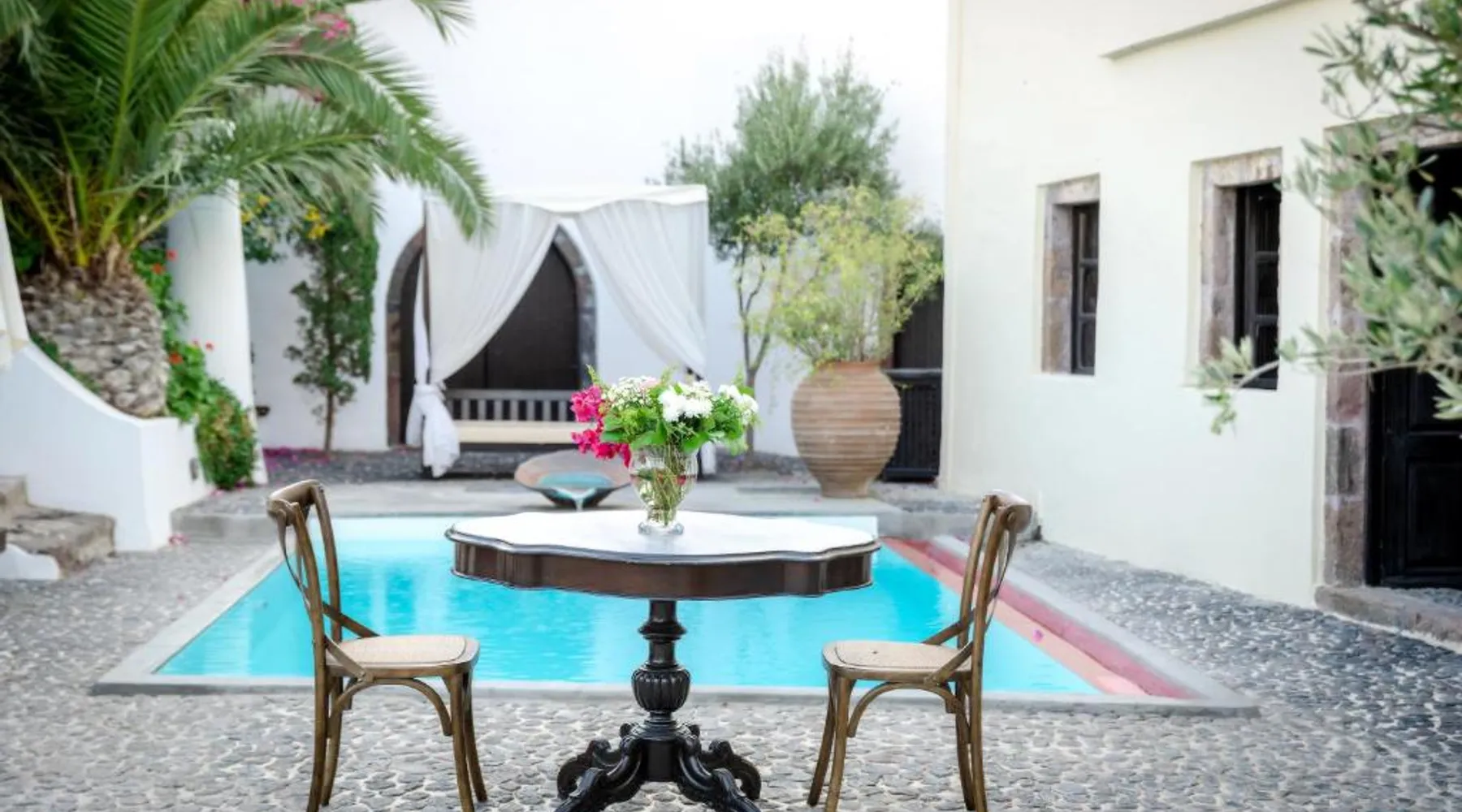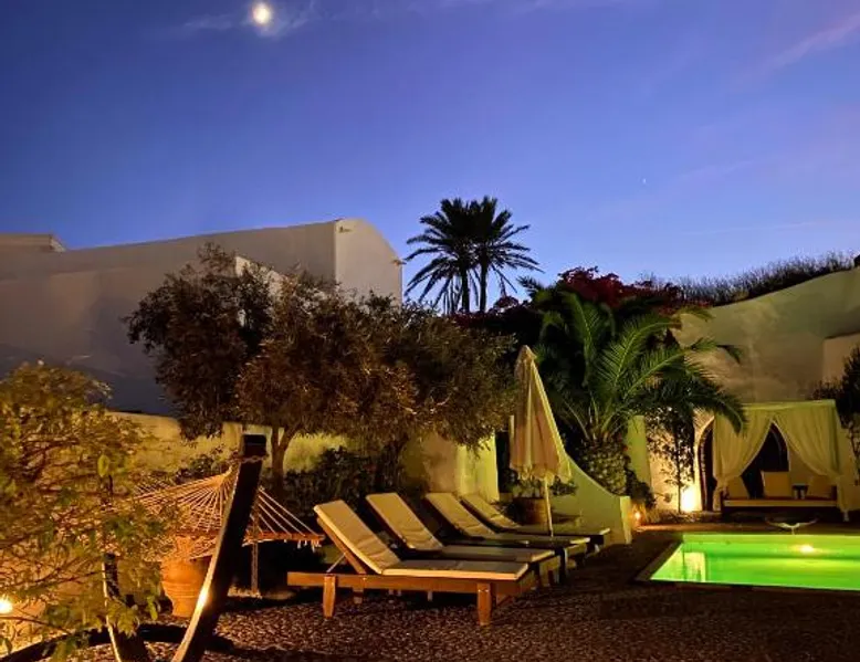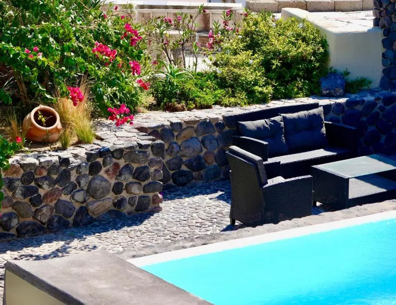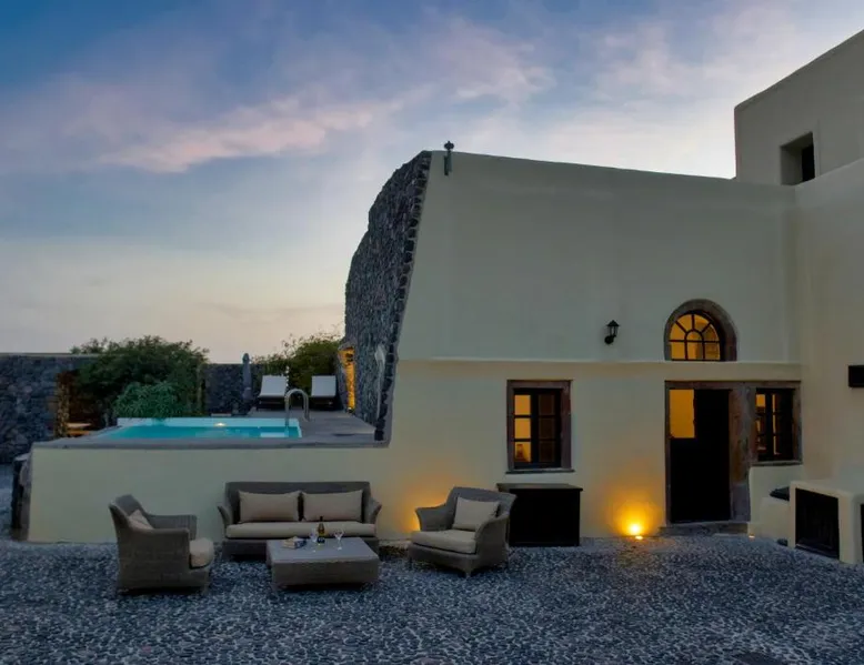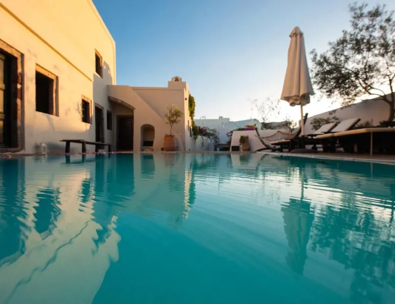 Elegant Accommodations: Santorini Heritage Villas in Megalochori offers a villa with a swimming pool, sun terrace, and lush garden. Guests enjoy free WiFi, air-conditioning, and a fully equipped kitchenette. Comfortable Amenities: The property features private check-in and check-out, a paid airport shuttle, concierge service, and housekeeping. Additional amenities include a washing machine, streaming services, and barbecue facilities. Prime Location: Located 4.3 mi from Santorini International Airport, the villa is less than 0.6 mi from Thermis Beach. Nearby attractions include Santorini Port (2.8 mi) and the Archaeological Site of Akrotiri (3.7 mi). Scuba diving is available in the surroundings. Guest Satisfaction: Highly rated by guests, Santorini Heritage Villas ensures a pleasant stay with excellent facilities and services. Historic villa, 164 feet from the center. Features a secluded courtyard, with garden and Moroccan-style pool. There is also a smaller courtyard where the guests can dine. The courtyard leads to a spacious living and dining area. There are two bedrooms with one bathroom shared between them. The villa offers a fully equipped kitchen and free Wi-Fi. Please note that there is a 50-yards distance between the villas.