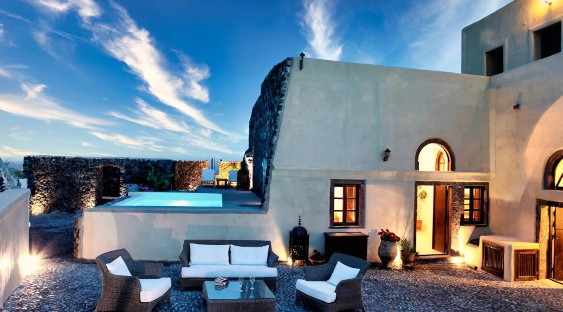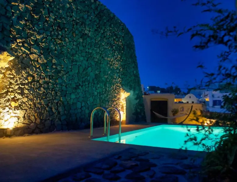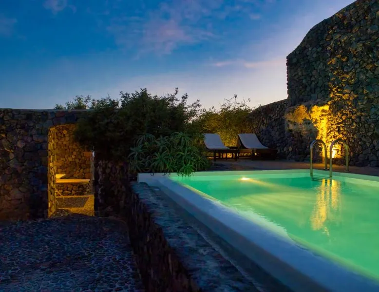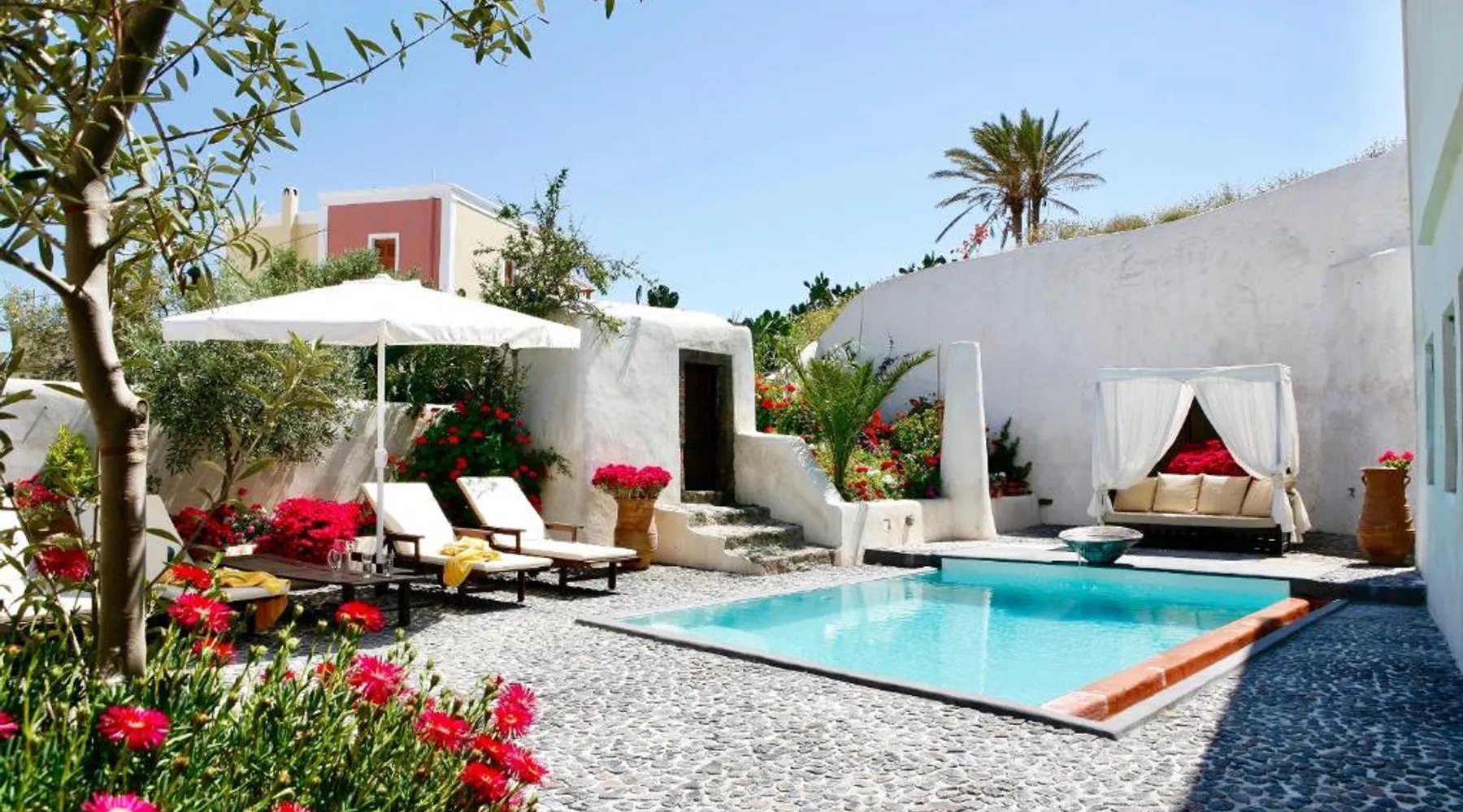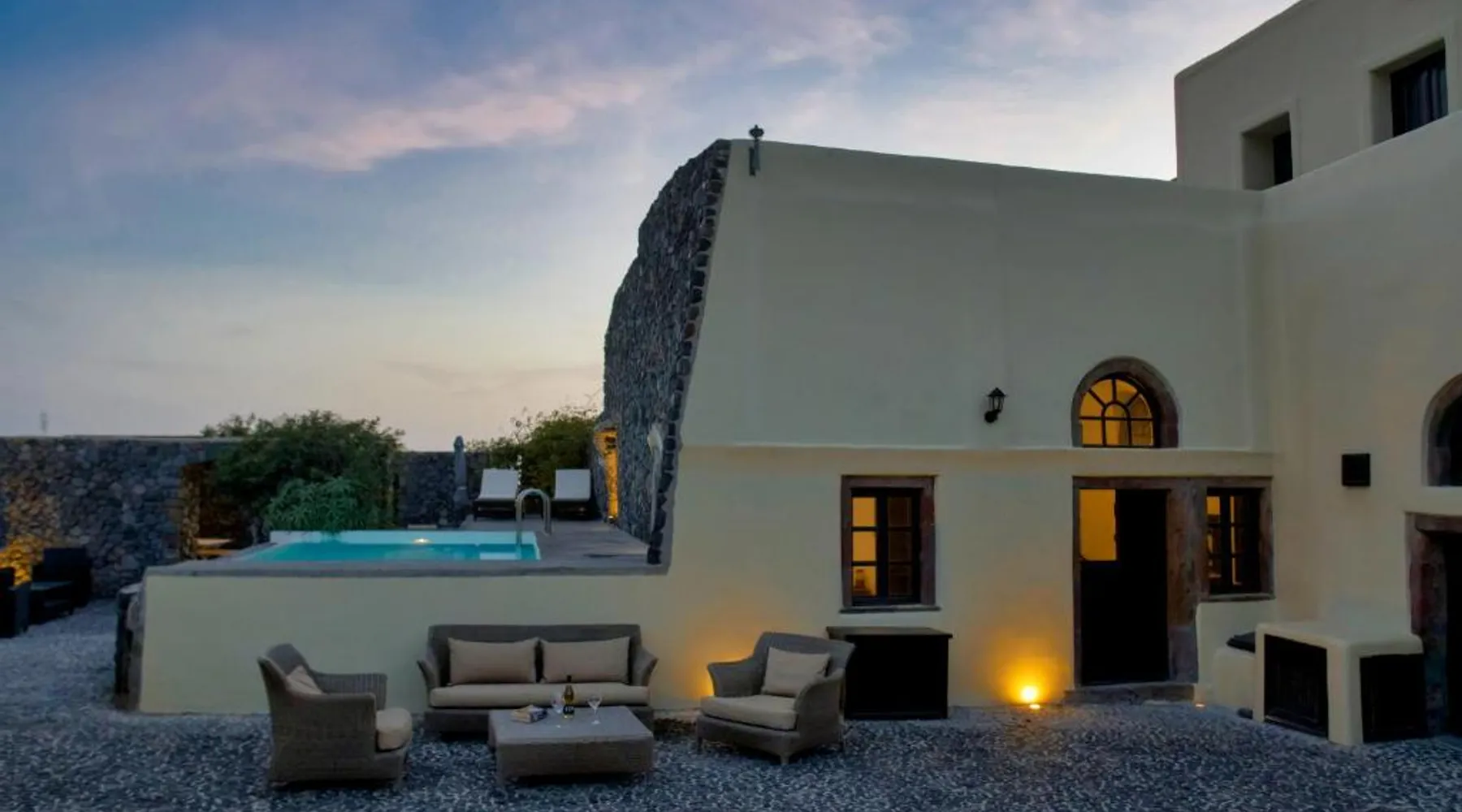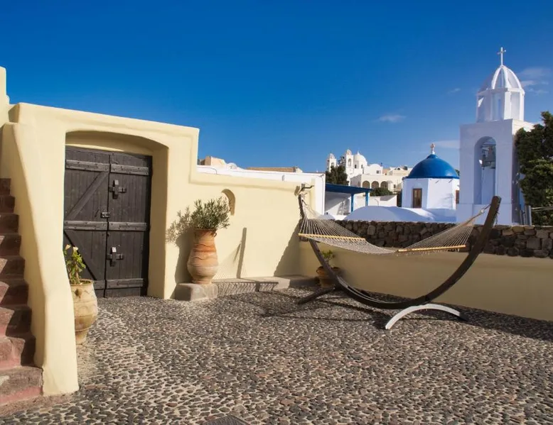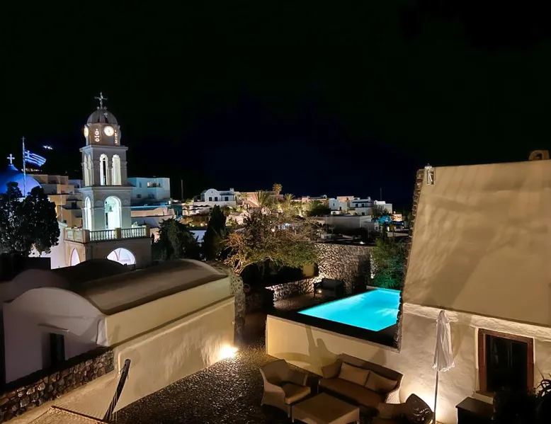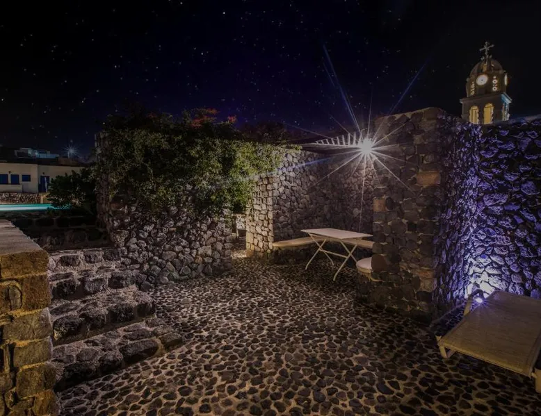 Elegant Accommodations: Santorini Heritage Villas in Megalochori offers a villa with a swimming pool, sun terrace, and lush garden. Guests enjoy free WiFi, air-conditioning, and a fully equipped kitchenette. Comfortable Amenities: The property features private check-in and check-out, a paid airport shuttle, concierge service, and housekeeping. Additional amenities include a washing machine, streaming services, and barbecue facilities. Prime Location: Located 4.3 mi from Santorini International Airport, the villa is less than 0.6 mi from Thermis Beach. Nearby attractions include Santorini Port (2.8 mi) and the Archaeological Site of Akrotiri (3.7 mi). Scuba diving is available in the surroundings. Guest Satisfaction: Highly rated by guests, Santorini Heritage Villas ensures a pleasant stay with excellent facilities and services. Historic villa, 164 feet from the center. Features a secluded courtyard, with garden and Moroccan-style pool. There is also a smaller courtyard where the guests can dine. The courtyard leads to a spacious living and dining area. There are two bedrooms with one bathroom shared between them. The villa offers a fully equipped kitchen and free Wi-Fi. Please note that there is a 50-yards distance between the villas.
