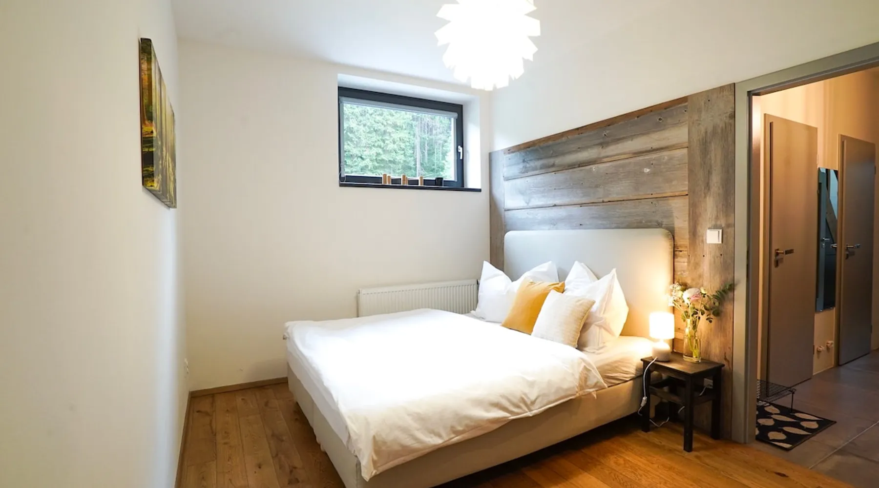 Skog is modern apartment designed in a minimalist Scandi style, using mostly natural materials in the interior. It has about 70m2 and includes 2 separate bedrooms. One is in the attic with lower ceiling. A spacious terrace belongs to the apartment. It is situated in the neighbourhood with some other built houses in similar style within walking distance to the centre. Mumlava waterfall is only 10mins forrest walk. 007 building (gym and squash centre) is being renovated from 07/2025 to 11/2025. The space Kitchen, dining room and living room: The room on its own is about 27sq metres, the ceiling is high – about 4 metres. Inbuilt kitchen has good quality Bosch appliances, granite countertops and equipment that you will need for your cooking. There is dishwasher available, inbuilt fridge and freezer, modern oven. We have Nespresso for you, too. Dining table is in the middle of the room directly connected to the kitchen. Tv corner with good sofa is at the other side of the room. The staircase takes you from the living room to the bedroom nr. 1 in the attic. Bedroom 1 – attic It is cozy style bedroom, matress bed is directly on the floor due to the height of the ceiling. Hallway: In the hallway there is big wardrobe. Bathroom: Small but effectively planned bathroom is on the first floor and has a bathtub with shower. Wc: Is in a separate room. Bedroom (master): In a master bedroom there is a 160cm bed with a good matrace and storage space for your items :-) Terrace: Terrace is spacious, with wood on it. It has a good quality outdoor furniture for a great relax. Outdoor Fatboy is available for your use. Guest access The whole appartment is available for guests. Other things to note The appartment is nicely build as an annex to the appartmnent building. Therefore there are no windows from the house neigbours oriented to the terrace or the windows. It neigbours with Mine Museum on one side, where there are organized viewings..