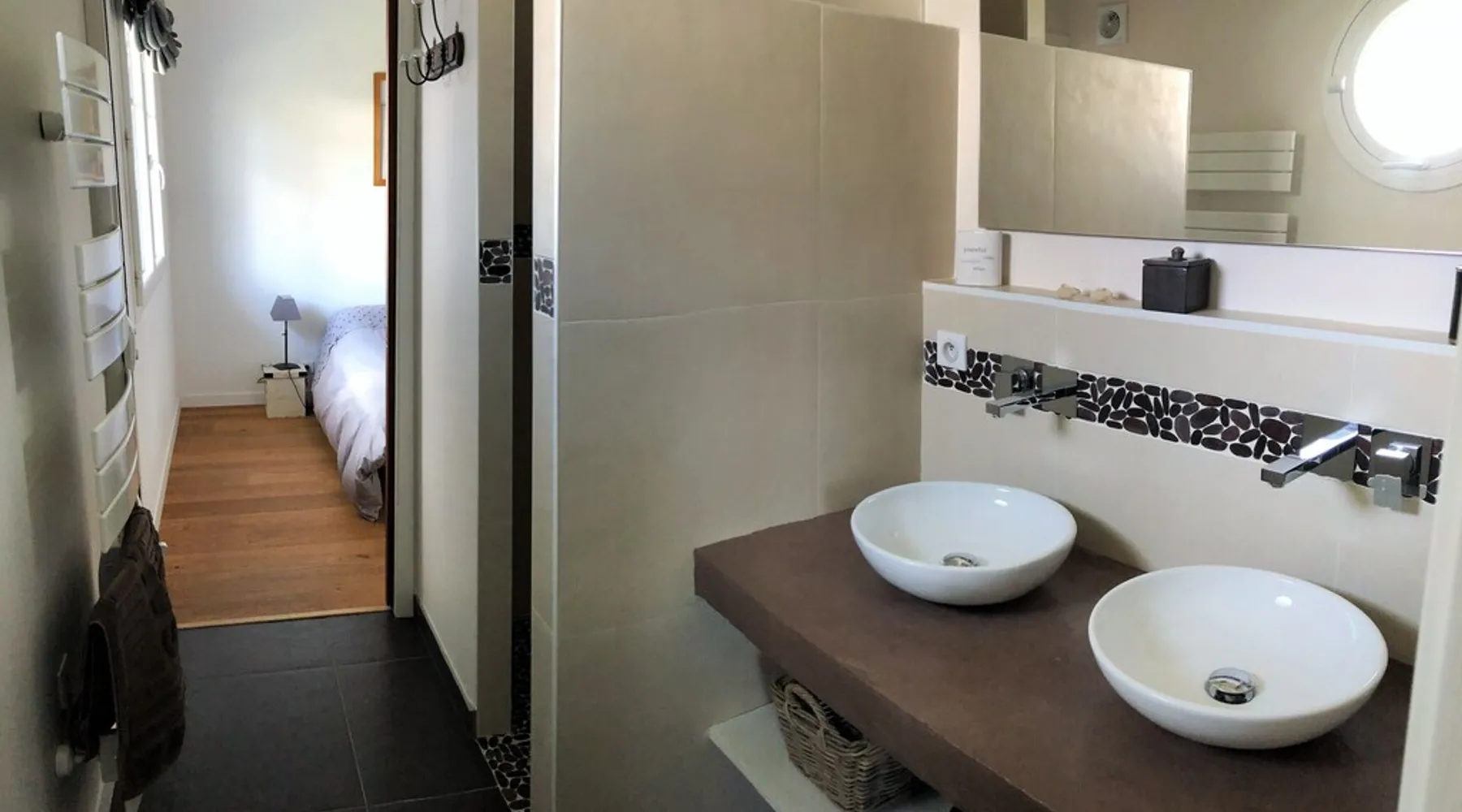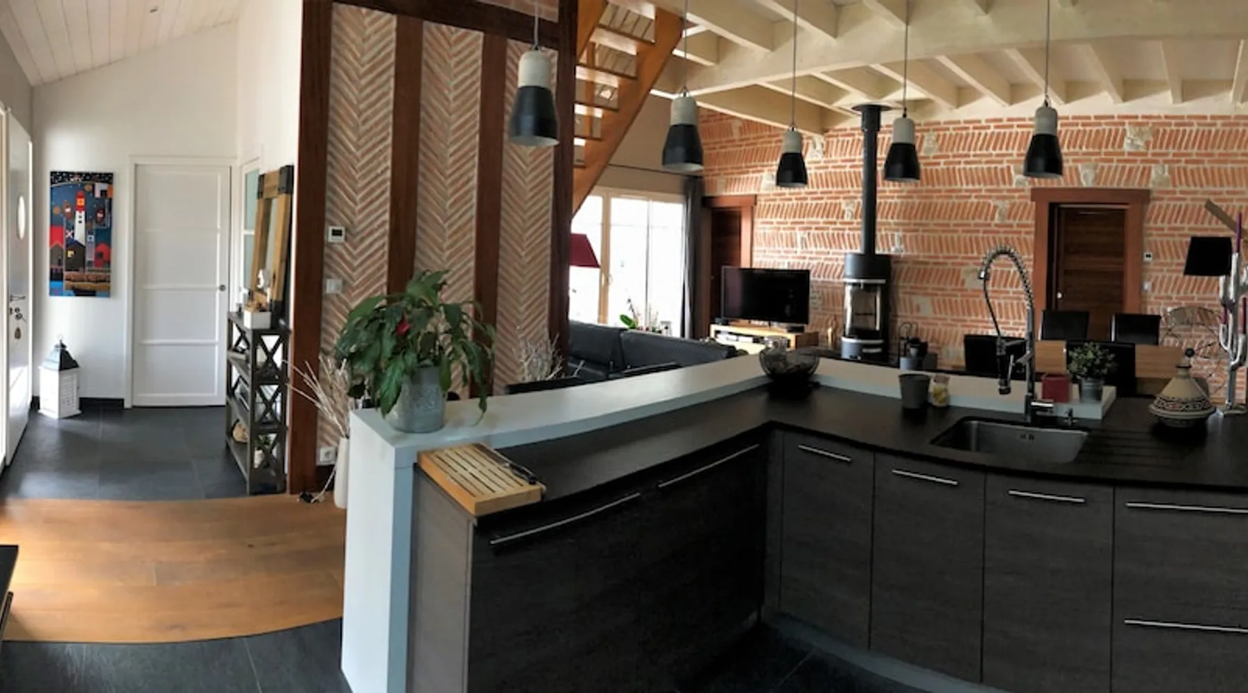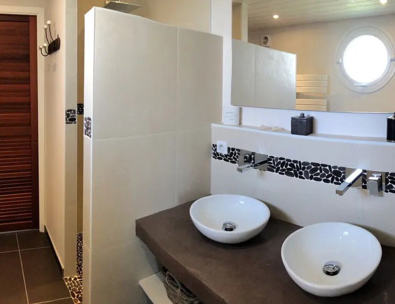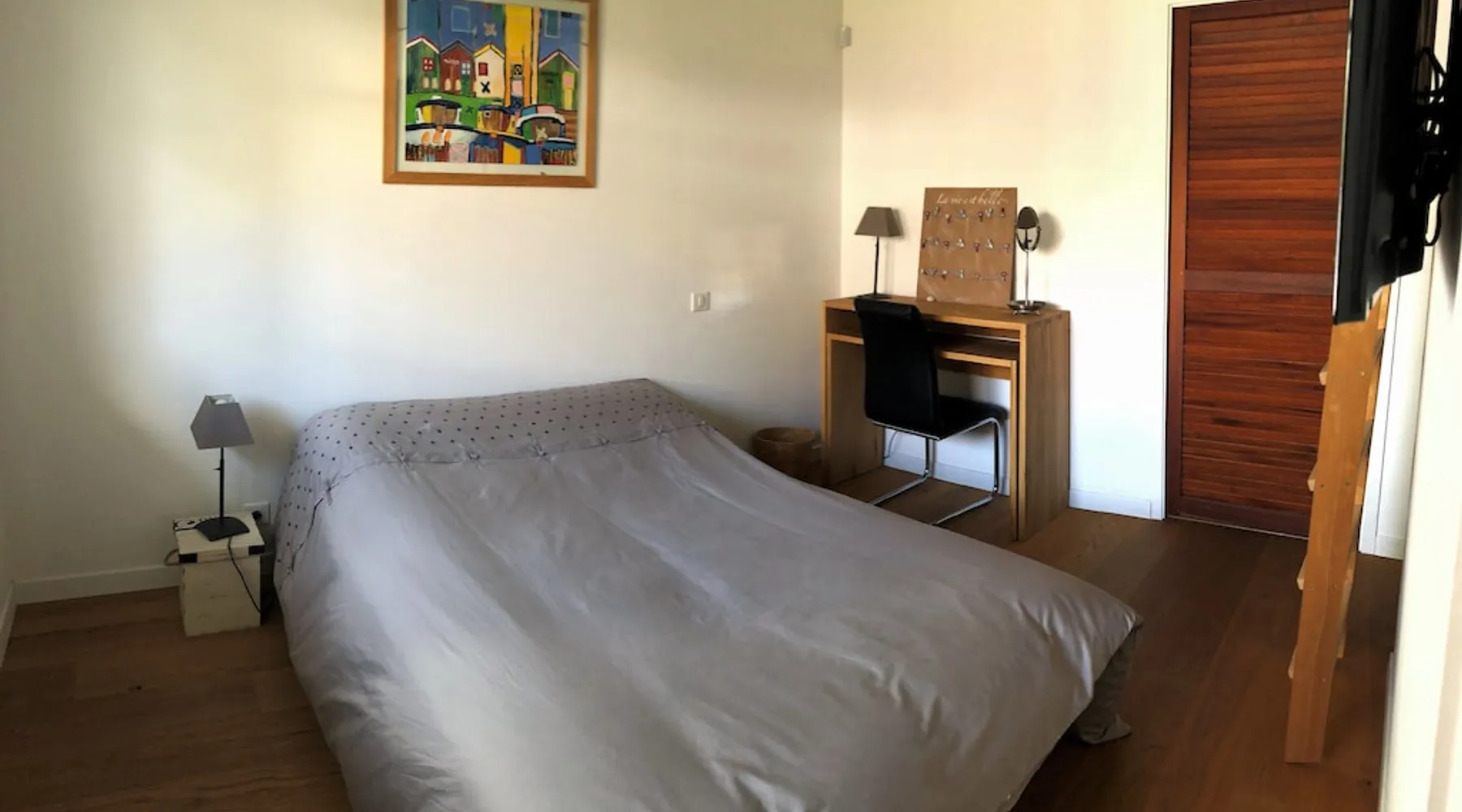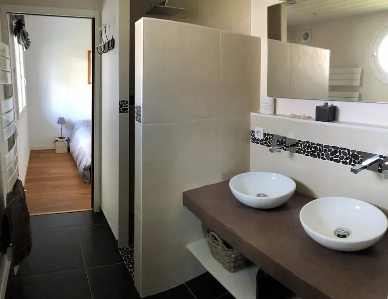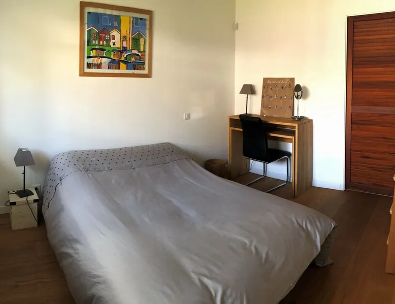 Beautiful villa located in a quiet residential area with enclosed garden, heated swimming pool and covered terrace. On the ground floor: - Large living room: Fully equipped kitchen, bar, dining room and lounge area. (Big screen TV, wifi, DVD, home cinema) - 1 WC - 1 dressing room - 1 bedroom bed 140 cm with TV + mezzanine 2 beds 90 cm and dressing room - 1 shower room - 1 bedroom with very comfortable convertible sofa Upstairs: - Master bedroom bed 160 cm with TV - 1 bathroom shower + bath - 1 WC - dressing room The exteriors: - Terrace - Garden table and garden furniture - Heated swimming pool - Deckchairs - Plancha - Adjoining room with shower and WC Parking spaces with carport. Sheets and towel provided 2km from the beach, nearby cycle path.