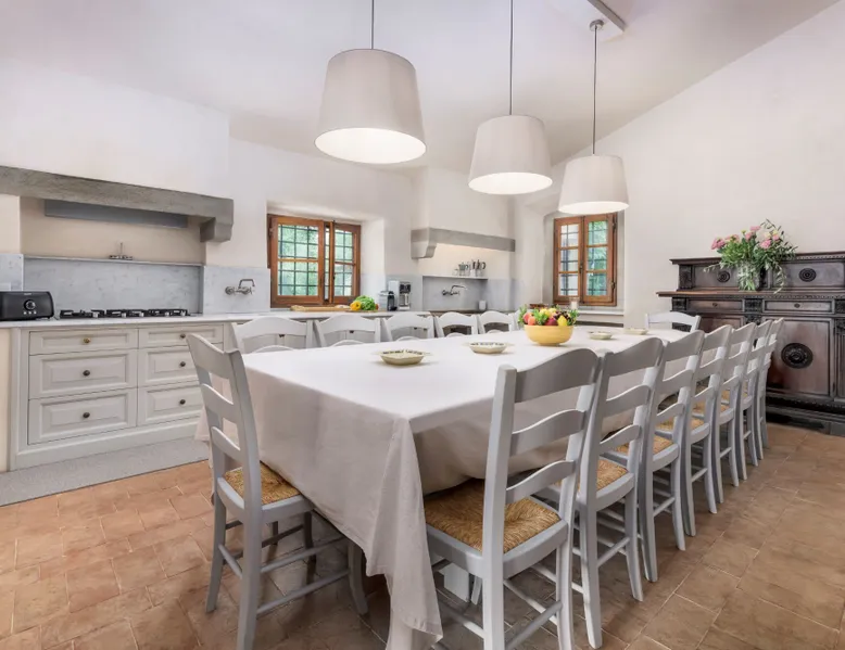 *** The conditions for hosting weddings and events at the property are detailed at the end of the description. *** Set in the heart of the beautiful Chianti region, this magnificent 8-bedroom, 8.5-bathroom villa dates back to the 16th century and offers a prime location for easy access to Florence and all of Tuscany’s most famous attractions. Surrounded by a stunning garden, the villa sits within an expansive 68-acre estate, offering breathtaking, unobstructed views of the Chianti hills, lined with meticulously maintained vineyards and olive groves. The villa features truly stunning architecture, crafted from ashlar stones that frame the grand entrance and is prominently referenced in the renowned book “Le Ville di Firenze” (Florence’s Villas). Upon entering through the arched doorway, you are welcomed into a meticulously maintained private courtyard, complete with a full set of outdoor furniture, ideal for unwinding after a day of exploring the area. Inside, the villa boasts stone jambs that enhance the doors, while the vaulted bedrooms create a serene and elegant atmosphere. The estate also includes an antique private chapel, adorned with a vaulted ceiling and a beautiful painting of the Virgin Mary at its center. Following an extensive renovation that spanned several years, during which all original charm and architectural features were preserved, the villa's interiors have been meticulously upgraded to the highest standards. Every detail has been carefully considered, from the selection of premium materials to the exquisitely appointed furniture & the artwork hanging on the walls, resulting in a truly unique space that harmoniously complements the villa's original structure. Covering over 7,500 square feet and featuring eight beautifully decorated air-conditioned bedrooms, the property provides the ultimate setting for your dream luxury Italian getaway!! The Property owners oversee the production of exquisite wines, olive oil, honey, and Vin Santo (dessert wine) right on the estate, all of which can be sampled or purchased at any time. As an introduction to the property owners’ winemaking activity, all villa guests are offered a free wine/olive oil tasting and visit to the main aging cellar on the estate. Description of the interiors. The villa spreads over 2 floors and features 8 bedrooms & 8.5 bathrooms, which means that it can comfortably accommodate up to 16 guests: Ground Floor (All bedrooms as well as the living rooms are air conditioned). - Spacious, fully equipped kitchen featuring a wooden table that seats up to 16 guests - Living room with fireplace and French doors that open onto a large terrace, offering stunning views of the most beautiful Tuscan landscape - Powder room - Bedroom 1: King size bed with en-suite bathroom (featuring a shower) - Bedroom 2: King size bed with en-suite bathroom (featuring a shower) - Expansive terrace with beautiful views, fully furnished with a dining table for up to 16 guests, comfortable sofas and a large umbrella - Fully furnished courtyard (entrance side) with outdoor furniture - Dining area beneath a newly built wooden pergola equipped with a large table & chairs for up to 16 guests perfect for al fresco dining, with magnificent views of the pool area and garden. First Floor (All bedrooms are air conditioned). - Living room equipped with a TV and satellite channels - Bedroom 3: King size bed with en-suite bathroom (featuring a shower) - Bedroom 4: King size bed with en-suite bathroom (featuring a shower) - Bedroom 5: Two Twin beds with en-suite bathroom (featuring a shower). The Twin beds can be converted into a King size bed upon request - Bedroom 6: King size bed with en-suite bathroom (featuring a shower) - Bedroom 7: King size bed with en-suite bathroom (featuring both, a tub and a separate shower) - Bedroom 8: King size bed with an en-suite bathroom (featuring a shower) Office room - 2nd Kitchen, perfect for preparing morning breakfasts - Covered loggia with a dining table and seating (sofas), directly connected to the kitchen Pool and BBQ area. - Private Heated Pool - Poolside changing room with toilet and shower - Fully equipped pool area with several lounges and umbrellas - BBQ area Amenities. - Fully furnished Terrace with breathtaking views - Large private Garden - Fully Furnished Courtyard (entrance side) - Wooden Pergola for “Al fresco” Dining, with table seating up to 16 guests - Private heated pool - Wi-fi internet - Parking - Housekeeping - Heating - Fully equipped kitchen - Satellite Tv - “Welcome” Wine/olive oil tasting (complimentary) - Air conditioning - BBQ facilities - Ping pong table - Pets are allowed, upon request (charges may apply) The Location. The property is located in the immediate proximity of the village of Tavarnelle Val di Pesa, in the heart of the Chianti countryside, offering easy access to all of the region's major cultural and artistic towns, including Florence, San Gimignano, Siena, Monteriggioni, Volterra, Certaldo, etc. Surrounding the property are numerous charming restaurants, along with a variety of local delicacies, crafts and jewelry shops. The nearest supermarket (COOP) is approximately 2.8 miles away, just a 5-6 minute drive, while the closest restaurant is 2.5 miles from the property (5-min. drive). A fully equipped gym is reachable in under 10 minutes by car (less than 3 miles away), and the local tennis club, with clay courts, is less than a mile away, just a 2-minute drive. Lastly, the nearest golf course is located less than 15 miles away (approx. a 25-minute drive). As the property is located just 17 miles (approximately 25-26 minutes by car) from the center of Florence, it is very easy and quick to reach all of the city's incredible treasures and attractions. Similarly, Siena is only 30 miles away, about a 45-minute drive. Tavarnelle Val di Pesa (7 miles from the villa): Nestled between Florence and Siena in the lush hills of Chianti, this historic town is one of th