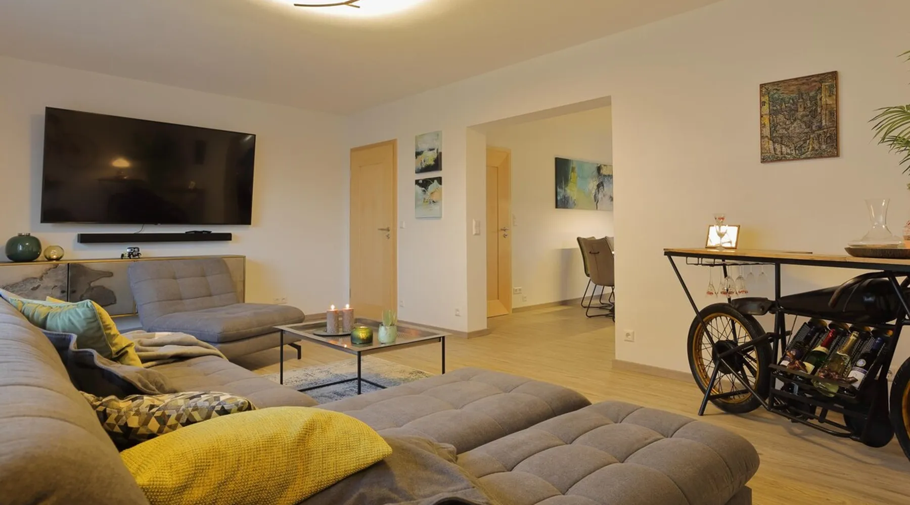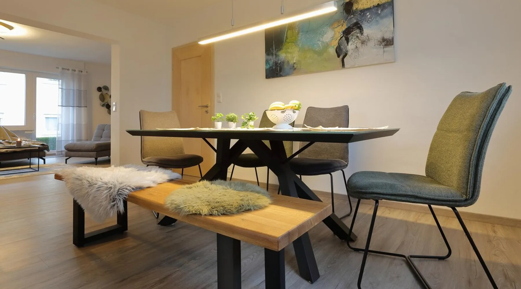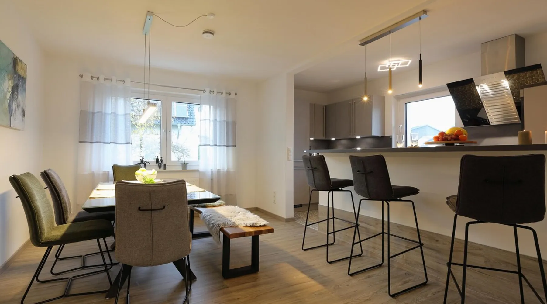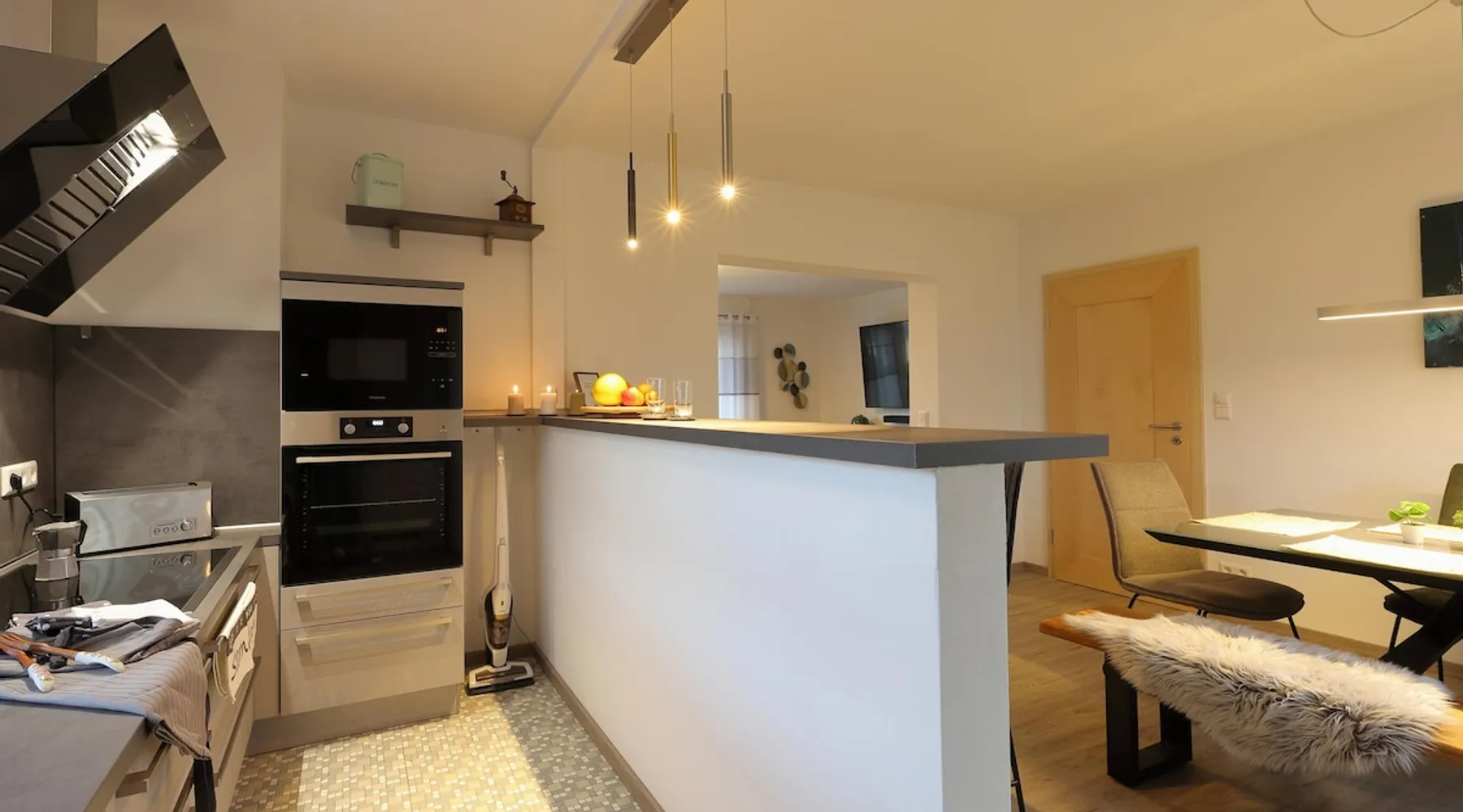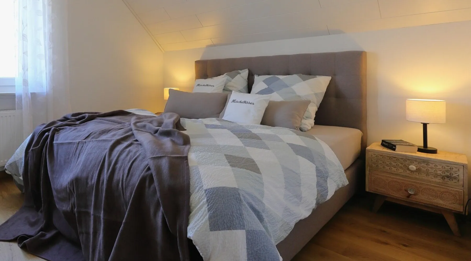 The comfortable and modern vacation home "Däschinger" with 5-star DTV classification welcomes you in the tranquil village of Mastershausen in the Hunsrück. The 210m² vacation home consists of 2 separate apartments, each with a living room, a well-equipped kitchen with dishwasher, a bathroom and a total of 4 bedrooms, offering space for 14 people. Further amenities include WLAN, a washing machine, Internet TV and a safe. The house also has a balcony. Other things to note The private outdoor area with lovingly landscaped garden, covered terrace with pergola and garden shed invites you to relax in the sun or enjoy a barbecue together. There is a bakery (170m) and a pizzeria (280m) just a few minutes' walk from the accommodation. The nearest large supermarkets are in the town of Kastellaun, a 10-minute drive away. The area is particularly popular with hikers and cyclists. The Masdascher Burgherrenweg and many other hiking and cycling trails invite you to actively explore the region. Other nearby attractions include the Hallgarten nature and adventure park with children's playground and pirate ship (1.2 km), the "Balduinseck" castle ruins (1.8 km) and the Geierlaybrücke, a suspension rope bridge between the neighboring villages of Sosberg and Mörsdorf (7.3 km). Parking spaces are available on the property and on the street. Bed linen and towels are included in the price. Iron, first aid kit and washing machine and dryer for communal use in the basement. Please note that pets are not allowed. In due course, the following fruits grow in the garden, which guests are welcome to pick and eat: Apples, cherries, strawberries and raspberries. Bedroom 1: double bed; Bedroom 2: double bed; Bedroom 3: double bed; Bedroom 4: double bed and 4 single beds; After booking, please fill in the Holidu contact form, which will be sent to you by e-mail, completely with your address. This will help the host to prepare your stay in the best possible way.