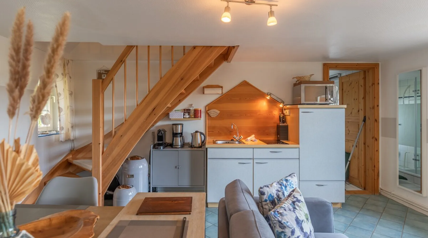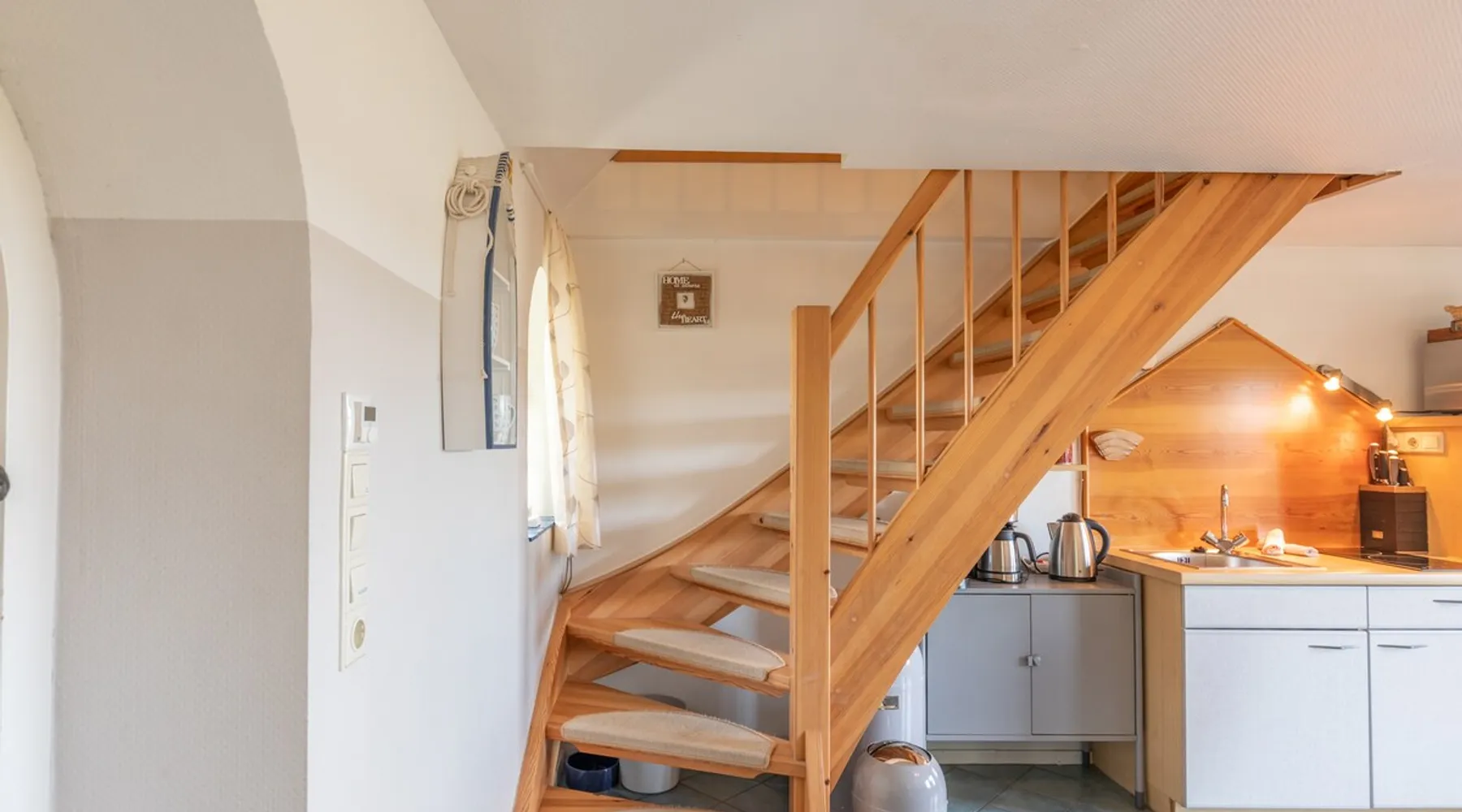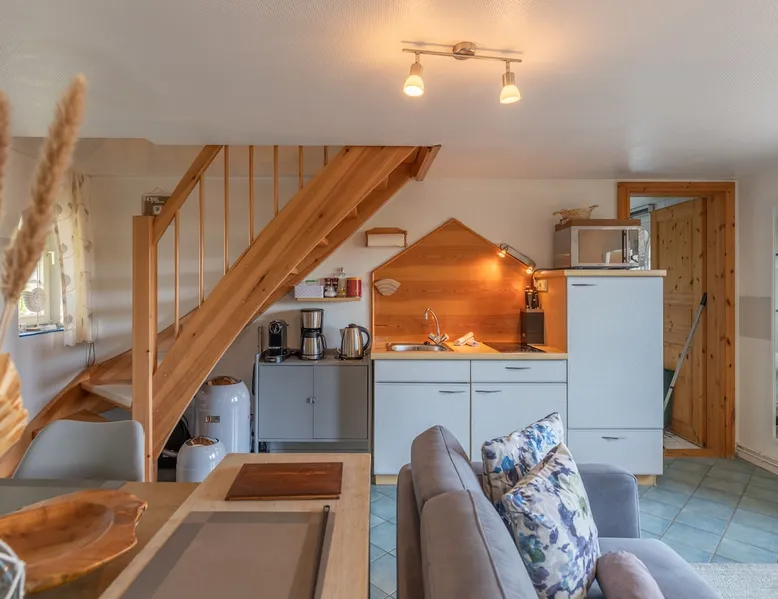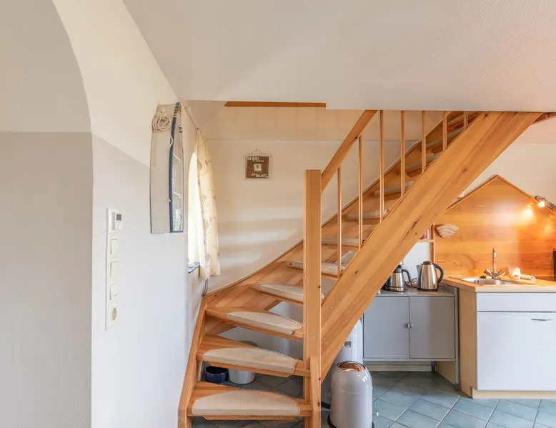 Welcome to the Kastanienhof! Spread over 2 floors, this two-person apartment offers a cozy living area, well-equipped kitchenette, and downstairs shower room. The double bedroom can be reached via a staircase upstairs. Four-legged friends are welcome, WiFi available, parking included Linens and towels are included. Enjoy nature and vastness! Other things to note Welcome to the Kastanienhof: enjoy the wide fields, the nature in abundance! Take long walks or just chill out on the *contact info removed* sqm property. Location In the middle of fields, the Kastanienhof is located on the so-called Lagedeich. Enjoy the vastness and country life. The nearest shops and bakeries can be found in Schwabstedt (about 3,5 km away). Husum with its idyllic harbor, cafes and restaurants can be reached in 12 km, St. Peter-Ording with its stretched sandy beach in 45 km. Amenities The apartment for two stretches stretches over 2 levels: in the large living area you will find a cozy sitting area with sofa, flat screen. The open kitchenette is equipped with a 2-burner stove, a microwave, Nespresso machine, coffee machine (filter size 4). The shower bathroom on the ground floor completes the picture. An open staircase leads to the upstairs bedroom with a double bed (180 x *contact info removed* On the fenced terrace, you can end your day comfortably on garden furniture. The special features In our non-smoking apartment, your four-legged friends are welcome. We are happy to provide free WiFi to our guests. The apartment has a parking space. The shared garden (fenced all around) can use two- and four-legged friends to romp and play. An initial supply of bed linen and towels is mandatory at this property and is already included in the final price. Additional laundry packages can be booked in the optional services.