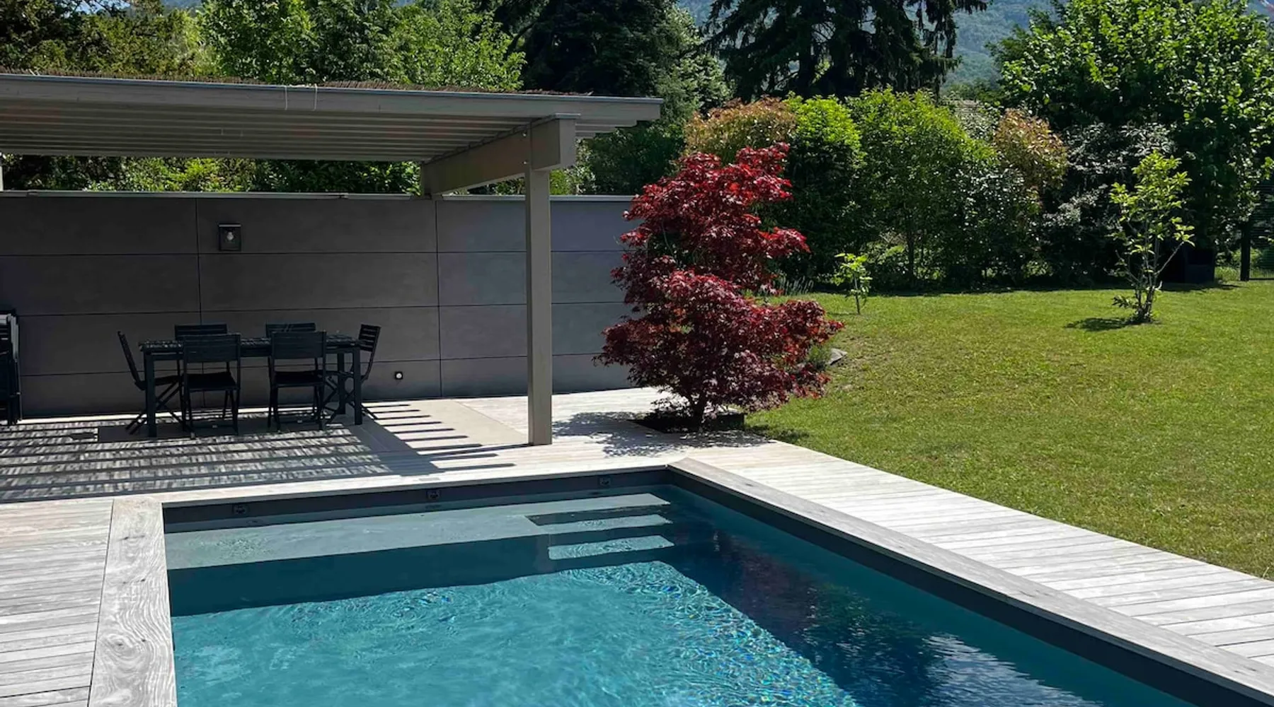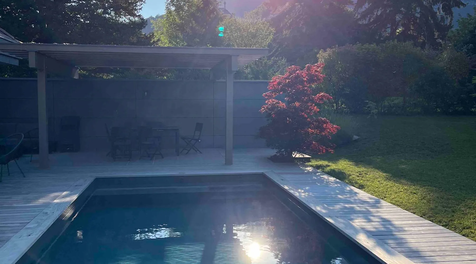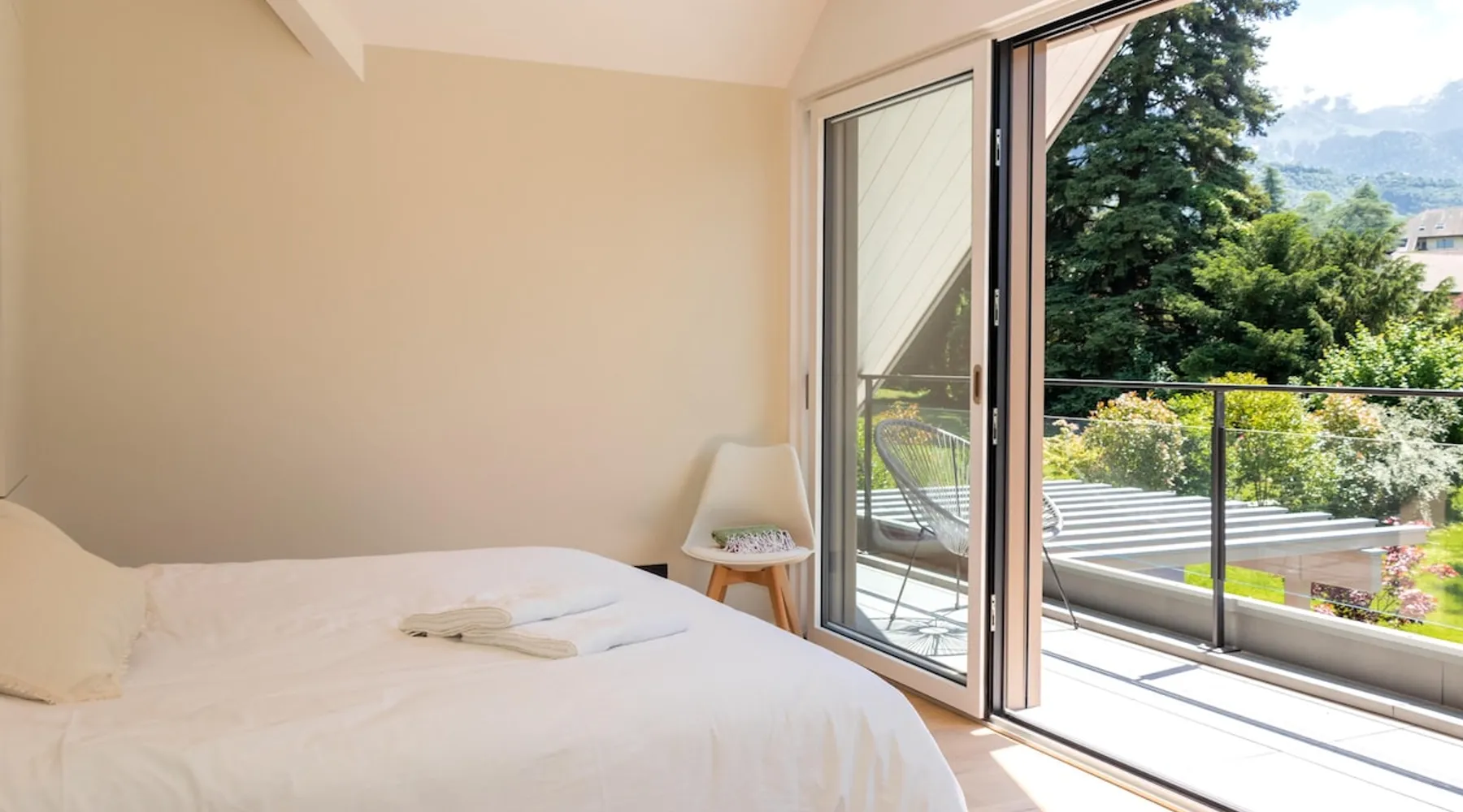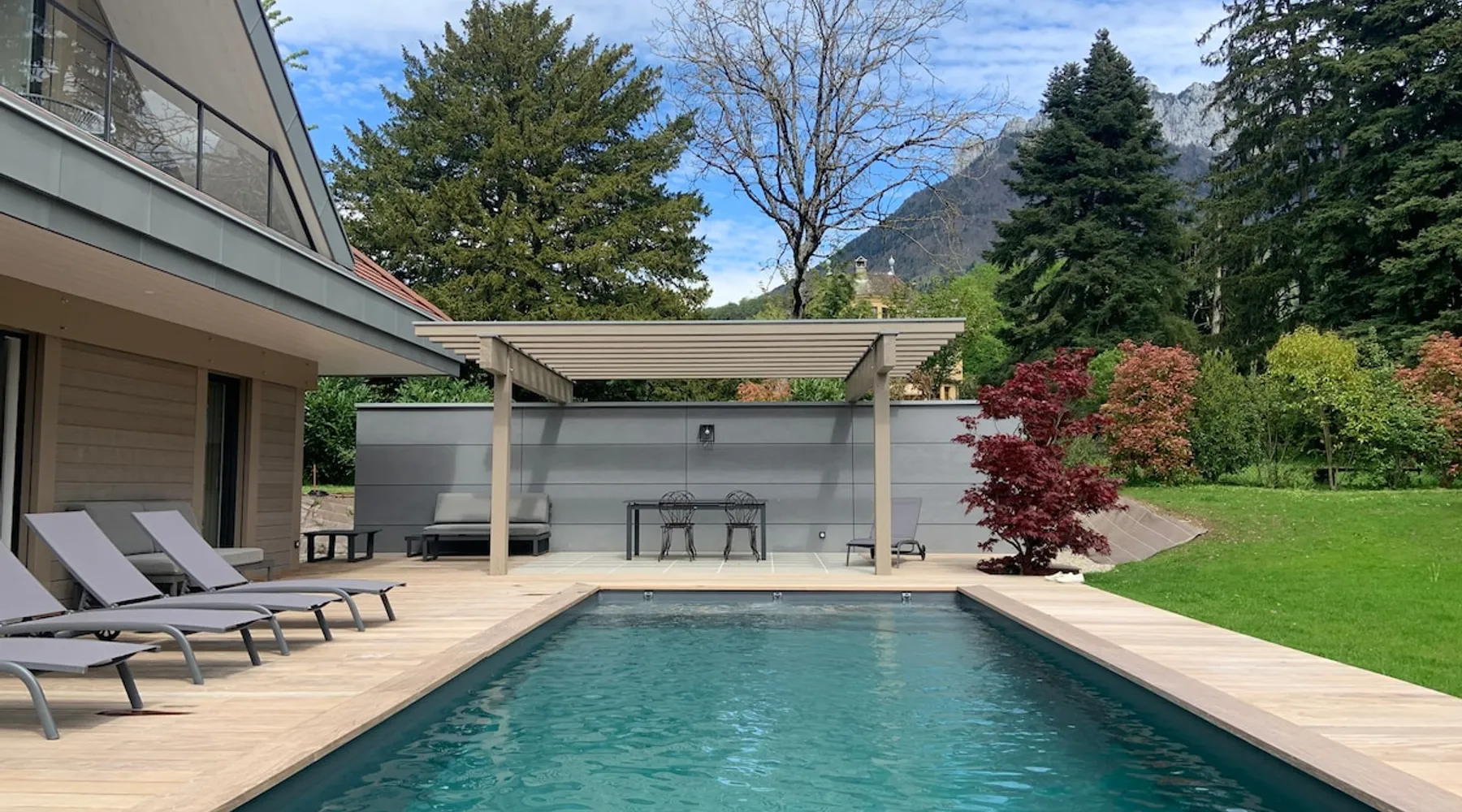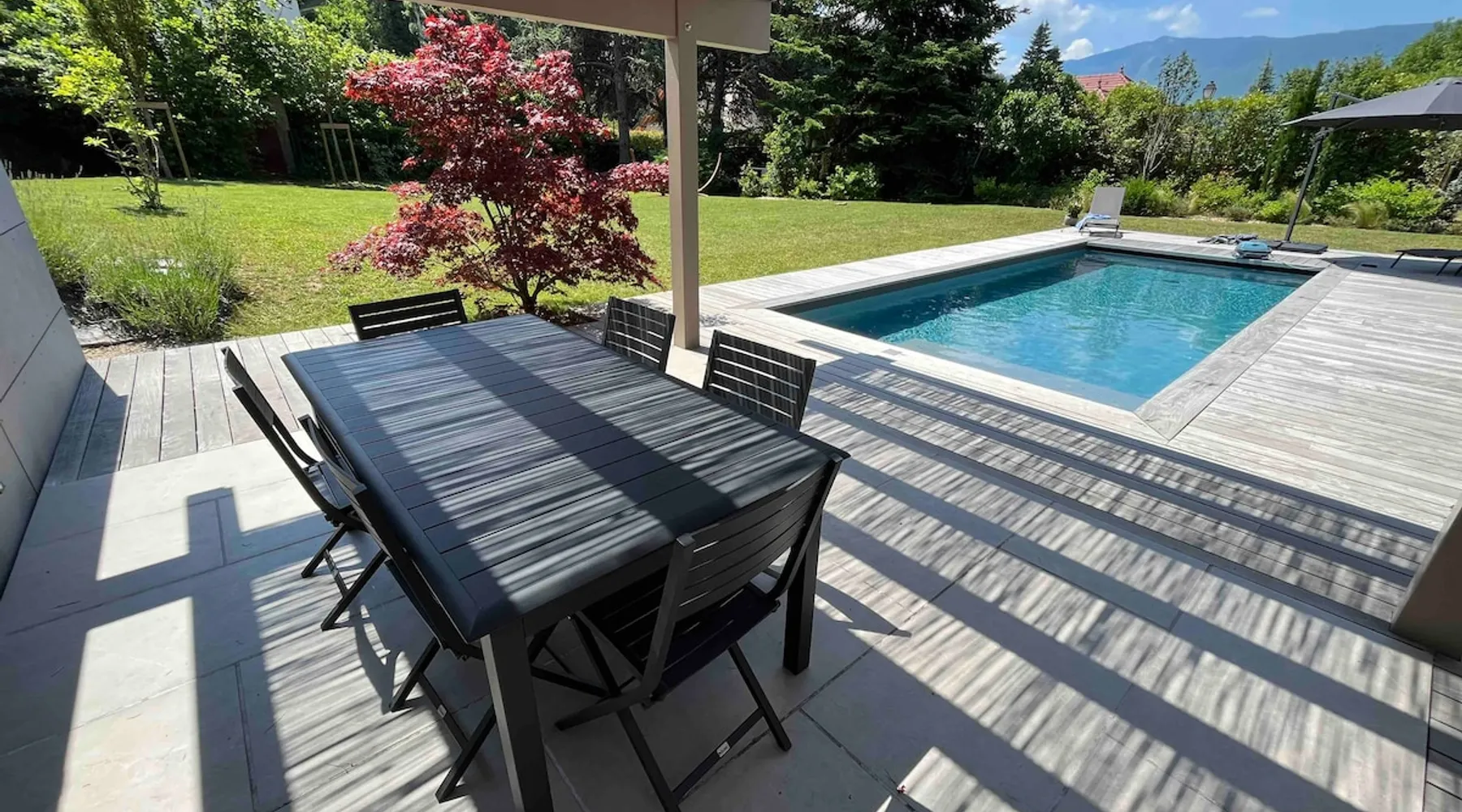 New contemporary luxury villa, exceptional services, with swimming pool, enclosed and wooded garden, 300 meters from Lake Annecy, and 30 minutes from the ski resorts of La Clusaz and Le Grand-Bornand. At the foot of the Roc de Chère nature reserve, 300 meters walk from the village and its shops. Ideally located, quiet, mountain and garden views. The space A villa between lake and mountain, in a privileged environment, a stone's throw from the lake and the heart of the village, at the foot of the Roc de Chère nature reserve. Hiking, skiing, water sports, golf nearby, for an unforgettable vacation. Guest access The entire villa, pool (accessible and heated between mid-April and mid-October depending on the weather) and garden are available to the tenants only. Other things to note A rental agreement will be emailed to you and must be returned signed. Registration Details 74176000133JB