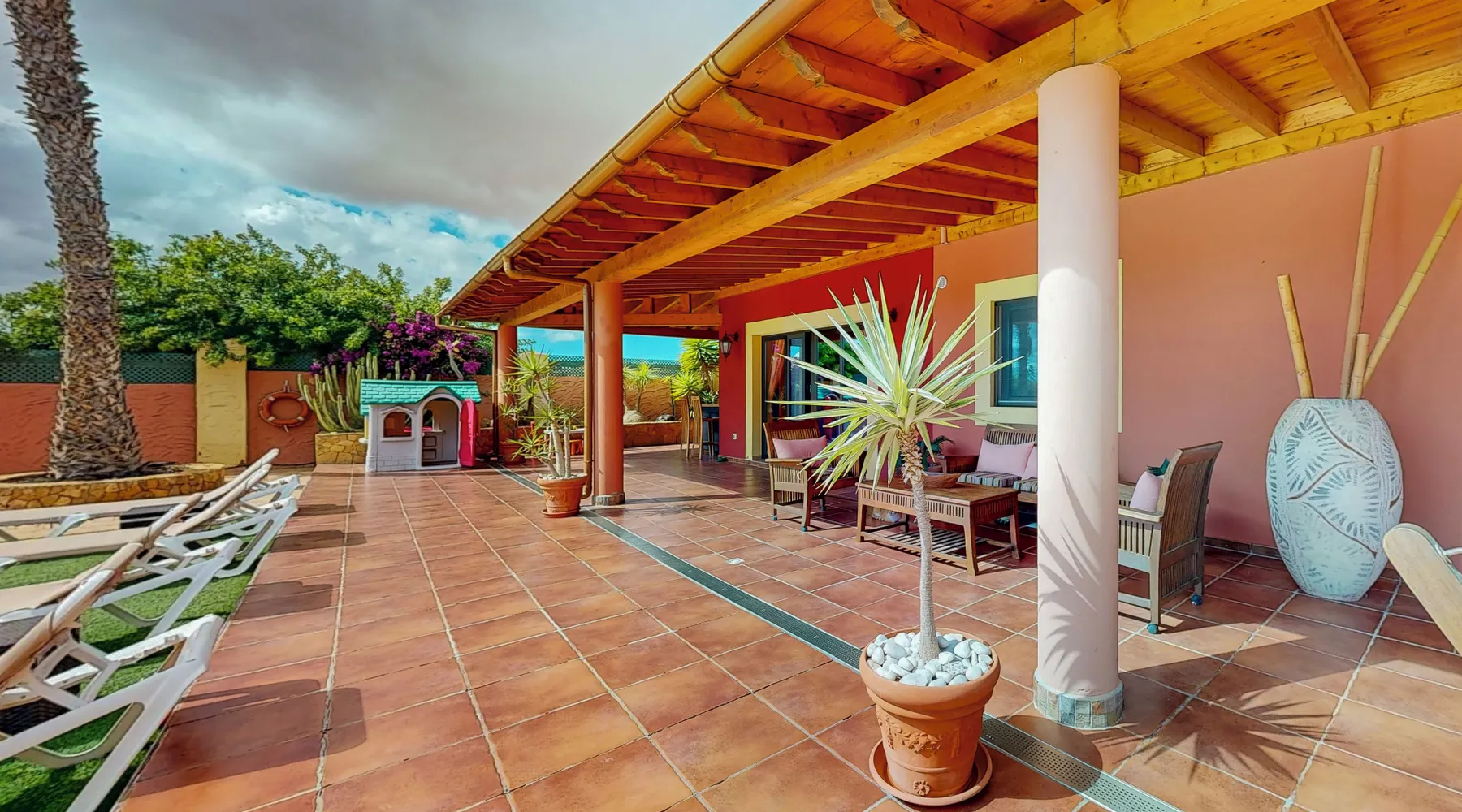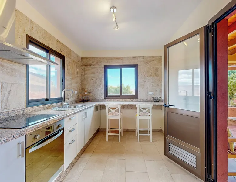 Villa Cora is a delightful Canarian country villa on a large 10,000m2 estate set near the traditional, pictures que village of Triquivijate. It is a charming quiet and peaceful location with perfect panoramic views of the local mountains and is within walking distance of the restaurants, bars and shops in the local village of Triquivijate. The villa is only a short drive from the fabulous sandy beaches and family resort of Caleta. Everything is within easy reach at Villa Cora. This exclusive and stylish rustic villa for 8 people with its beautiful private pool and private tennis court and mountain views is the perfect place for guests looking for relaxation, fun and sports. Private pool - The villa has its own large heart-shaped pool and a separate shallow kitty pool, perfect for small children to play and swim. Both pools can be heated via a pool heater. This is especially true in the winter months when using the pool necessary. The cost of pool heating can be requested from the owner Pool cascade/waterfall feature- There is a large waterfall/cascade feature which transposes a relaxing atmosphere as the water runs down the volcanic crafted stones and into the water in the main pool. Private tennis court Since 2022 the tennis court has been equipped with new subsurface and new artificial turf Due to its international dimensions, it also qualifies for professional tennis play. Tennis rackets that are regularly re-strung and new tennis balls are available to guests Private Children’s Play Area - Small children will have a great time as there is a wonderful play area integrated into the outdoor area. It has two slides, tunnels, etc. A playhouse for children is located in the pool area Main House with apartment (flat) The property consists of the main house with pool area and a fully equipped separate apartment with its own terrace area. This arrangement makes it possible to achieve privacy. From the 7th person onwards, the flat will be booked automatically and there will be no additional costs. The flat is only available for up to 6 guests for an additional charge. You can find out the costs from the owner The villa is ideally suitable for couples and families who want executive standards, all amenities and privacy. Villa Cora offers excellent accommodation for a relaxing holiday.