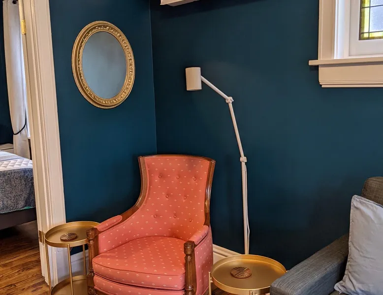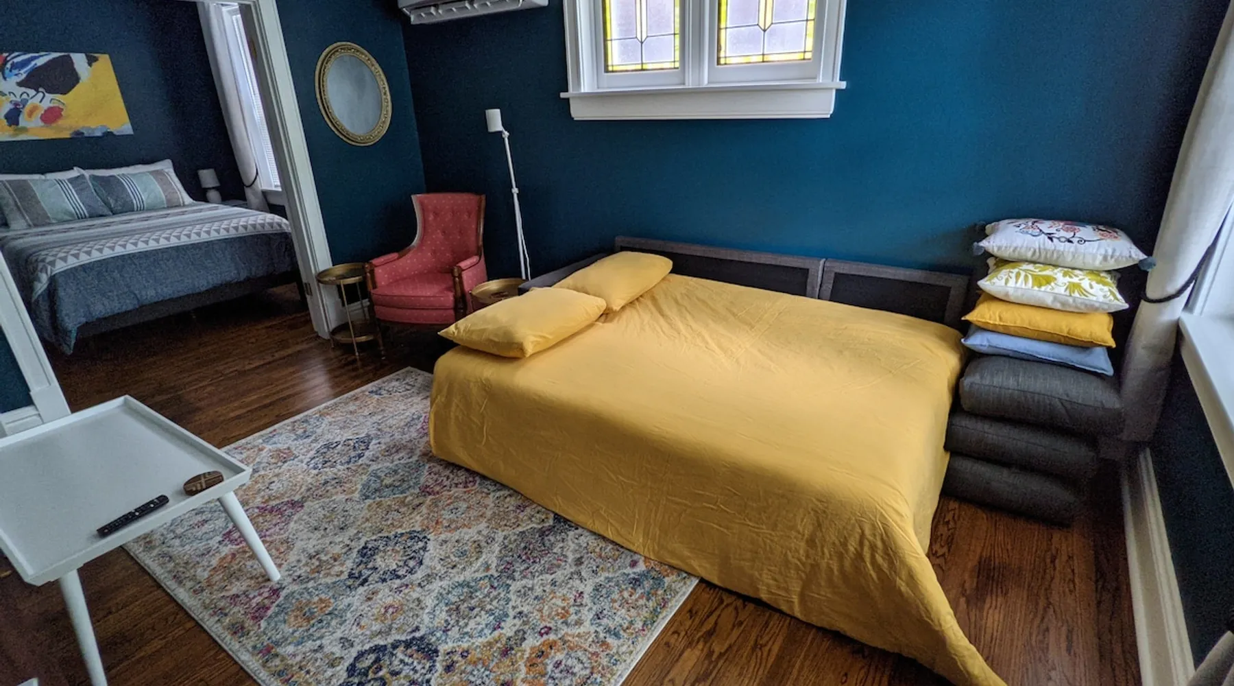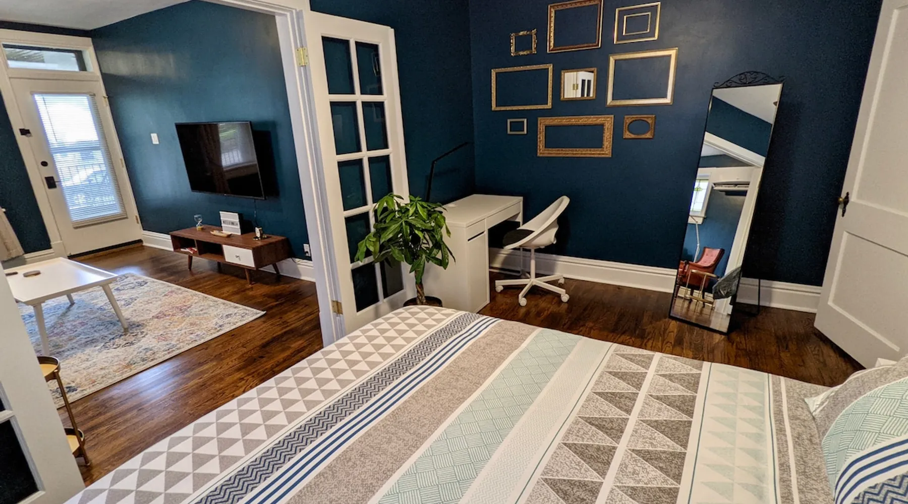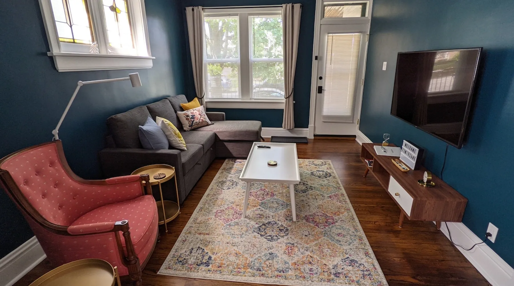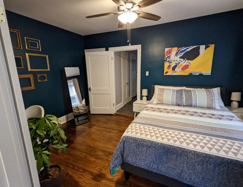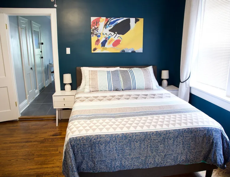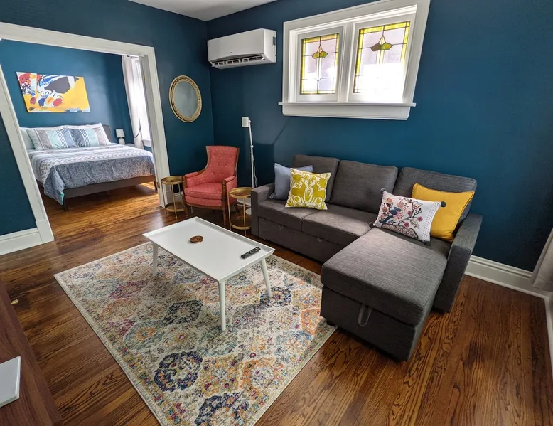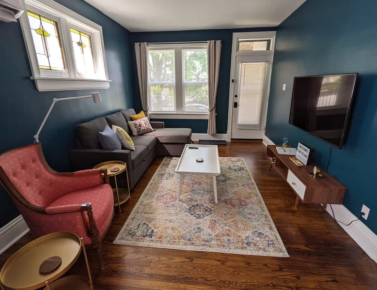 Indulge in a tranquil and chic retreat within this inviting space. We welcome you to our fully furnished apartment in the heart of Saint Louis. Nestled in a secure neighborhood, you'll enjoy both serenity and convenience, as we are only a short 15-minute drive from downtown St. Louis and just 10 minutes away from Forest Park. Perfectly situated to explore the city of St. Louis. The space This beautifully furnished apartment is the perfect home away from home for your next vacation or business trip. With its convenient location, modern amenities, and stylish decor, it offers everything you need to make your stay comfortable and enjoyable. Unwind in the comfort of our thoughtfully designed apartment, featuring a comfortable 12" queen-size cooling memory foam mattress and a convenient pullout couch with premium linens, allowing up to four guests. Rest peacefully and wake up refreshed, ready to take on the day. The modern bathroom boasts a spacious walk-in shower, fluffy towels, and complimentary toiletries for your convenience. The tasteful decor and soothing ambiance provide the perfect atmosphere for relaxation. If work is on your agenda, a dedicated desk is available to accommodate your productivity needs. Our fully equipped kitchen is stocked with all the essential cooking implements, making it easy to prepare meals at your convenience. Start your mornings off right with complimentary coffee and tea, creating the ideal beginning to your day. Escape to your private deck with seating for two. Additionally, we understand the importance of hassle-free parking. While free street parking is available in front of the building, in case it becomes scarce, we have a dedicated parking spot behind the apartment exclusively for our guests. You can rest assured that your vehicle will be safe and easily accessible throughout your stay. Come experience the tranquility and convenience of our apartment, perfectly situated to explore the city of St. Louis. Our prime location puts you within short driving distance of popular attractions, trendy restaurants, vibrant nightlife, and excellent shopping options. Explore the local culture, visit museums, or immerse yourself in the bustling city life. The apartment is just a 5-minute drive from highways 40 and 44, granting easy access to downtown St. Louis and nearby attractions within 10-15 minutes. The neighborhood is walkable with local eateries and coffee shops, while nearby stores include Schnucks supermarket, Target, and others. For city transportation, Uber and Lyft are available. List of Features/Amenities: • Free reliable high-speed internet. • Bed with 12" queen-size cooling memory foam mattress (sleeps 2) • Full-size pullout couch (sleeps 2) • Large 55" flatscreen TV • Desk and comfortable chair for work or study. • Comfortable reading chair with bright floor lamp • Two nightstands with lamps • Full-length mirror • White noise machine for enhanced relaxation. • Ample storage space with three large closets and hangers for clothing • Bathroom with shower, complete with fluffy full-size towels, shampoo, conditioner, and hairdryer. • Iron and ironing board. • Folding luggage rack. • Well-appointed kitchen with dining table and a full set of modern appliances. • Pots and pans, cooking implements, knife set, cookie sheets, and baking pan. • Plates, silverware, mugs, water glasses, wine glasses. • Children’s dinnerware • Highchair • Can and bottle and wine opener. • Coffee maker, French press, coffee grounds, tea, sugar, and creamer. • Salt and pepper as well as olive oil and a selection of spices.