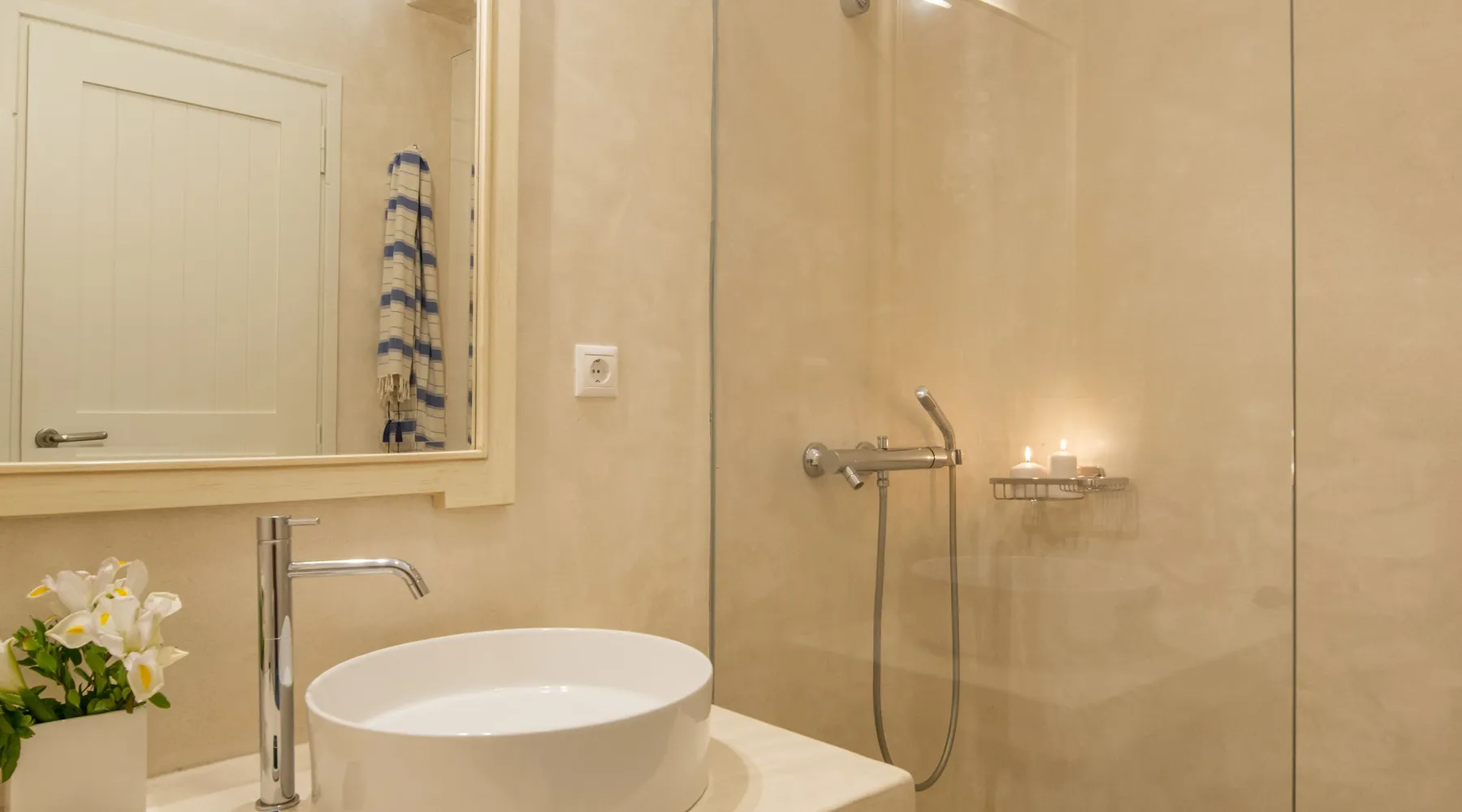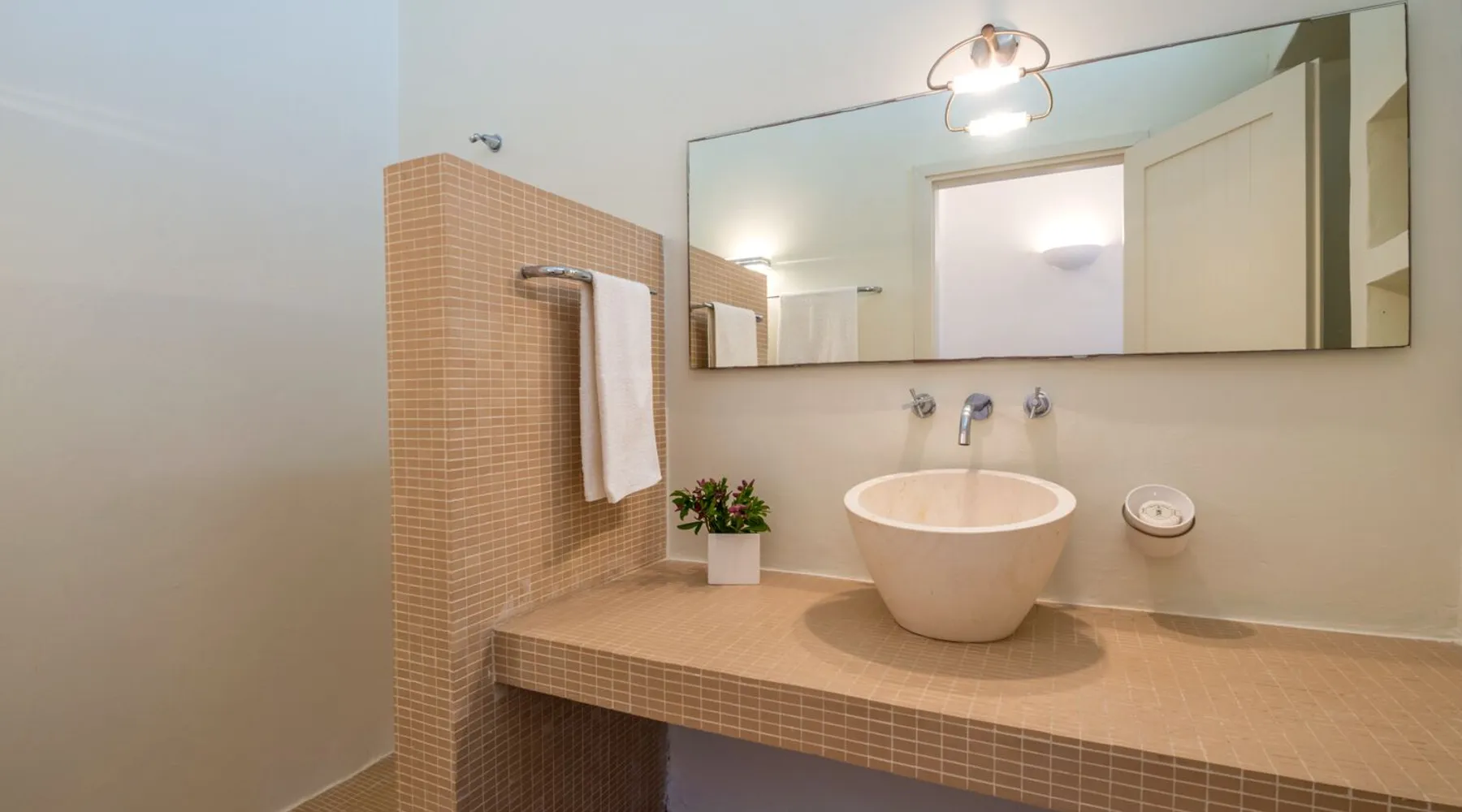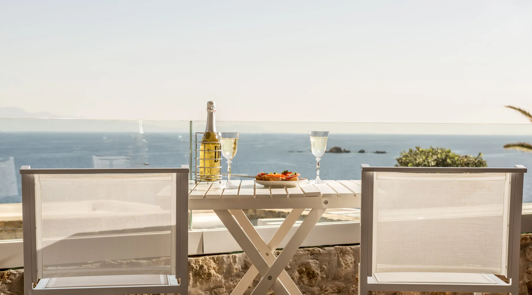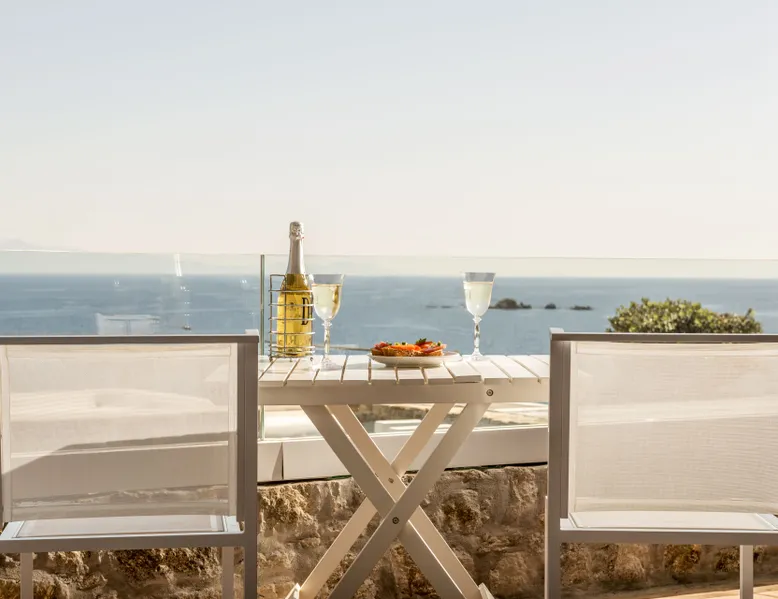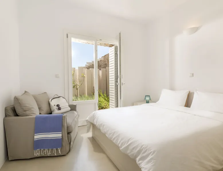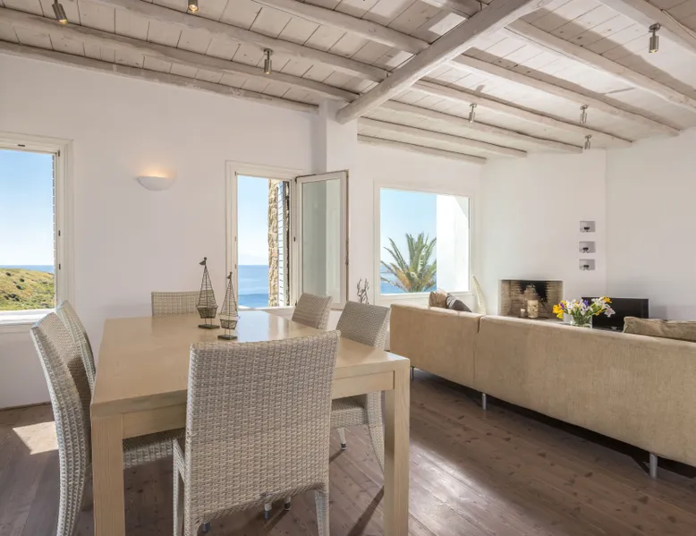 VILLA OSTRACO Villa Ostraco, is located few steps away from the fine and famous beach of Kalo Livadi, overlooking the endless blue of the Aegean Sea. A large shaded terrace with lounge sofas is the highlight of this beautiful house. The interior of the house is developed in two floors. The upper floor has a stylish and comfortable living room with fireplace and a large, fully equipped kitchen with an open and functional dining area. A bathroom with shower is located in the same level. On the lower floor are located three spacious bedrooms and two bathrooms. The master bedroom with ensuite bathroom is on the size of a junior suite. The are two double bedrooms with a shared bathroom at the same level. Villa Ostraco accommodates up to 7 guests. The villa is part of a luxury villa complex, located few steps away from the sandy beach of Loulos. Villa Ostraco could be rent as a complex with villa Island. As a complex the two villas sleep up to 15 guests. Please be aware that a 15€ per night Climate Resilience Tax is applied to all reservations from 1st of March to 30th of October.