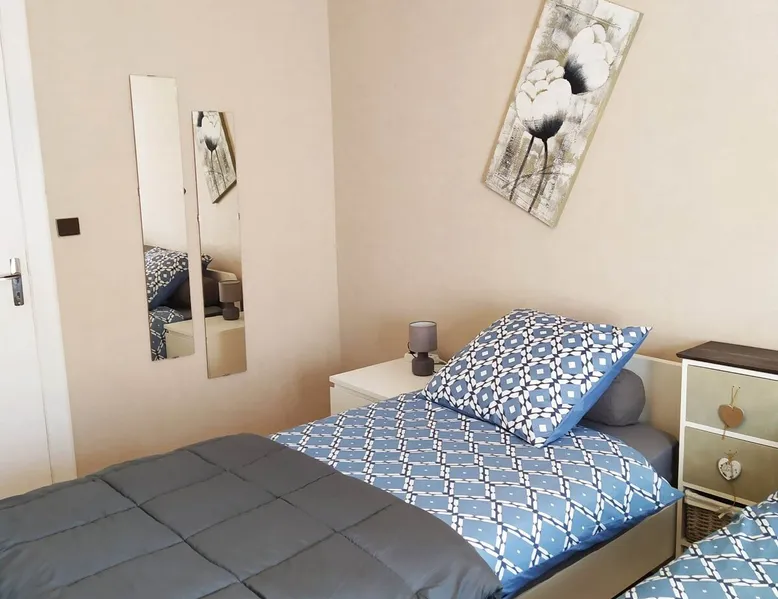 Your room is very spacious adjoining a large equipped kitchen, a small living room with TV and 2 nice comfortable armchairs. There is also a large dining room. Nice, friendly atmosphere. This room is equipped with a TV, Wi-Fi, private shower and sink. The private toilet is outside the room, on the landing. I'm working hard to make your stay enjoyable! The space Raspberry color is the color of the facade of the house which is located on the corner of Longwy Bas and Herserange. The room faces a small quiet street. The entire ground floor is occupied by my therapist's office and my private space. An 18-step staircase will take you to your room which is very spacious and pleasant. You will share a large equipped kitchen and also a large dining room. You will have a small living room with TV and 2 nice comfortable armchairs. This room will be equipped with a TV, Wi-Fi, private shower and sink. The private toilet is outside the bedroom. Nice, friendly atmosphere, free breakfast. I'm working hard to make your stay enjoyable! Guest access 500 m from the 18-hole golf course, 500 m from Longwy train station, 5 km from the Belgian-Luxembourg border, 100 m from the Longwy enamel factory... and 3 km from the ramparts... 100 m from a cycle and pedestrian path... market on Saturday in Longwy-Bas and Thursday in Longwy-Haut... huge Auchan and Leclerc shopping centers and countless shops and restaurants... make Longwy a friendly little town! Other things to note A pharmacy is just across the street from the house, 2 bakeries 100 m away, an Aldi and a Lidl = or - 500 m away. Registration Details 85