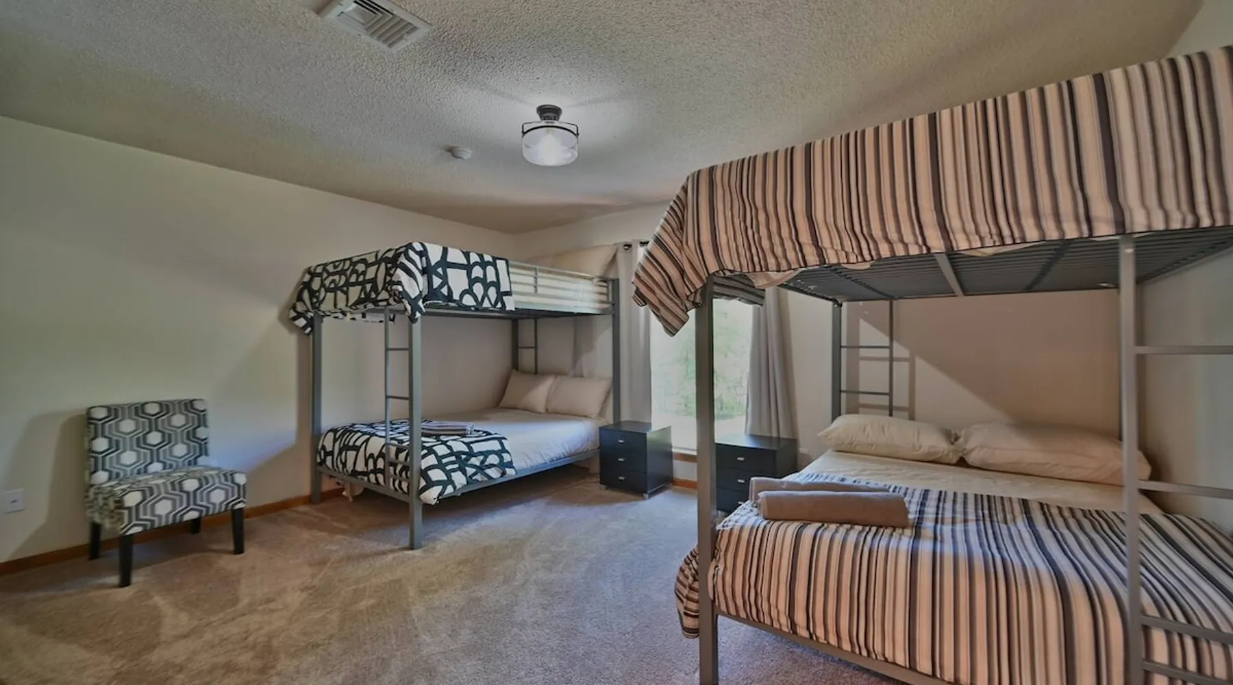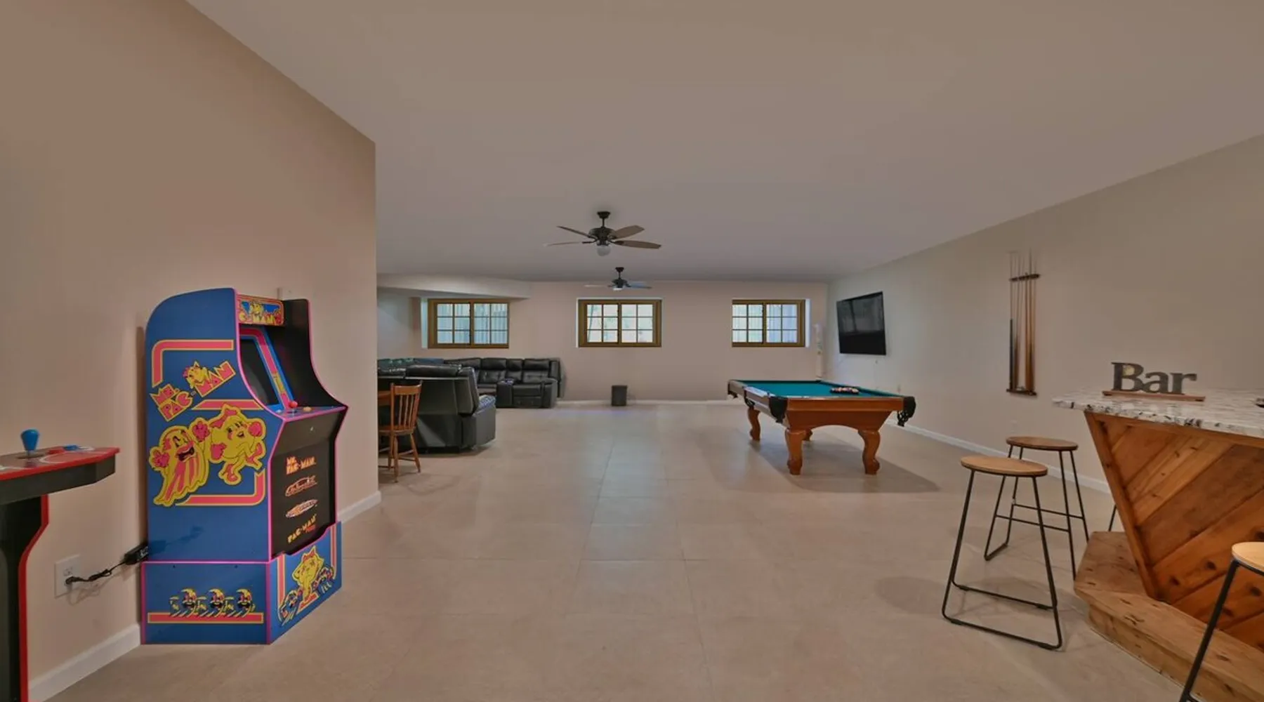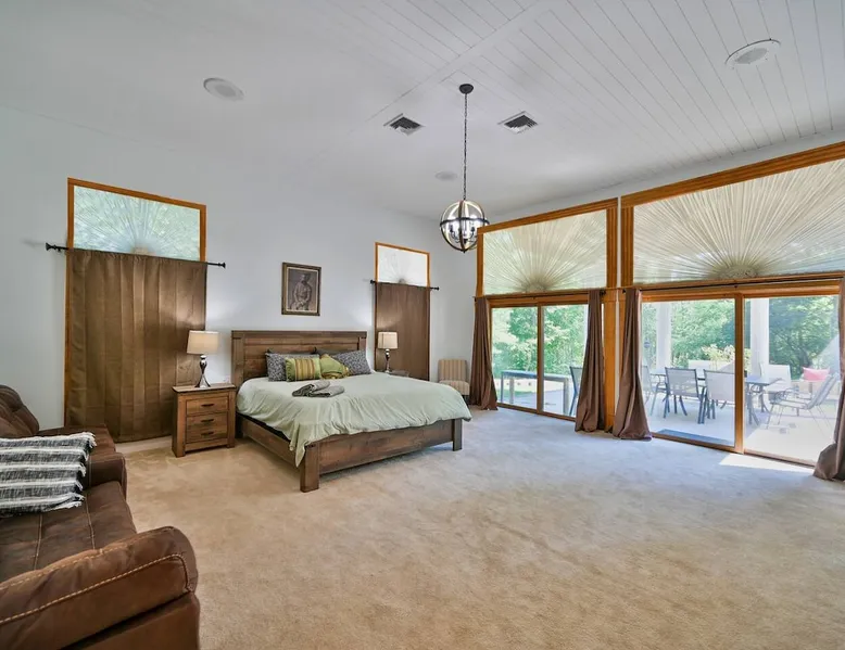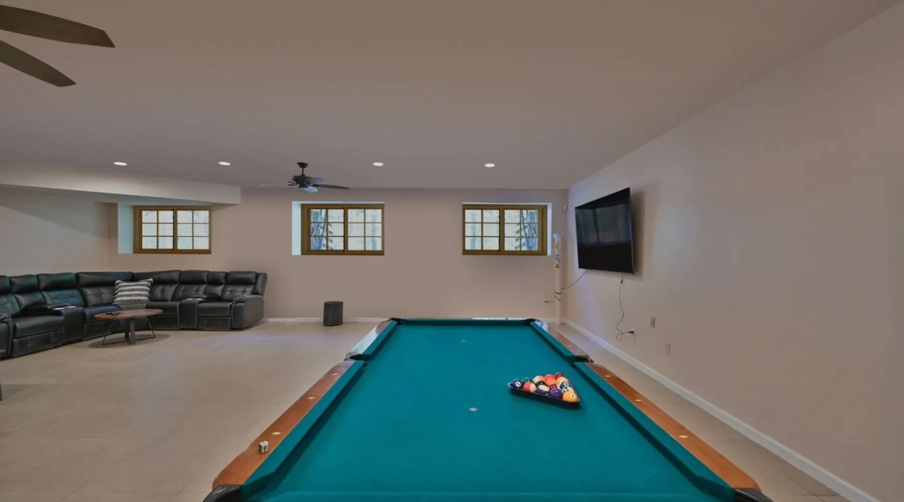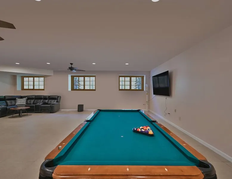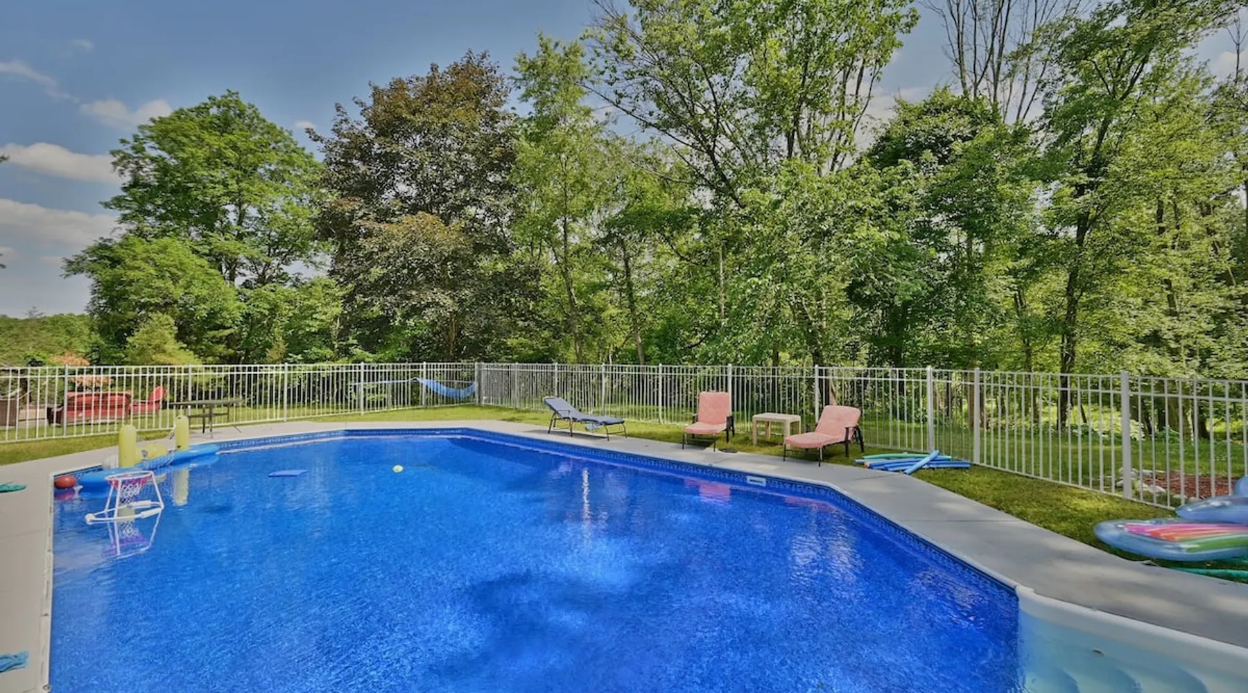 Swimming pool is open from May 10th to October 13 Experience the abundance of this 8 bedroom, 5 full and 2 half bathroom villa that is 8700 SQF in the tranquil area of Poconos Mountains. This villa offers a cozy, entertaining, and family-friendly getaway close to the various sights, activities, and famous spots of the Poconos Mountains. A private outdoor pool, hot tub, gym, sauna, and many more amenities exist. This villa has just been refurbished with new furniture, cozy beds & bedding The space As soon as you step foot in the luxury three-floor pool villa, you're welcomed by a very stylish yet highly comfortable open-plan living area. It is designed and decorated in an elegant manner that compliments the breathtaking vacation setting of the Poconos Mountains! The fully equipped kitchen and its adjacent dining area open onto the entertaining living room, setting the tone for many memorable evenings. Plenty of natural light coming through the large windows and glass doors makes the whole villa very bright during the entire day. Retreat to eight comfortable bedrooms, which feature 5☆-resort comforts that allow you to rest after an exciting day of adventuring throughout the region. But wait! The best is yet to come! Step outside to the private pool area equipped with luxury amenities for ultimate relaxation or come down to the spacious game room and enjoy hours of endless fun. ✔ 8 Comfortable Bedrooms ✔ Open Design Living ✔ Fully Equipped Kitchen ✔ Swimming Pool ✔ Backyard (Seating, Fire Pit, BBQ) ✔ Game Room ✔ Sauna ✔ Gym ✔ Smart TVs ✔ High-Speed Wi-Fi ✔ Free Parking ★ LIVING ROOM ★ It immediately feels like home, with comfy sofas, a coffee table for snacks and drinks, and a smart TV. ✔ Three Comfortable Leather Sofas with Pillows ✔ Smart TV ✔ Coffee Table ✔ Comfy Sofa Chair ★ KITCHEN & DINING ★ It is fully equipped with state-of-the-art cooking appliances that make it suitable for preparing any meal, whether it is a simple breakfast, quick snack, or a three-course gourmet dinner. Spacious granite countertops and a vast kitchen island provide plenty of room for you to work your MasterChef magic. ✔ Microwave ✔ Stove ✔ Oven ✔ Refrigerator/Freezer ✔ Dishwasher ✔ Coffee Maker ✔ Toaster ✔ Blender ✔ Sink - Hot & Cold Water ✔ Trays ✔ Glasses ✔ Silverware ✔ Pots & Pans The dining area is perfectly nestled by the backyard entrance allowing you to gaze at the gorgeous natural surroundings while having delicious homemade meals. Another ✔ Custom Wood Slab Dining Table with Seating for 16 ★ SLEEPING ARRANGEMENTS – 8 BEDROOMS ★ After an exciting day of adventuring throughout the Pocono Mountains, you will be looking to rest for an equally entertaining tomorrow. Once you are ready to relax, please make your way to these comfortable bedrooms. ♛ Master Bedroom 1 - King-Size Bed + Sofa Bed ♛ Master Bedroom 2 - King-Size Bed + Crib ♛ Bedroom 3 - Queen-Size Bed + Bunk Bed (Twin over Twin) ♛ Bedroom 4 - Two Bunks Beds (Double over Double) ♛ Bedroom 5 - Queen-Size Bed ♛ Bedroom 6 - Bunk Bed (Double over Double) ♛ Bedroom 7 - Bunk Bed (Twin over Twin) ♛ Bedroom 8 - Queen-Size Bed Each bedroom is equipped with a similar set of amenities. ✔ Smart TV (only in Master Bedrooms) ✔ Pillows, Linens, and Sheets ✔ Closet with Hangers and Shelves ✔ Cabinet with Spacious Drawers ✔ Night Stands with Reading Lights ★ BATHROOMS ★ A total of seven full bathrooms can be found within the villa. All are stocked with fresh towels and essential toiletries, so you don't have to worry about bringing your own. ✔ Bath with a Shower ✔ Shower Cabin ✔ Vanity ✔ Mirror ✔ Toilet ✔ Towels ✔ Hair Dryer ✔ Essential Toiletries ★ GAME ROOM ★ Enjoy playing with your family and friends in the fully furnished basement floor used as a game room. We have prepared an abundance of entertaining activities that will make you lose track of time. The large comfortable sofa and the smart TV are perfect for unforgettable family movie nights! ✔ Pool Table ✔ Ping-Pong Table ✔ Arcade Machines ✔ Bar Area ✔ Smart TV ✔ Large U-Shaped Leather Sofa ★ BACKYARD + POOL AREA ★ Soak up the sun in complete privacy, surrounded by many entertaining and comfortable amenities for children and adults. Besides the luxurious pool area, you can enjoy the serenity of the lush green surroundings. ✔ Swimming Pool ✔ Fire Pit ✔ BBQ Grill ✔ Sun Lounges ✔ Covered Seating Area with Table and Chairs Guest access The entire villa is exclusively yours, without interruption for the duration of your stay, so relax, unwind, and make yourself at home. Other than the already mentioned amenities, the house also features: ✔ Sauna ✔ Gym ✔ High-Speed Wi-Fi ✔ Air Conditioning ✔ Heating ✔ Washer+ Dryer ✔ Free Parking