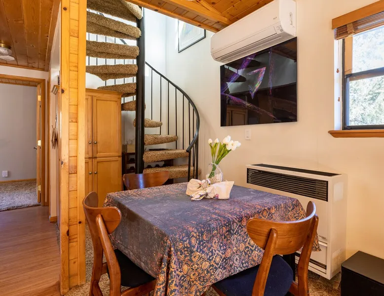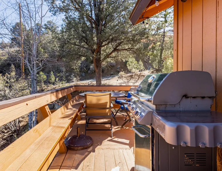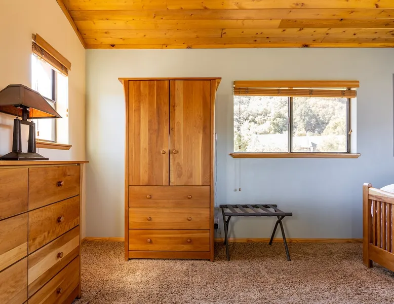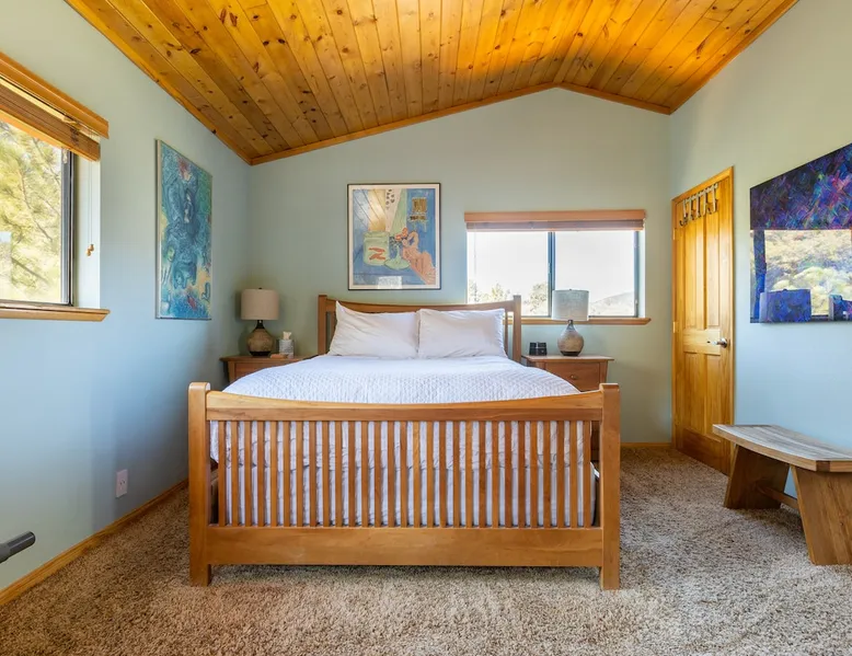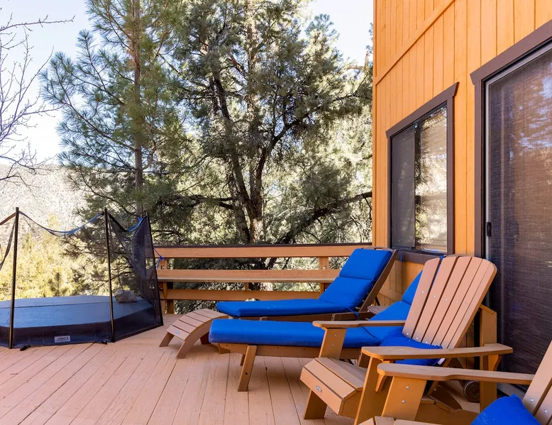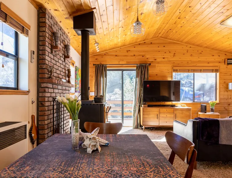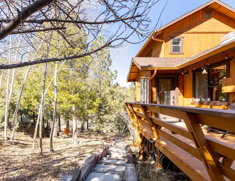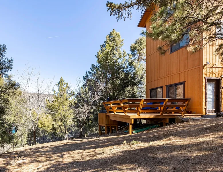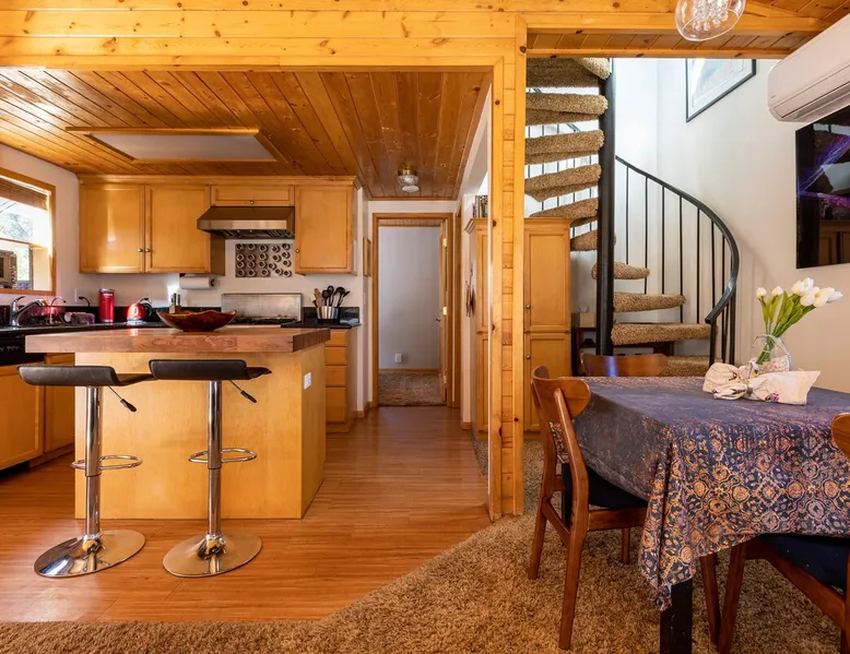 Our cabin is all about relaxation and reconnecting with nature. Breathe in the fresh forest air and enjoy the peaceful atmosphere that Pine Mountain Club offers. There are also many opportunities for new adventures golfing, hiking trails, exploring waterfalls and fishing on a lake. Public pool and hot tub with seasonal use. Our modern mountain cabin sleeps 4 and has a cozy woodstove with 2 sunny decks with mountain views. Wifi and bbq, gourmet kitchen. The space Cozy yet modern mountain cabin in the Los Padres National Forest just 45 minutes from Bakersfield and 75 minutes from the San Fernando Valley. Pine Mountain is one of Southern California's best-kept secrets--a small alpine village with a four-season climate. We have light snow in the Winter, spectacular wildflowers in Spring, and gorgeous Fall colors. It's a wonderful getaway—and yet so close! Our two-story home is located on a quiet street at 5771 feet. Lovely pine ceilings throughout the cabin contribute to the warm ambience. The 1000 sq. ft. interior is furnished in a modern style with a leather sofa and some cool abstract art on the walls. The living room has a wood stove and 50" smart HDTV with direct satellite & Blu Ray DVD. A skylight in the living room brings in lots of light. The master bedroom (queen bed) is separate from the downstairs and reached via a spiral staircase leading up to French doors. The master bathroom adjoins the bedroom and has a skylight over the double length tiled shower. A second bedroom downstairs has a murphy bed with a queen size mattress. There is air conditioning in the living room as well as in the upstairs bedroom and 2 fans are provided-- although generally temps are not above 85 degrees on a hot day and generally drop into the 60's in the evening. Upper and lower decks offer lovely views of Mt. Pinos and the San Emigdio range. Relax on the sunny decks or in the Adirondack chair near the pond surrounded by pine trees. Plan to do some bbqing--it is so pleasant to do some grilling on the upper deck bbq and dine outdoors. Our cabin is clean and well-kept. It can comfortably accommodate 4 people. Please NO smoking or pets! Mt. Pinos has the best view of the stars in So. California—star parties are common whenever there is a new moon. In addition, since we are in the Padres National Forest - wildlife (deer, raccoons, bobcat, fox, bunnies, squirrels, quail, stellar and scrub jays) abounds. Rare California Condor preserve located on Cerro Noroeste Road (main road through town) approximately 15 miles west. We have an extraordinary number of sunny days—it is rare to have a gloomy day. Since SNOW may be present during cooler months be sure to carry chains. Our roads are well-maintained but the CHP is strict about safety when snow is possible. Sledding awaits at Mt. Pinos just 15-20 minutes away, GREAT for cross-country skiing and snow-play destination! The local Village Commercial Center is 2 miles away and offers access to a market, gift shops, and several restaurants. Mount Abel and Mt. Pinos are nearby offering cross country skiing in the winter and hiking in the summer. Catch and release fishing is available at Fern's Lake which is just a mile away. Borrow a fishing pole at the Association office. Or simply relax on the deck and enjoy the fresh mountain air-- you won't want to leave! It is very peaceful to spend a few days here-- and also comfortable. We LOVE being here with time to read, hike, relax.....did I mention slowing down and enjoying life? BREATHE! Guest access The entire cabin and both decks are for your private use. Guest passes allow access to the pool, golf, tennis and other homeowner amenities POOL & HOT TUB ACCESS (SEASONAL) To enter the pool/hot tube area, use the pool gate card and a guest card hanging by the front door. You'll need your I.D. at the pool to pay the small fee. ($5/day/guest). The pool hours allow lap swims from 8 am to 10 am. The pool is closed from 10 am to noon. Open swim is from noon to 7 pm and lap swims from 7 pm to 8 pm. Please obey the rules for the pool. Rinse before entering the pool. There are restrooms, water fountains and a changing room. Please don’t lose the pool and guest cards since we will need them for the next guests. There will be $150 replacement charge per lost card. Other things to note -Verizon is the only cell phone service in Pine Mountain Club. Please save directions and door passcode. - Arrival required by 8PM unless prior approval provided - NO smoking inside the cabin -Not accessibility-friendly: the cabin has a spiral staircase to the master bedroom. The second bedroom is entry level. -Not ideal for young kids because of the design of the spiral staircase. -No pets allowed. -There is no hospital in PMC and the nearest hospital is about an hour away. -This area is at high risk for wildfires. No open fires outside! -Conserve water, please. -BEARS: Important to note that we share this environment with a lot of wildlife. Between March and October you may see California black bears. For the safety of you and the wildlife please do not feed or interact with them. All trash must be taken with you or disposed of at the Transfer Site at 16143 Aleutian Dr, (All the way to the end of the road, past the horses, at the top of the hill). SAFETY ITEMS NO smoking inside. If smoking is detected in the Cabin, there will be a $1000 fine. NO open fires anywhere outside or on the property NO discharging of any firearms or use of launching devices, including BB guns, air pistols, paintball, pellet, and air soft guns, bows, crossbows, slingshots NO parking on streets unless listed as specific exceptions Do NOT feed wildlife DO NOT keep any trash outside NO loud noise or music past 10P PLEASE NOTE: Violations can be cited and fines range from $1000 to $4500. Any Homeowner Association violations during your stay will be paid by the guest.