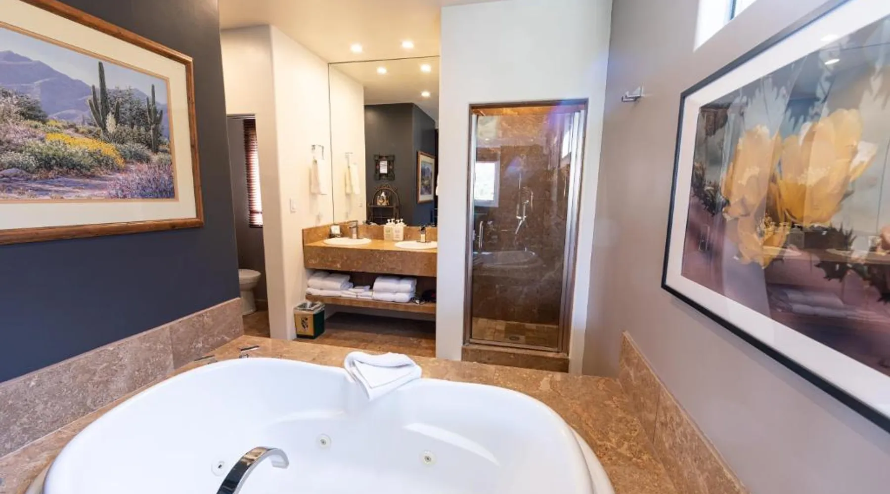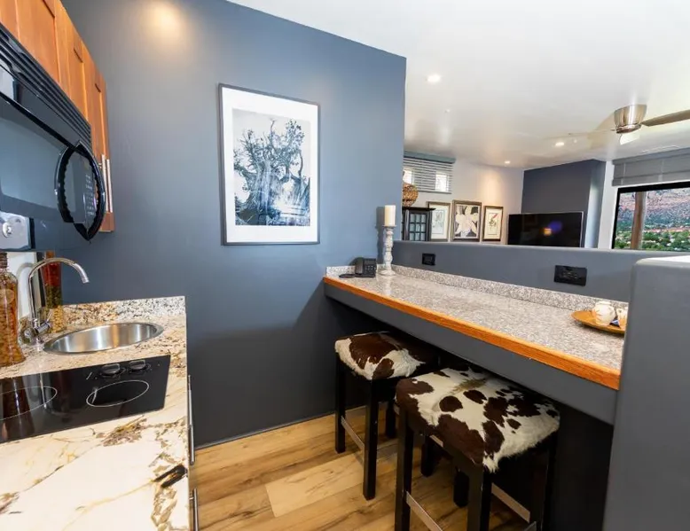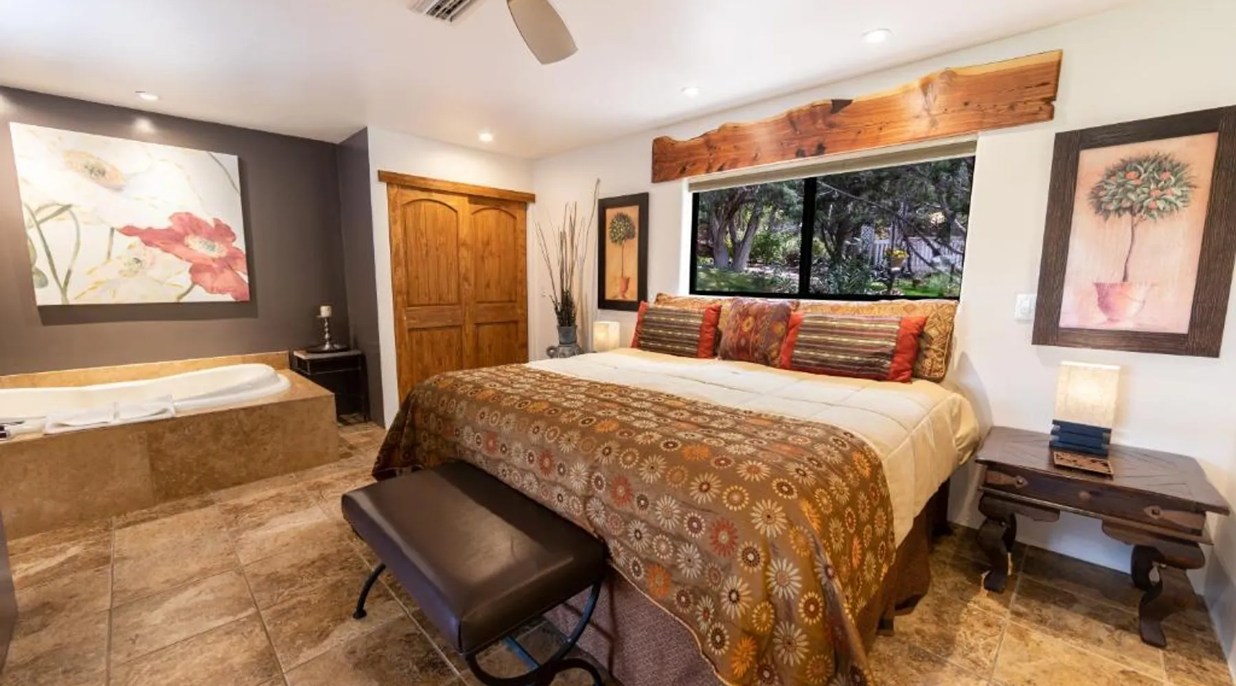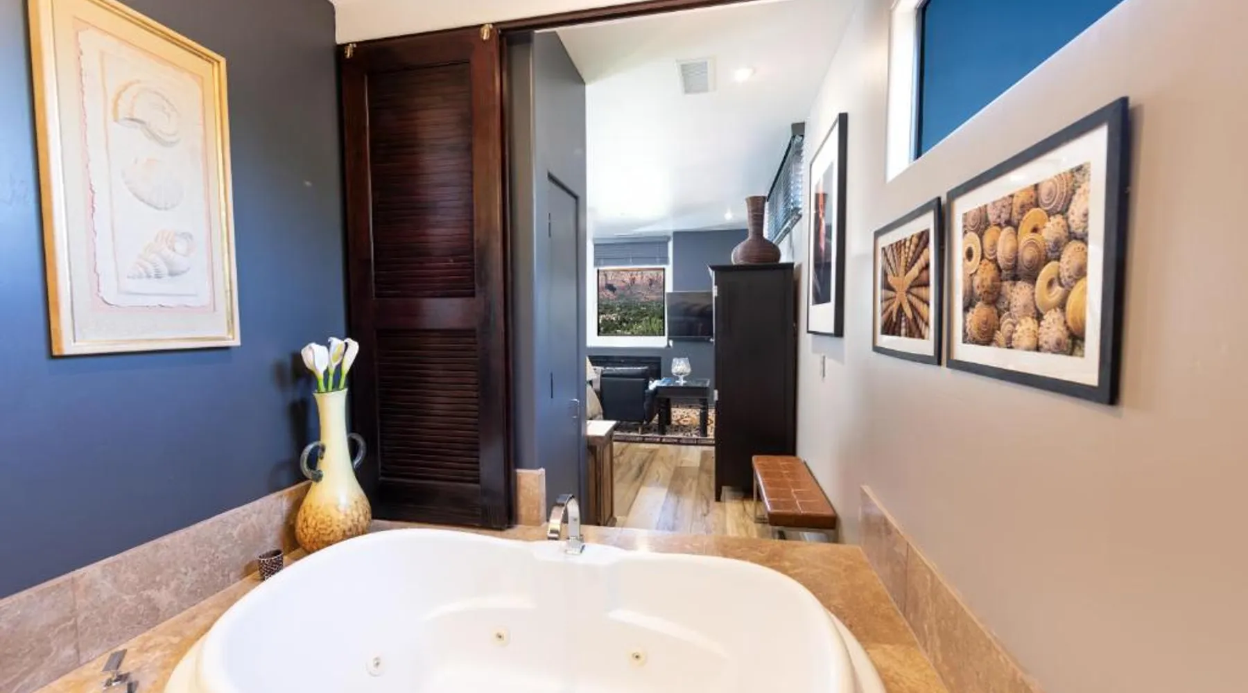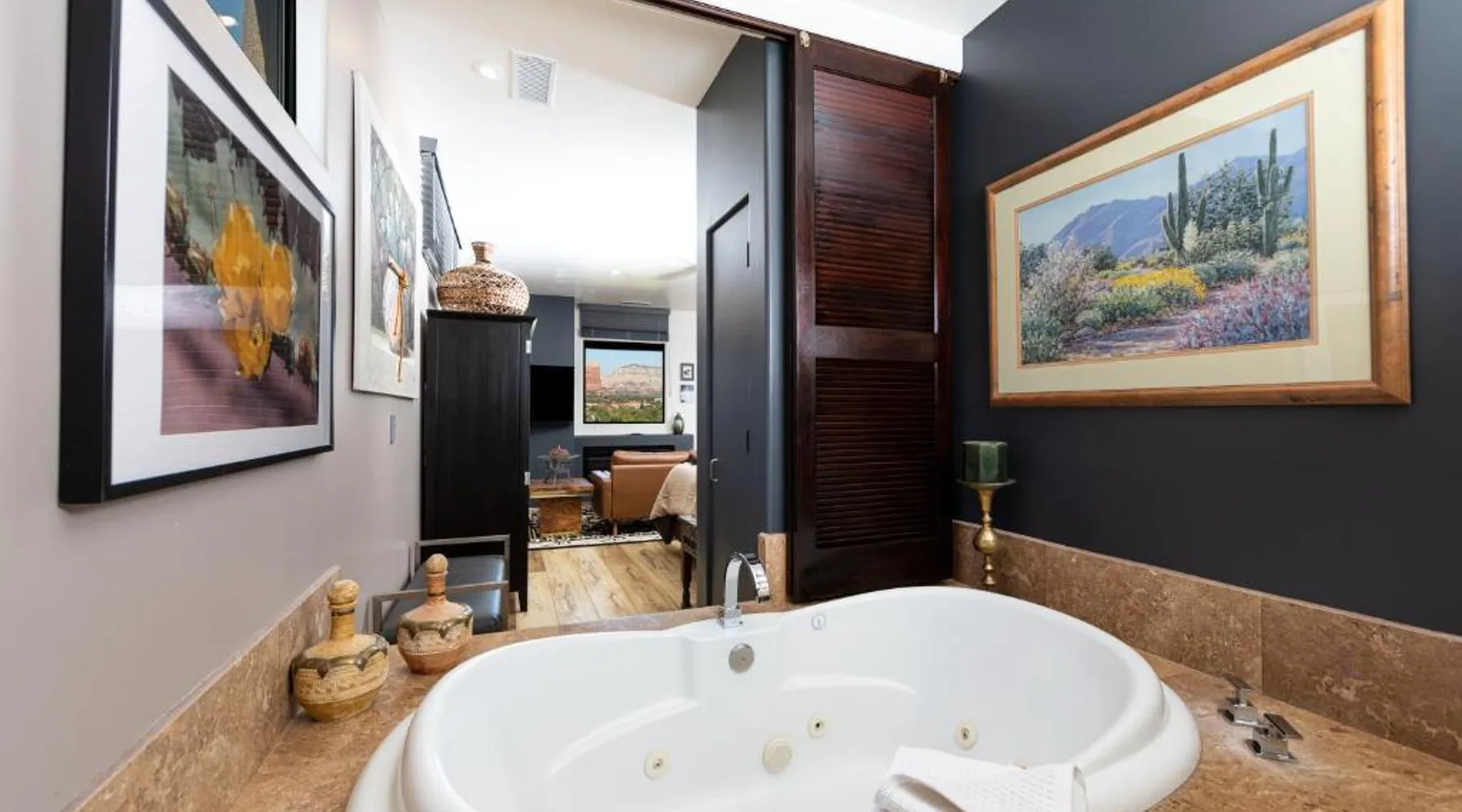 Located in Sedona, Arizona, this bed and breakfast features an outdoor pool and hot tub as well as an on-site tennis court. A full breakfast and free WiFi access are available. A fully equipped kitchenette and a flat-screen cable TV come standard in each room at A Sunset Chateau. Every private, private bathroom features a hairdryer, free toiletries and towels. You can enjoy a mountain view from select rooms. A garden, terrace, and waterfall with pond are available to guests at A Sunset Chateau. Hiking is possible in the nearby area. The property offers free parking. Red Rock Crossing is 5.5 miles away. Guests will be 7 minutes’ drive from the historic city of Tlaquepaque and 15 minutes’ drive from the Chapel of the Holy Cross. Also known as the Vista Montana, this suite features a fully equipped kitchenette, an electric fireplace and as soaking tub.
