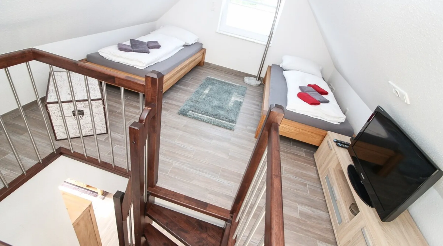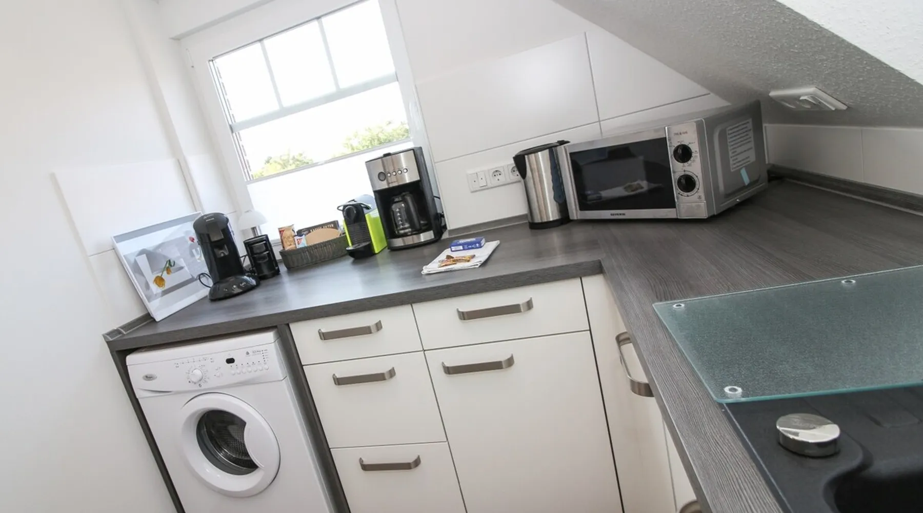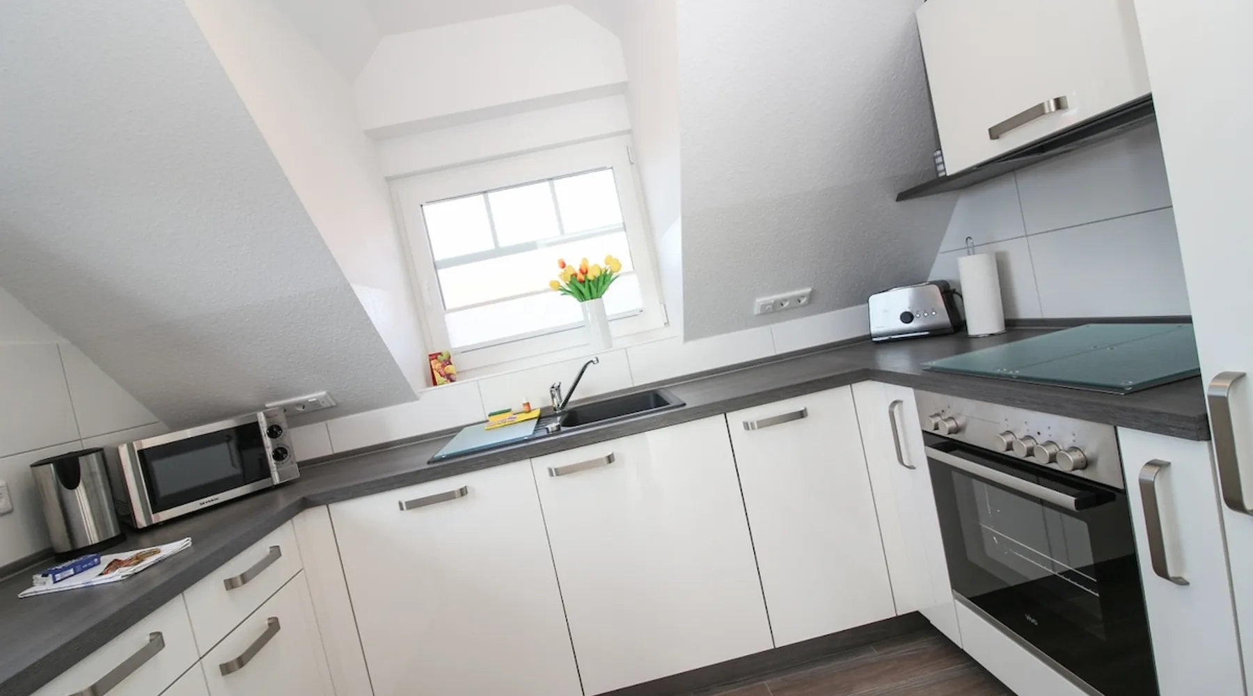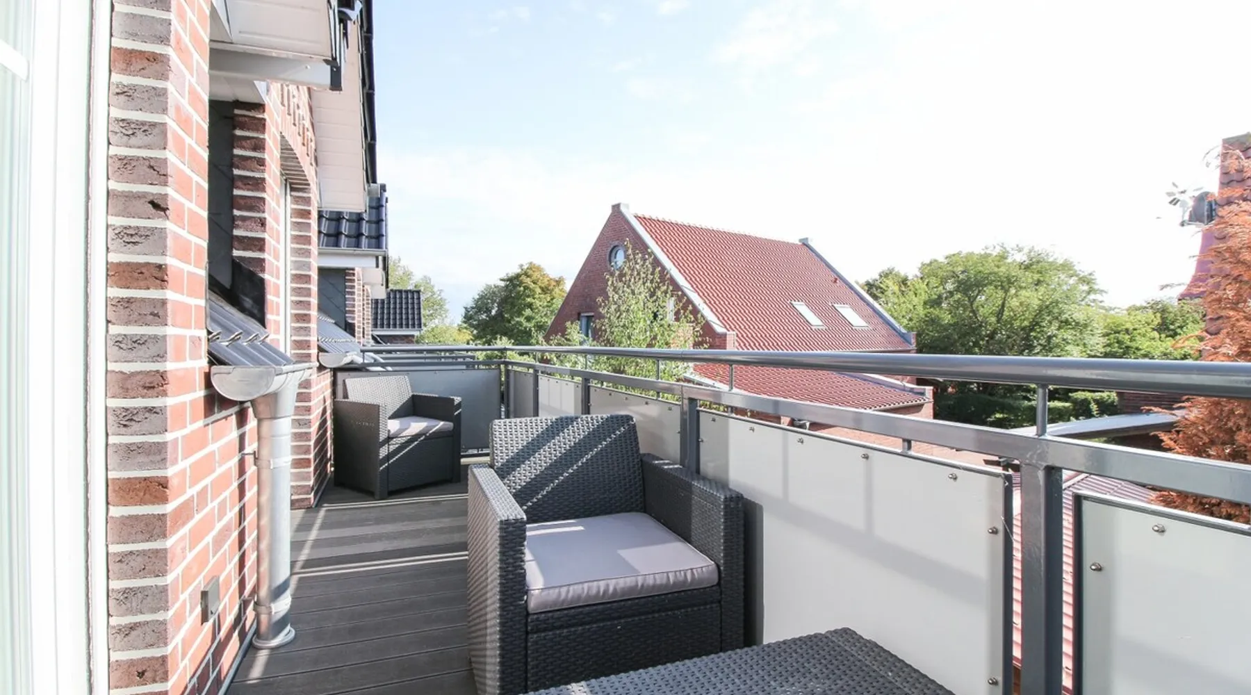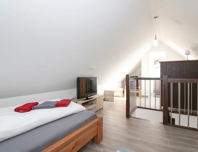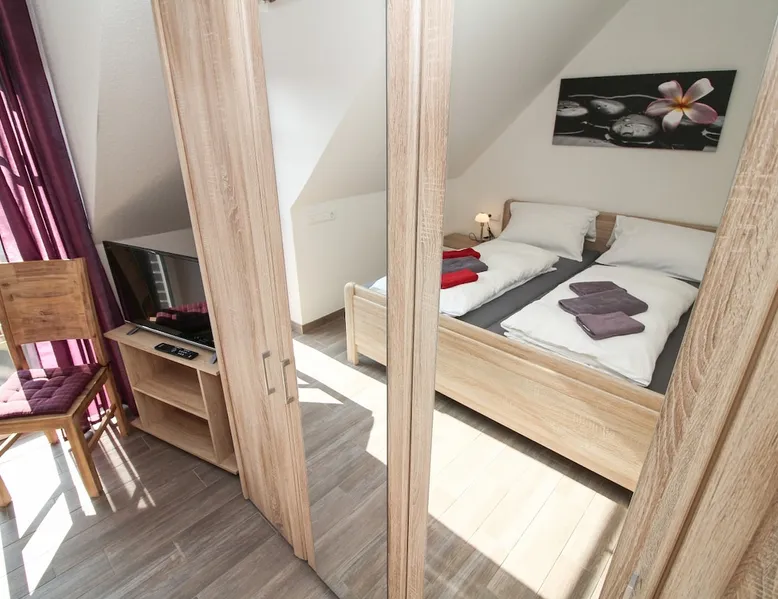 Highly equipped upstairs apartment on two levels for up to 4 people. The space The apartment "Mußestunde" for 4 people is in close proximity to the Greetsieler Zwillingsmühlen and is a few minutes walk from the place and the harbor. It has a living area of approx. 75 sqm. The apartment has a fully equipped, separate kitchen with all electrical appliances (dishwasher, washing machine, etc.), a living/dining area, a bedroom with double bed and a bathroom with walk-in shower. In the attic, there is another twin bedroom (100x200cm each). In addition, there is a second toilet in the attic. There is a TV set in the living room and bedroom. A balcony with garden furniture and a car parking space belong to the apartment. The overall equipment corresponds to high living standards (floor heating, electric shutters, lockable bicycle cabin, etc.). Under this vacation rental is the holiday apartment "Breathause". If necessary, two spatially nearby apartments can be booked. Access to the apartment is via a separate entrance. Dishes and cutlery are also sufficiently available with maximum occupancy. The apartment is located in a massive apartment building (built in 2016). For your safety, smoke detectors are provided.
