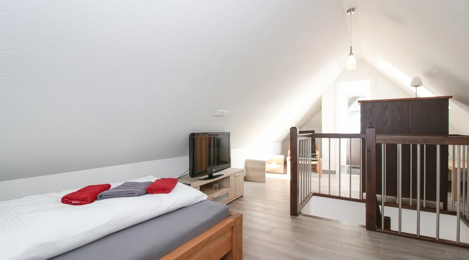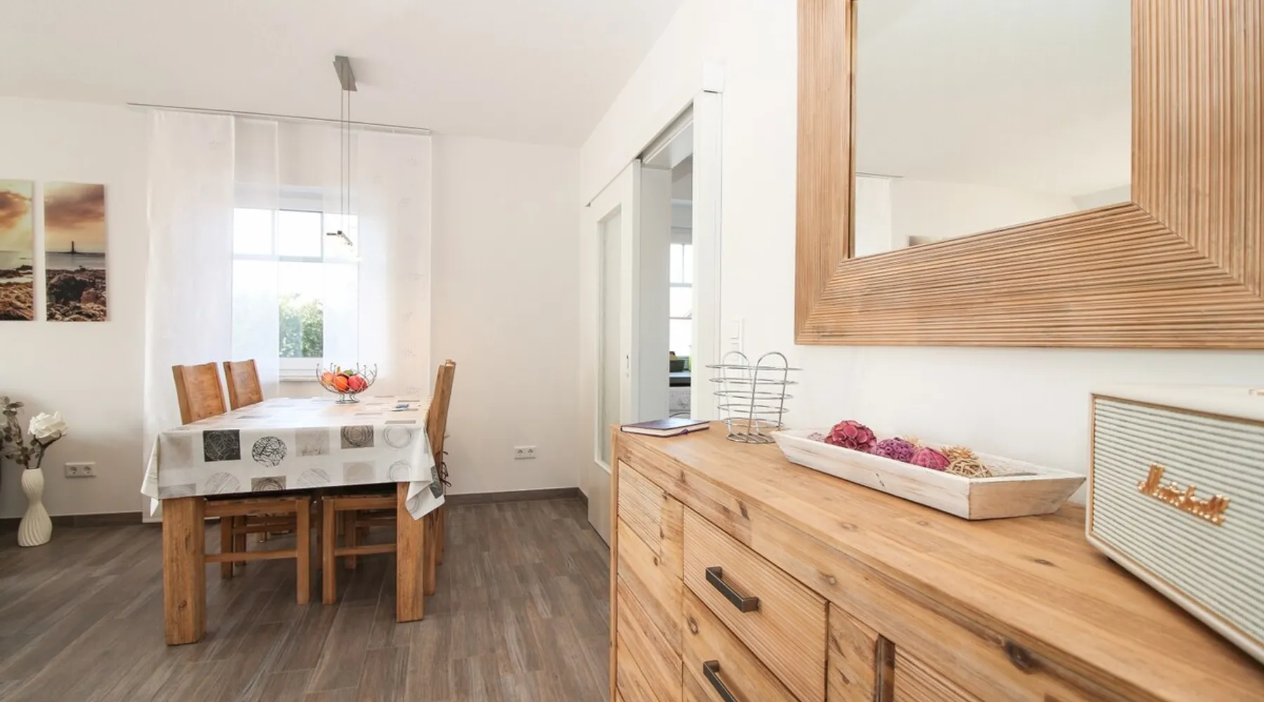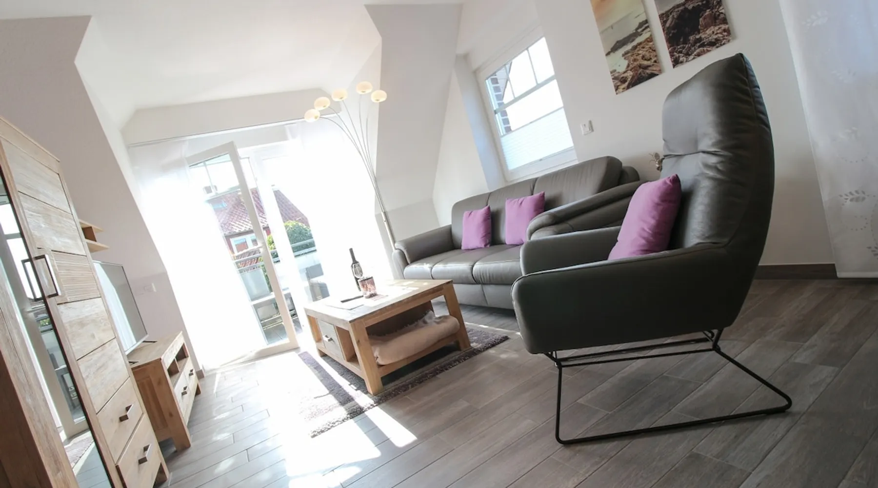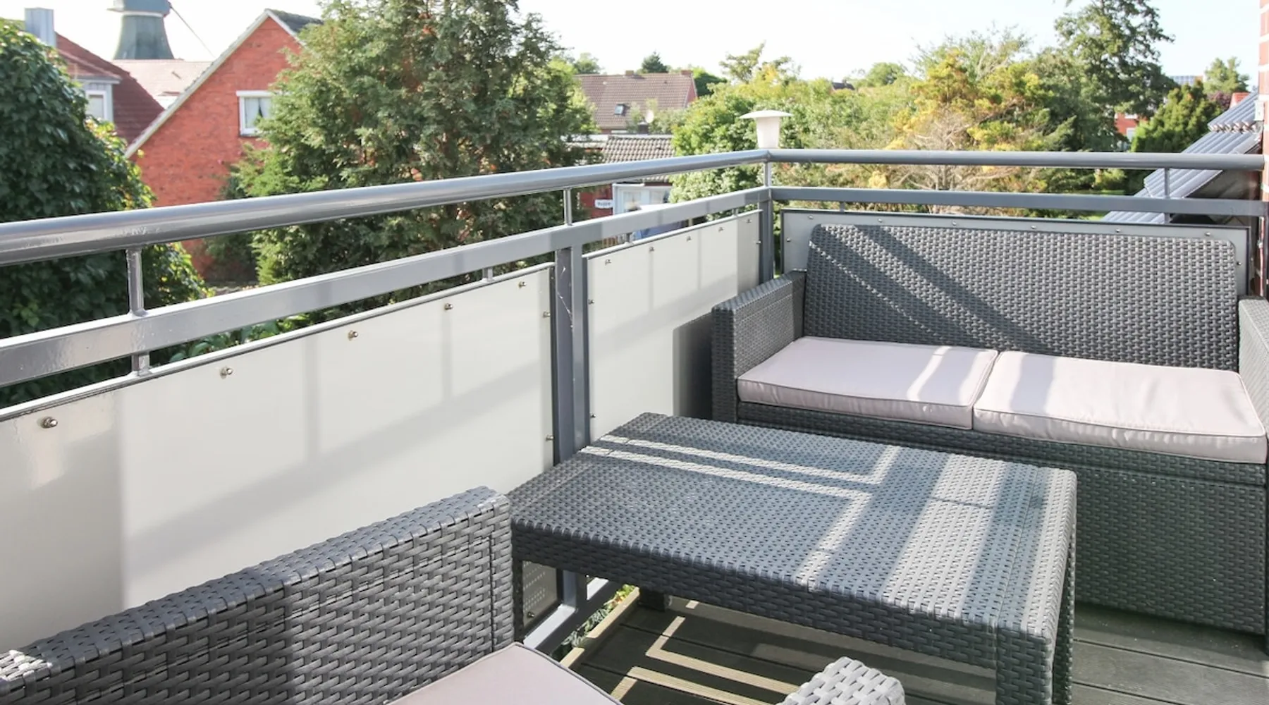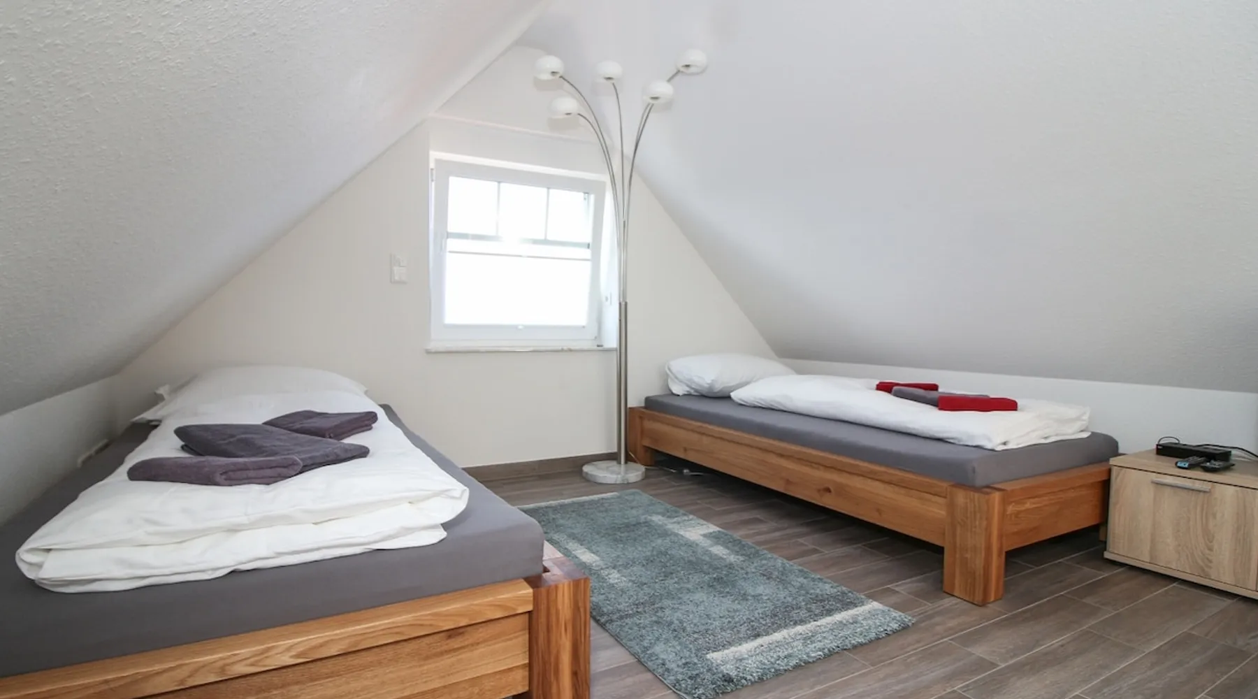 Highly equipped upstairs apartment on two levels for up to 4 people. The space The apartment "Mußestunde" for 4 people is in close proximity to the Greetsieler Zwillingsmühlen and is a few minutes walk from the place and the harbor. It has a living area of approx. 75 sqm. The apartment has a fully equipped, separate kitchen with all electrical appliances (dishwasher, washing machine, etc.), a living/dining area, a bedroom with double bed and a bathroom with walk-in shower. In the attic, there is another twin bedroom (100x200cm each). In addition, there is a second toilet in the attic. There is a TV set in the living room and bedroom. A balcony with garden furniture and a car parking space belong to the apartment. The overall equipment corresponds to high living standards (floor heating, electric shutters, lockable bicycle cabin, etc.). Under this vacation rental is the holiday apartment "Breathause". If necessary, two spatially nearby apartments can be booked. Access to the apartment is via a separate entrance. Dishes and cutlery are also sufficiently available with maximum occupancy. The apartment is located in a massive apartment building (built in 2016). For your safety, smoke detectors are provided.
