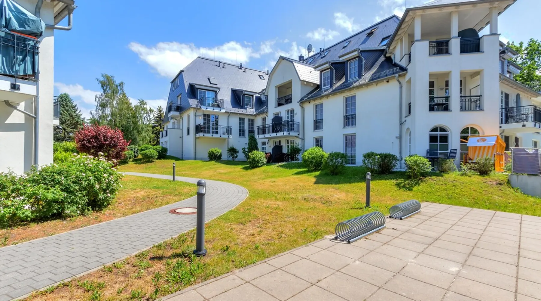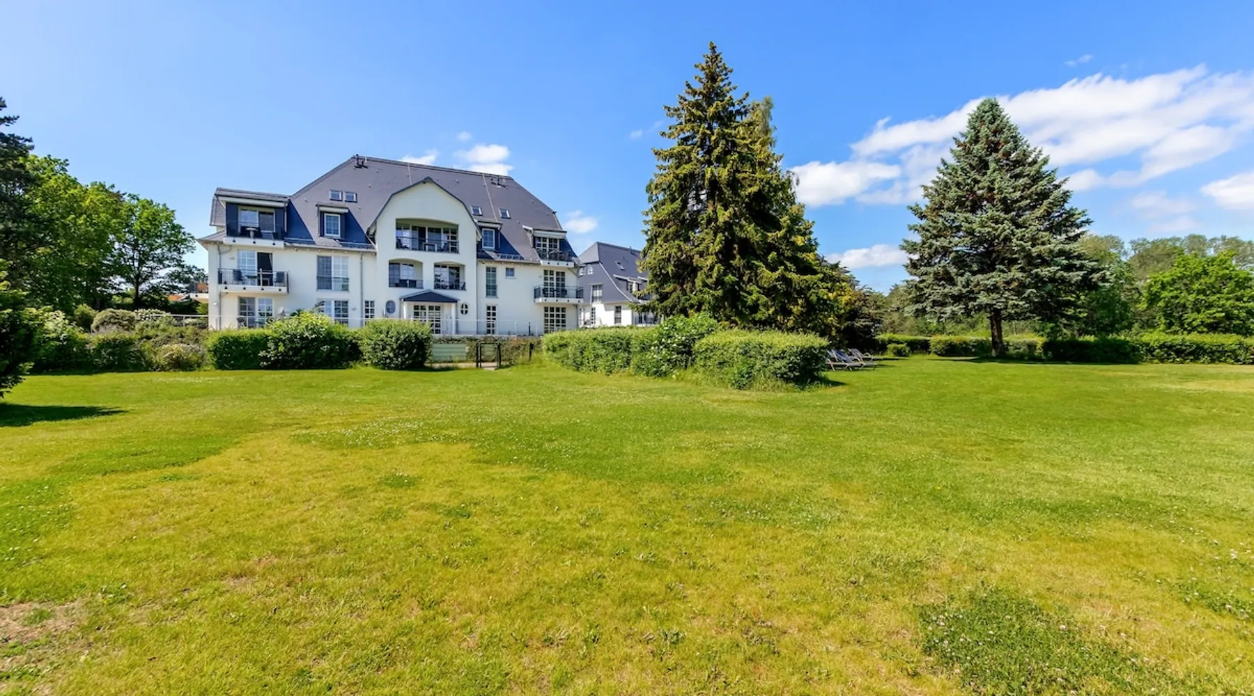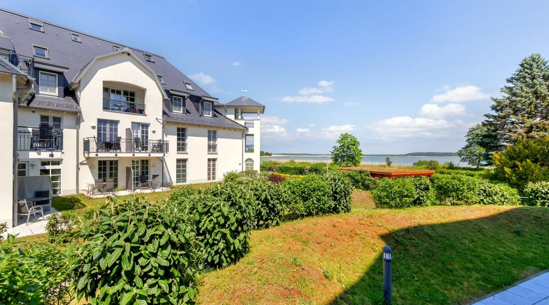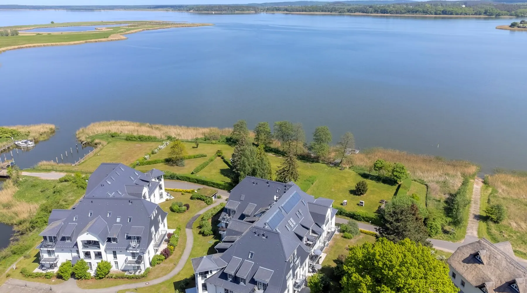 Fewo - BS_ 43 m², 1 bedroom(s), 1 bathroom(s), for 3 guest(s) Additional service charges may have to be paid locally on-site, see house rules and house manual for details. Thank you. The space Beautifully located with 4-DTV stars certified 2-room apartment (43 sqm) on the ground floor with terrace in a sunny south location and lake view as well as direct access to the lawn with bathing dock. In addition to the full bedroom with 2nd TV, the high-quality sofa bed in the living room can accommodate up to 2 more people or 2 children. The built-in kitchen has a dishwasher, microwave with grill, stove with ceramic hobs and hood. The bathroom is equipped with underfloor heating, the storage room offers additional space for golf bags or other bulky items. The apartment has its own underground parking space with direct access within the building. The wellness area with three different saunas, spacious relaxation room and fitness area is also located on the ground floor of the same building, just a few steps away. You are also welcome to use our free, open Wi-Fi access in the house. Please note that there may be fluctuations in the WLAN quality due to the island. The residence at Lake Balmer is a beautifully landscaped holiday complex located directly on the Achterwasser. With its two country-style newly built villas (completion is in spring 2012), they form the perfect synthesis for a relaxing holiday. On the one hand for those who are looking for relaxation and nature away from the hustle and bustle of the imperial baths, on the other hand for the holidaymaker who has discovered a special love in the leisure activities golf, water sports, every kind of cycling, etc., etc. Equipped with a reception, lifts, underground parking, own small laundry rooms with coin-operated equipment, usable areas for golf equipment and a private lawn on the Achterwater with its own jetty and many other additions, this facility leaves little room for open wishes. Golf The golf course Balm, which has existed for more than 10 years in a dreamlike environment and with its 2 x 18 hole and 1 x 9 hole golf courses, is located in the immediate vicinity (about 200m) of the residence. The golf course, which is well-known beyond the borders, is an attraction for all playful demands and wishes. In addition, you will receive a 30% green fee discount for the Baltic Hills Usedom golf course as our guests. Fantastically beautiful holiday apartments on Lake Balmer in the municipality of Benz, not far from the imperial baths of Heringsdorf, Bansin and Ahlbeck. Our holiday apartments at Lake Balmer are available in all sizes and many different furnishings. As guests of the residence on Lake Balmer, we have reserved parking spaces for you in the imperial baths, some with an associated beach chair.