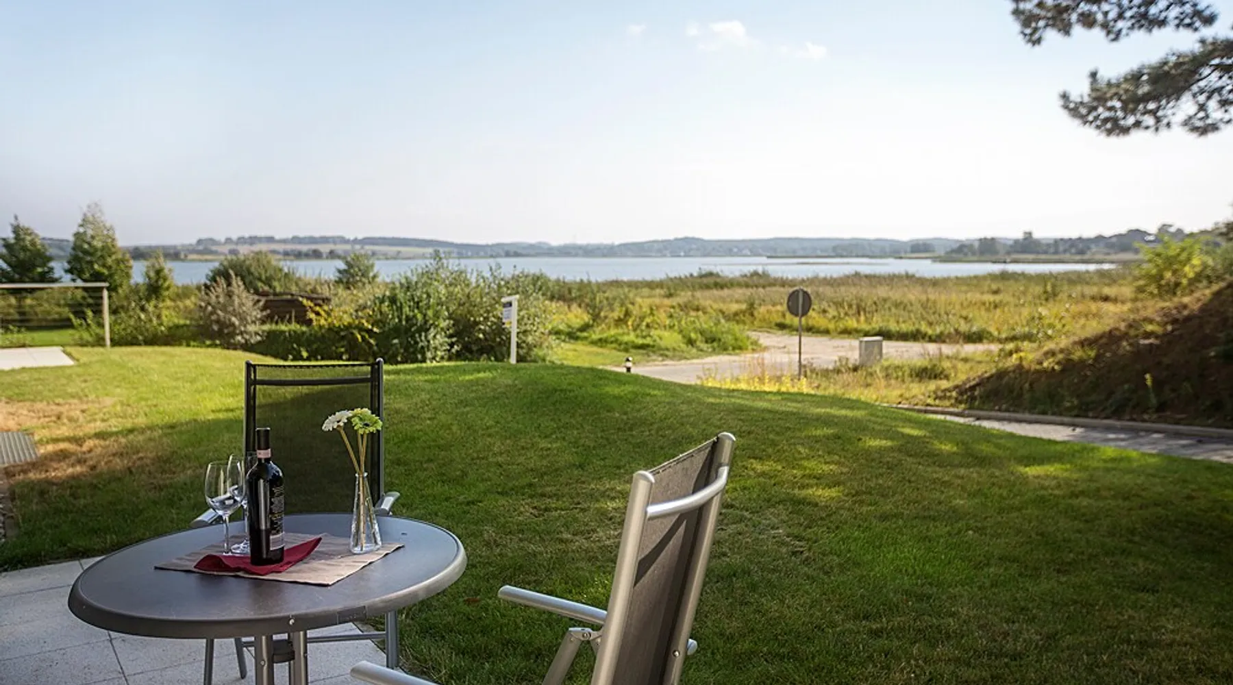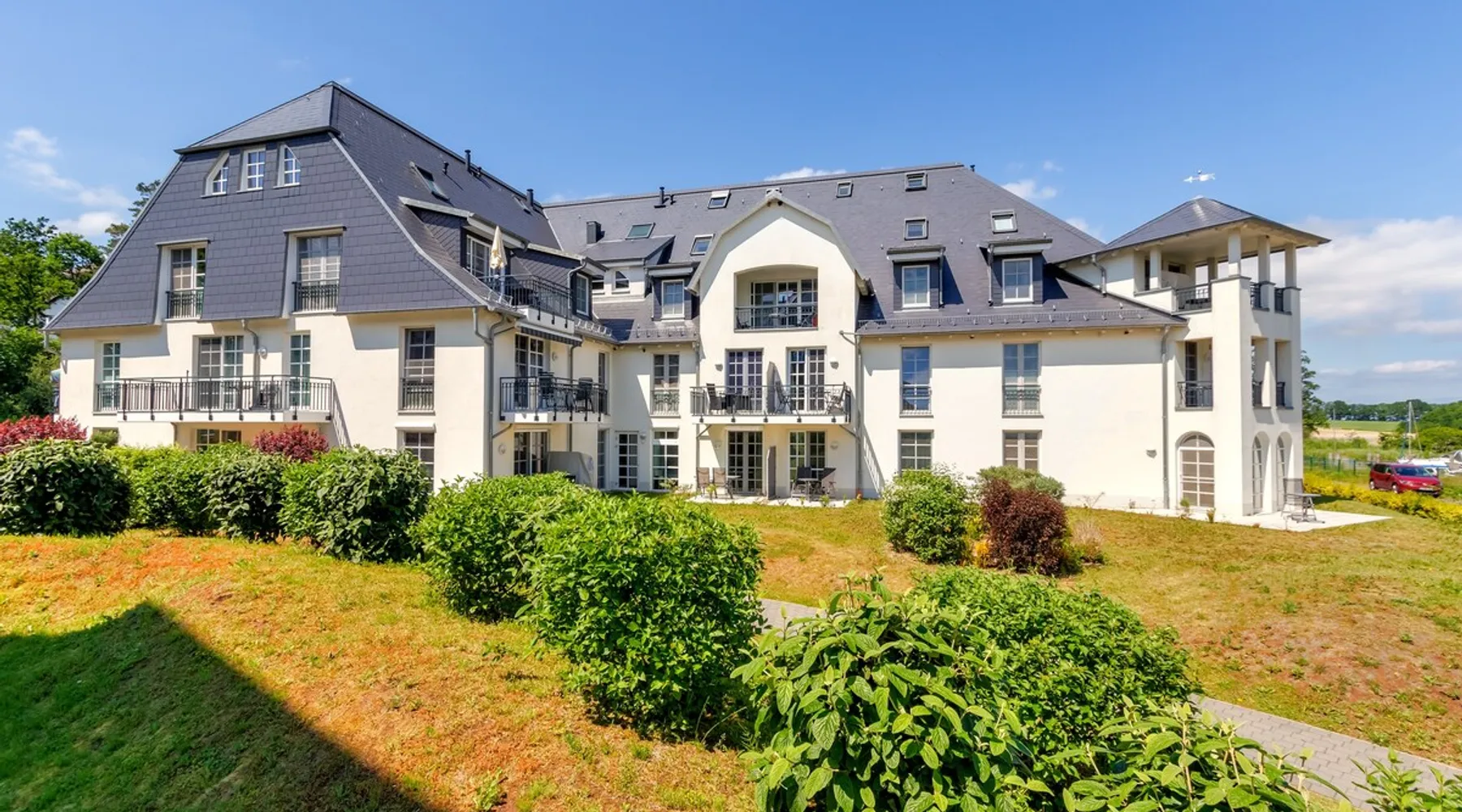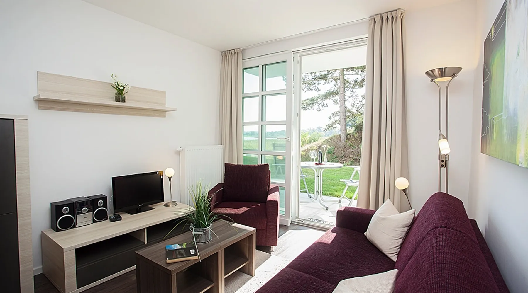 Fewo - BS_ 43 m², 1 bedroom(s), 1 bathroom(s), for 3 guest(s) Additional service charges may have to be paid locally on-site, see house rules and house manual for details. Thank you. The space Beautifully located with 4-DTV stars certified 2-room apartment (43 sqm) on the ground floor with terrace in a sunny south location and lake view as well as direct access to the lawn with bathing dock. In addition to the full bedroom with 2nd TV, the high-quality sofa bed in the living room can accommodate up to 2 more people or 2 children. The built-in kitchen has a dishwasher, microwave with grill, stove with ceramic hobs and hood. The bathroom is equipped with underfloor heating, the storage room offers additional space for golf bags or other bulky items. The apartment has its own underground parking space with direct access within the building. The wellness area with three different saunas, spacious relaxation room and fitness area is also located on the ground floor of the same building, just a few steps away. You are also welcome to use our free, open Wi-Fi access in the house. Please note that there may be fluctuations in the WLAN quality due to the island. The residence at Lake Balmer is a beautifully landscaped holiday complex located directly on the Achterwasser. With its two country-style newly built villas (completion is in spring 2012), they form the perfect synthesis for a relaxing holiday. On the one hand for those who are looking for relaxation and nature away from the hustle and bustle of the imperial baths, on the other hand for the holidaymaker who has discovered a special love in the leisure activities golf, water sports, every kind of cycling, etc., etc. Equipped with a reception, lifts, underground parking, own small laundry rooms with coin-operated equipment, usable areas for golf equipment and a private lawn on the Achterwater with its own jetty and many other additions, this facility leaves little room for open wishes. Golf The golf course Balm, which has existed for more than 10 years in a dreamlike environment and with its 2 x 18 hole and 1 x 9 hole golf courses, is located in the immediate vicinity (about 200m) of the residence. The golf course, which is well-known beyond the borders, is an attraction for all playful demands and wishes. In addition, you will receive a 30% green fee discount for the Baltic Hills Usedom golf course as our guests. Fantastically beautiful holiday apartments on Lake Balmer in the municipality of Benz, not far from the imperial baths of Heringsdorf, Bansin and Ahlbeck. Our holiday apartments at Lake Balmer are available in all sizes and many different furnishings. As guests of the residence on Lake Balmer, we have reserved parking spaces for you in the imperial baths, some with an associated beach chair.