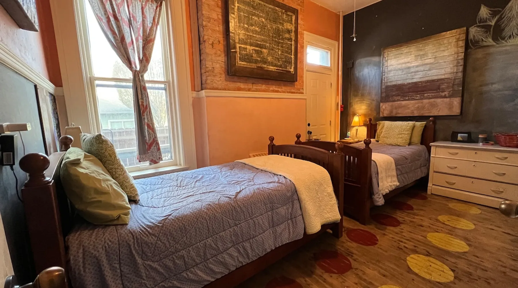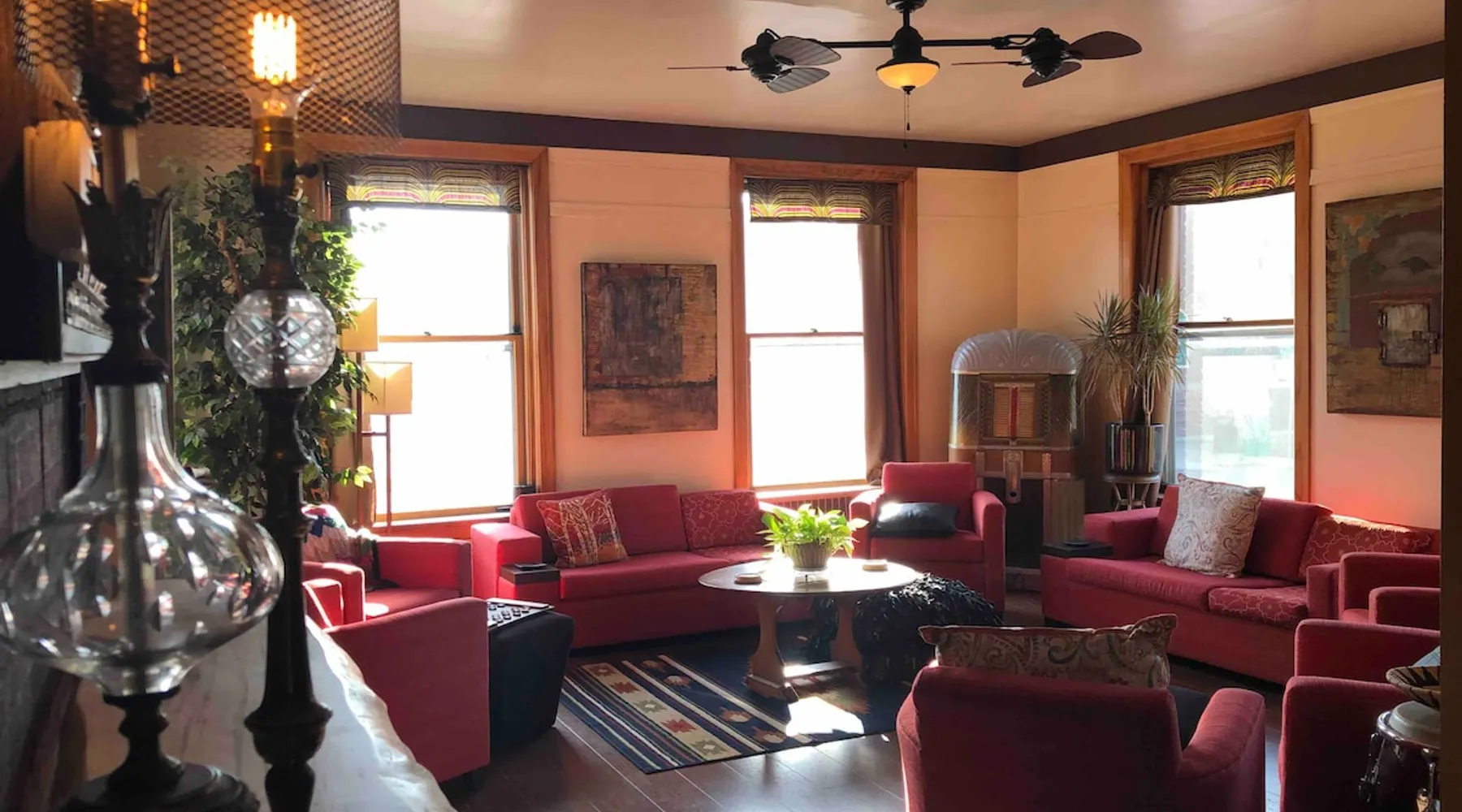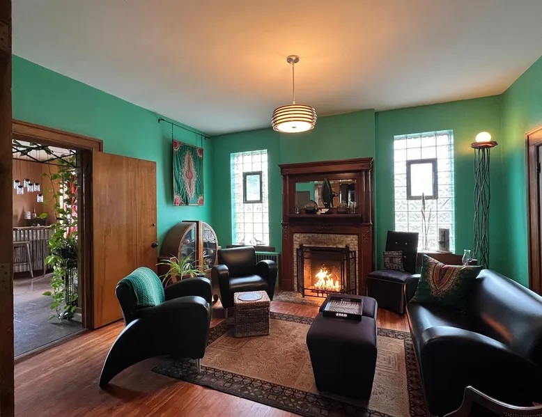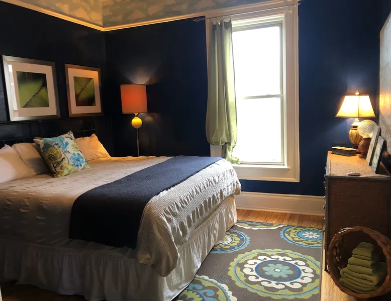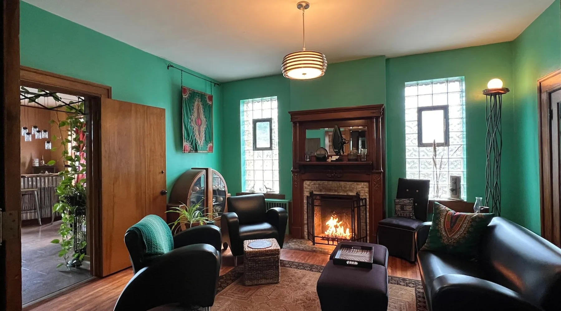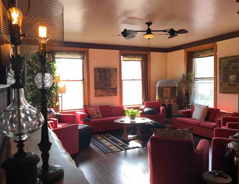 OM INN is on the Historic Registry, has 70 paintings by a renown artist and is filled with funky eye candy. Twelve guest bedrooms with 15 beds, easily hosting 20-25. Base price on 8 guests- 7 bedrooms, over 8 is a per person rate $60 per person/per night. Over 13 guests, mezzanine included, under 13, $250.00. Many common spaces (6) a very large fun kitchen, bar, dual fires in twin living rooms. Neighbor Starbucks, Stadium, Botanical Garden. Owners live upstairs. Responsible kids considered The space Full home rental including the entire first floor with three bedrooms (sleeps 5), five living rooms, huge kitchen, one full and three half baths. Half of the second floor offers 4 bedrooms (sleeps 8) and a full bath. These areas are included in the base rental. The mezzanine level (basement with windows) is included with guest counts over 13 or for an additional fee of $150. for smaller groups that all want their own beds! 5 bedrooms with 7 beds, two futons in a living room with a large table for games, a full bath and a half bath. The main kitchen seats 20 with long bar, two diner tables and a vintage kitchen table. It is a commercial style kitchen, very well equipped for hosting a large group. Kitchen is a quiet zone after 11:00. Owners live upstairs. Owners live on 1/2 the second floor and third floor loft. Pups Shelby and Winnie share the fenced back yard. Guests are welcome to enjoy the Sonos WiFi speakers. Quiet after midnight please. Kids considered for a family rental if parents agree to restrict eating area to the kitchen and toddlers are well supervised. Check in at your leisure after 3:00pm with a door code. Check out includes; -leaving the Kitchen as you found it -Recycling is required for space in the cans. All recycling and trash from bedrooms and kitchen placed in outside cans thru the back yard. -All doors locked, windows closed and lights off. “No parties” means no parties. This is a home for enjoying friends and family, having fun and respecting this historic home. Outside guests with prior approval only. (Major violations ; smoking inside, dancing on the bar, a party with outside guests - We will evict you with a police escort, you will lose all rental fees. This includes the parking lot.) Special Events are welcomed with prior permission, a set guest list and additional per person pricing. Staffing and security are needed. We love hosting guests in this fun space! For the safety of all we require that your guests names be provided before check in and their vehicle information for parking. WiFi requires multiple log ins as you move throughout due to 23 inch thick brick walls! It works great when you log into the nearest extender. The front living room has a TV with a local antenna, Roku and Netflix. Room breakdown- 12 private bedrooms total Living room with 2 sofa beds First floor, 3 bedrooms, sleeps 5 1) “Twister” two singles 2) “Sea” one single 3) “Earth” one queen One full bath with shower and 3 half baths. Two Sofa beds are in the coral living room,(TV room). Second floor, 4 bedrooms, sleeps 8 4) “Sky” King bed 5) “Rock” king bed 6) “Fire” queen bed 7) “Wind” queen bed One full bath with shower/tub Mezzanine 5 rooms. Sleeps 12 8) “Oak” One full, one twin 9) “Bamboo” one Queen 10) “Mahogany” one full and one twin 11) “Birch” one full 12) “Maple” one Full One full bath with shower. Many amenities are included. Water in each guest room, olive oil and spices in the kitchen, tea and coffee. The house is equipped with two irons, three hair dryers, wood for fires inside and out. I hope you love it as we do:-) Guest access Coded door entrance Other things to note This is a unique gathering opportunity for families and friends. It has a great sound system (Sonos WiFi controlled) and a large fun kitchen. Most guests have stayed up later than planned (quiet after 12:00am) and enjoyed connecting in a way not possible in a hotel. I hope you find it as magical as we do!