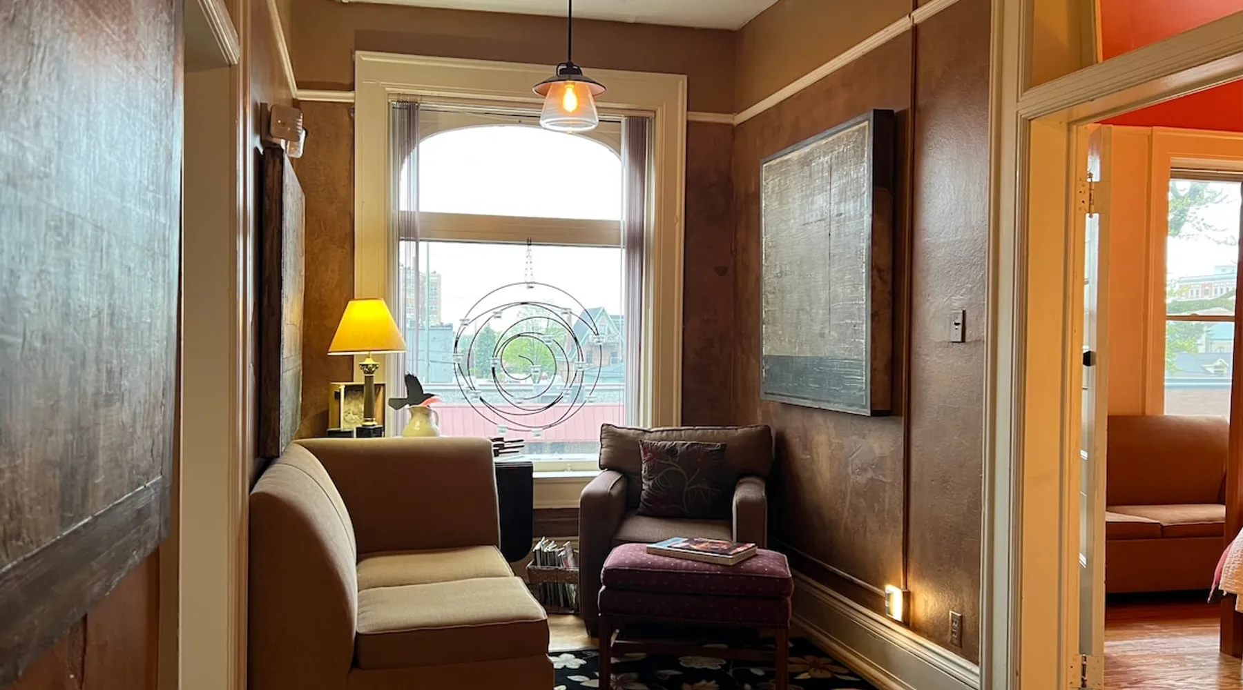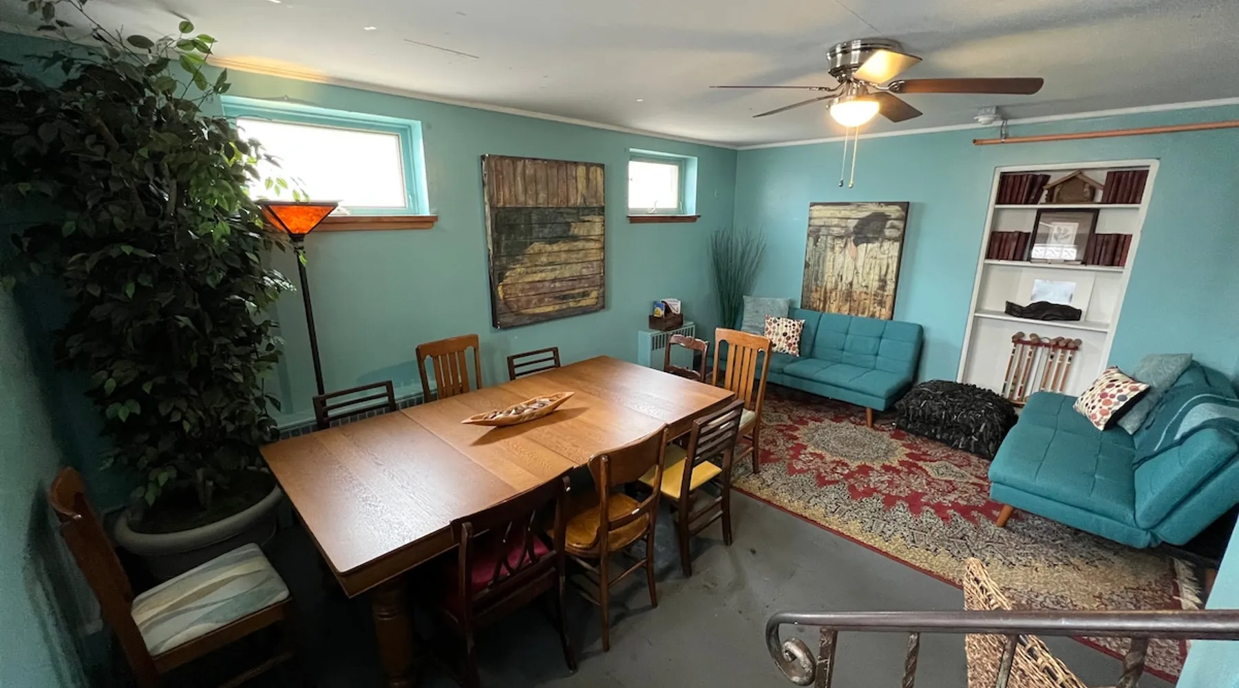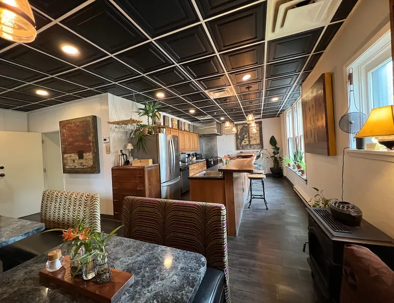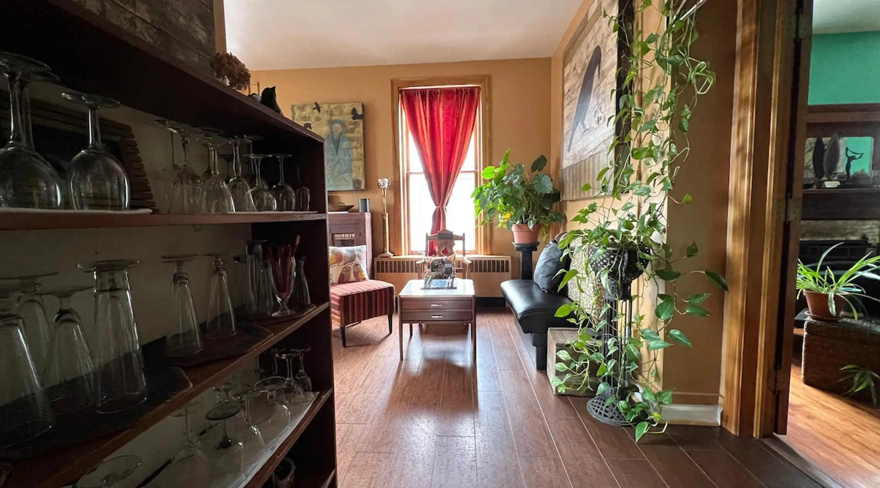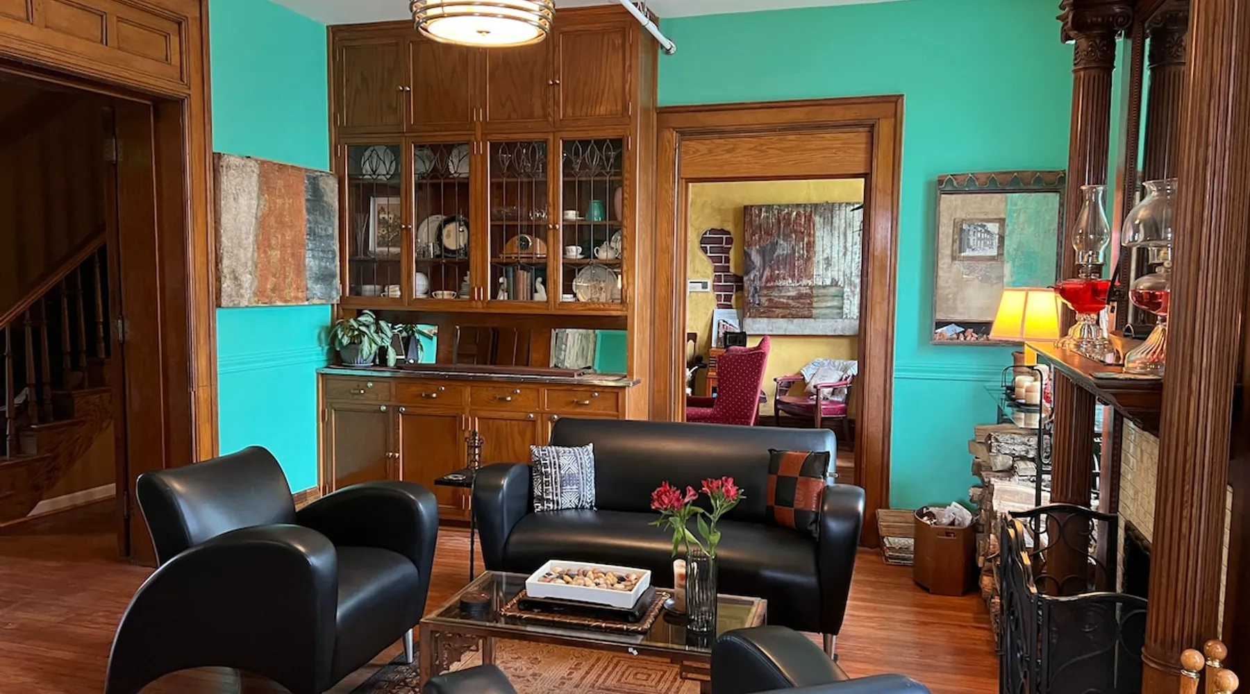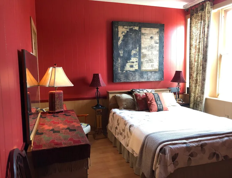 OM INN is on the Historic Registry, has 70 paintings by a renown artist and is filled with funky eye candy. Twelve guest bedrooms with 15 beds, easily hosting 20-25. Base price on 8 guests- 7 bedrooms, over 8 is a per person rate $60 per person/per night. Over 13 guests, mezzanine included, under 13, $250.00. Many common spaces (6) a very large fun kitchen, bar, dual fires in twin living rooms. Neighbor Starbucks, Stadium, Botanical Garden. Owners live upstairs. Responsible kids considered The space Full home rental including the entire first floor with three bedrooms (sleeps 5), five living rooms, huge kitchen, one full and three half baths. Half of the second floor offers 4 bedrooms (sleeps 8) and a full bath. These areas are included in the base rental. The mezzanine level (basement with windows) is included with guest counts over 13 or for an additional fee of $150. for smaller groups that all want their own beds! 5 bedrooms with 7 beds, two futons in a living room with a large table for games, a full bath and a half bath. The main kitchen seats 20 with long bar, two diner tables and a vintage kitchen table. It is a commercial style kitchen, very well equipped for hosting a large group. Kitchen is a quiet zone after 11:00. Owners live upstairs. Owners live on 1/2 the second floor and third floor loft. Pups Shelby and Winnie share the fenced back yard. Guests are welcome to enjoy the Sonos WiFi speakers. Quiet after midnight please. Kids considered for a family rental if parents agree to restrict eating area to the kitchen and toddlers are well supervised. Check in at your leisure after 3:00pm with a door code. Check out includes; -leaving the Kitchen as you found it -Recycling is required for space in the cans. All recycling and trash from bedrooms and kitchen placed in outside cans thru the back yard. -All doors locked, windows closed and lights off. “No parties” means no parties. This is a home for enjoying friends and family, having fun and respecting this historic home. Outside guests with prior approval only. (Major violations ; smoking inside, dancing on the bar, a party with outside guests - We will evict you with a police escort, you will lose all rental fees. This includes the parking lot.) Special Events are welcomed with prior permission, a set guest list and additional per person pricing. Staffing and security are needed. We love hosting guests in this fun space! For the safety of all we require that your guests names be provided before check in and their vehicle information for parking. WiFi requires multiple log ins as you move throughout due to 23 inch thick brick walls! It works great when you log into the nearest extender. The front living room has a TV with a local antenna, Roku and Netflix. Room breakdown- 12 private bedrooms total Living room with 2 sofa beds First floor, 3 bedrooms, sleeps 5 1) “Twister” two singles 2) “Sea” one single 3) “Earth” one queen One full bath with shower and 3 half baths. Two Sofa beds are in the coral living room,(TV room). Second floor, 4 bedrooms, sleeps 8 4) “Sky” King bed 5) “Rock” king bed 6) “Fire” queen bed 7) “Wind” queen bed One full bath with shower/tub Mezzanine 5 rooms. Sleeps 12 8) “Oak” One full, one twin 9) “Bamboo” one Queen 10) “Mahogany” one full and one twin 11) “Birch” one full 12) “Maple” one Full One full bath with shower. Many amenities are included. Water in each guest room, olive oil and spices in the kitchen, tea and coffee. The house is equipped with two irons, three hair dryers, wood for fires inside and out. I hope you love it as we do:-) Guest access Coded door entrance Other things to note This is a unique gathering opportunity for families and friends. It has a great sound system (Sonos WiFi controlled) and a large fun kitchen. Most guests have stayed up later than planned (quiet after 12:00am) and enjoyed connecting in a way not possible in a hotel. I hope you find it as magical as we do!