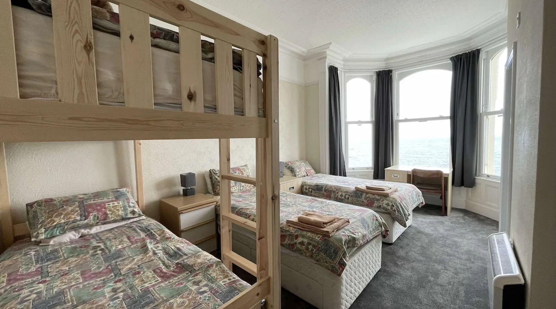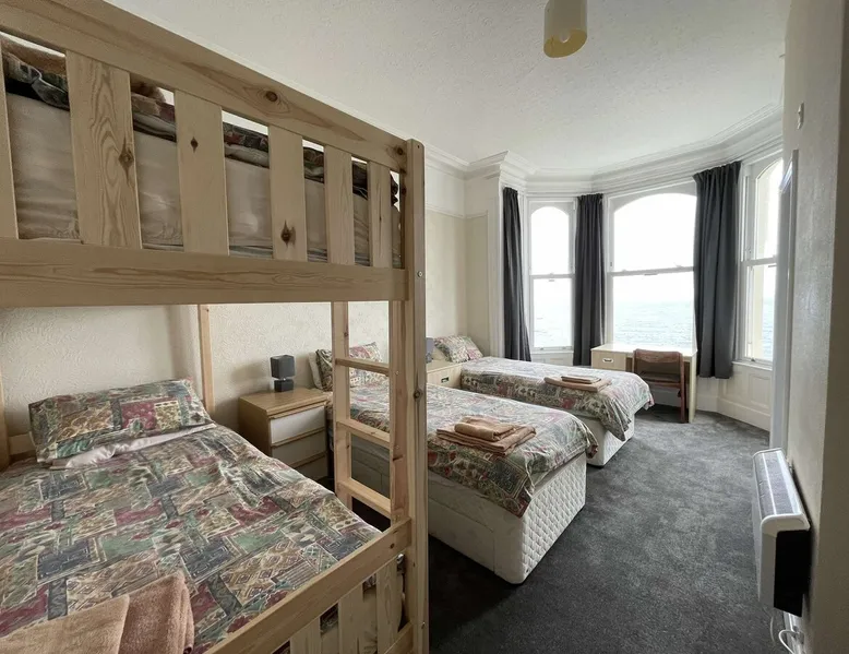 Mallmore has great views over the beautiful, sandy beach of Port St Mary which is a quiet & picturesque village in the south of the Island (25 mins drive from Douglas). Mallmore is great for individuals, couples and small groups. There are a number of listings for different size rooms - check out our other listings (including single and group rooms) by clicking on my profile picture. Mallmore is an Isle of Man Tourist Board registered hostel with a 3* rating. The space This ensuite room has fabulous views over Port St Mary bay and a well equipped ensuite shower room. The beds can be made up as a superking bed and a pair of bunks, or as two singles and a pair of bunks. There is also a desk and chair, a wardrobe and plenty drawers. Bedding and towels are provided. The standard price is for three guests, with a small surcharge for a fourth guest. Guest access You will have access to our shared dining room which includes tea & coffee making facilities, microwave, toaster, refrigerator, crockery & cutlery. Bread, spreads, tea, coffee, milk, sugar and a selection of cereals will also be provided in the dining room which can be accessed at any time. Dishes can be left to be washed by staff. You will also have access to a shared lounge with TV, sofas, armchairs and a brilliant view across Port St Mary bay. A drying room for clean clothes and towels is available with shared access. During your stay Happy to offer advice on anything related to your stay on the Island. Other things to note We request that guests do not drink alcohol in shared spaces within Mallmore. There are local pubs and bars within walking distance. Mallmore is also a no smoking premises, if you wish to smoke please use the benches or grass area across the road.