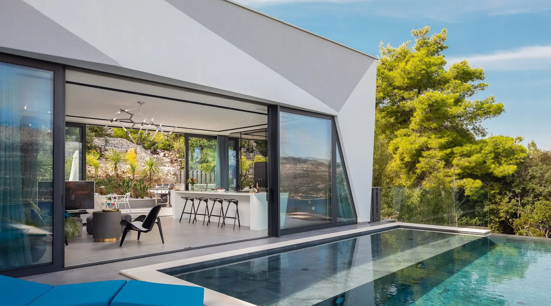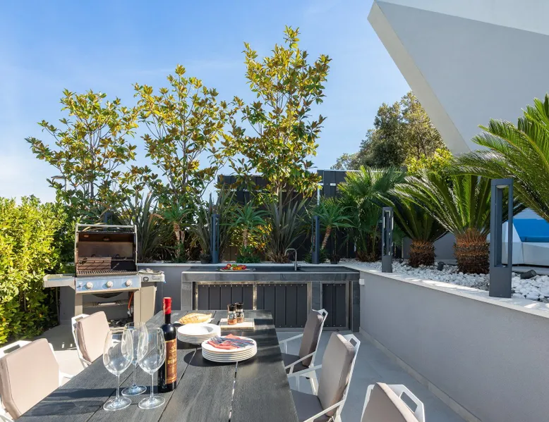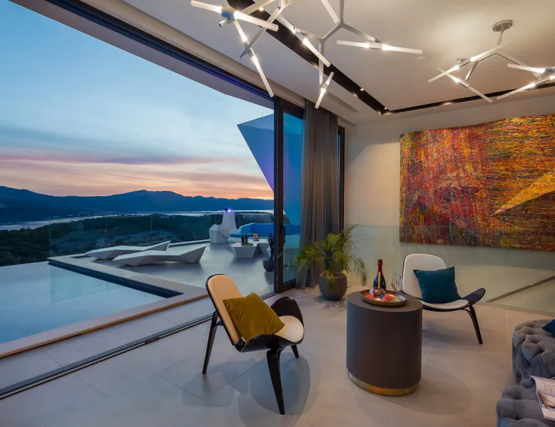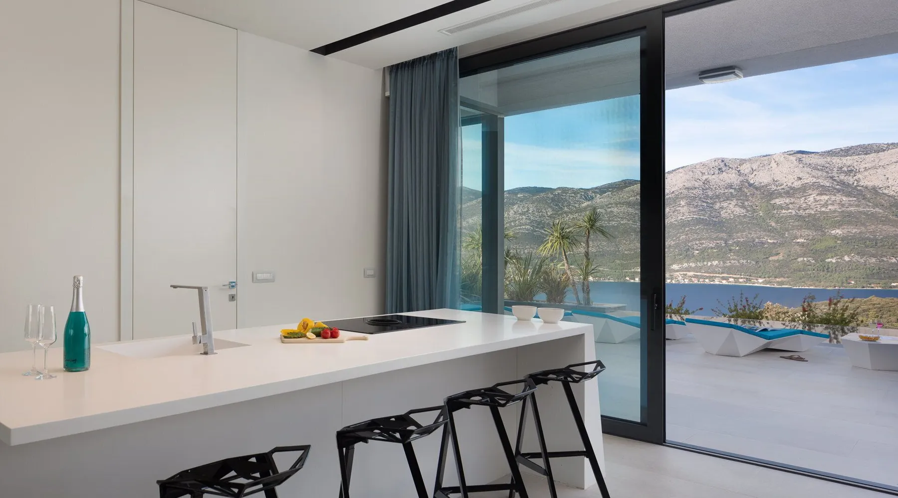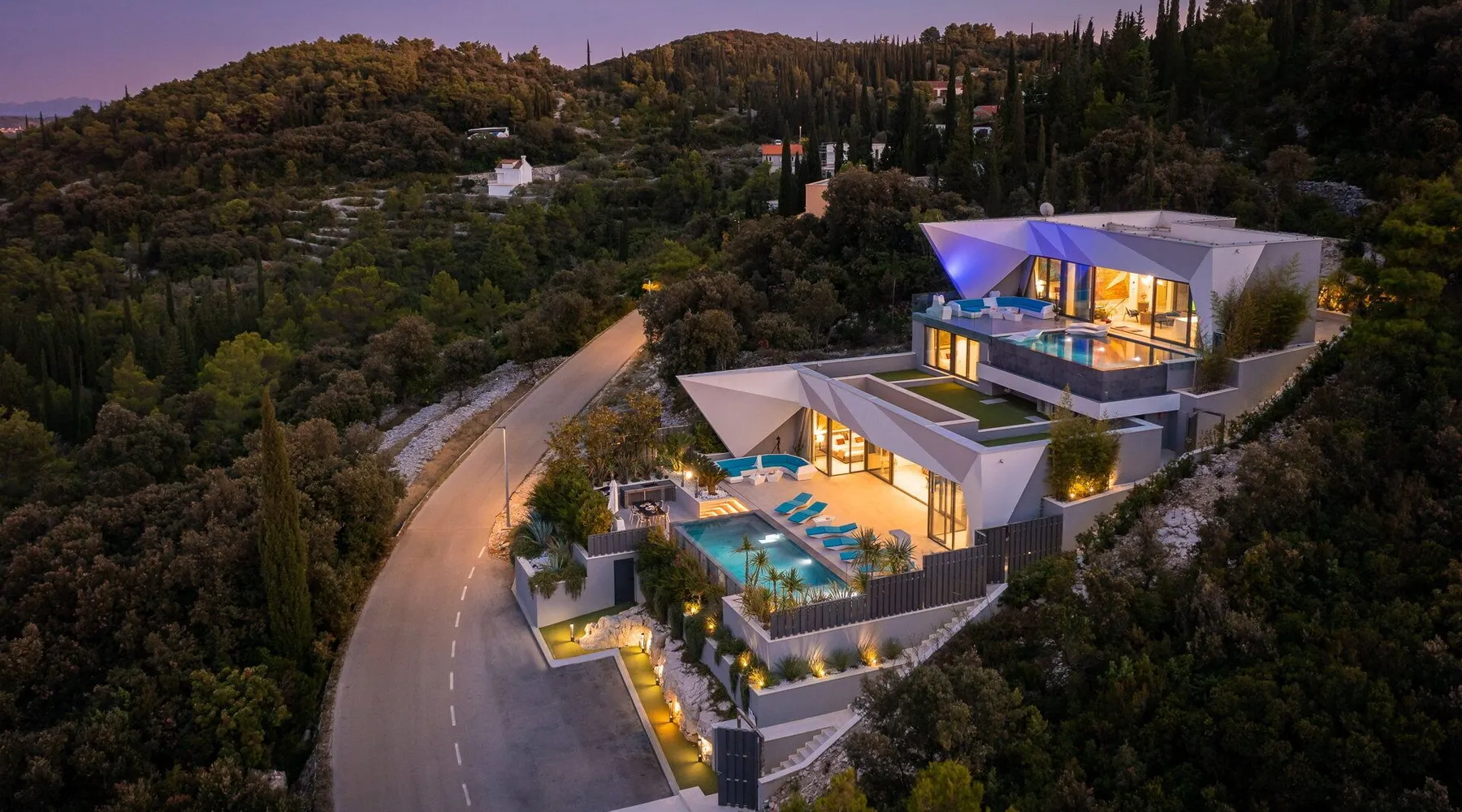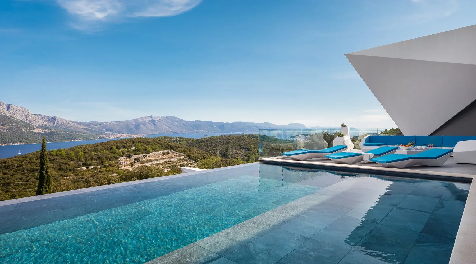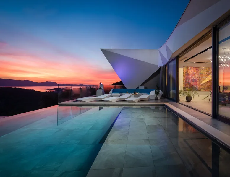 Luxury Villa Korcula Diamond with 2 infinity pools is one of the most luxurious high-end mansions on the Adriatic. This brand new holiday rental is located on the island of Korcula, which is known as the birthplace of Marco Polo. Luxury Villa Korcula Diamond is secluded above the quiet bay of Zrnovska Banja and offers complete privacy and amazing sea views.With its unique architecture, modern interior, and top amenities, it is the perfect accommodation for an unforgettable vacation experience.Luxury Villa Korcula Diamond consists of two independent units, meaning if you are in a big group you can still have your privacy. The upper unit has 3 bedrooms, 4 bathrooms, a cozy living area, a fully equipped kitchen, 35 m2 infinity pool, and a huge sundeck.The lower unit has the same facilities as the upper: private living room, kitchen, infinity pool (40 m2), sundeck, 2 bedrooms, and 3 bathrooms. Each bedroom has a comfortable king-size bed and an en-suite bathroom.Luxury Villa Korcula Diamond with two swimming pools is perfect for couples or families. The villa has a Bose multi-room surround system, Daikin air-conditioning system, security glass windows, premium furniture, and 2 Weber barbecues.The villa is located 1 km from the restaurants and bars.