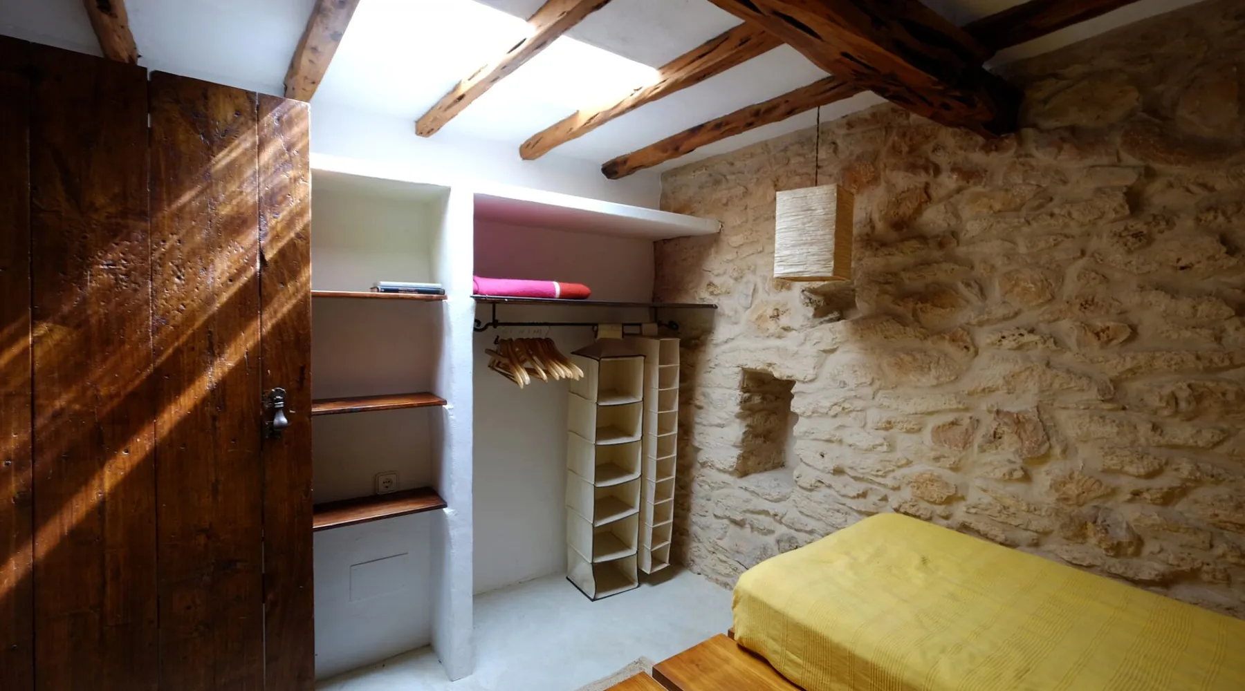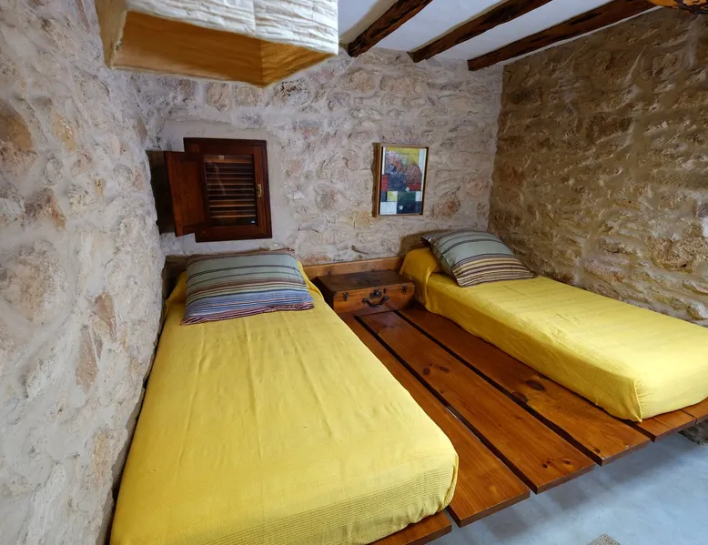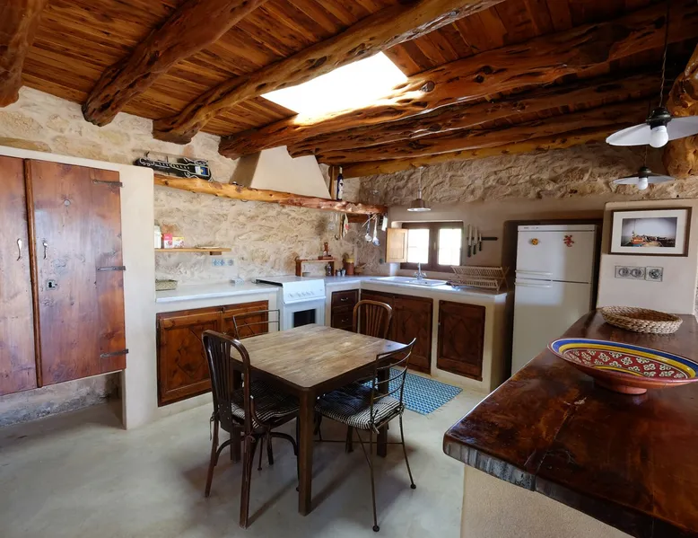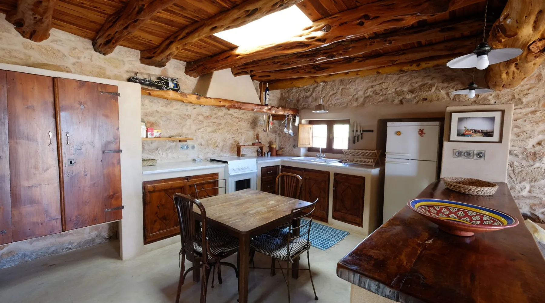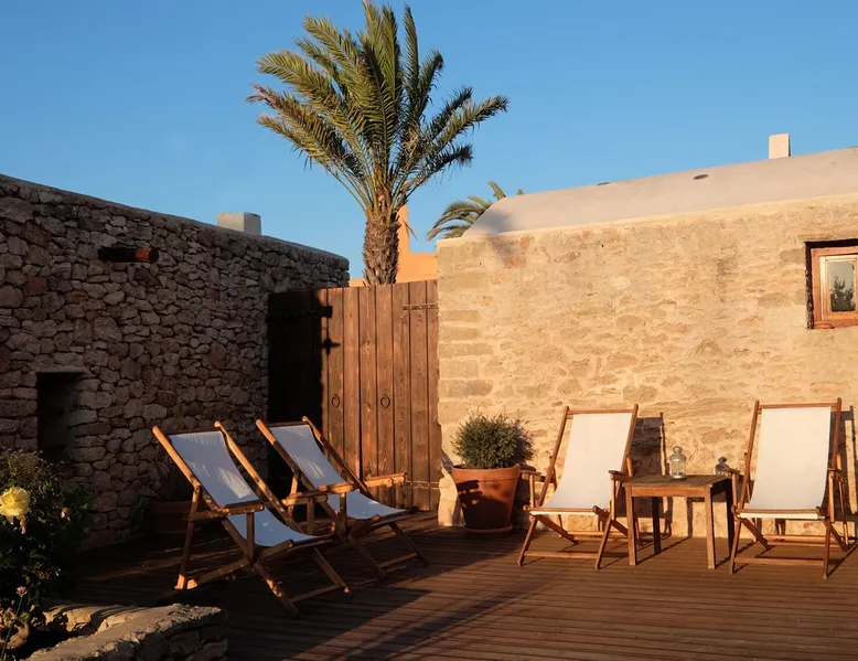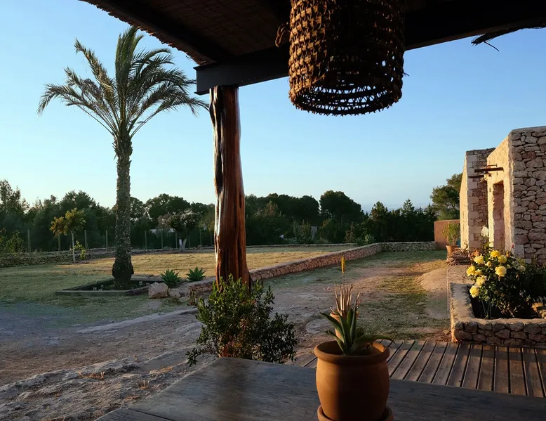 This house corresponds to the portion of the estate that was destined to the care of livestock and pastures storage. It was restored at the time to build a house of two volumes (housing and bath-hammam), through the use and recycling of all original materials (sandstone, stone, beams of juniper and tagell), combined with more modern finishes (floors fratasado gray cement and wooden platform). Together with the adjoining terraces wood (deck), add a total area of 150 square meters. Also includes a pergola to comfortably park two cars and about 1 200 m2 of land / field in the lateral and front part of the house. Also highlight the great sea, with the island of Ibiza in the background.