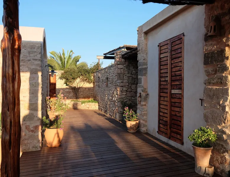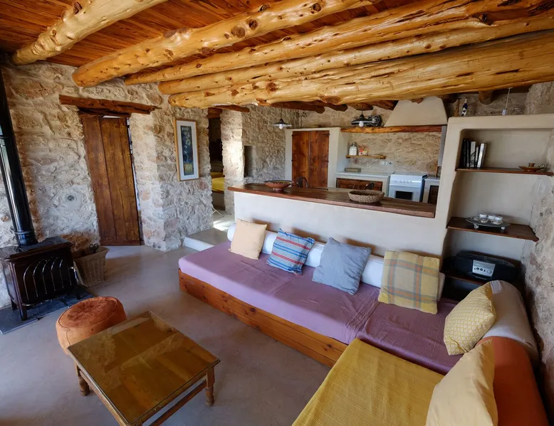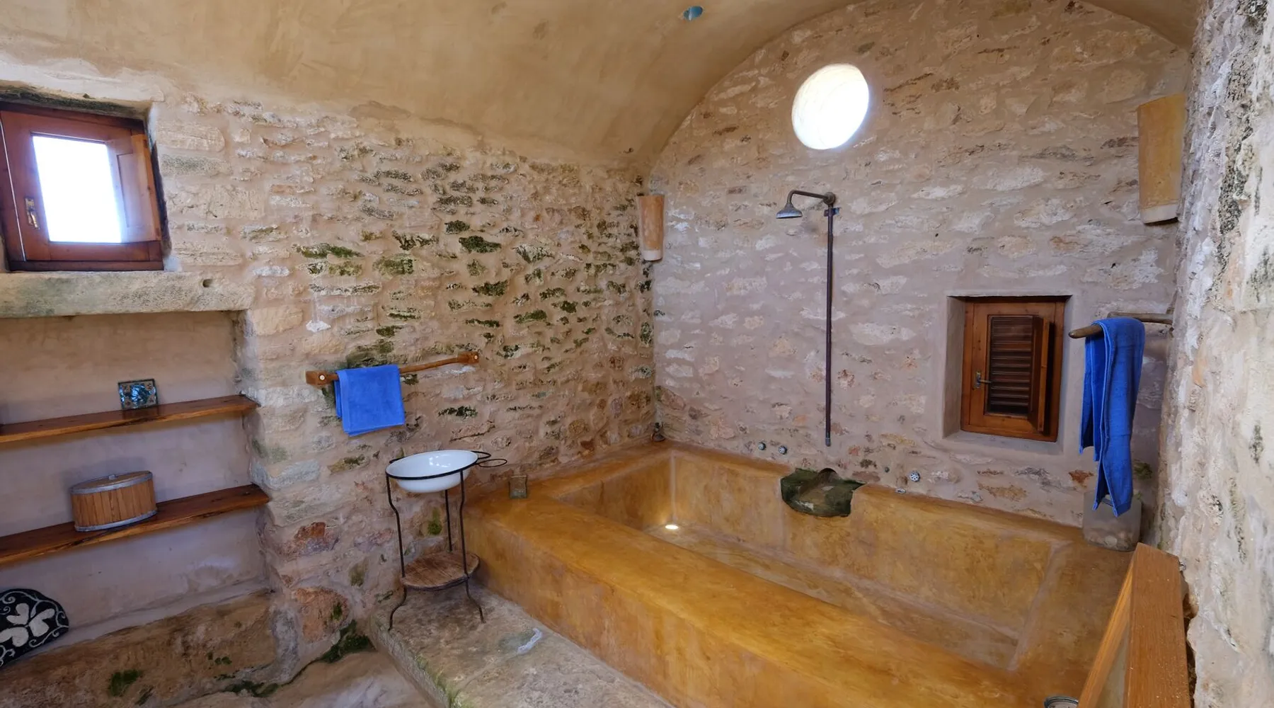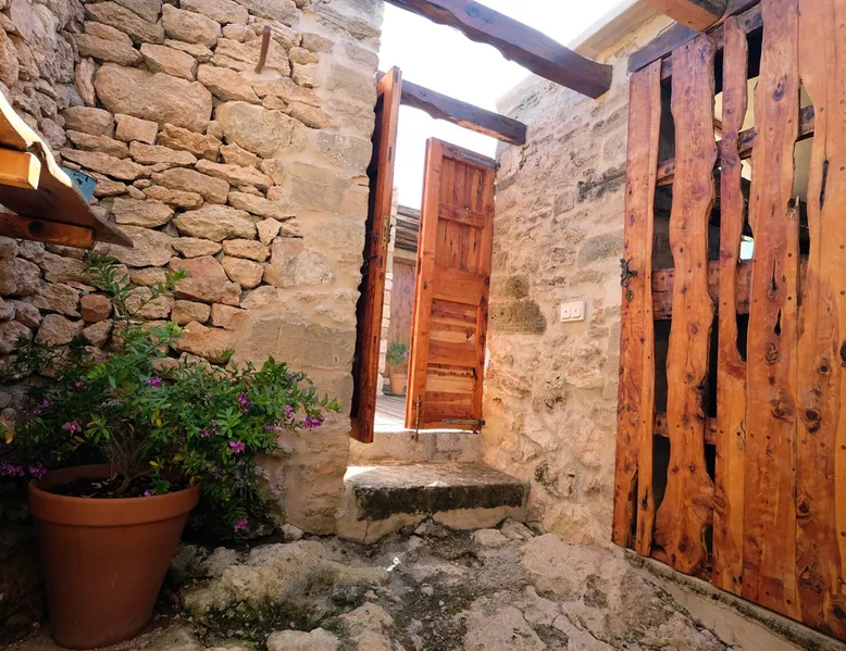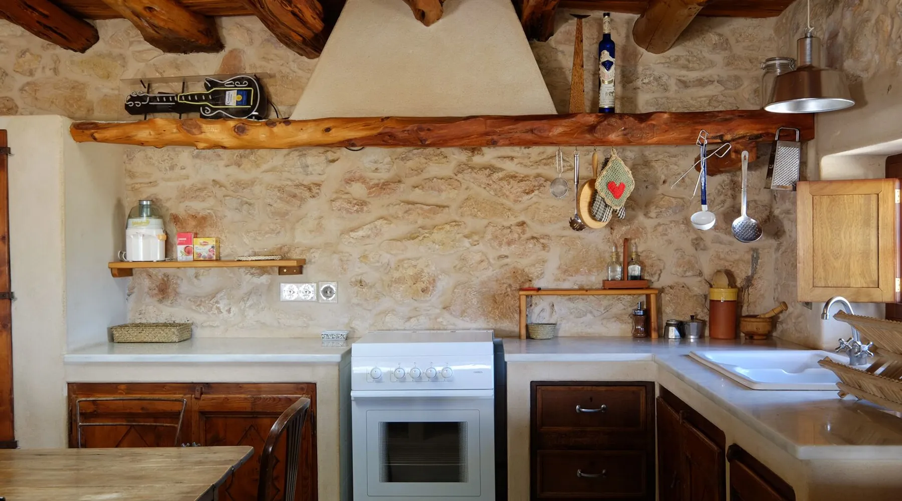 This house corresponds to the portion of the estate that was destined to the care of livestock and pastures storage. It was restored at the time to build a house of two volumes (housing and bath-hammam), through the use and recycling of all original materials (sandstone, stone, beams of juniper and tagell), combined with more modern finishes (floors fratasado gray cement and wooden platform). Together with the adjoining terraces wood (deck), add a total area of 150 square meters. Also includes a pergola to comfortably park two cars and about 1 200 m2 of land / field in the lateral and front part of the house. Also highlight the great sea, with the island of Ibiza in the background.