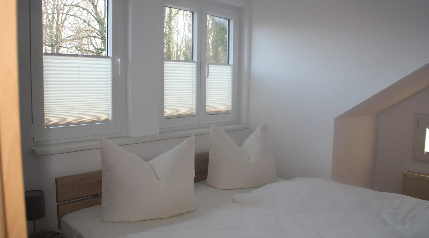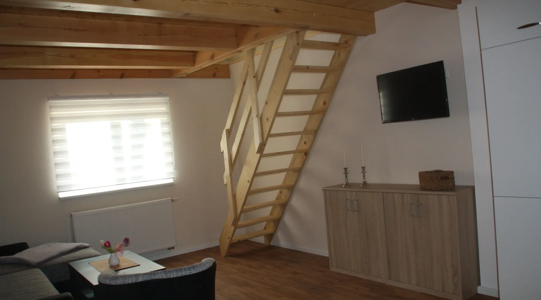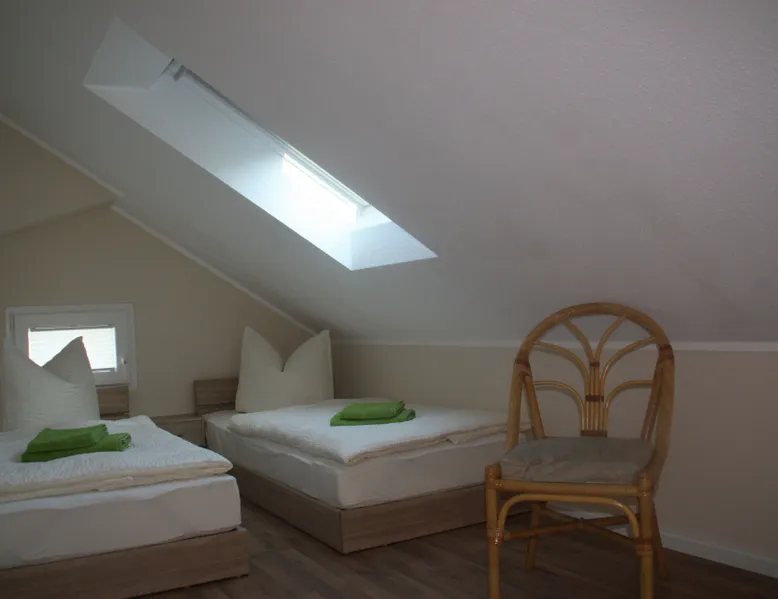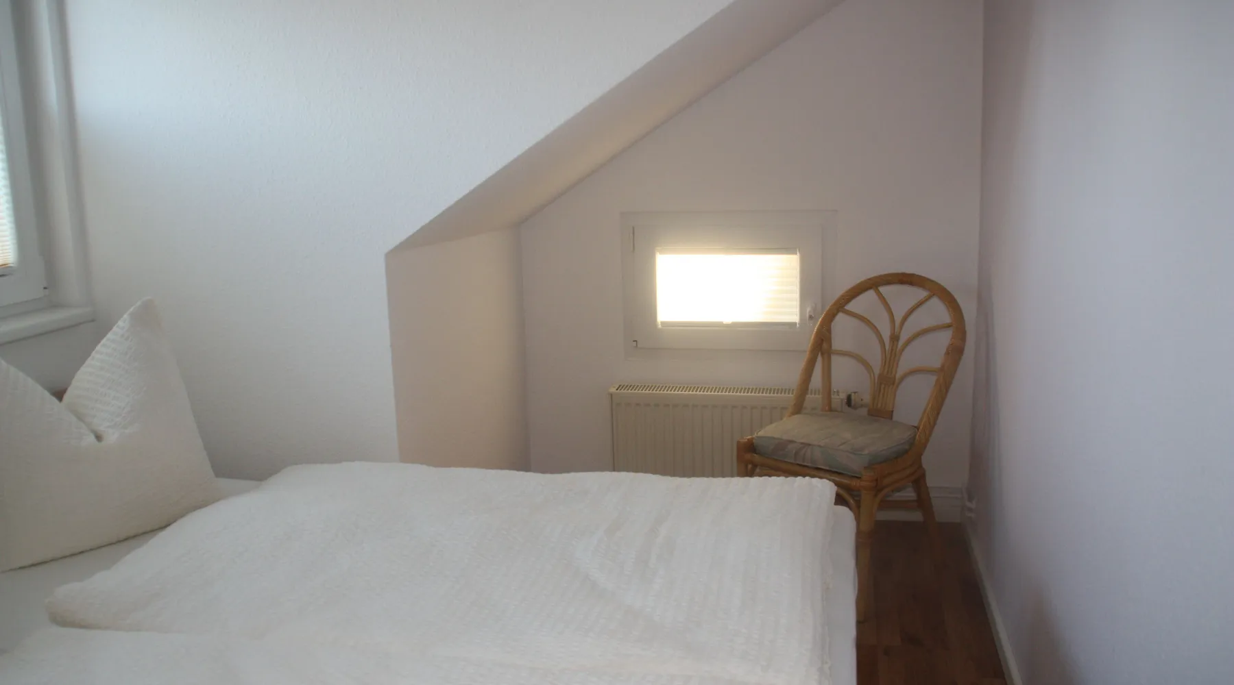 The apartment has a size of about 55 square meters and is located on the upper floor of the house. It was completely renovated and refurbished in 2017. The apartment extends over 2 floors and can accommodate 5 people. It has 2 bedrooms. The first bedroom is furnished with a double bed. A staircase from the living room leads to the second bedroom, which is located in the rooftop and is furnished with 3 single beds. The open living room is furnished with a comfortable corner couch and satellite TV. In the well-equipped kitchen there is a stove with ceramic hob and oven, fridge, coffee machine, kettle and toaster. The garden can be used, seating is available. A covered bicycle parking space is also available. The city center of Potsdam is approx. 4.5 km away and can be reached easily by bus and train thanks to the good transport connections. Rehbrücke train station is a 15-minute walk away. From here you have the option of taking the regional train to Berlin. In the nearby Waldstadt Center there are some small shops and a large supermarket.