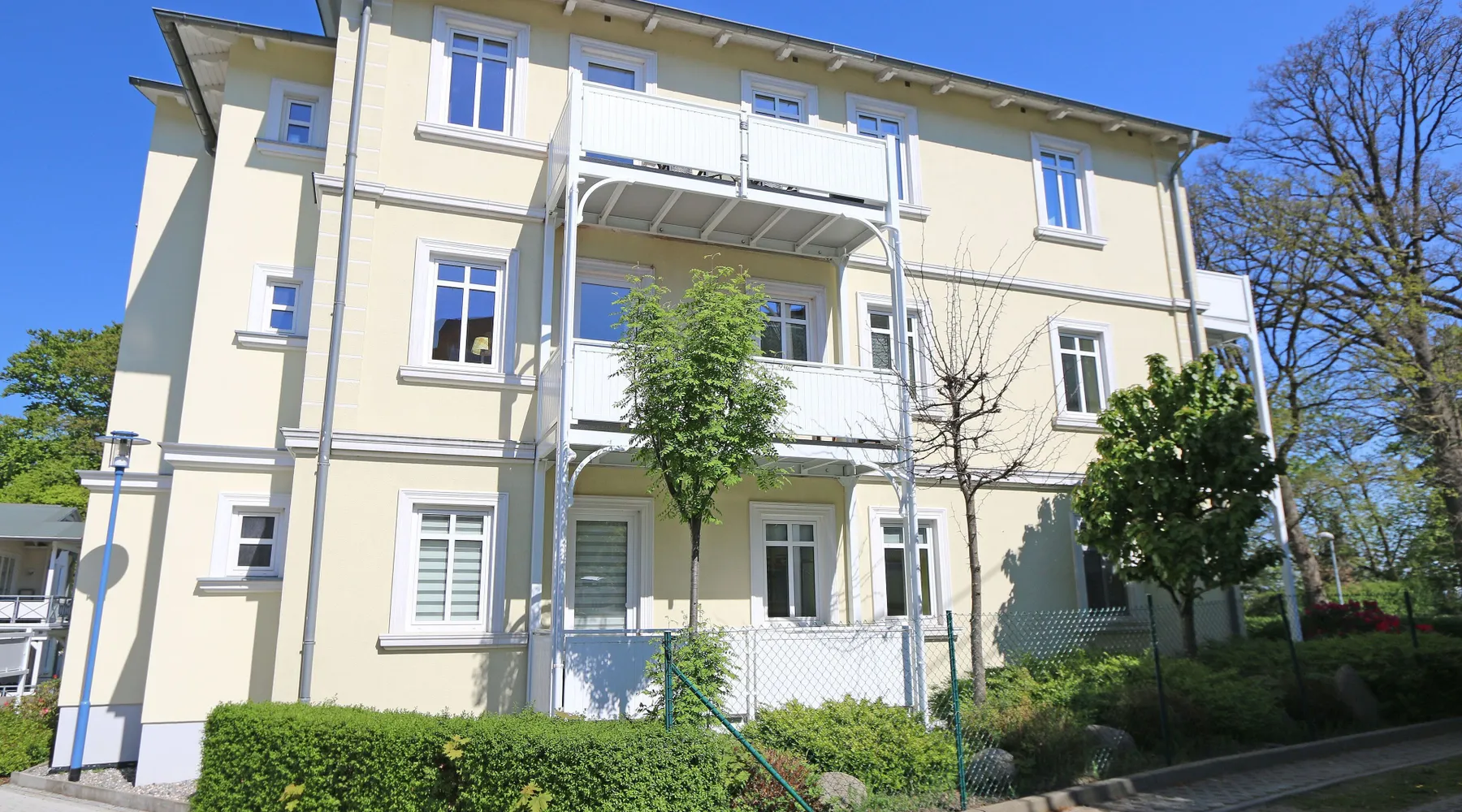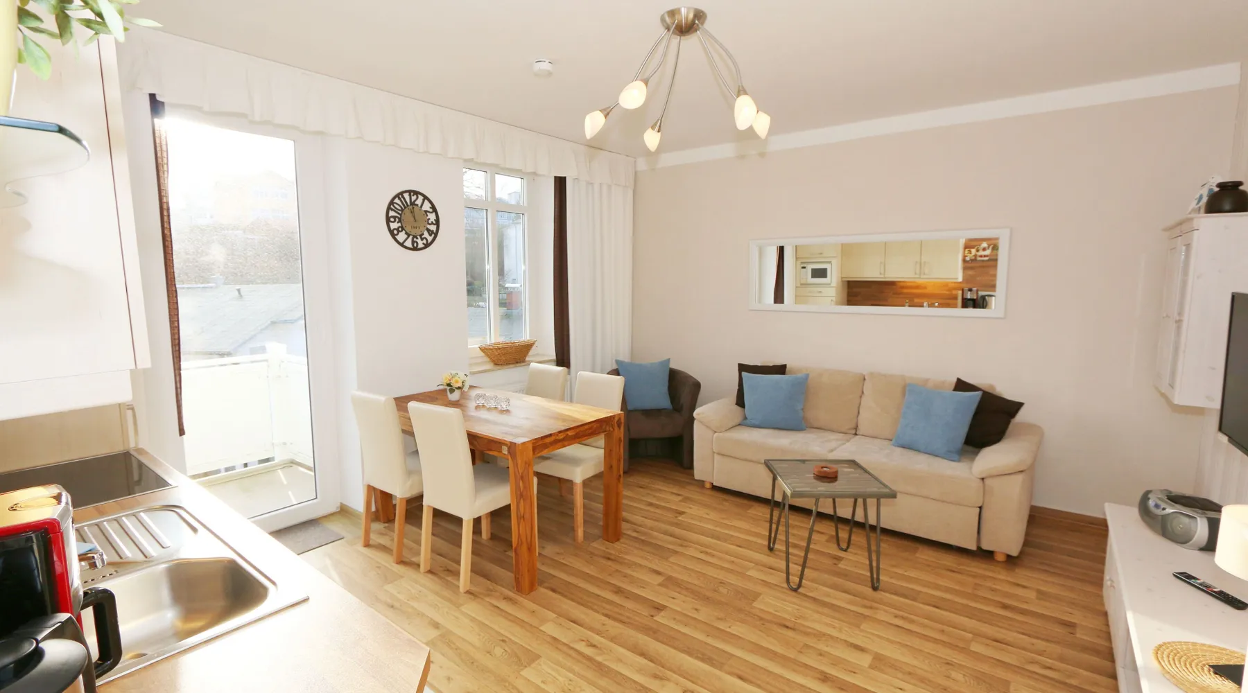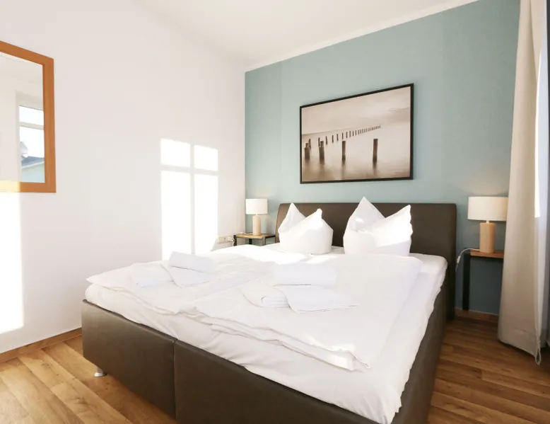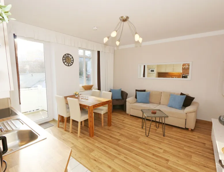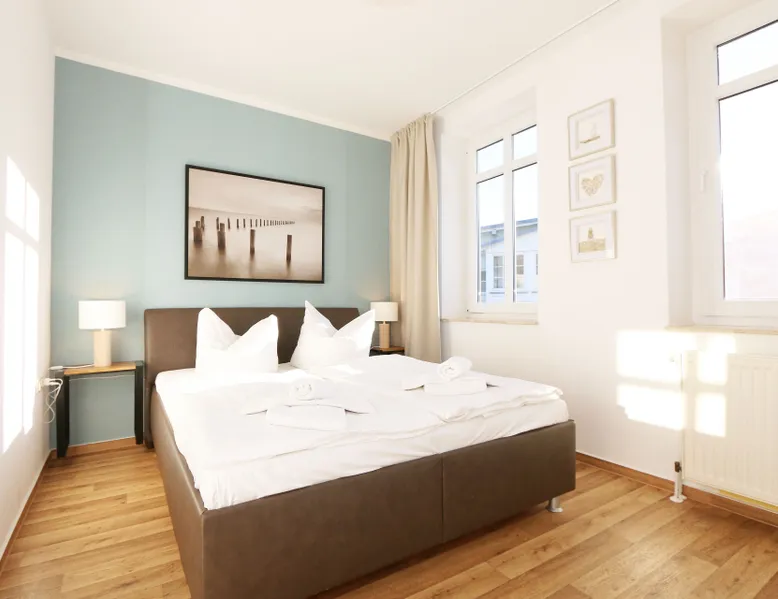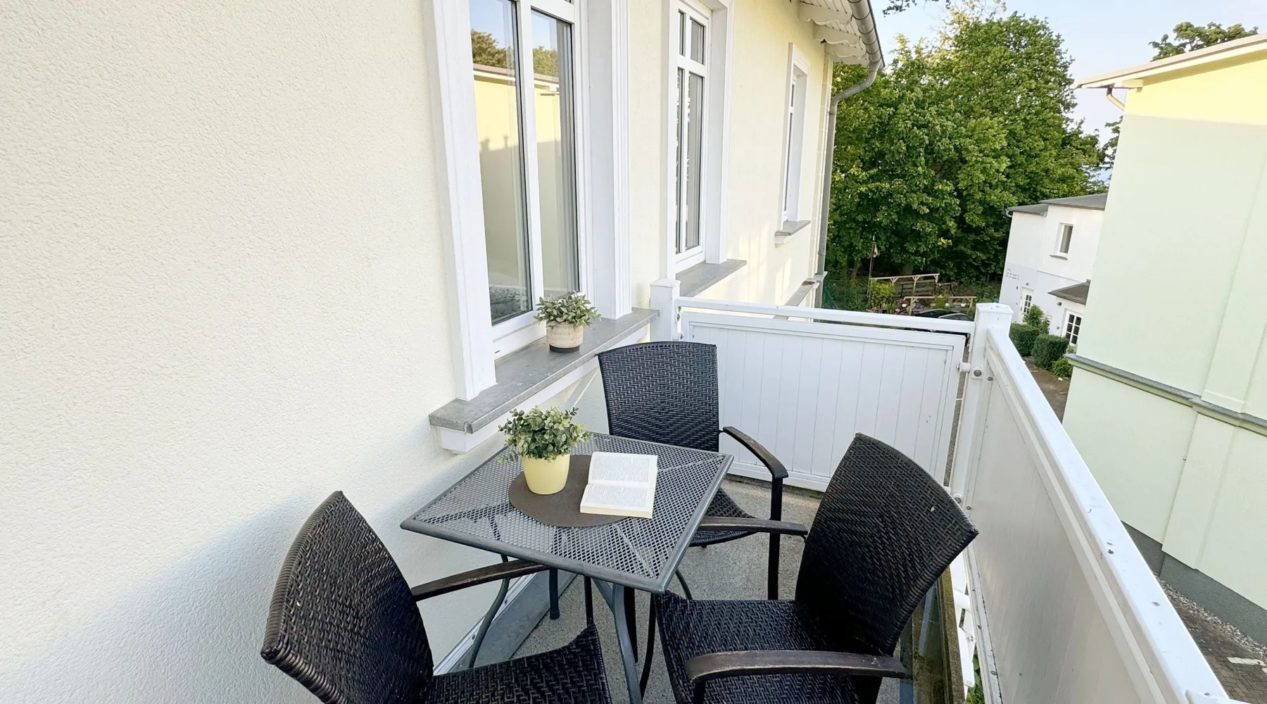 The apartment 09 house beach tent is a comfortable Non smoking apartment, which is. In the 2 Floor is. The 2-room apartment includes approximately 40m² so it has ample space for up to 4 people. It consists of a living area with a balcony, a bedroom, and finally the bathroom. The living area is lovingly and detailed furnished. In the light-filled room they find beside a chair and a coffee table, a comfortable sofa bed (1.40 mx 2.00 m), which is suitable as a bed for 2 persons. A flat-screen TV and a DVD player are allowing them to spend after an impressive day a cozy movie night with your loved ones. A radio with CD player and various readings for bookworms among them are to be found. On an Internet connection (WLAN), you need not do without. This is from March 2017 you included. The kitchenette in the selfsame room is equipped with a ceramic hob. It contains, in addition to an oven and a refrigerator with freezer, a dishwasher, a microwave, a kettle, a toaster, a coffee maker and various cooking utensils. Completing the living area by a table with four chairs and access to the balcony (south / east). This includes nearly 7 m² and was replanted in the fall 2016th Again, you will find a table with four chairs and a parasol. The balcony (south / east) is the side facing the sea and carry the trees at the end of the year no more leaves, so they have at least a wonderful view of the sea. The bedroom has a double bed (1,60 mx 2,00 m), fitted adjustable bed frames and a spacious wardrobe. Even a small mirror with a shelf is to be found. Like the living room, the bedroom is bright. However, if required, they can simply close the curtains and dark the room so completely. If they find that their clothing is wrinkled in the suitcase, they will find both a small ironing board and an iron in the bedroom. the room is rounded off by two bedside shelves, each with a lamp and decorative accents throughout the room. The bathroom consists of a shower, a wash basin, a toilet, a lighted mirror and a shelf. Even a hair dryer is available. Of course, is also thought to the little ones so that you will enjoy various toys, board games and children's books. In addition, you can find in the living area a bicycle helmet. A free and secure with a barrier parking space for your car is right at home. Pets are not allowed. The initial equipment of a linen package (complete bed linen, 1 towel, 2 small towels) you can book up to 14 days before arrival for 15.00 € per person or supplement by own. For packages booked for 2 or more you will receive 1 dish towel and 1 shower mat once. The well maintained villa "beach shelter" is located in a prime location of the seaside resort Göhren, just 100 meters from the beach. The Villa with 9 apartments is centrally located, yet in a quiet side street (Wilhelmstrasse). The apartment 09 is located in. 2 Upstairs. You will find a comfortable light-filled 2-room apartment, in the relaxing and can spend relaxing days. The apartment has a balcony where you can have breakfast undisturbed. The Göhren offers two fabulous beaches, numerous cafes and restaurants, shopping, cycling and walking paths.